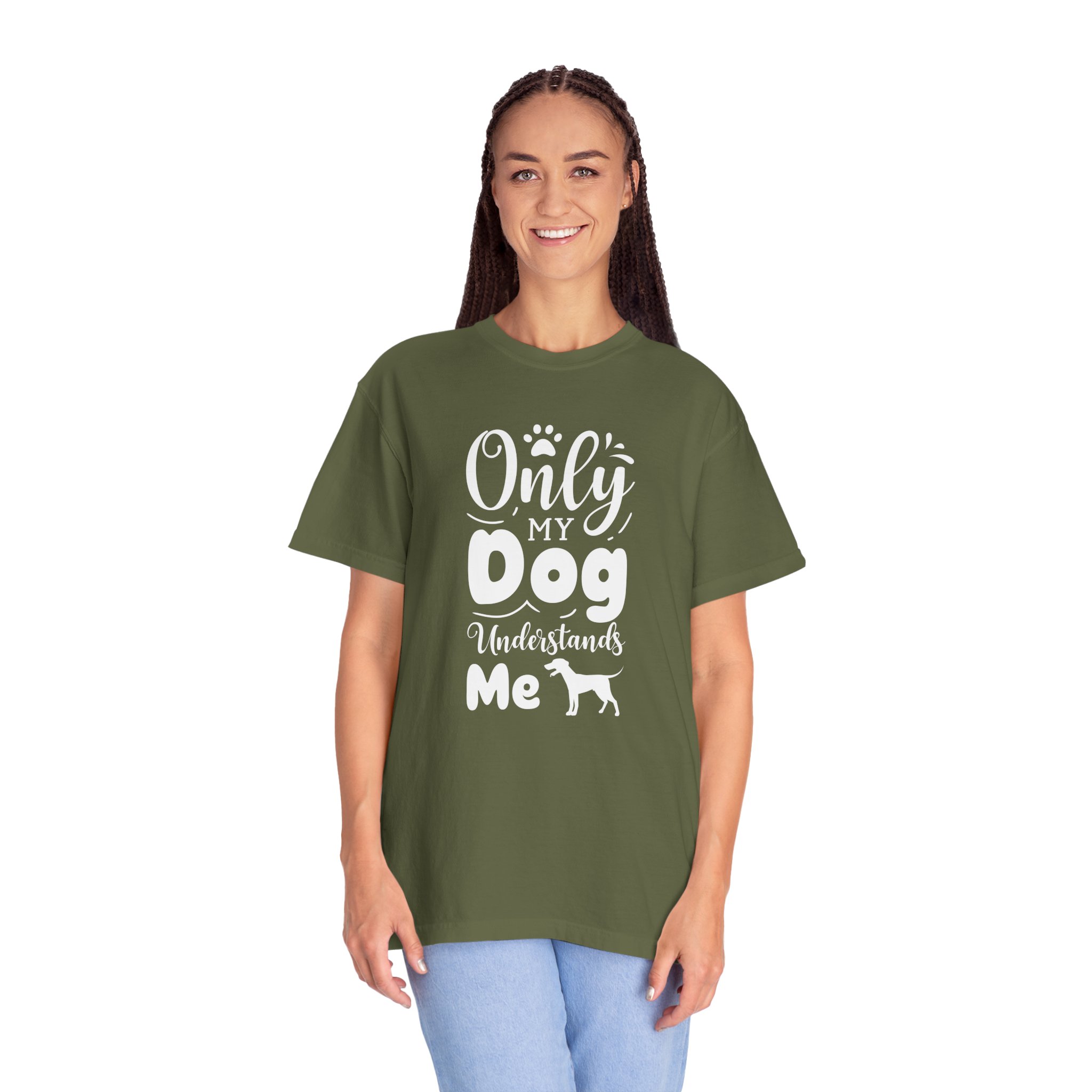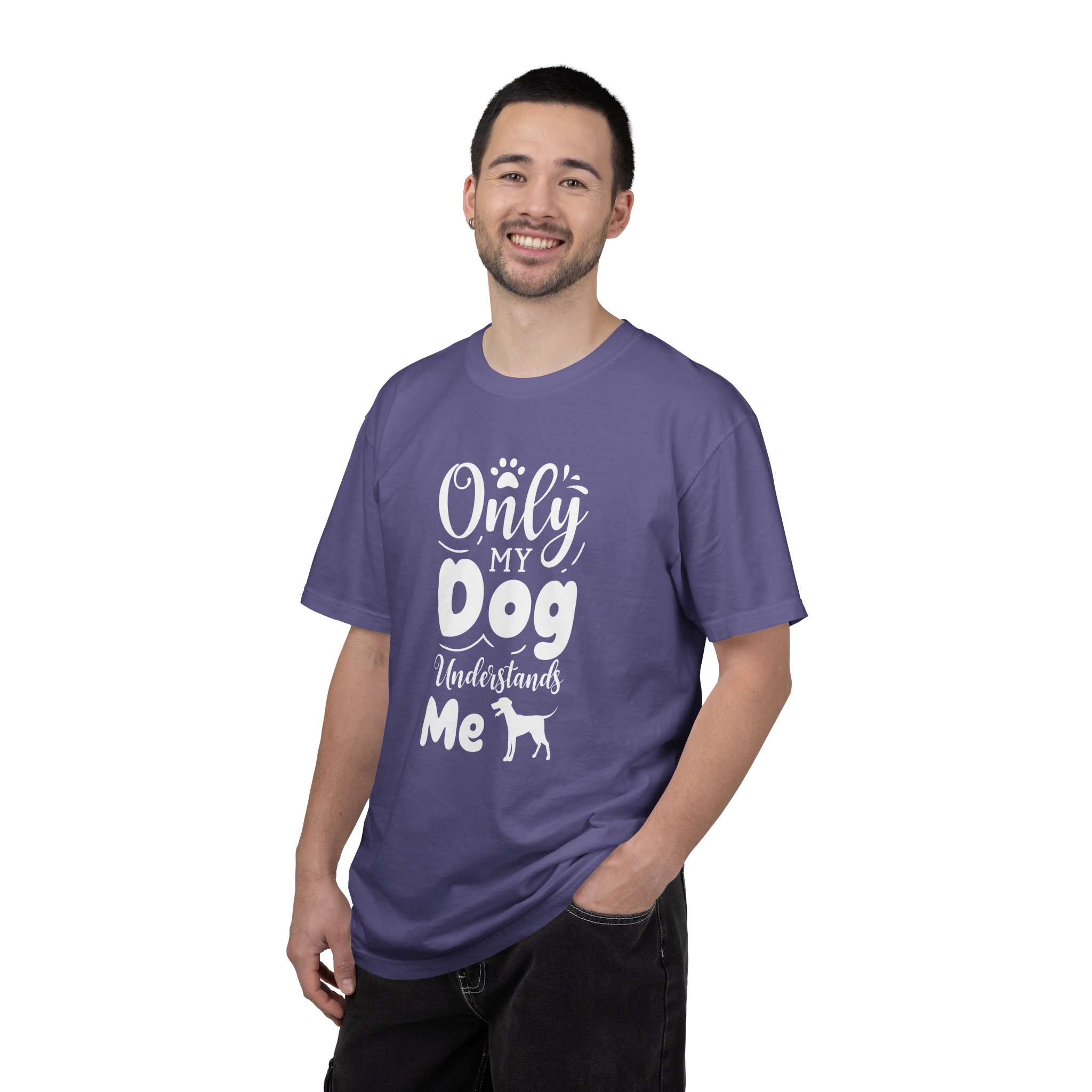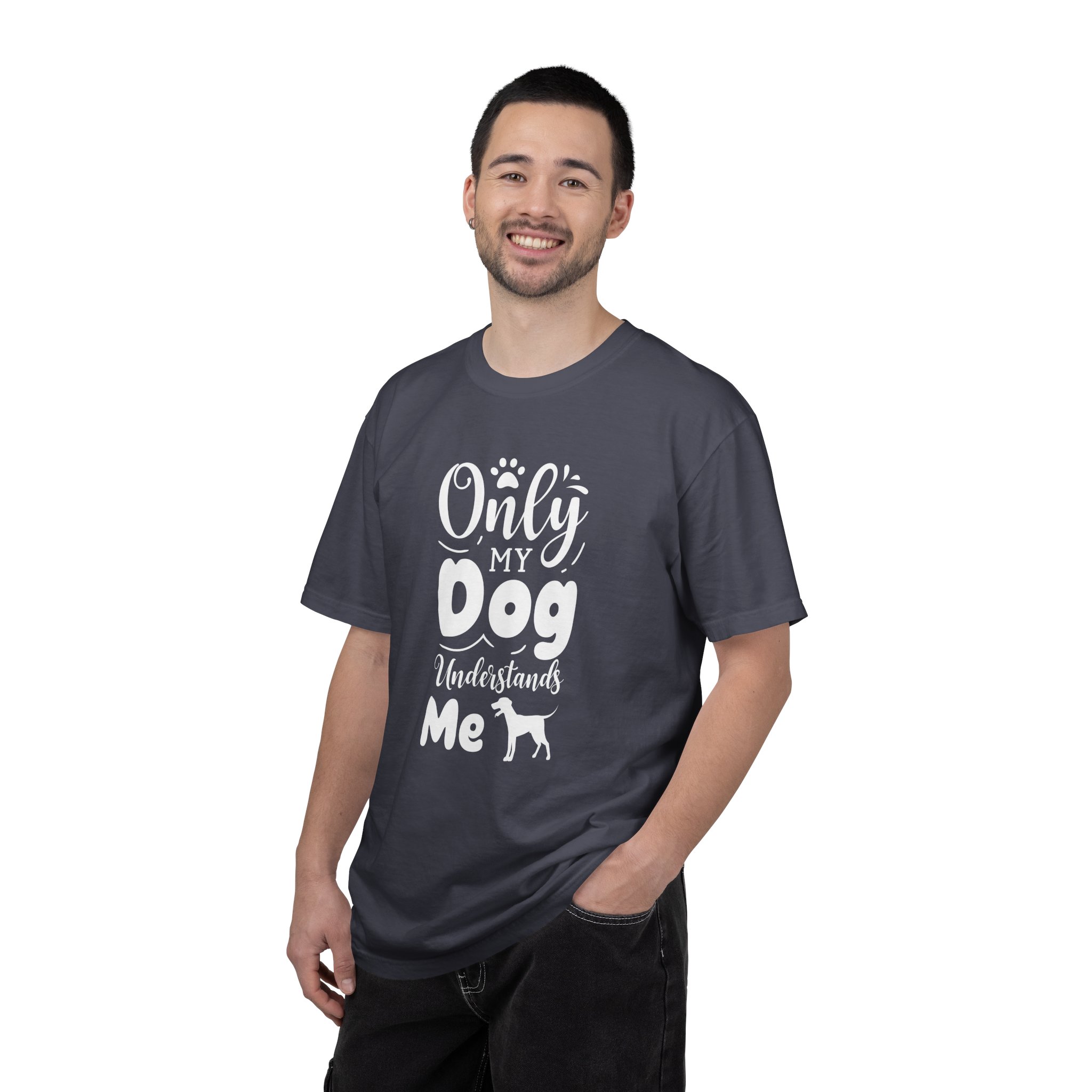 This relaxed, garment-dyed tee speaks to anyone whose best conversations happen with a wagging tail. The soft, lived-in fabric and heavyweight feel make it a go-to for slow mornings, muddy walks, and evenings curled up on the couch. A hand-lettered, playful design reads “Only my dog understands me” with a small dog silhouette—simple, honest, and a little bit goofy. It layers easily under jackets, pairs with worn jeans, and stands up to regular wear without losing that cozy, faded look. Wear it after a long hike, while you’re cleaning muddy paws, or when you need a quiet reminder that someone always gets you.