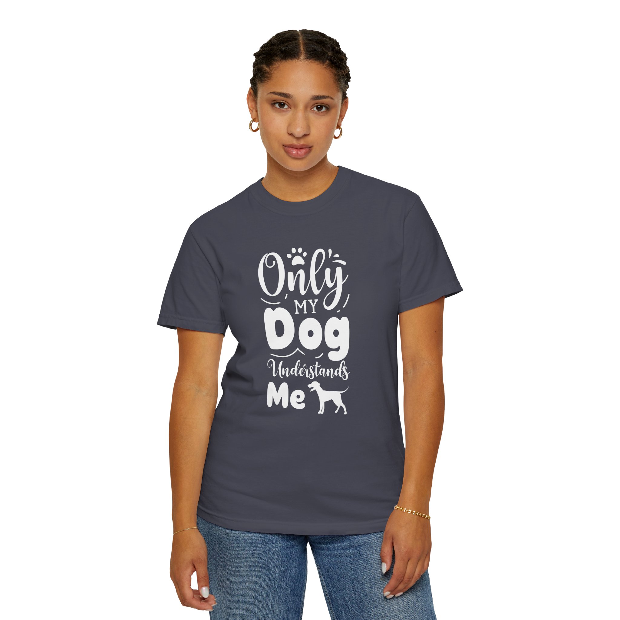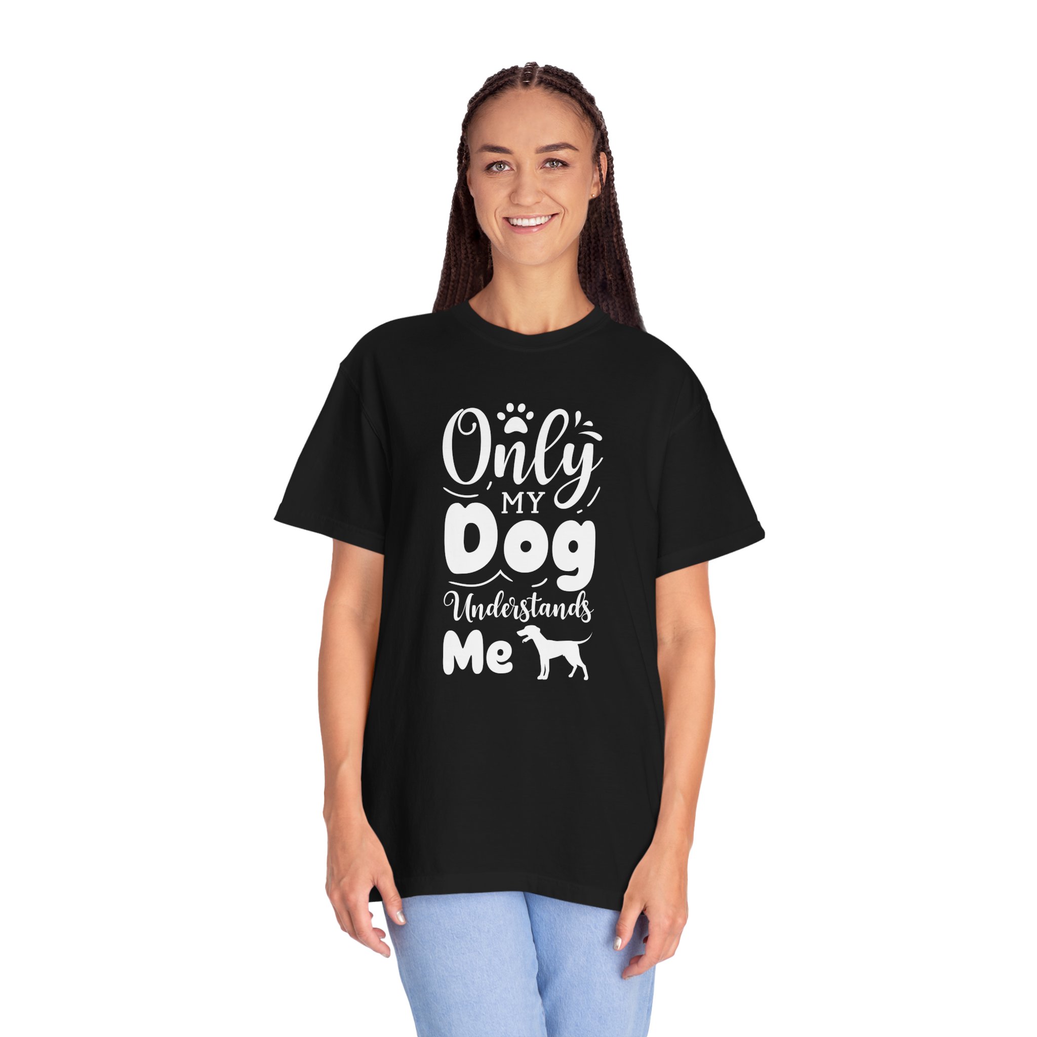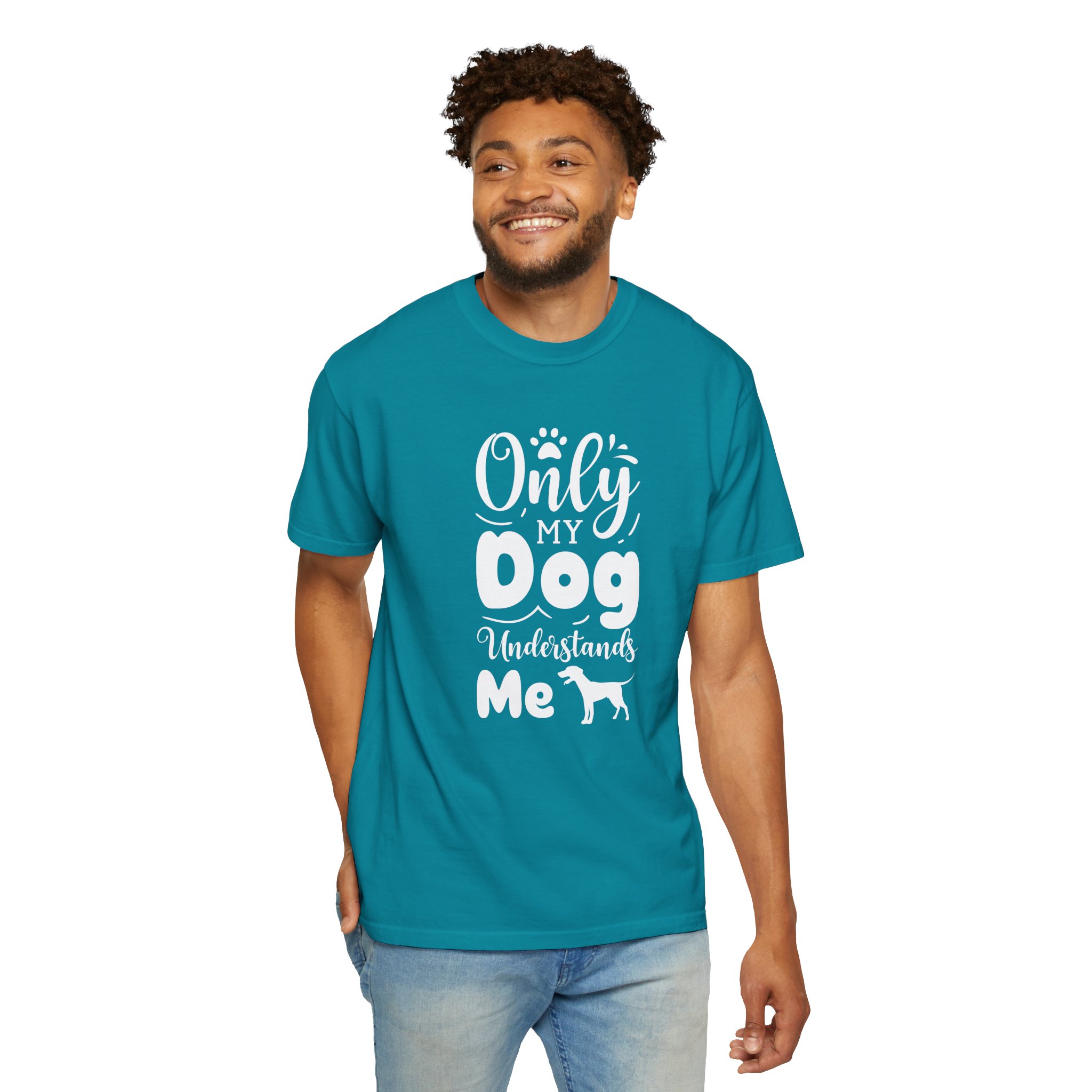 This relaxed, garment-dyed tee speaks to anyone whose best conversations happen with a wagging tail. The soft, lived-in fabric and heavyweight feel make it a go-to for slow mornings, muddy walks, and evenings curled up on the couch. A hand-lettered, playful design reads “Only my dog understands me” with a small dog silhouette—simple, honest, and a little bit goofy. It layers easily under jackets, pairs with worn jeans, and stands up to regular wear without losing that cozy, faded look. Wear it after a long hike, while you’re cleaning muddy paws, or when you need a quiet reminder that someone always gets you.