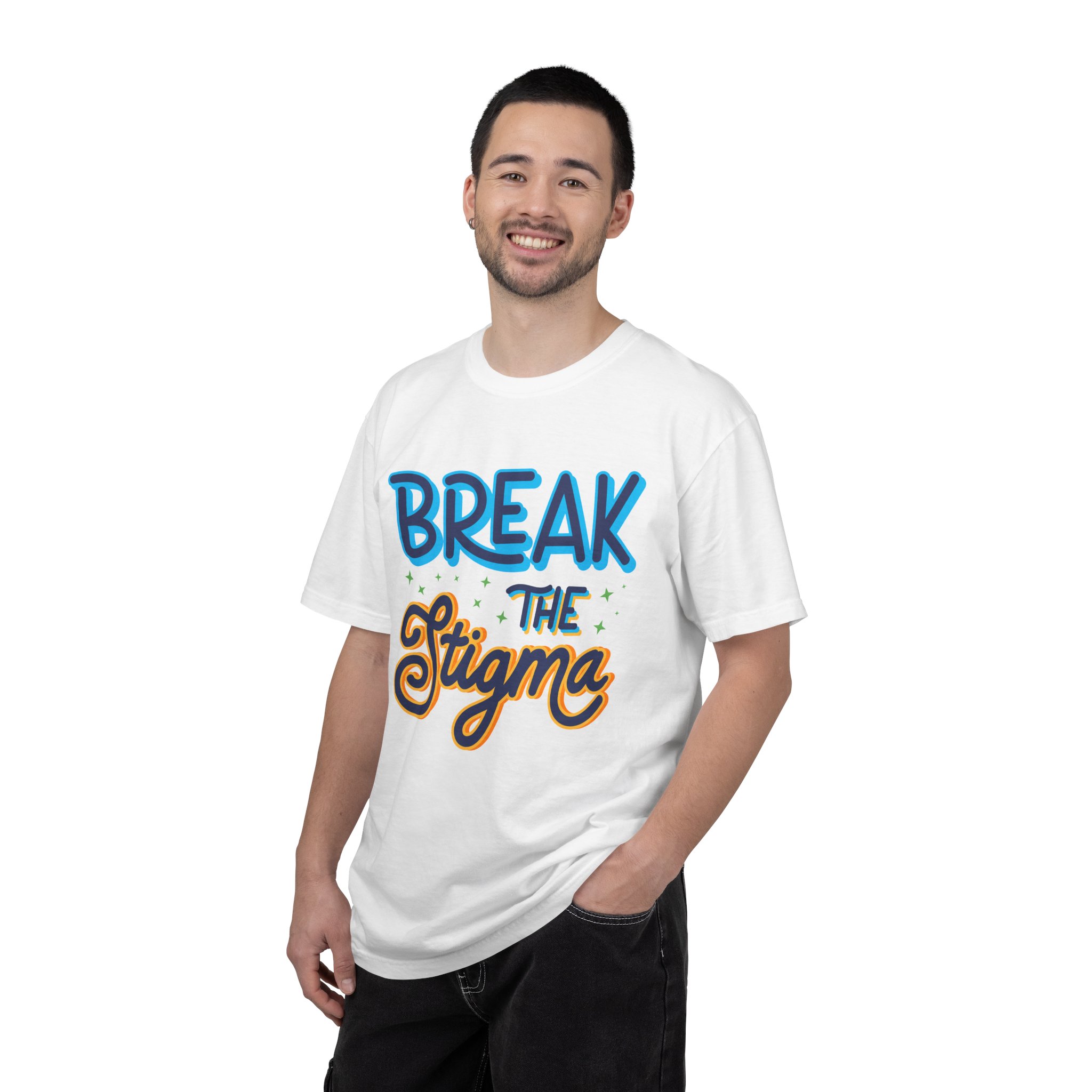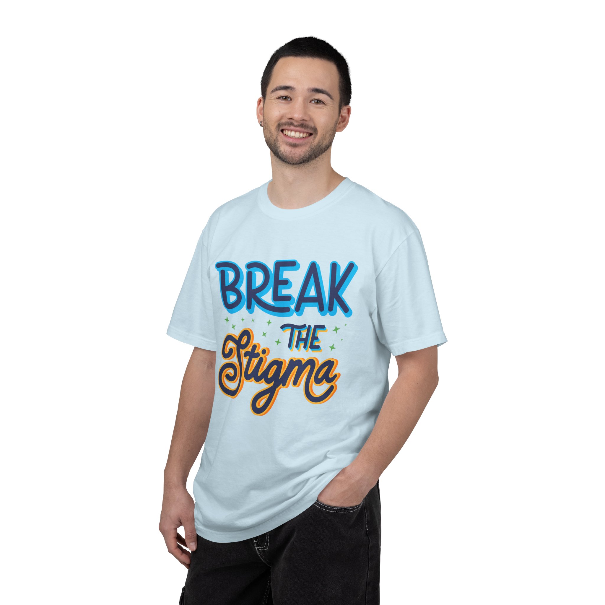 Soft, heavyweight tee with a bold, hand-lettered message: “Break the Stigma.” The garment-dyed cotton feels lived-in from the first wear, with a relaxed fit and tubular construction that drapes naturally. Bright, layered lettering pops against the shirt’s base color, turning the message into a wearable conversation starter. This shirt sits easily in community meet-ups, awareness walks, mental health events, or casual days when you want your values to speak quietly but clearly. The substantial fabric and clean double-needle seams hold up through repeated wear and washes, while the pre-shrunk ring-spun cotton keeps the shape steady. Available in a wide range of colors and sizes, it’s made to feel personal—like something you’ve owned for years the moment you put it on.