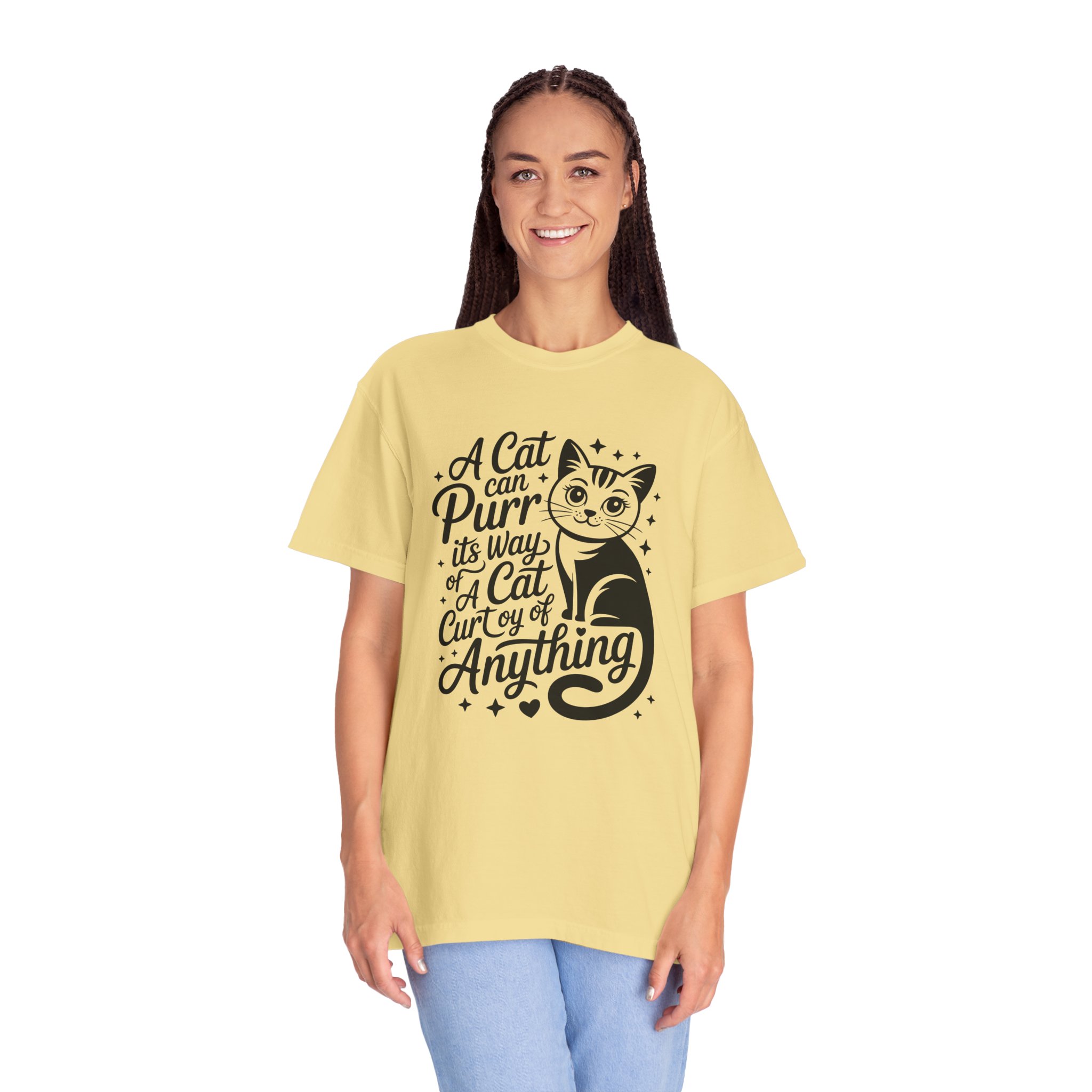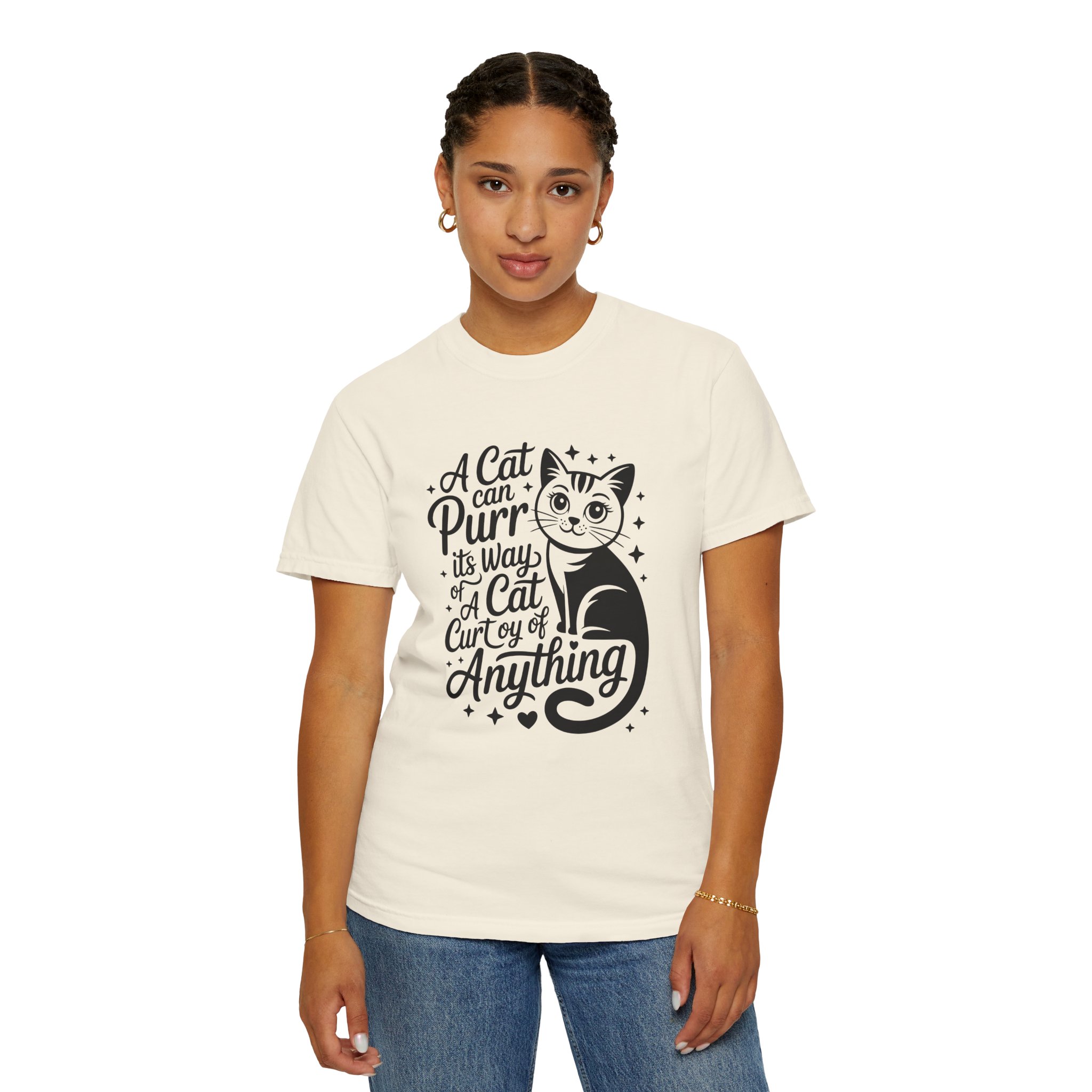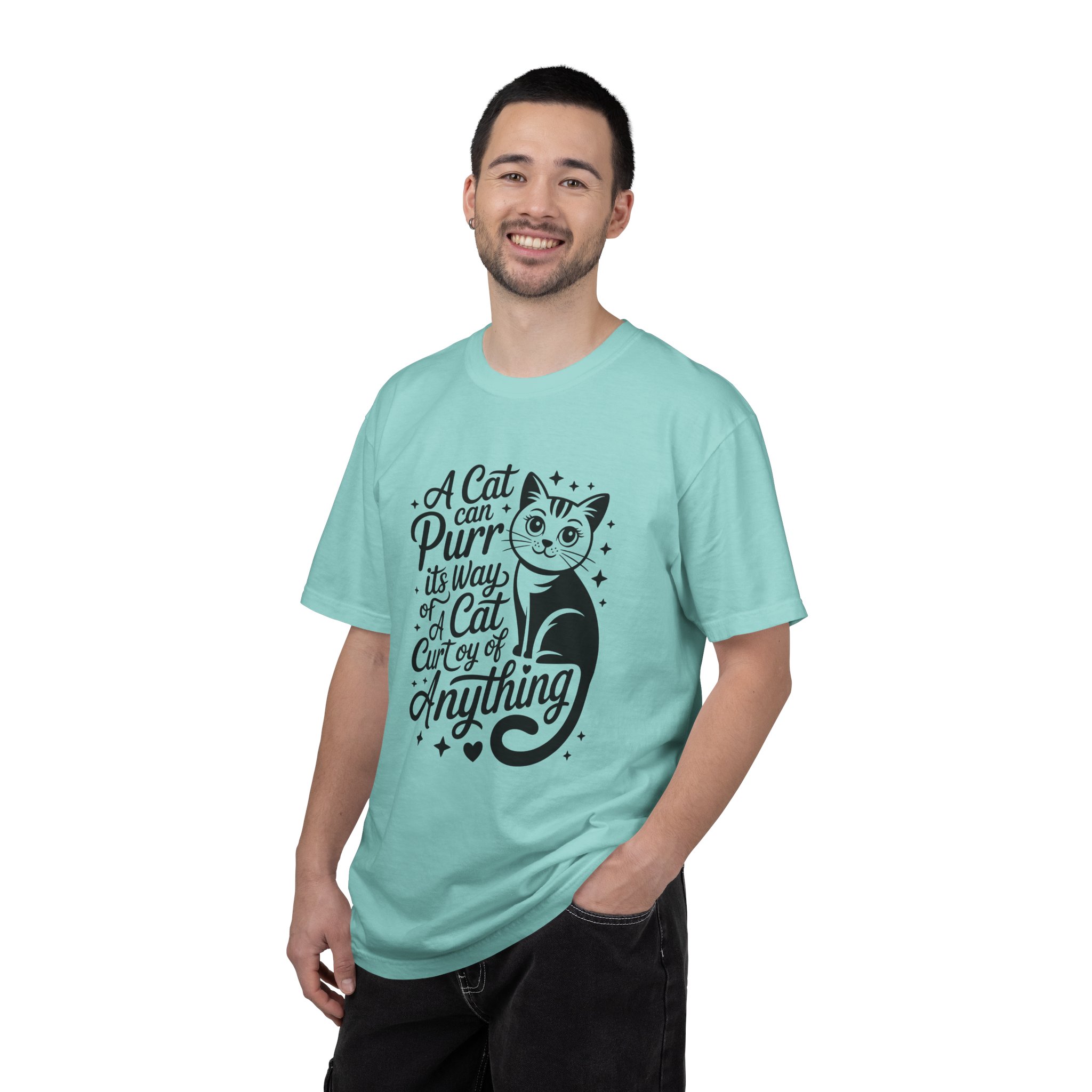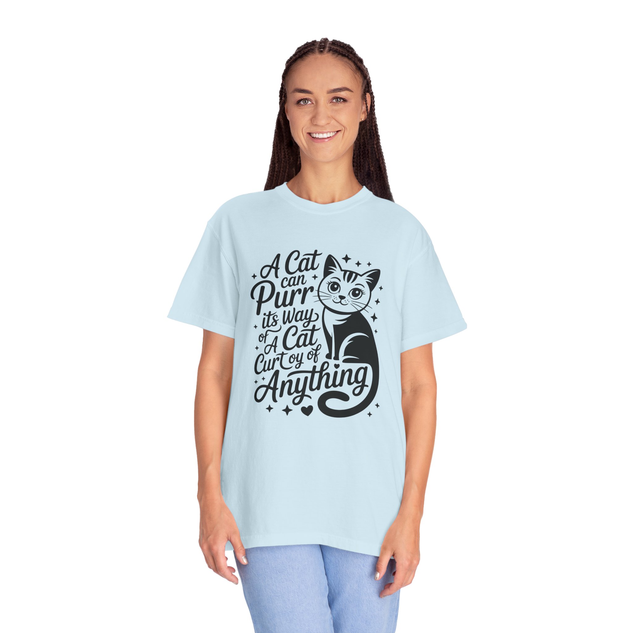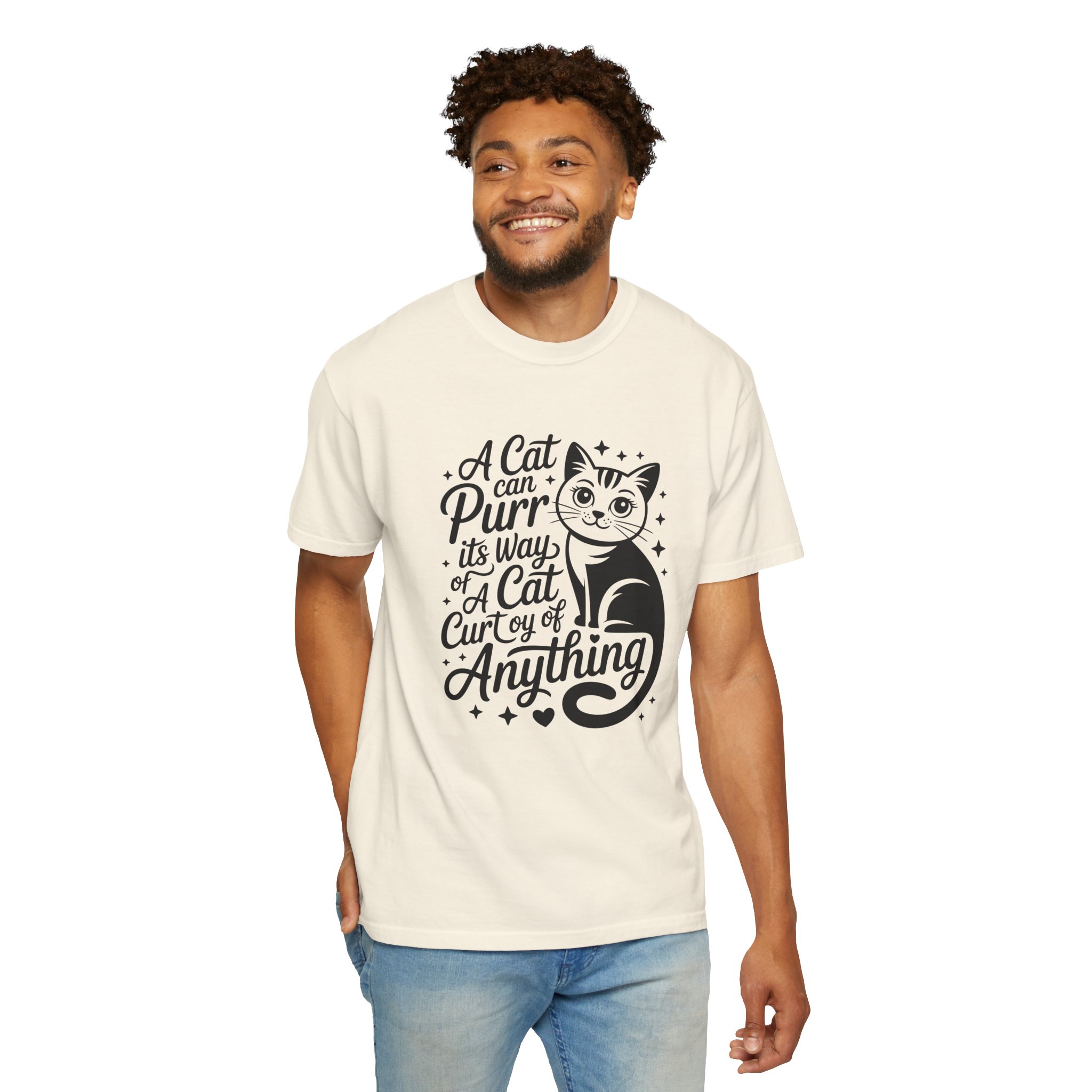Soft, lived-in cotton with a playful nod to anyone who lets a cat run the show. This garment-dyed tee settles into a gentle, vintage feel the moment you pull it on — slightly faded color, relaxed drape, and a heavyweight hand that still breathes. The front features a charming, hand-lettered cat illustration and the whimsical line: “A cat can purr its way; a cat cur[s]y of anything,” adding personality without shouting. Wear it at home during slow mornings, on casual walks with your feline co-pilot, or layered under a cardigan for an easy, cozy look that says you live by cat logic.