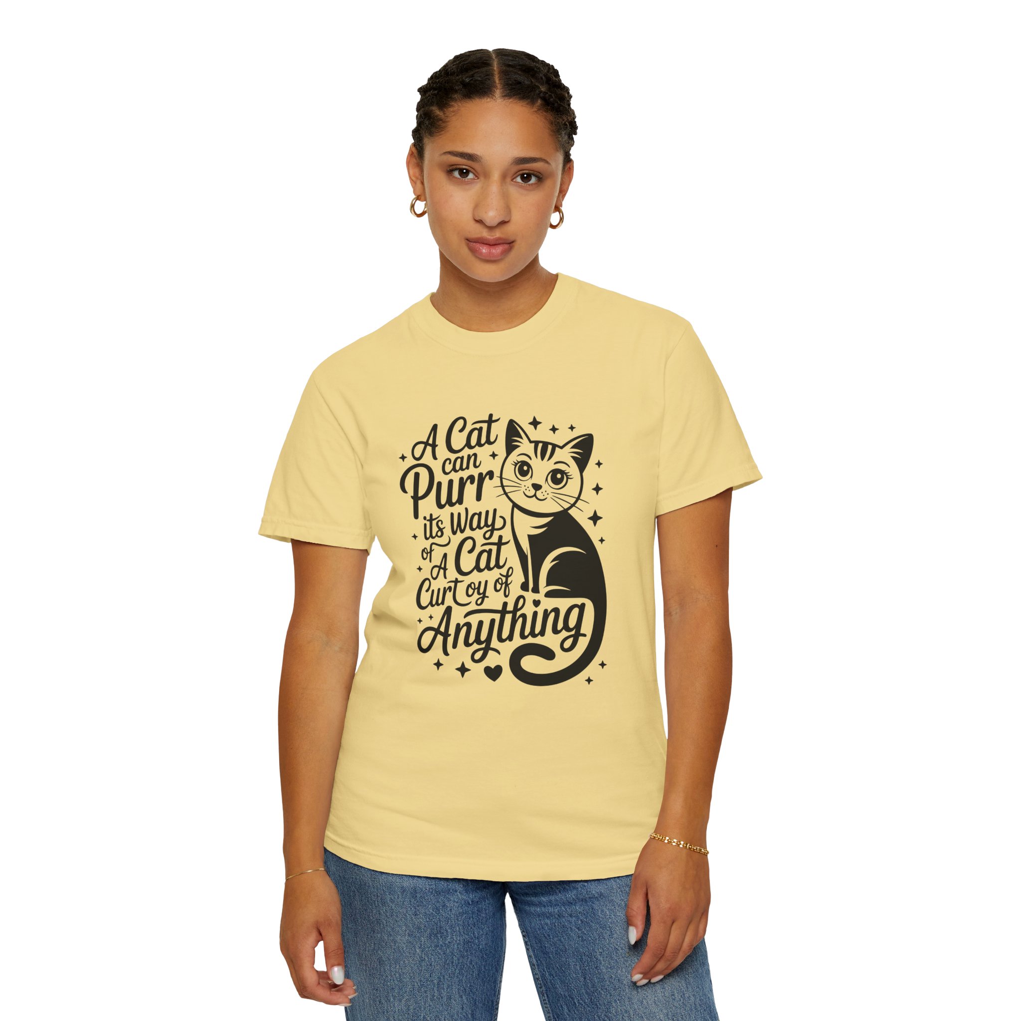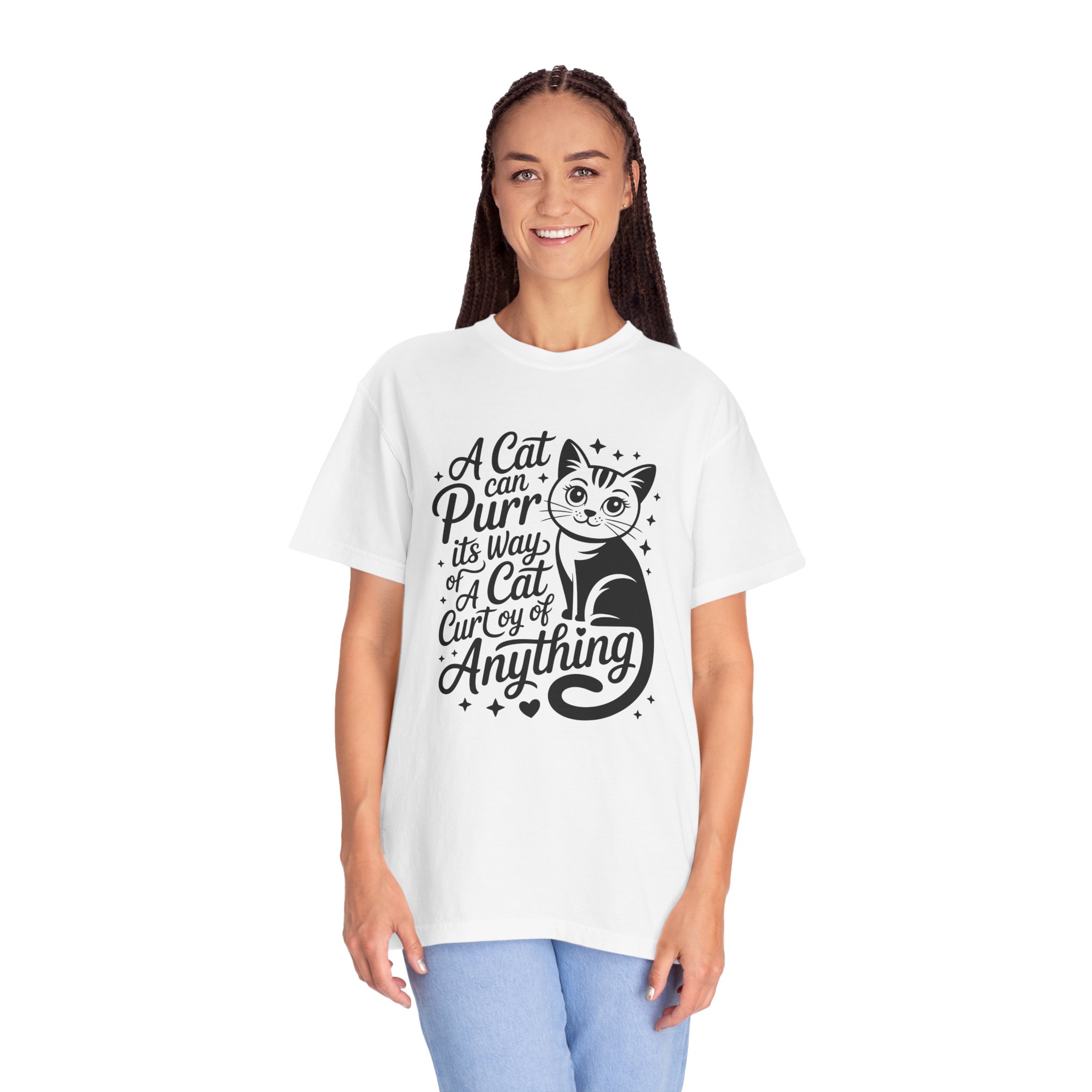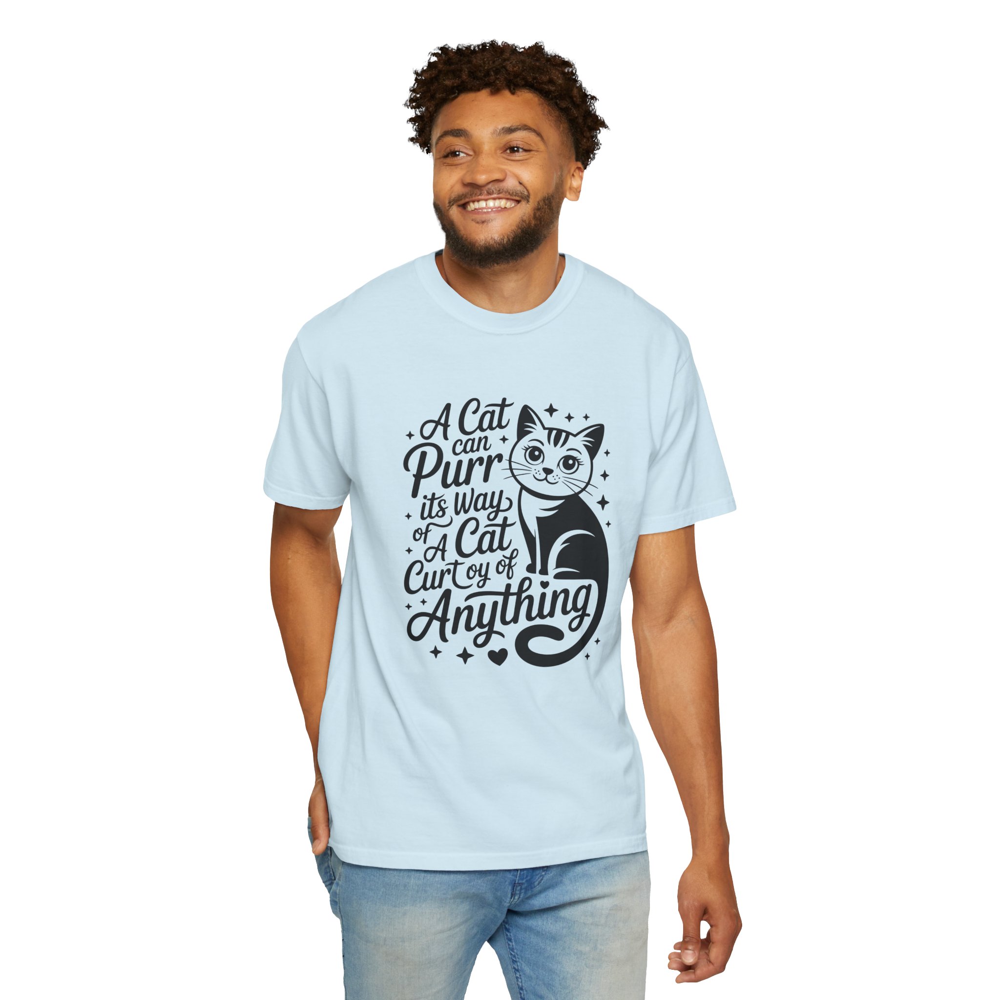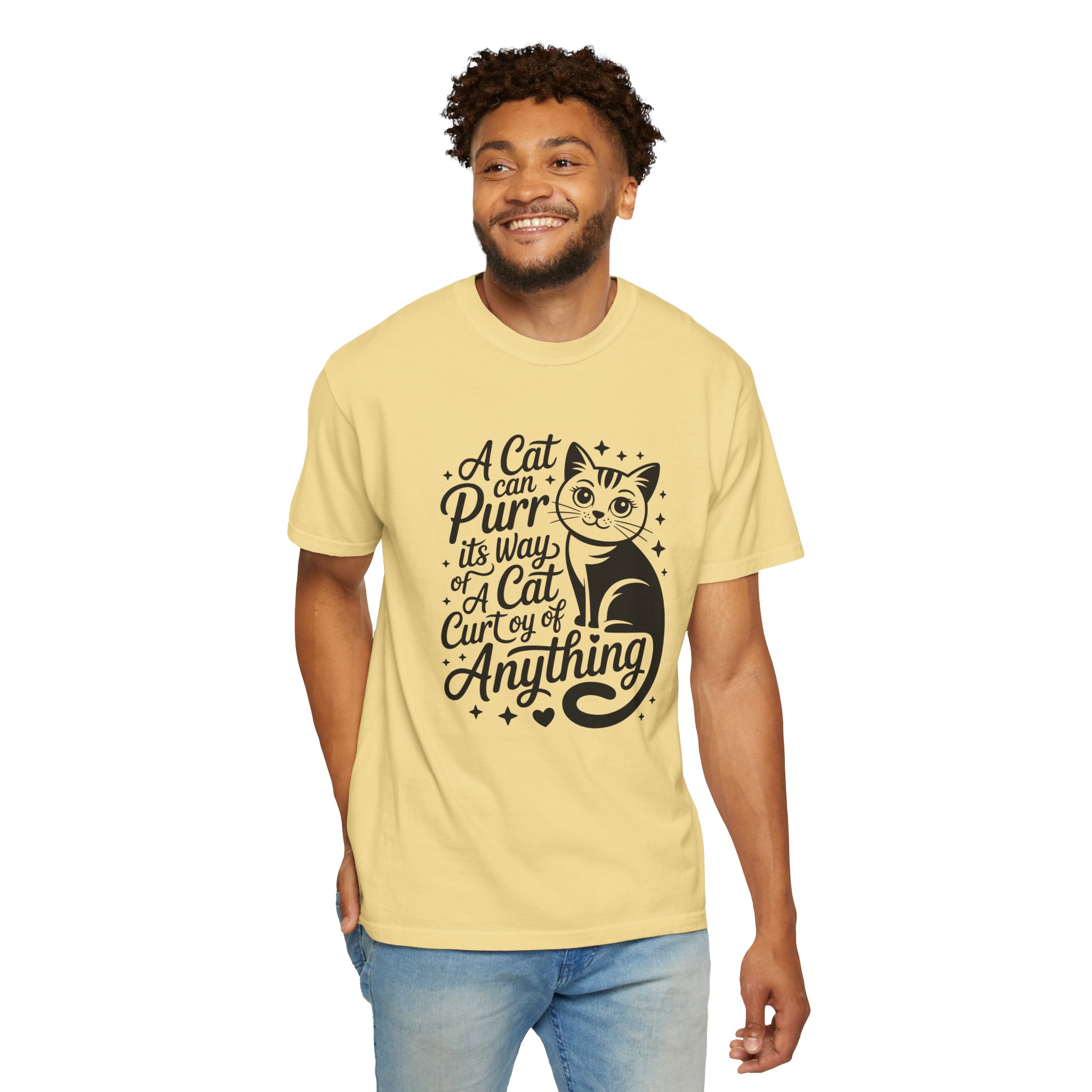 Soft, lived-in cotton with a playful nod to anyone who lets a cat run the show. This garment-dyed tee settles into a gentle, vintage feel the moment you pull it on — slightly faded color, relaxed drape, and a heavyweight hand that still breathes. The front features a charming, hand-lettered cat illustration and the whimsical line: “A cat can purr its way; a cat cur[s]y of anything,” adding personality without shouting. Wear it at home during slow mornings, on casual walks with your feline co-pilot, or layered under a cardigan for an easy, cozy look that says you live by cat logic.