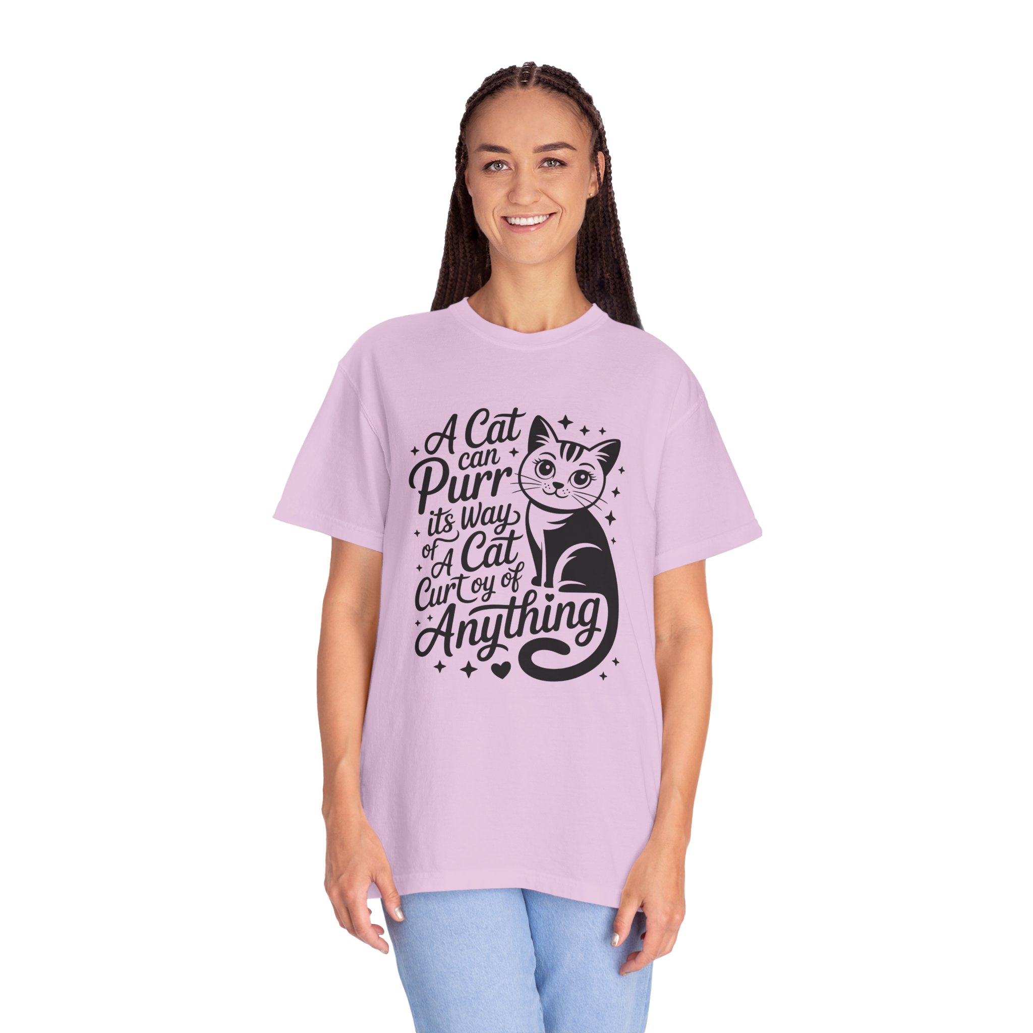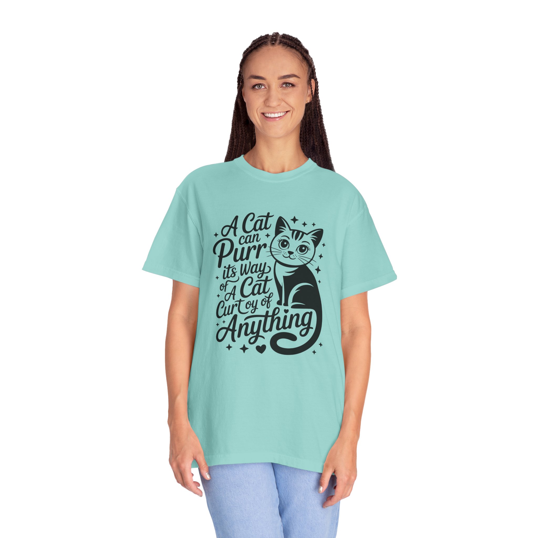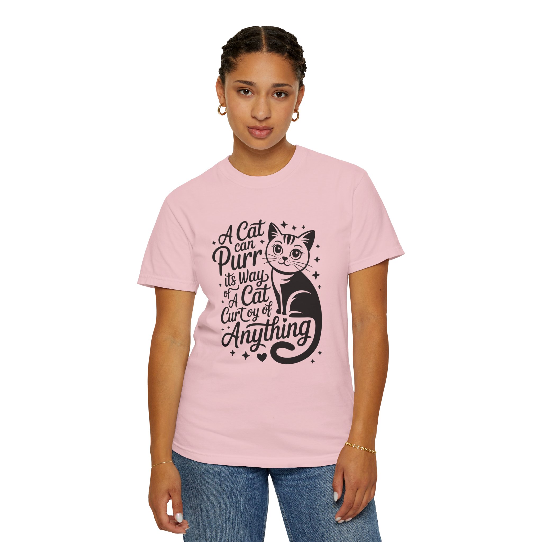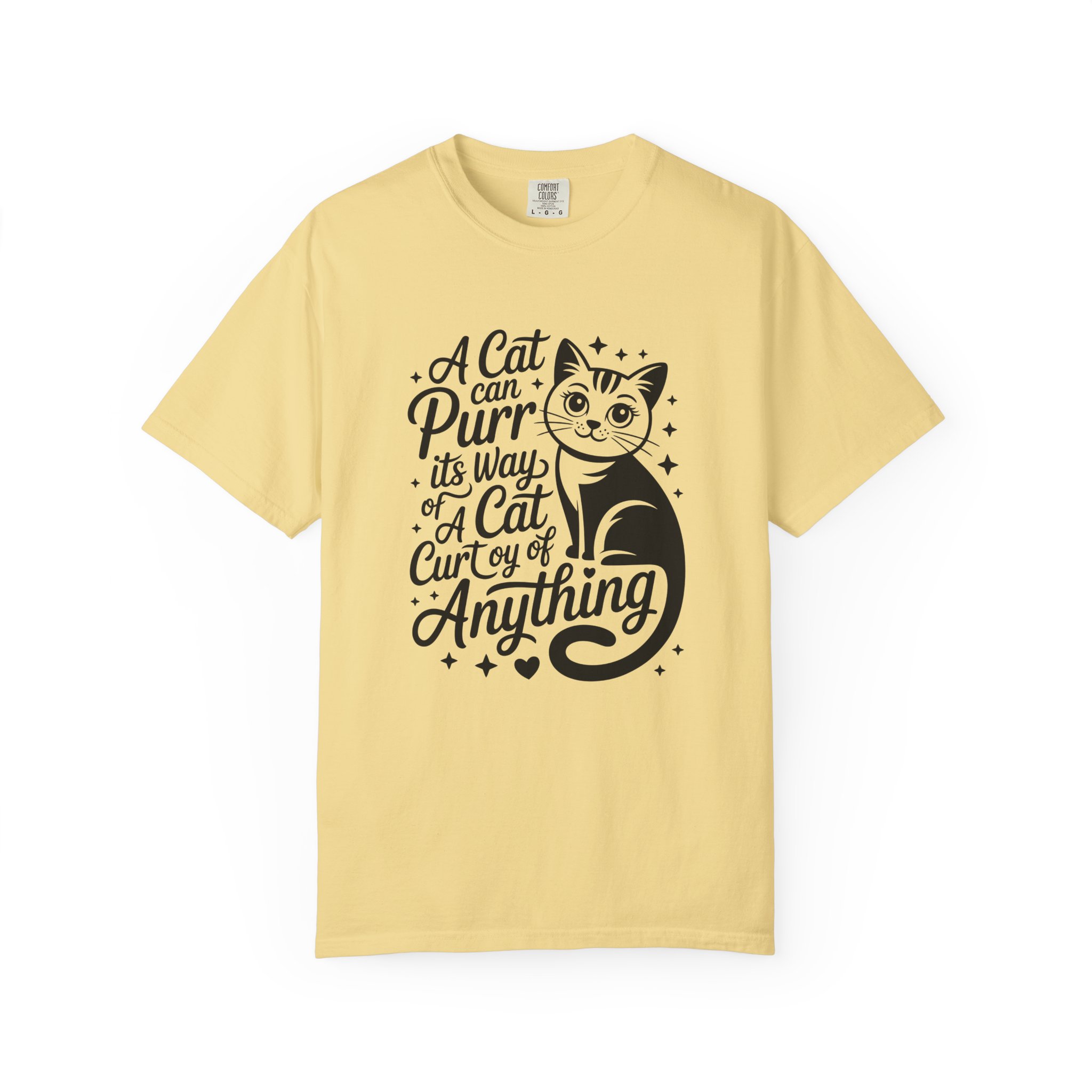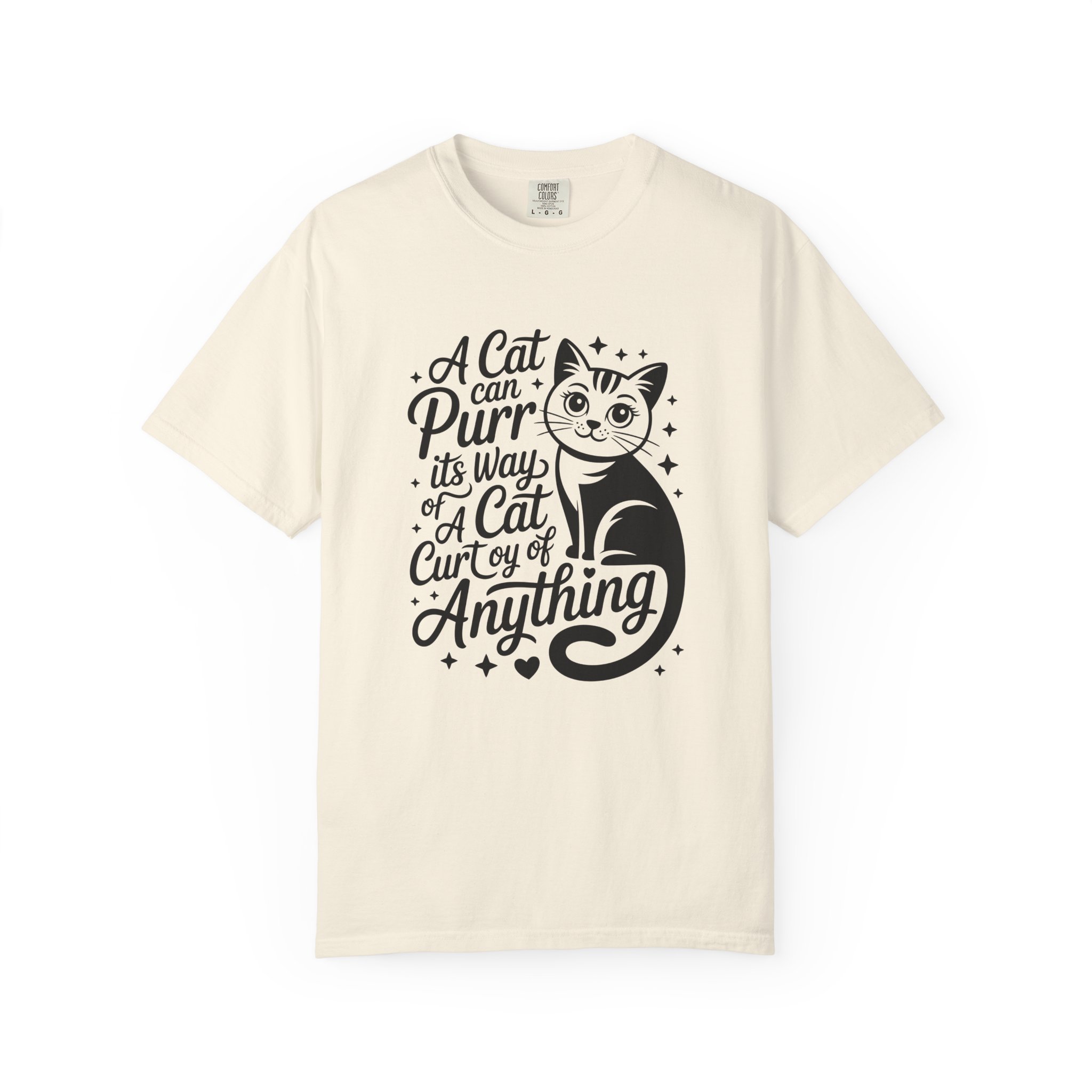 Soft, lived-in cotton with a playful nod to anyone who lets a cat run the show. This garment-dyed tee settles into a gentle, vintage feel the moment you pull it on — slightly faded color, relaxed drape, and a heavyweight hand that still breathes. The front features a charming, hand-lettered cat illustration and the whimsical line: “A cat can purr its way; a cat cur[s]y of anything,” adding personality without shouting. Wear it at home during slow mornings, on casual walks with your feline co-pilot, or layered under a cardigan for an easy, cozy look that says you live by cat logic.
