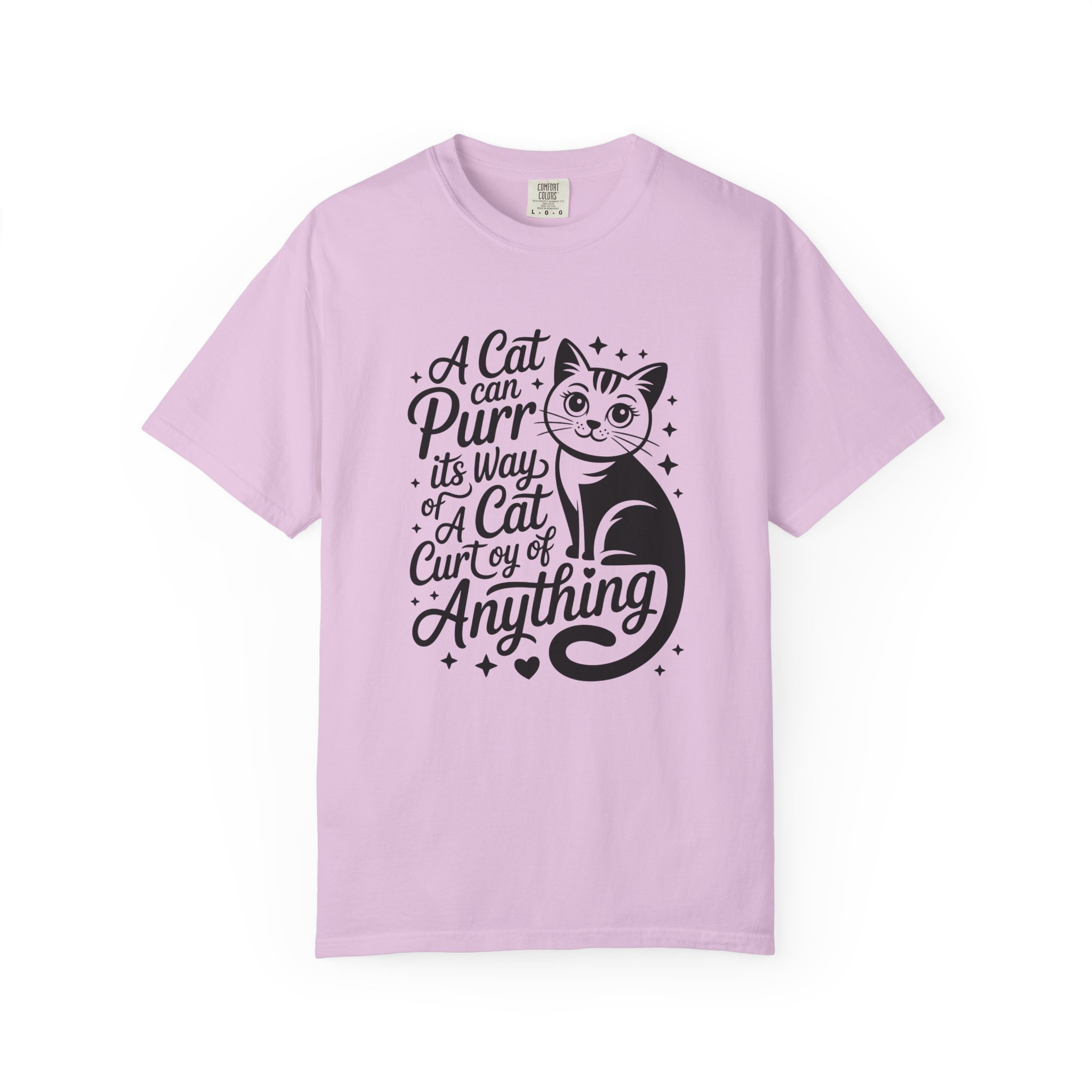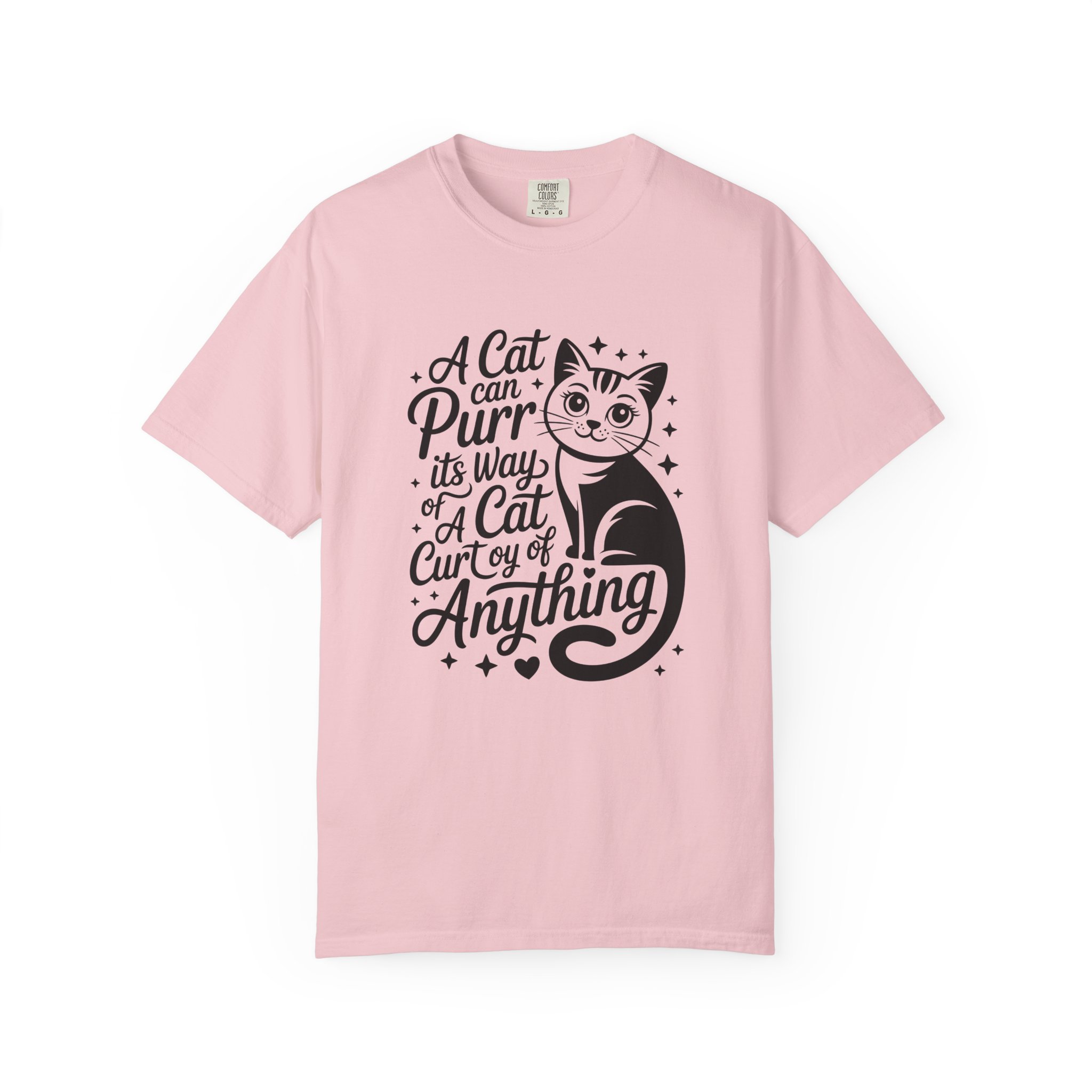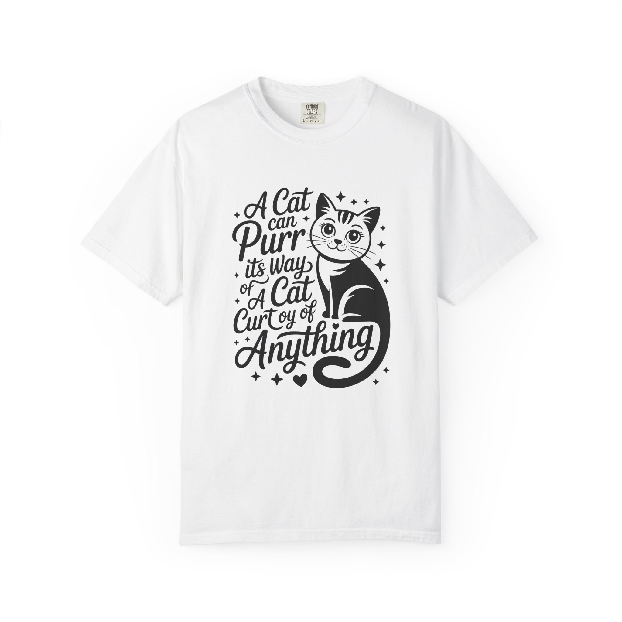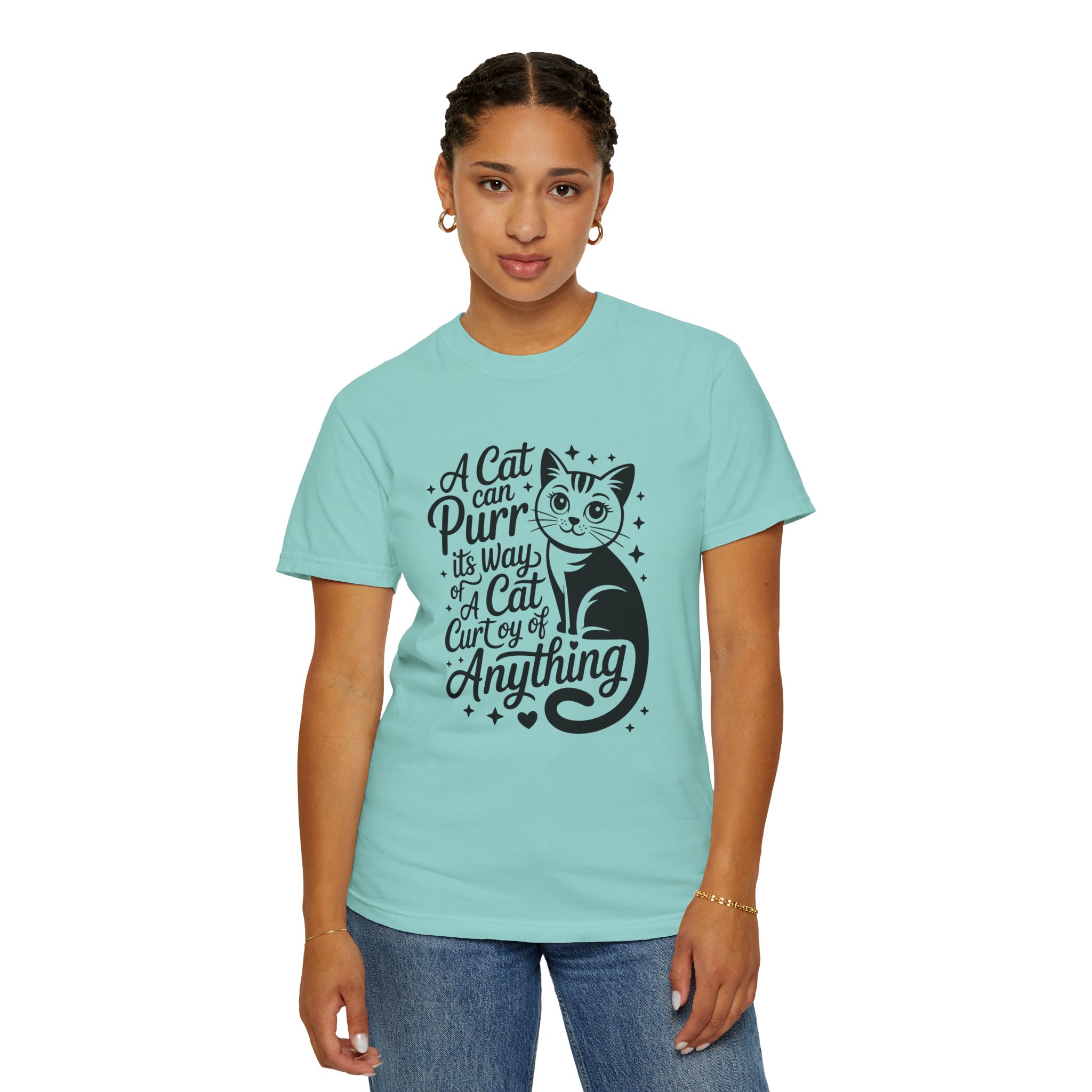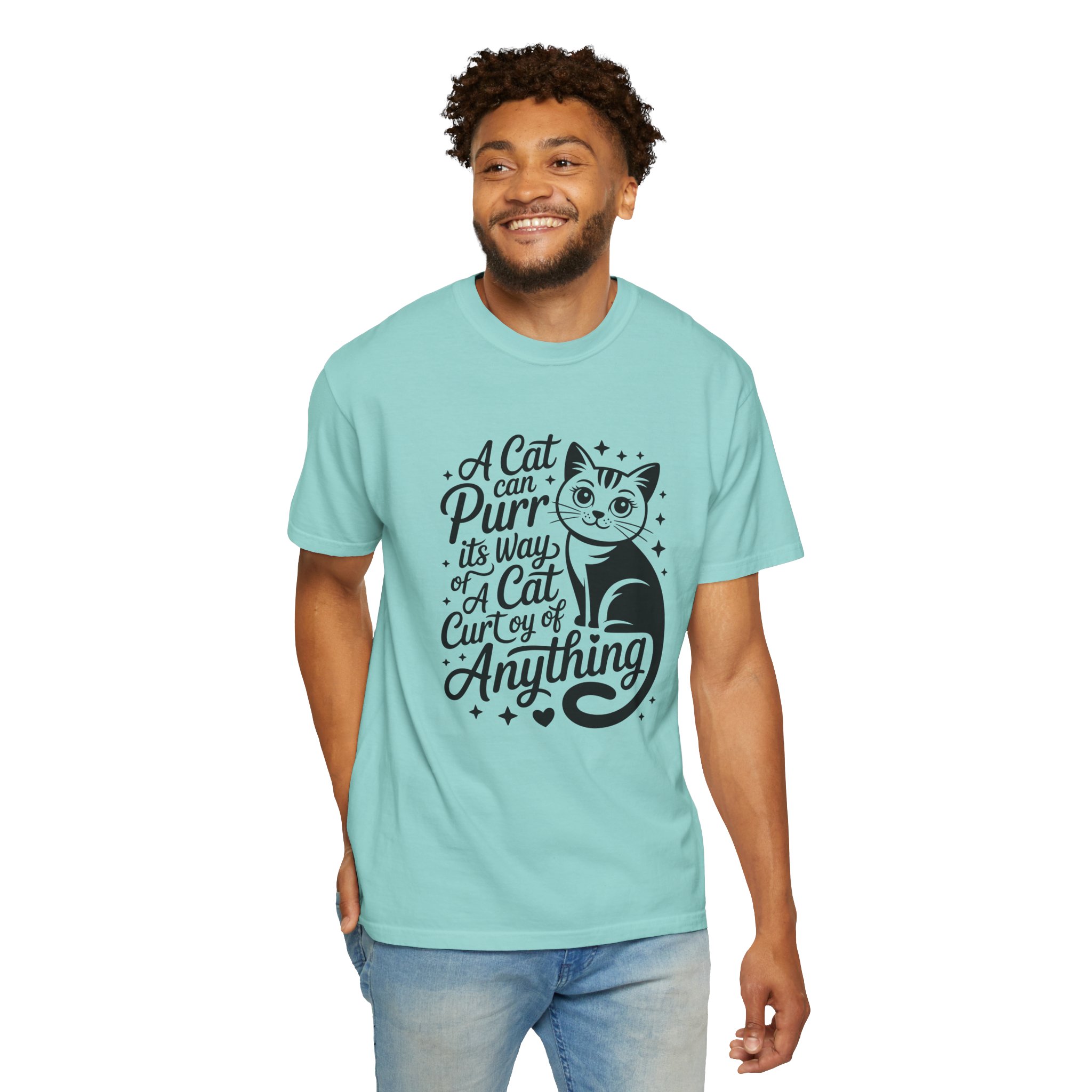 Soft, lived-in cotton with a playful nod to anyone who lets a cat run the show. This garment-dyed tee settles into a gentle, vintage feel the moment you pull it on — slightly faded color, relaxed drape, and a heavyweight hand that still breathes. The front features a charming, hand-lettered cat illustration and the whimsical line: “A cat can purr its way; a cat cur[s]y of anything,” adding personality without shouting. Wear it at home during slow mornings, on casual walks with your feline co-pilot, or layered under a cardigan for an easy, cozy look that says you live by cat logic.