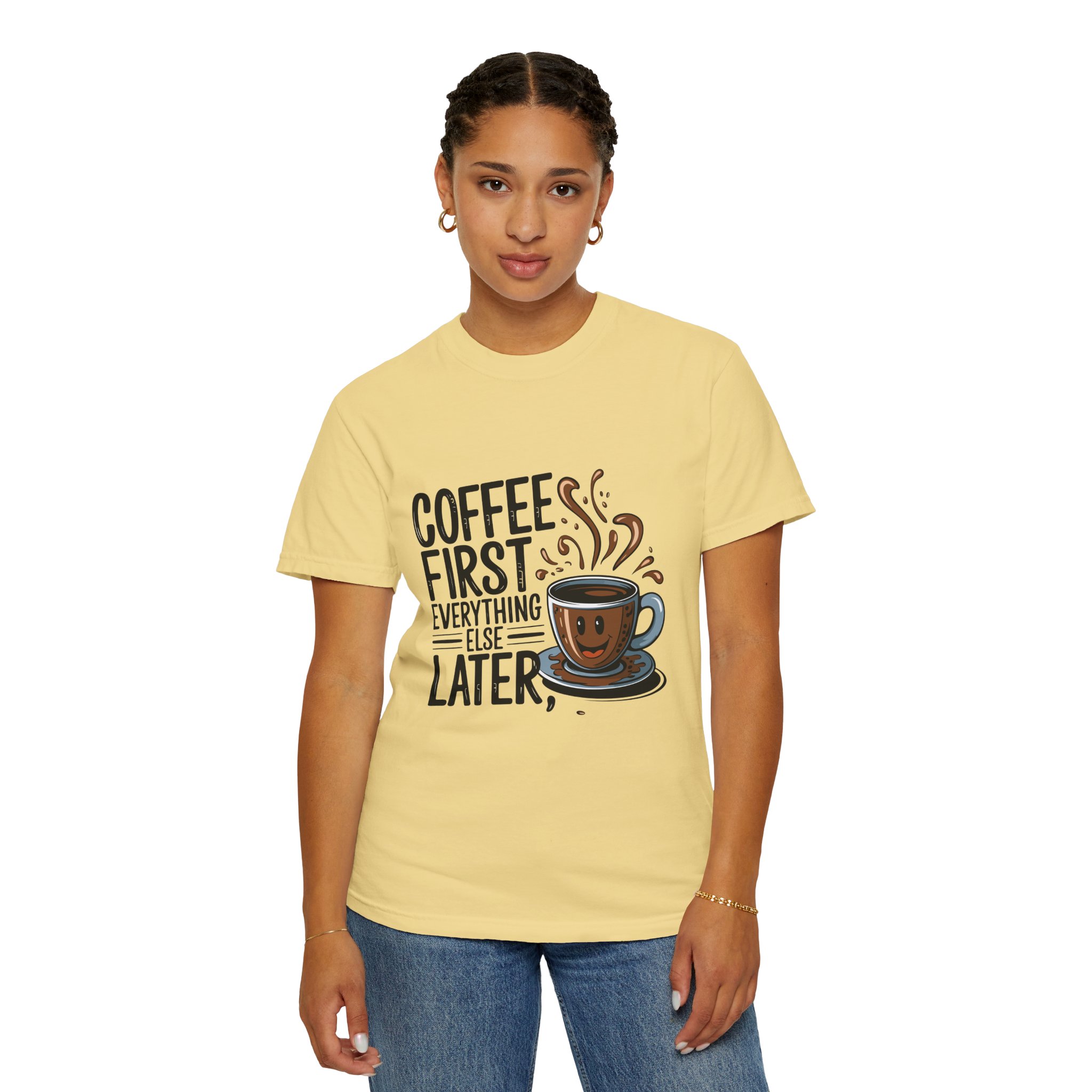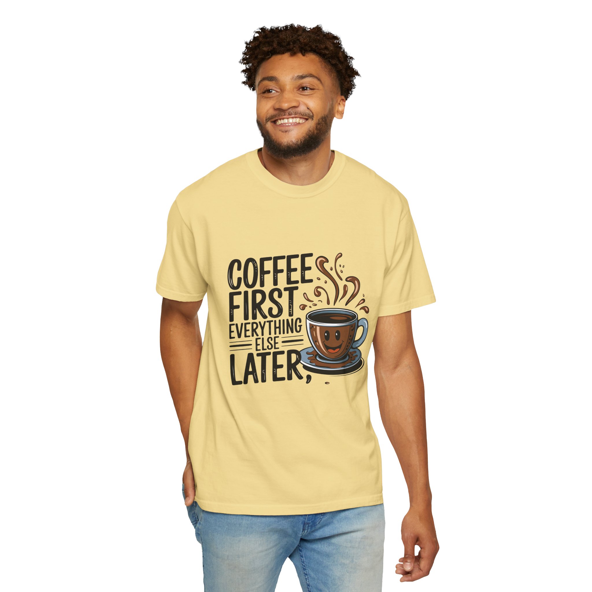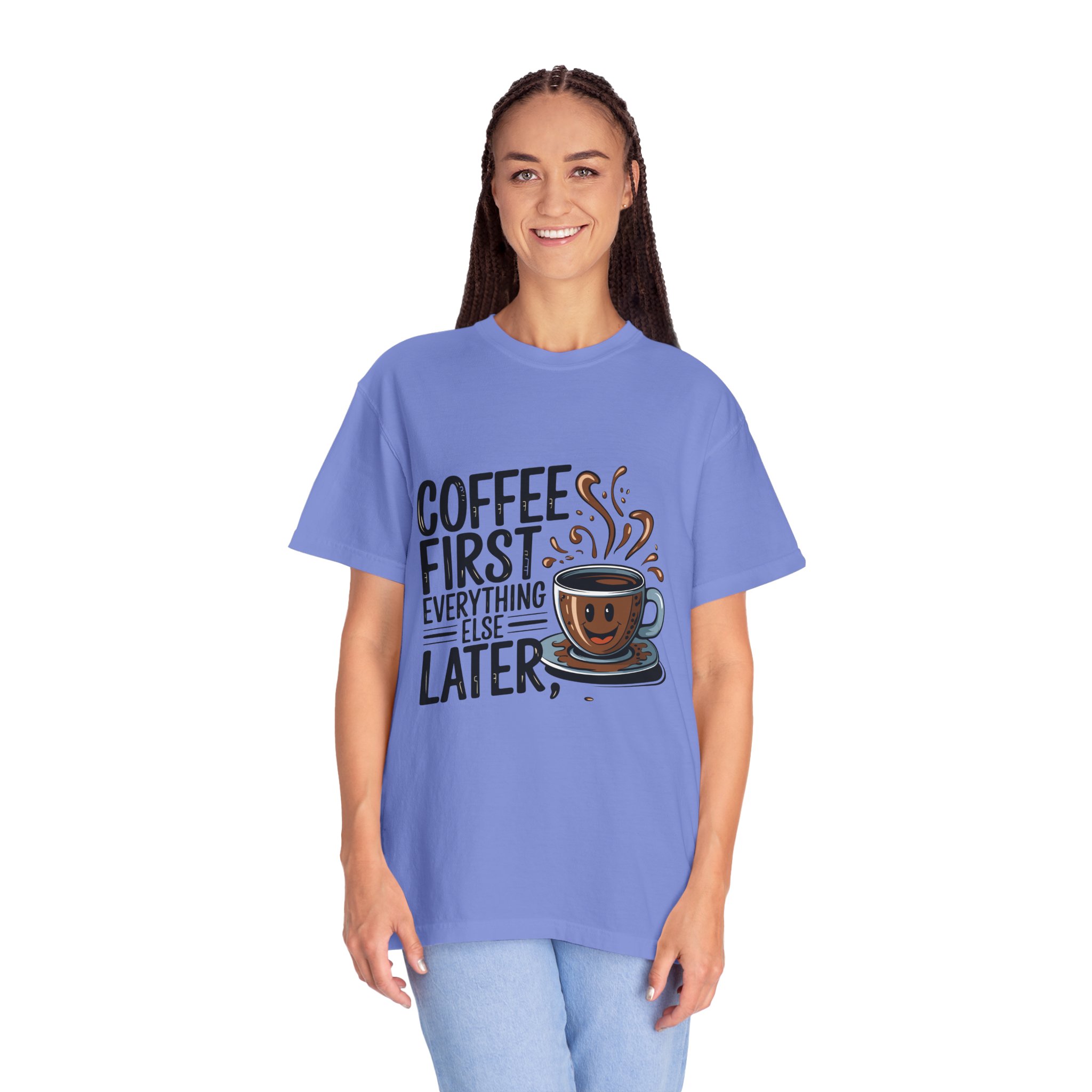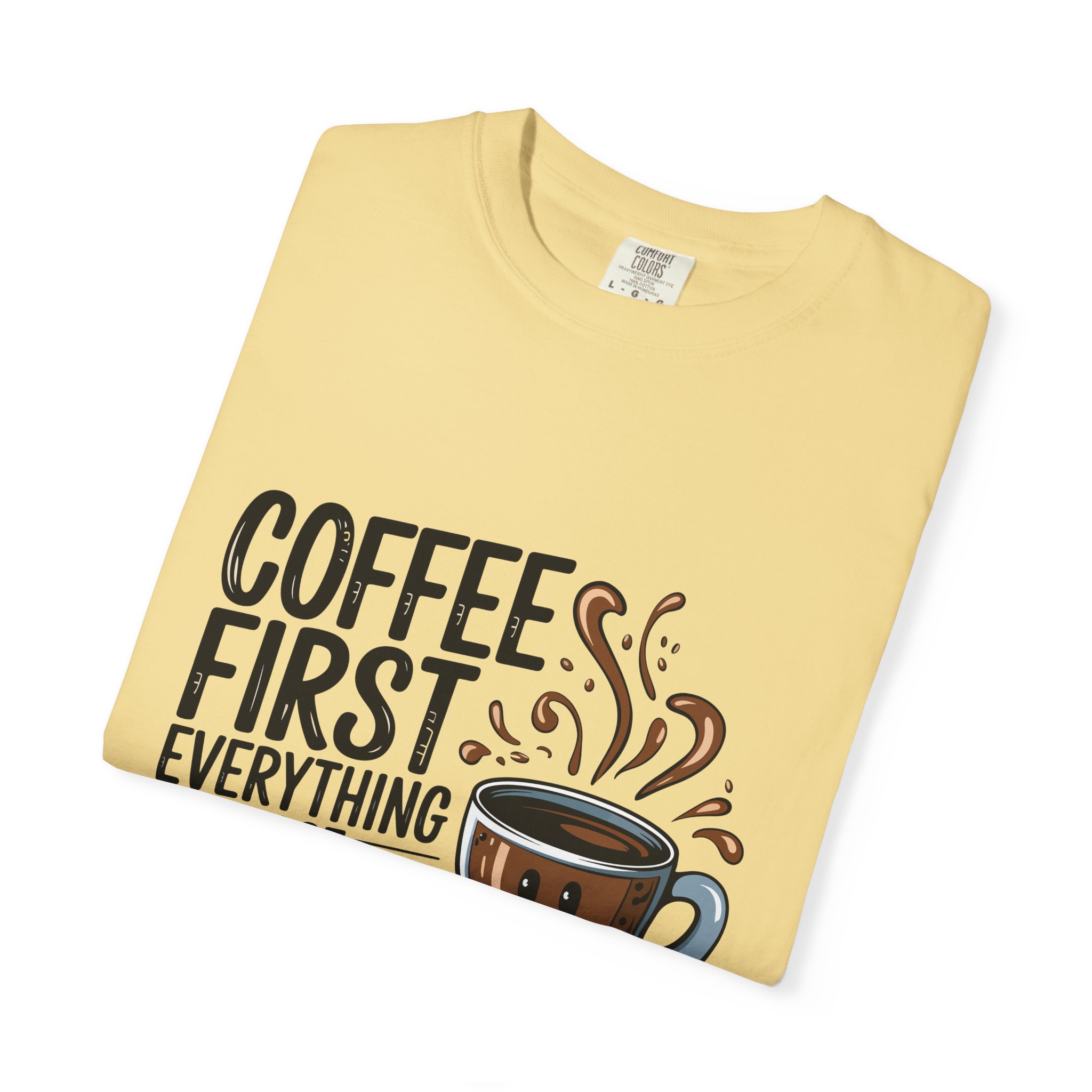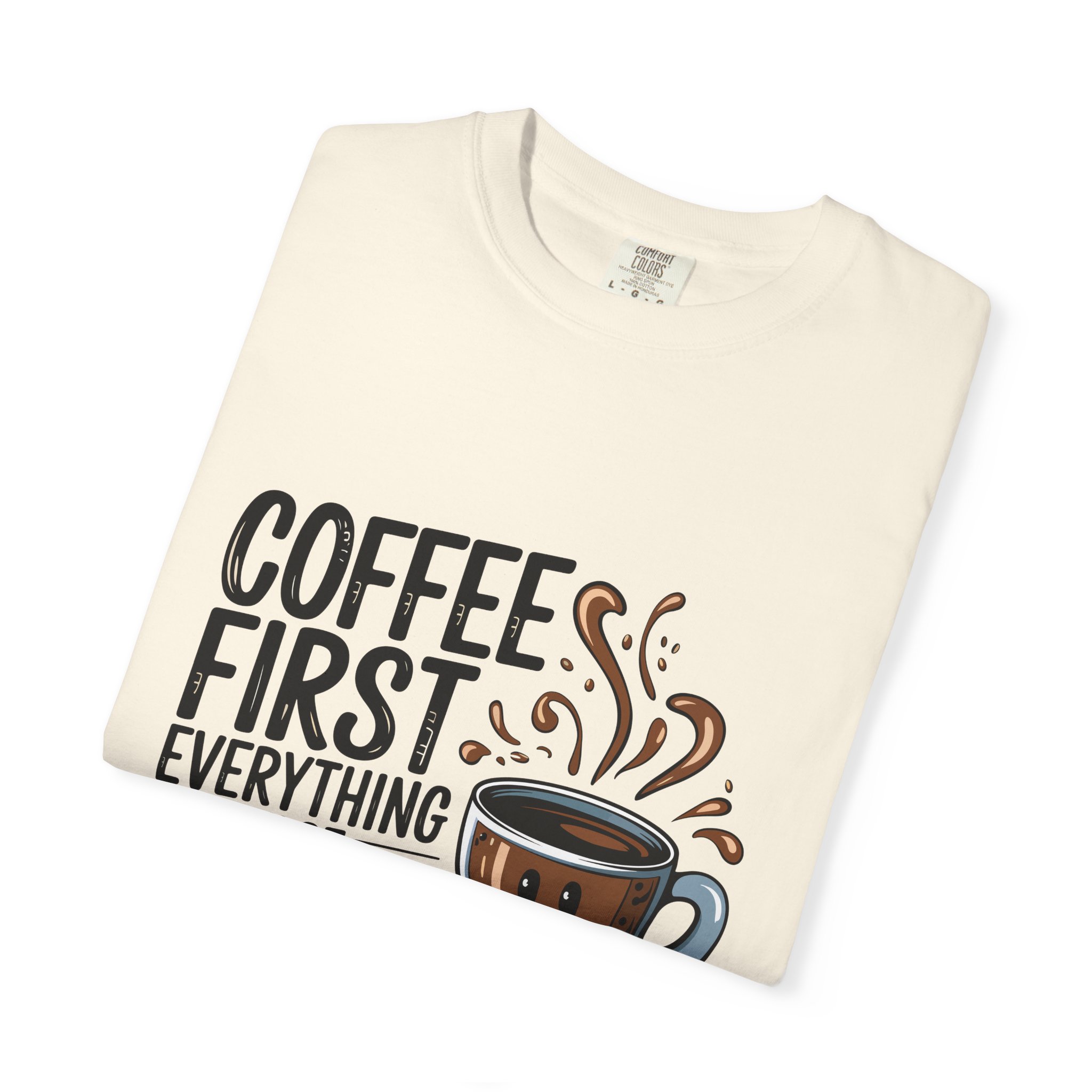 Coffee First Unisex Garment-Dyed T-shirt, Funny Coffee Lover Tee, Gift for Baristas, Funny Quote Shirt, Casual Everyday Wear.