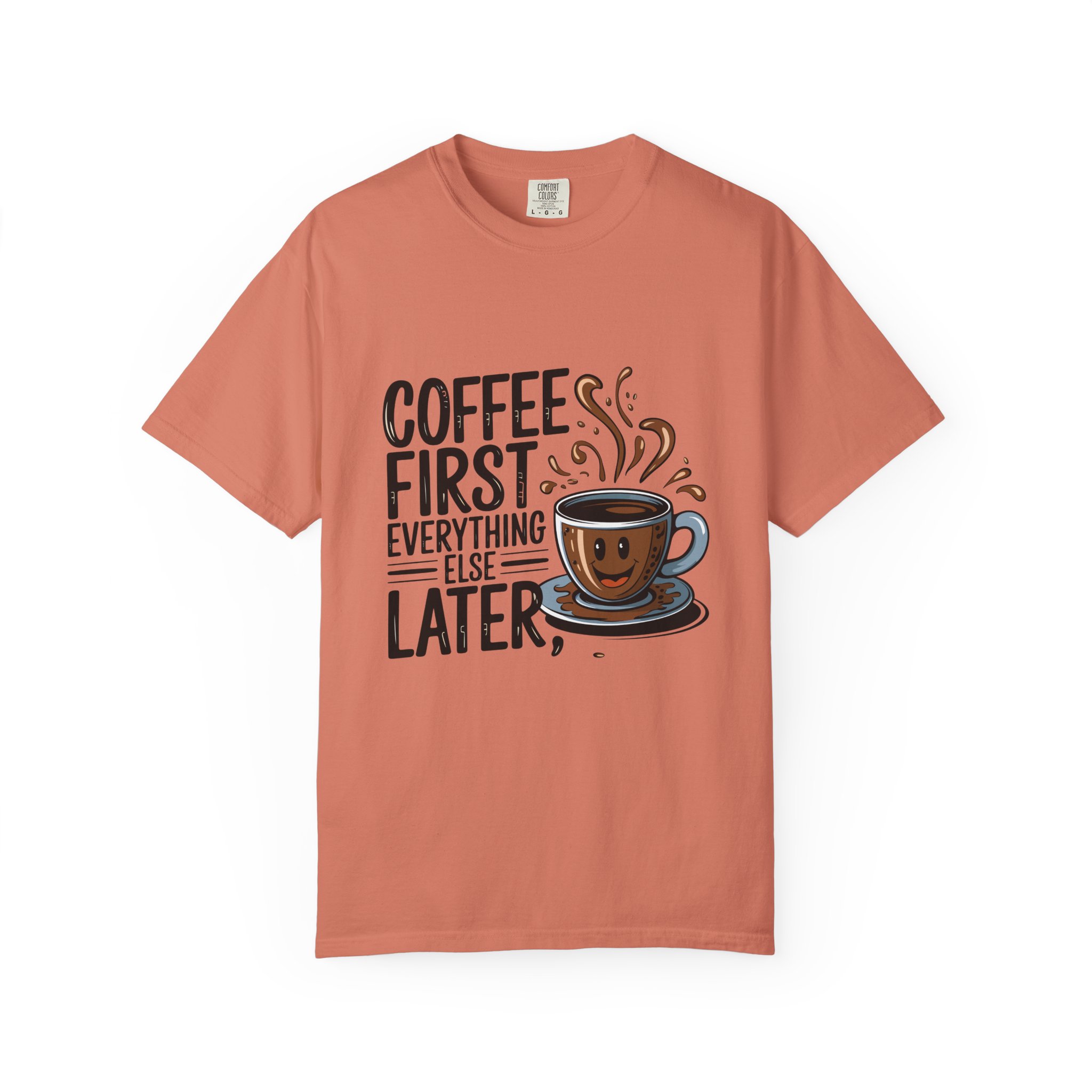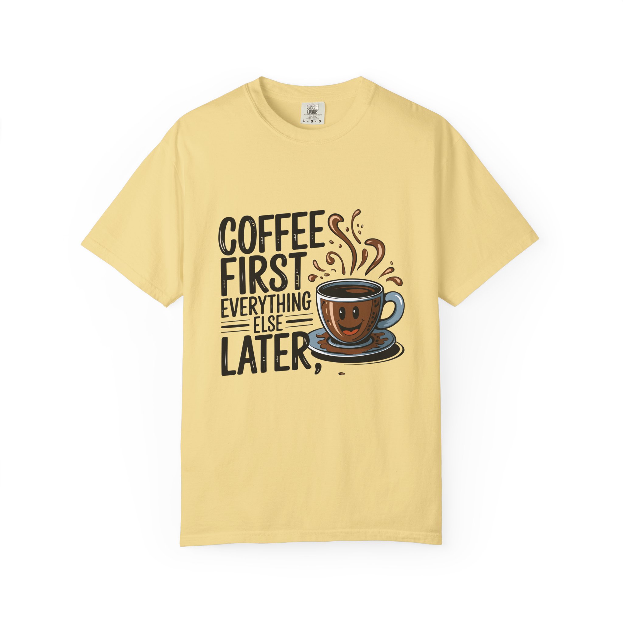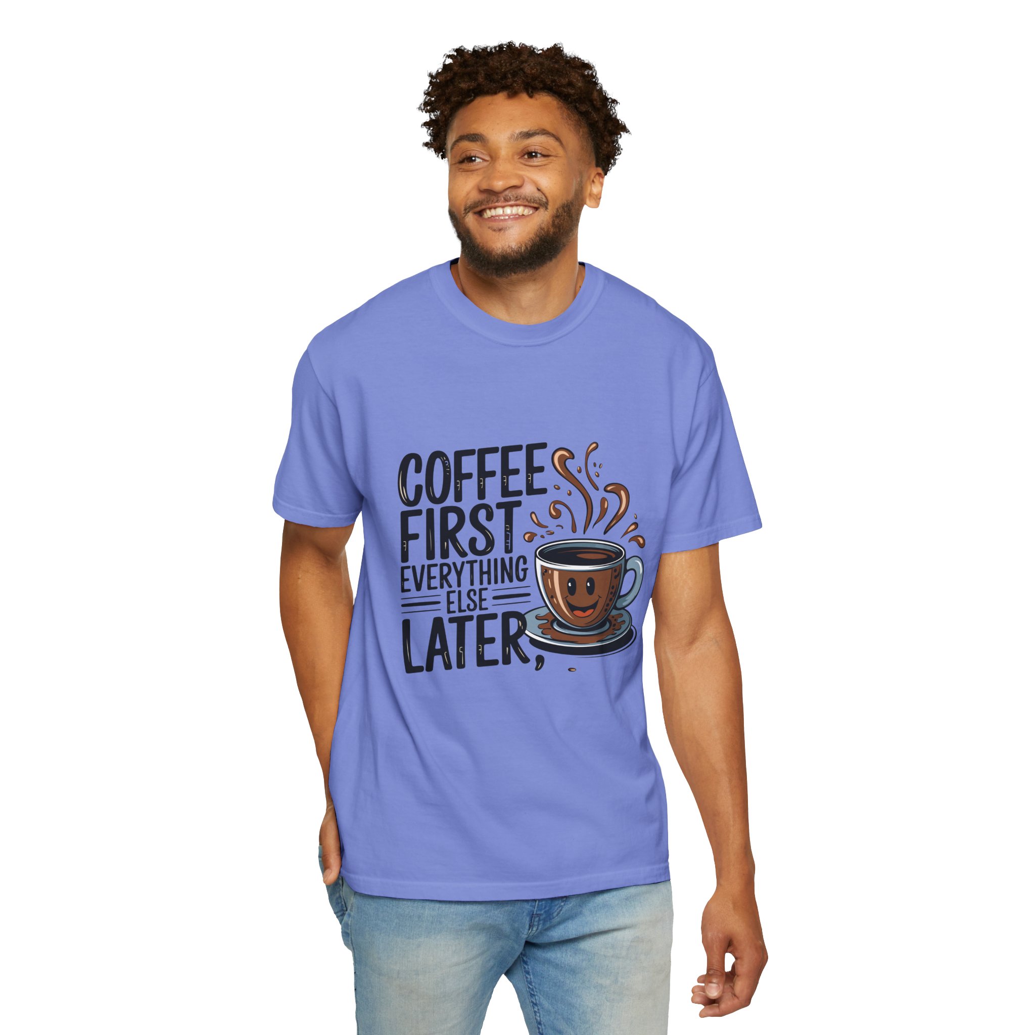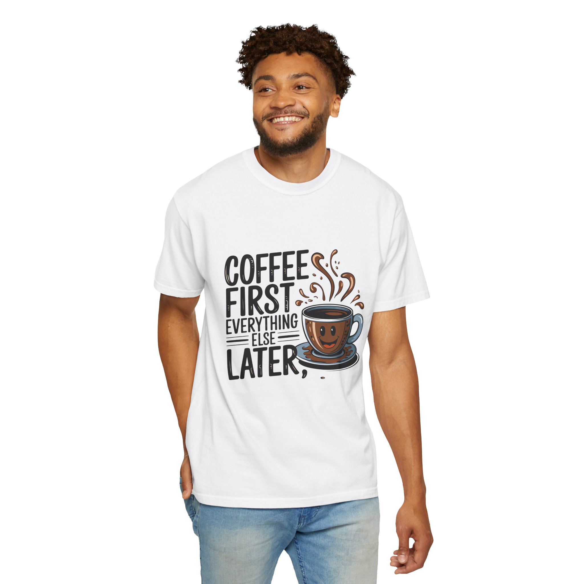 Coffee First Unisex Garment-Dyed T-shirt, Funny Coffee Lover Tee, Gift for Baristas, Funny Quote Shirt, Casual Everyday Wear.