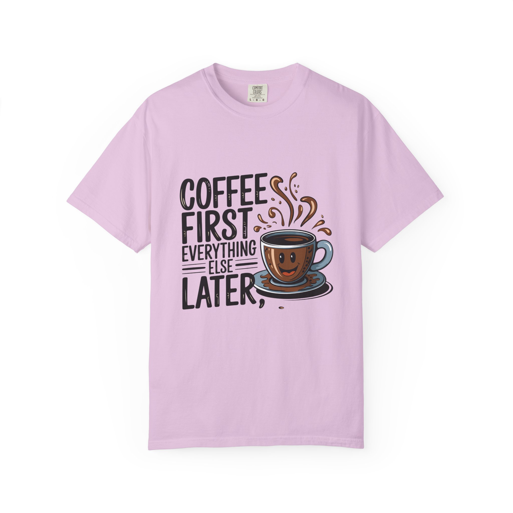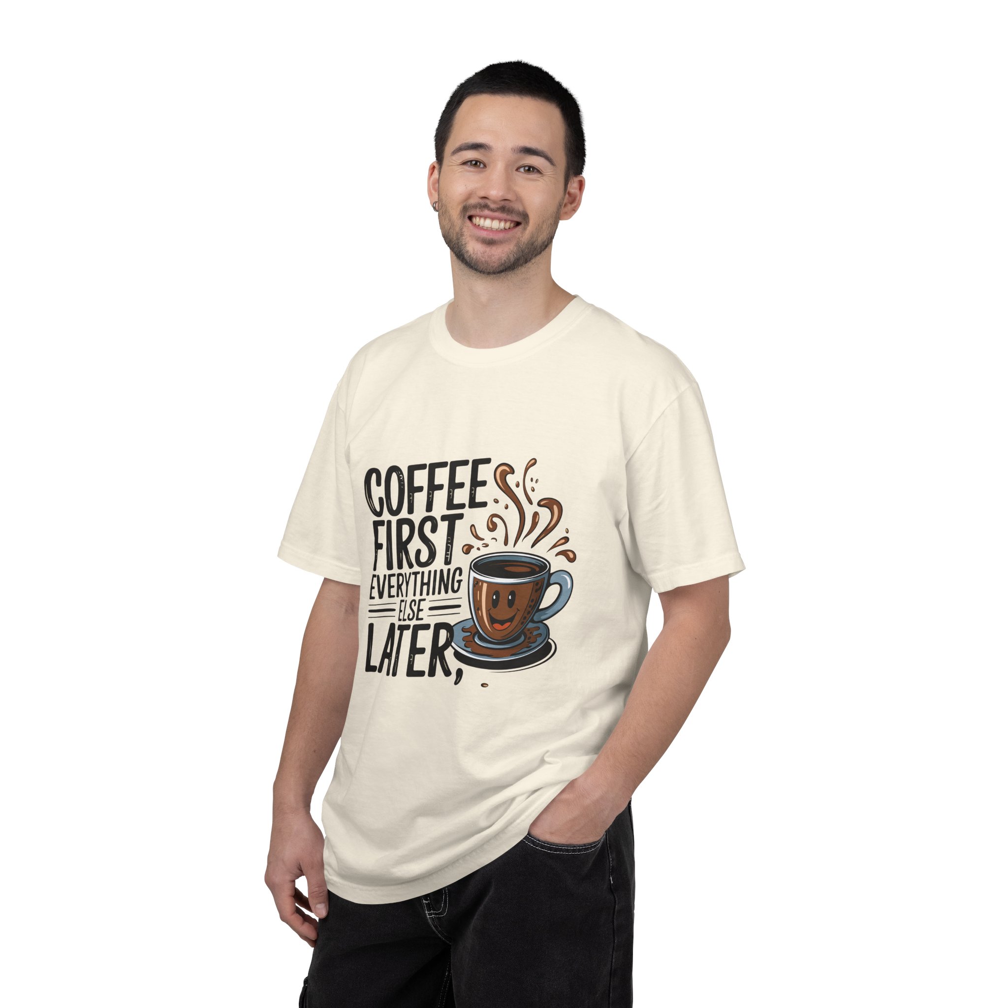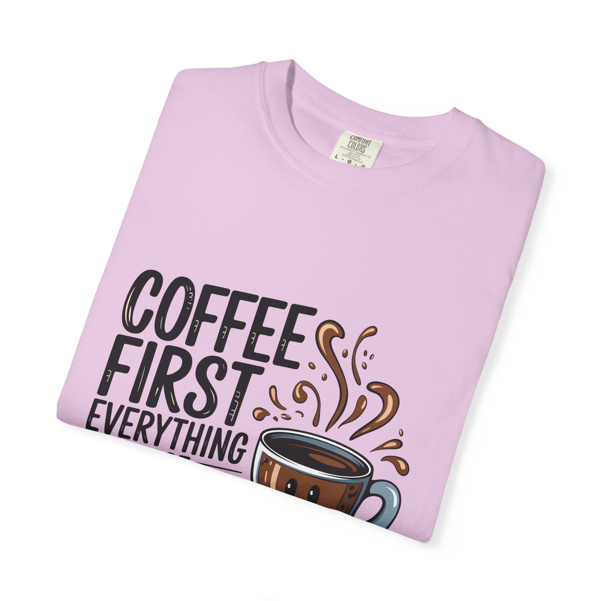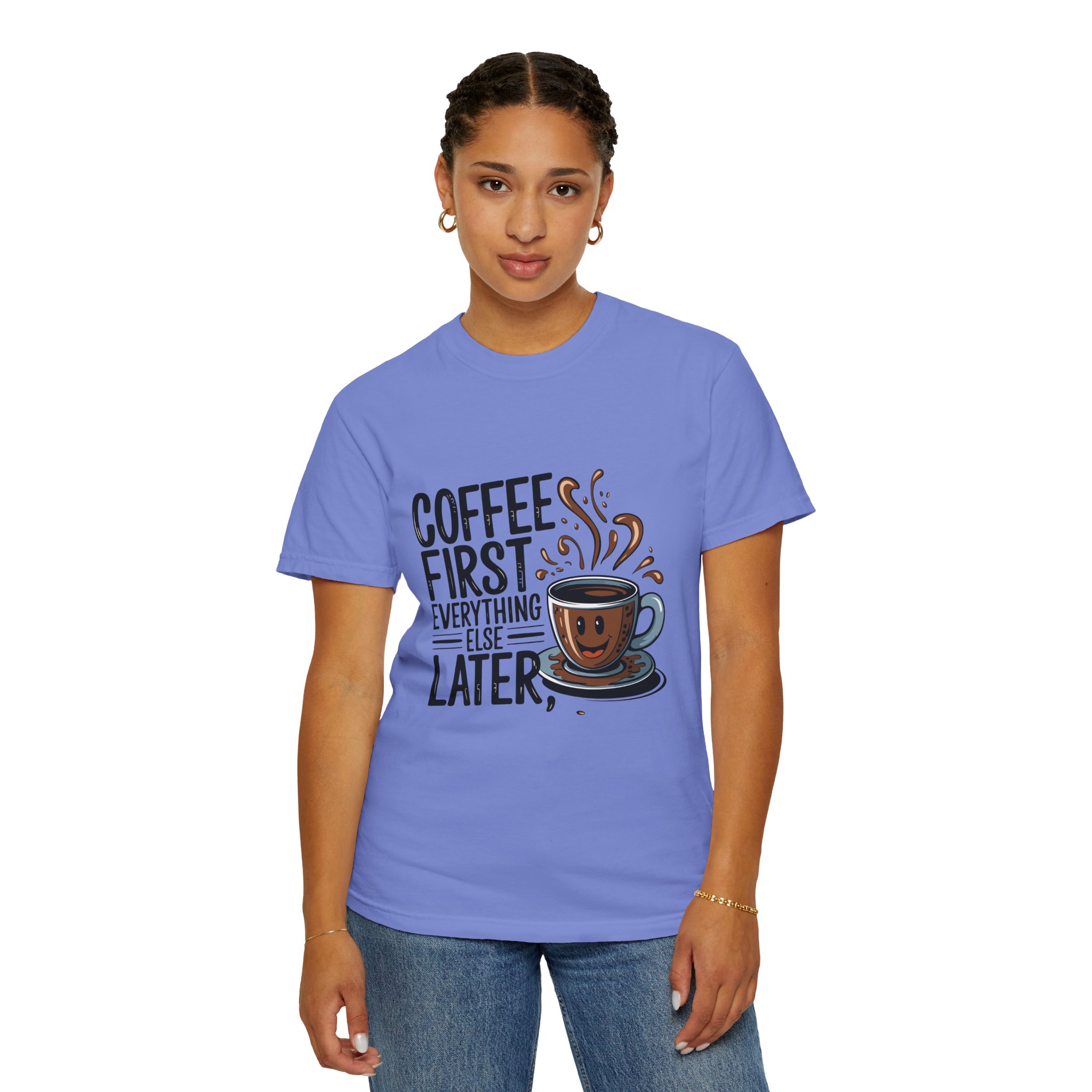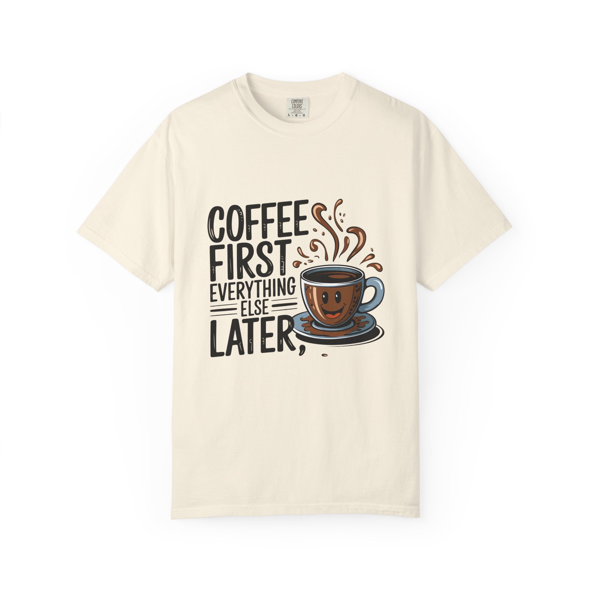 Coffee First Unisex Garment-Dyed T-shirt, Funny Coffee Lover Tee, Gift for Baristas, Funny Quote Shirt, Casual Everyday Wear.