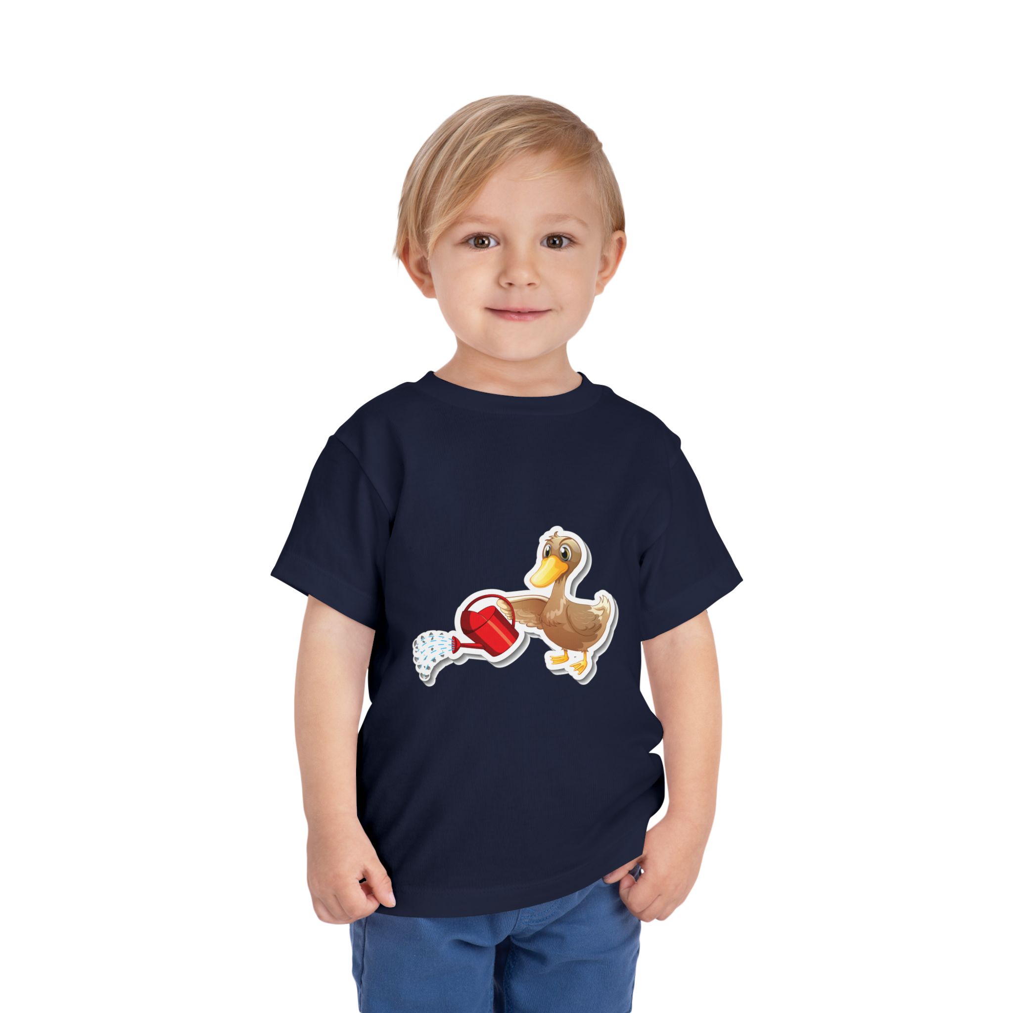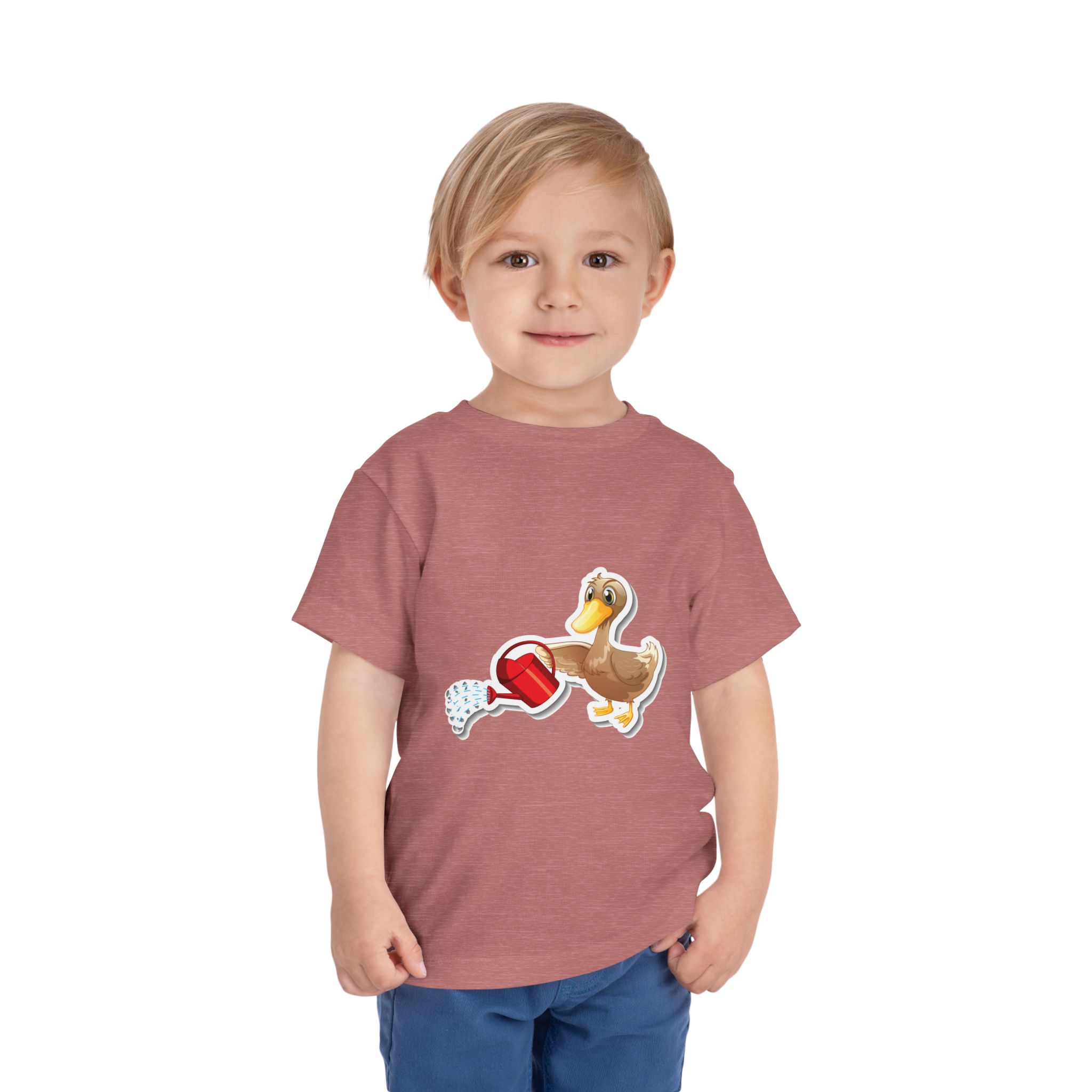 Soft, light, and playfully sweet — this toddler tee brings a sunny splash of wonder to little wardrobes. A friendly duck tends to a tiny red watering can, caught mid-splash, inviting curious fingers and wide eyes. The breathable, feather-light fabric moves with active days: crawling, toddling, and afternoon garden discoveries. It’s quietly durable, with neat side seams that keep the shape through washes and a tear-away label for scratch-free comfort. Dress them in something that feels gentle on skin and sparks gentle smiles during park visits, playdates, or family photos.