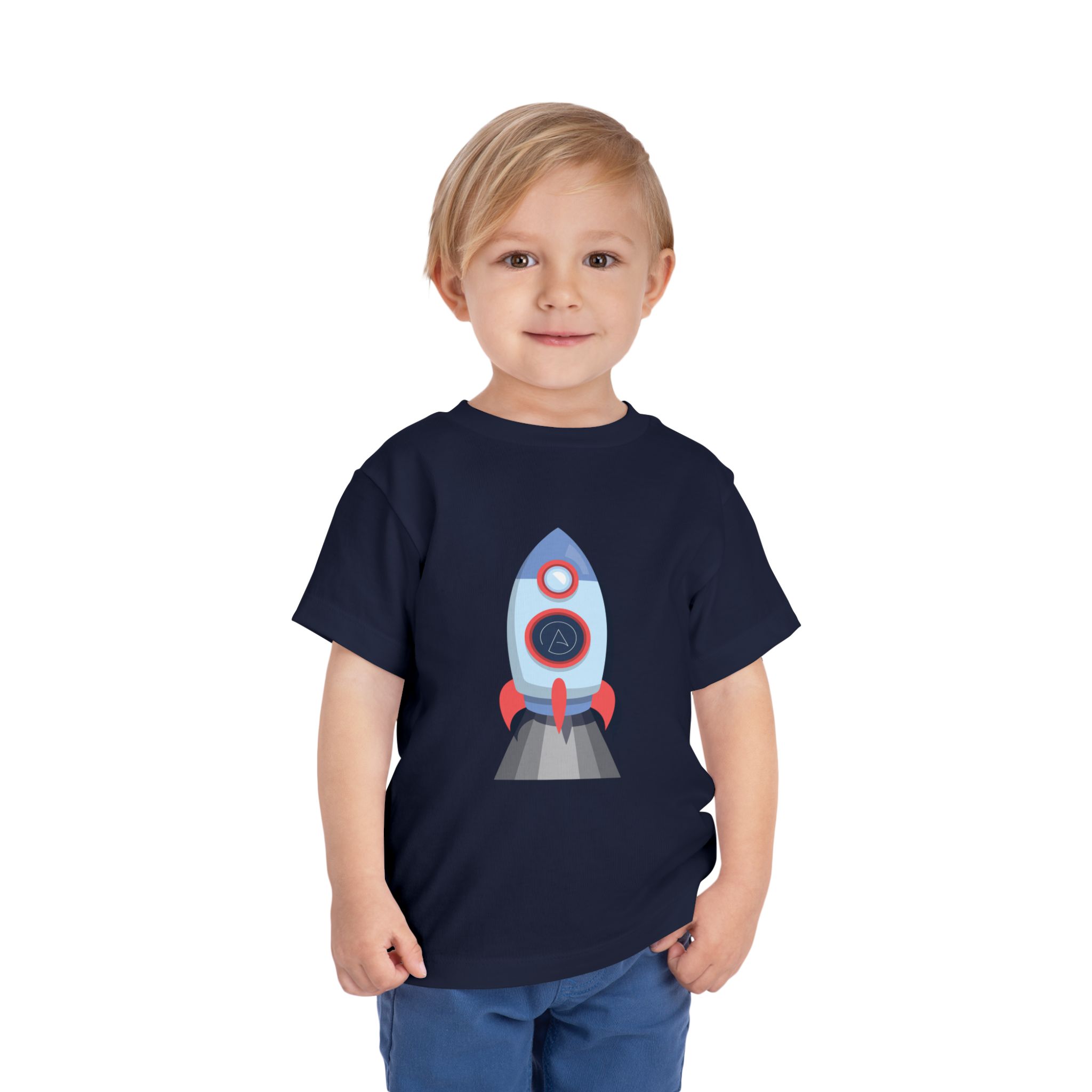 Little hands, big adventures. This soft toddler tee puts a cheerful rocket front-and-center — bright blues and reds lift off against a calm, dark background. Light, breathable fabric keeps tumble-time comfortable and cool. The cut lets active kids climb, run, and reach for the sky while the tear-away label prevents irritation. Pair it with playtime, storytime about space, or weekend outings to the park; it’s the kind of shirt that sparks imagination and encourages pretend missions to the moon.