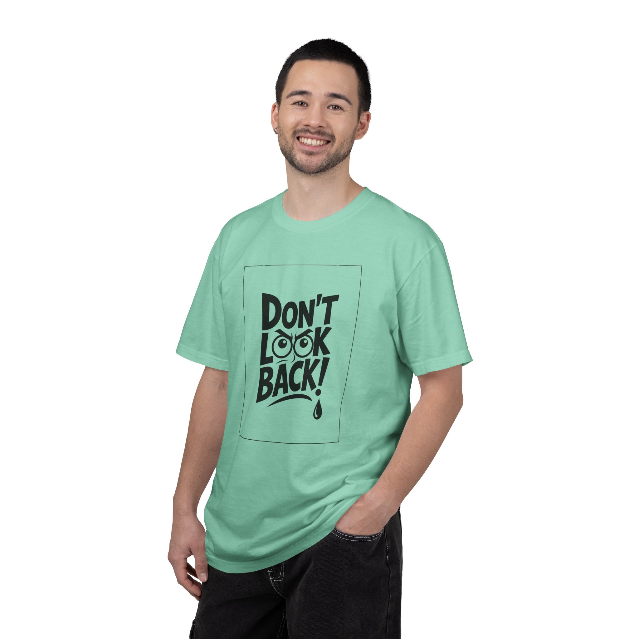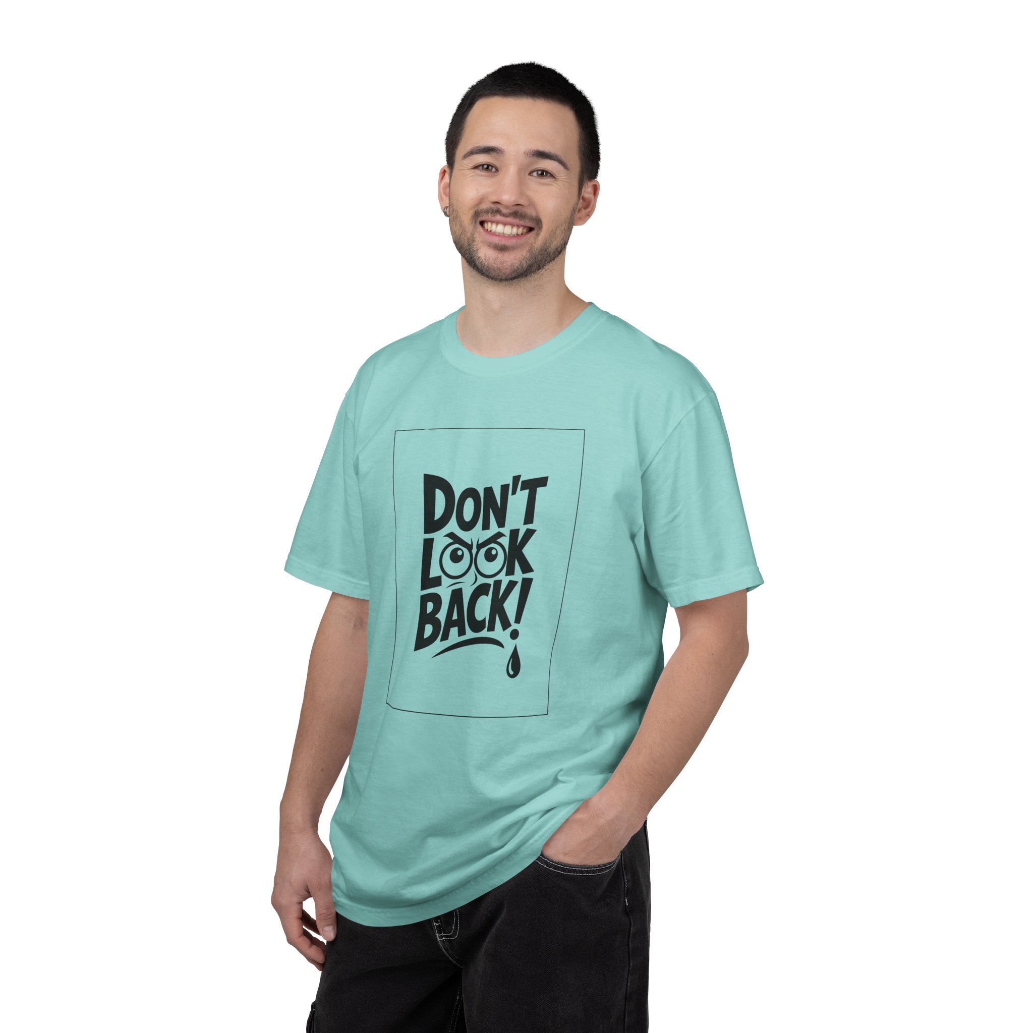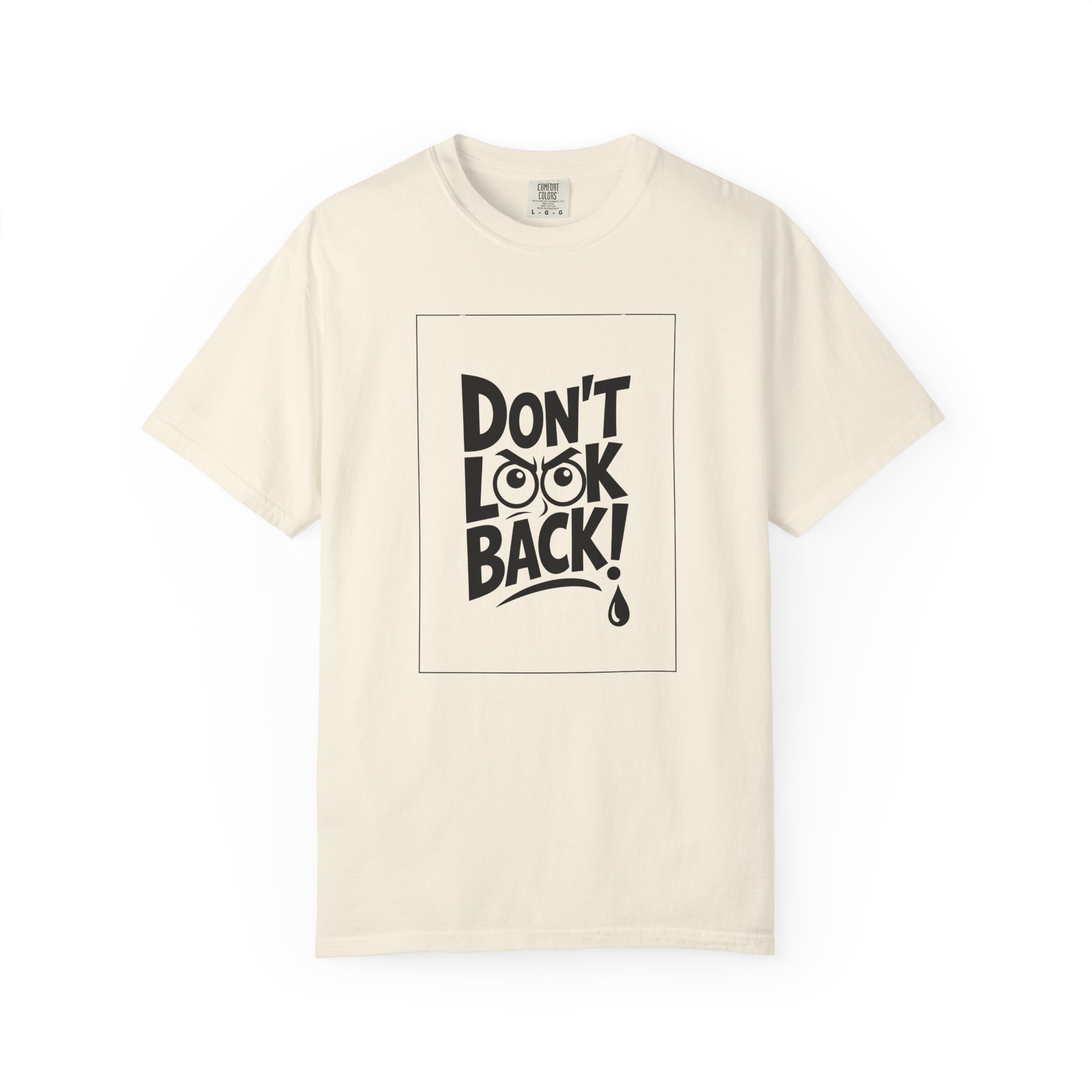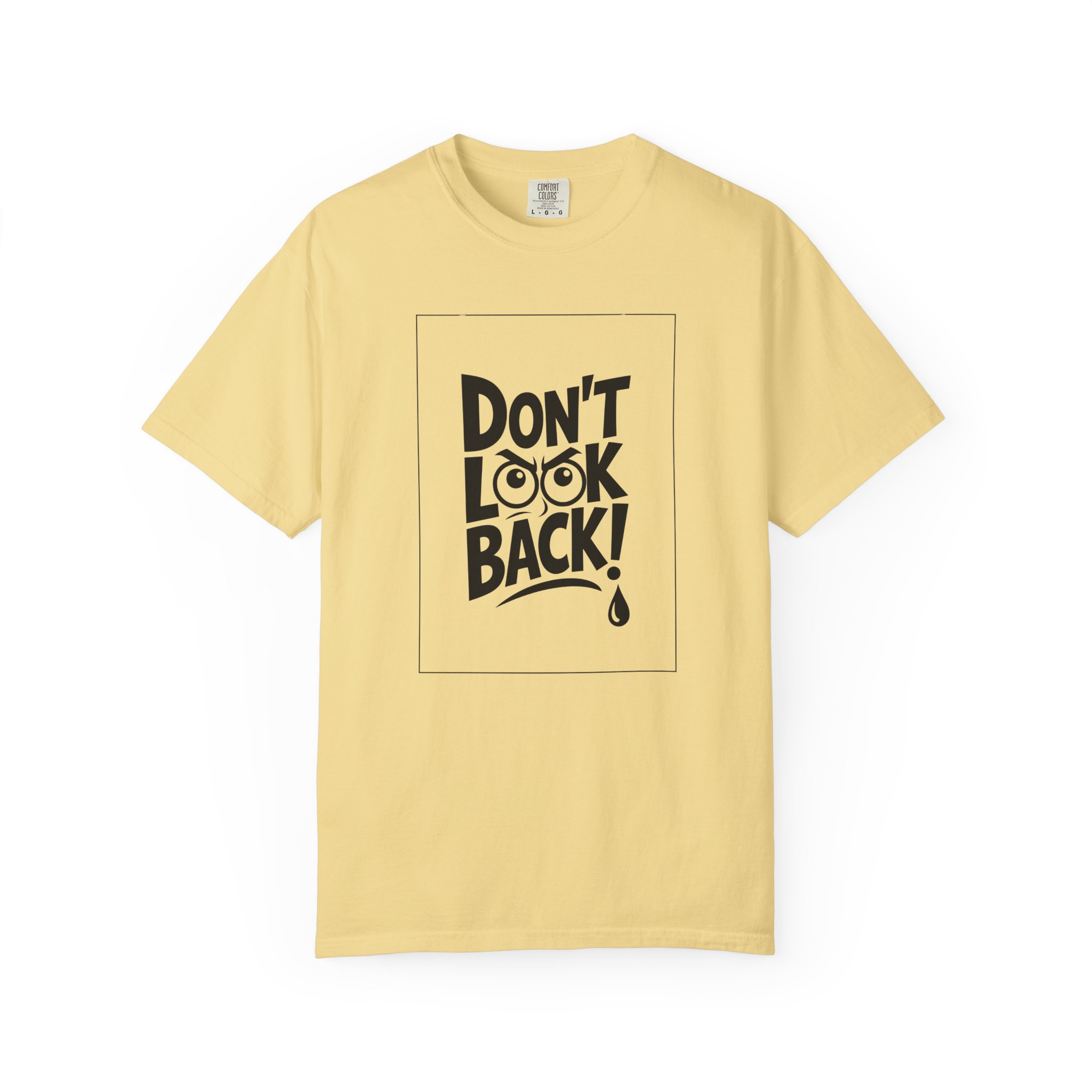 This heavyweight, garment-dyed tee carries a bold, hand-lettered message that reads “DON’T LOOK BACK!” — a quiet dare for anyone rebuilding, moving forward, or choosing courage over nostalgia. The relaxed fit and soft, broken-in feel from post-construction dyeing make it a lived-in staple right away. Wear it when you need a wearable reminder to keep your face toward what’s ahead: layered under a jacket for city nights, paired with jeans at a roadside diner, or thrown on after a long day of creative work. The clean monochrome print and uncomplicated silhouette keep attention on the statement — confident, direct, and a little rebellious.