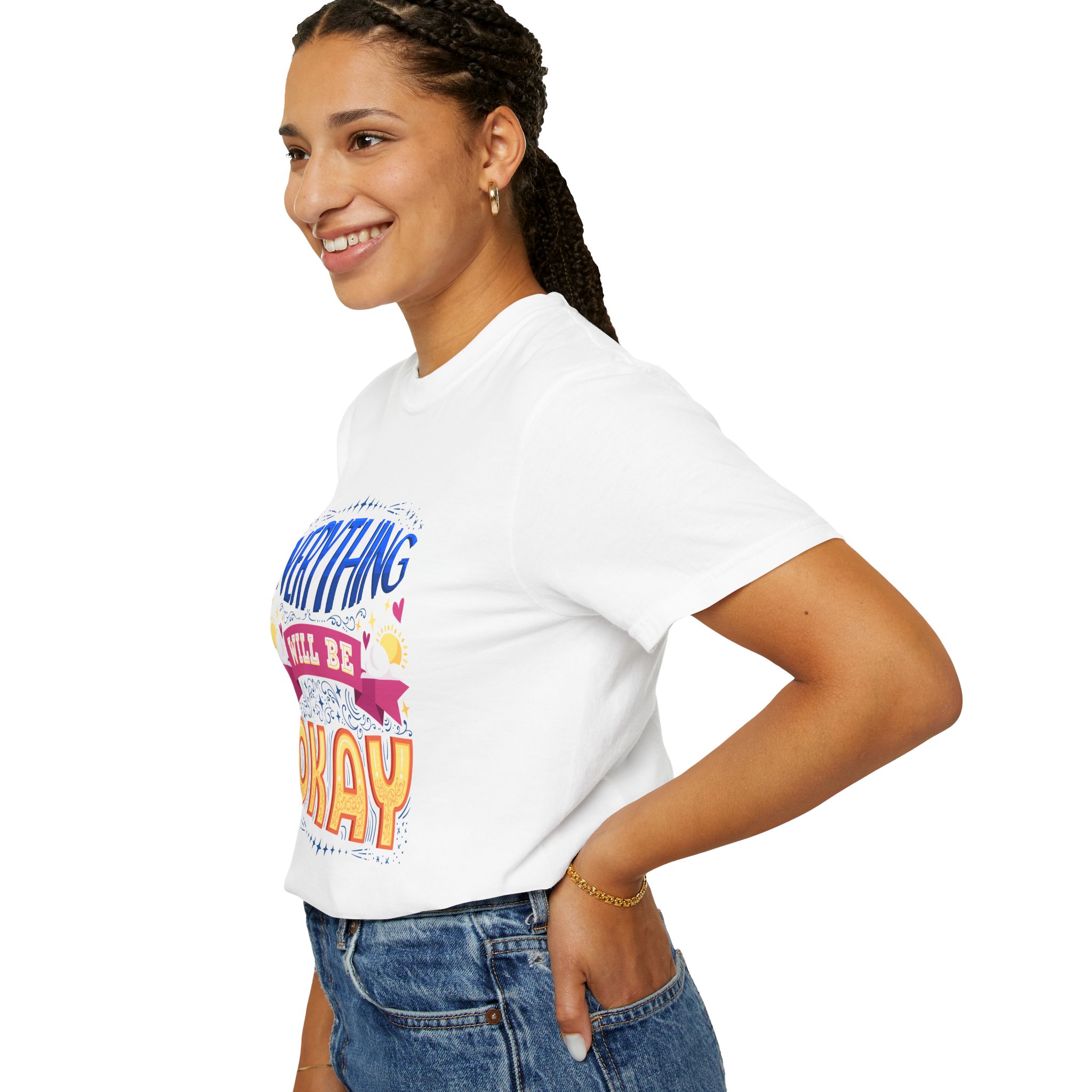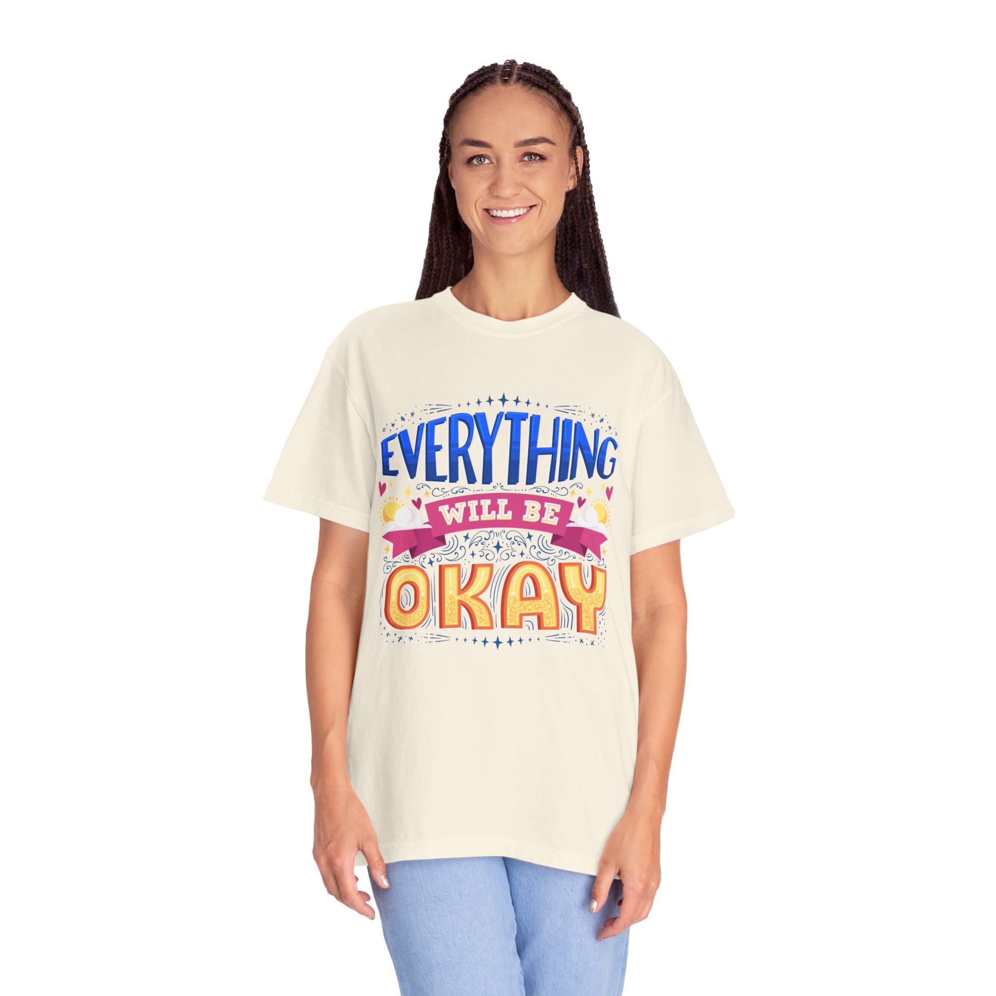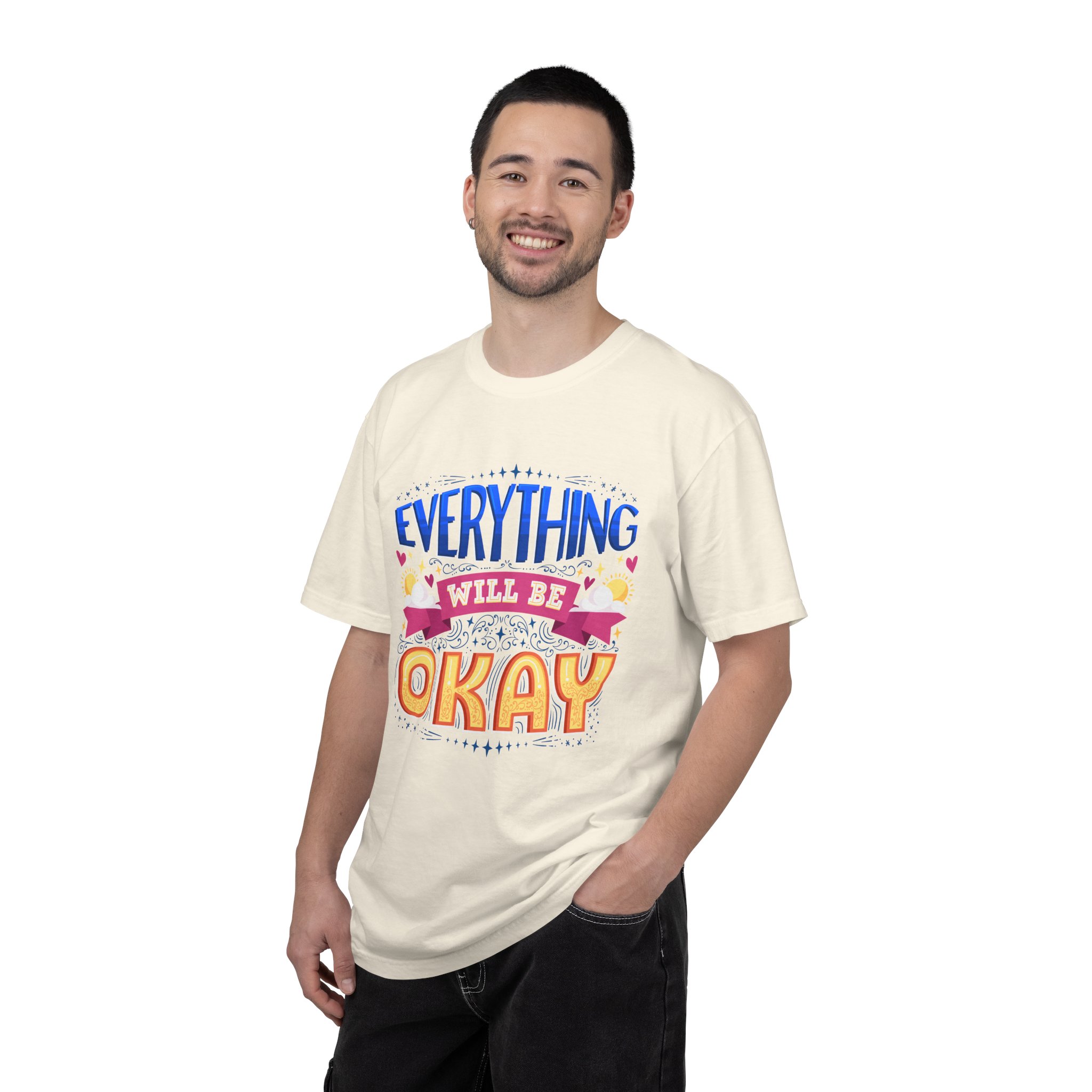 Soft, lived-in tee that carries a quiet promise: Everything will be okay. The garment-dyed cotton gives a gentle, broken-in hand and muted color depth that makes the cheerful, hand-lettered design feel warm rather than loud. It sits relaxed across the shoulders and drapes easily over jeans, joggers, or a cozy cardigan — the kind of shirt someone reaches for when they need a little reassurance or want to share calm energy with a friend. Light-hearted hearts and banner details pair with bold, sunny lettering to create a hopeful, everyday staple that reads as sincere, approachable, and comforting.