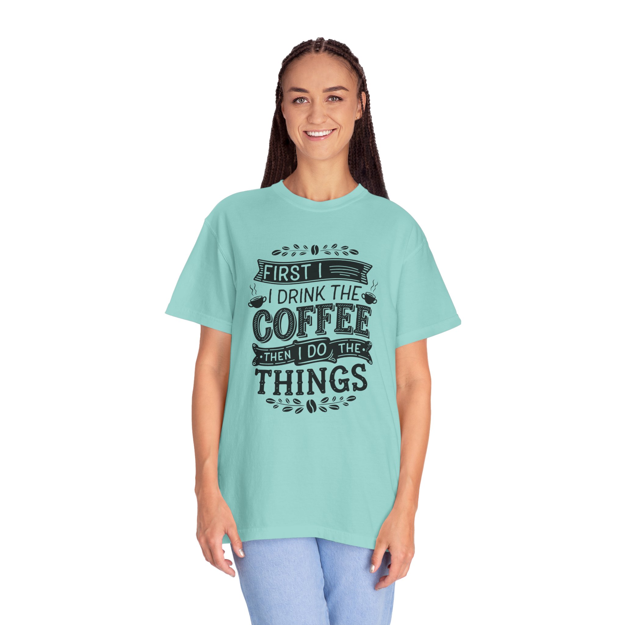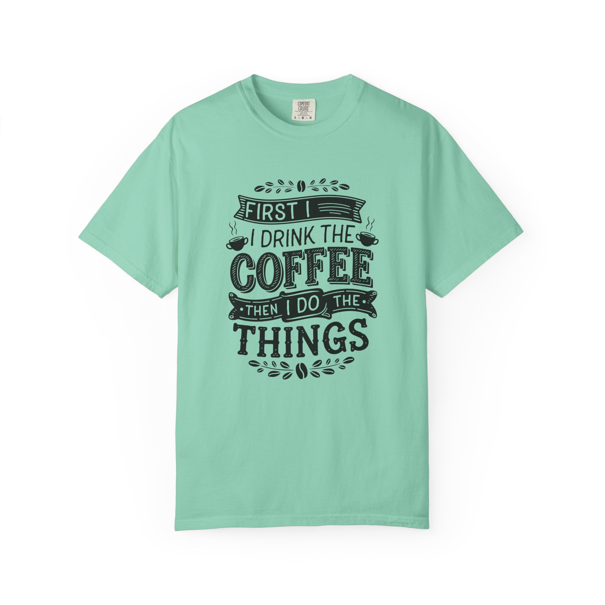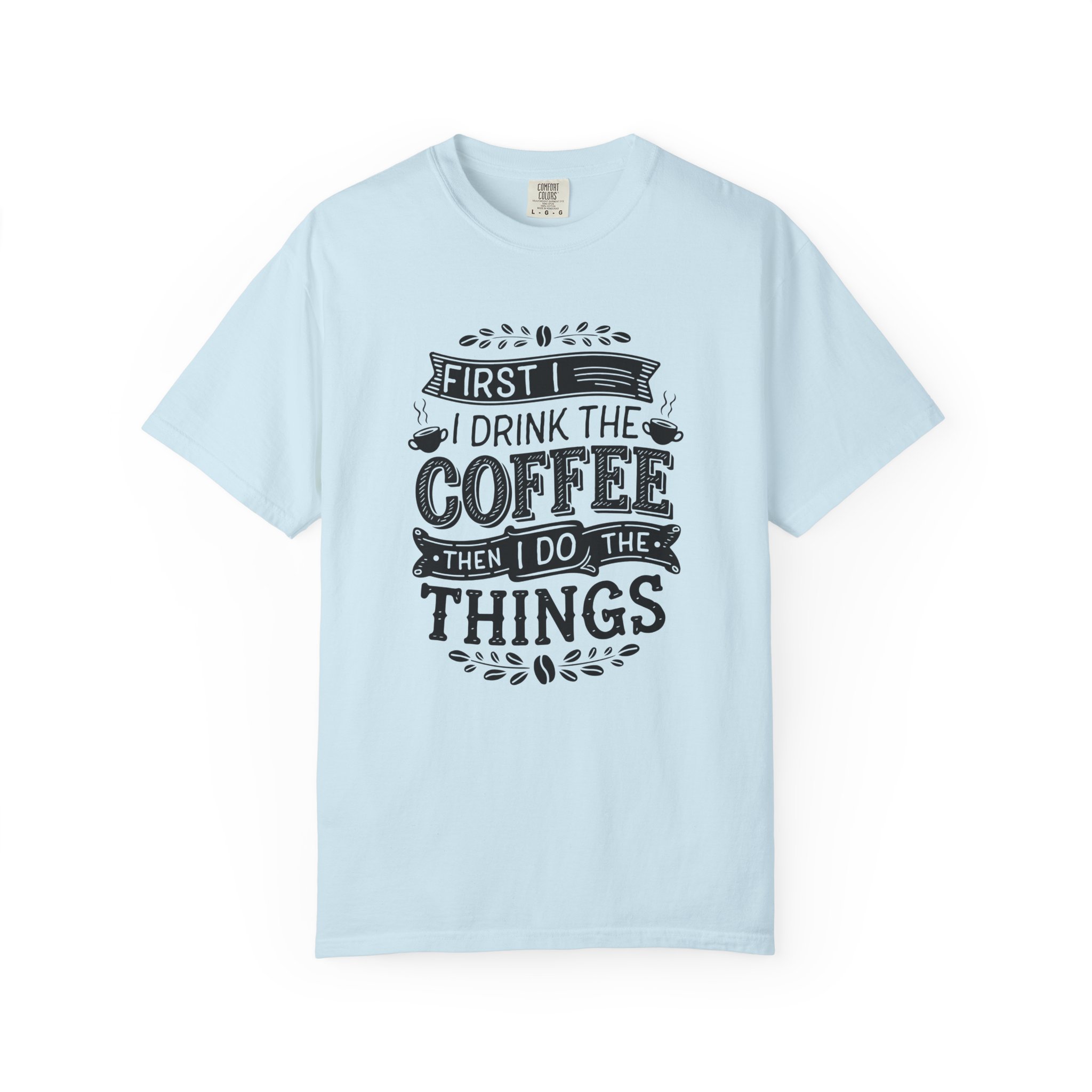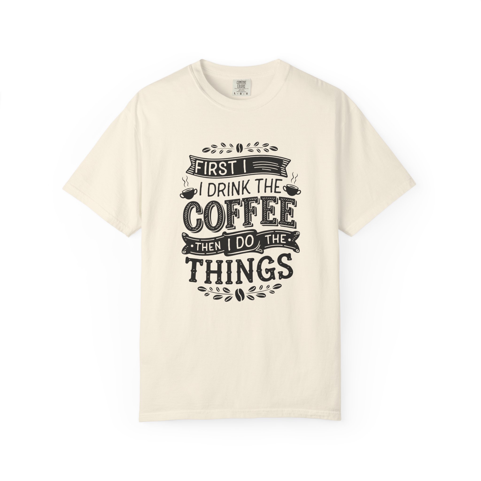 First I Drink the Coffee Then I Do the Things T-Shirt – Funny Coffee Lover Graphic Tee for Productivity & Daily Motivation.