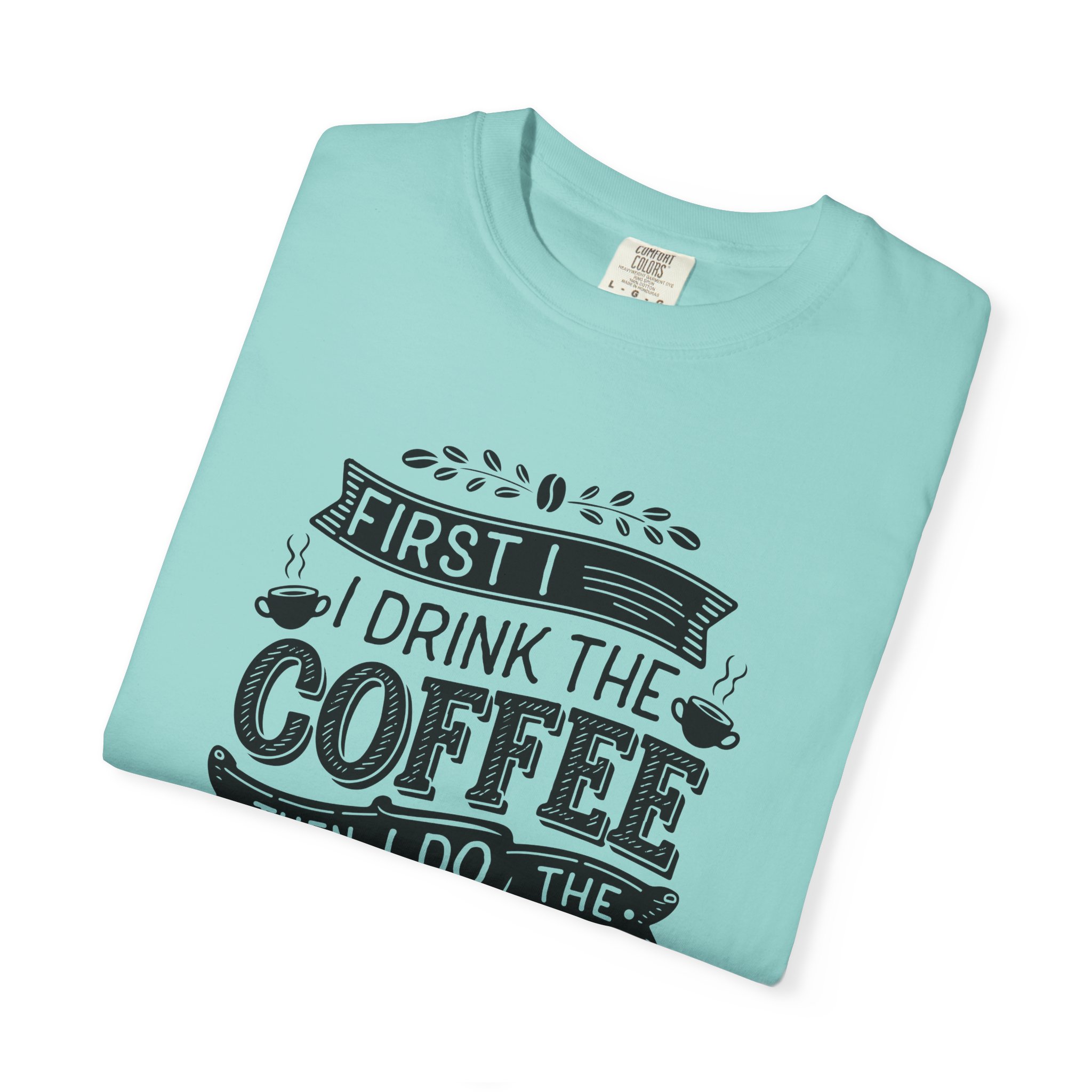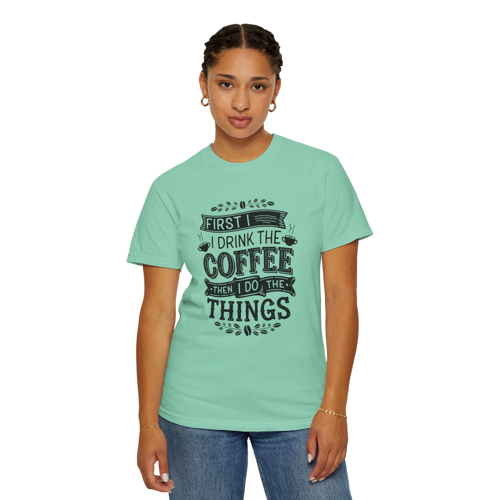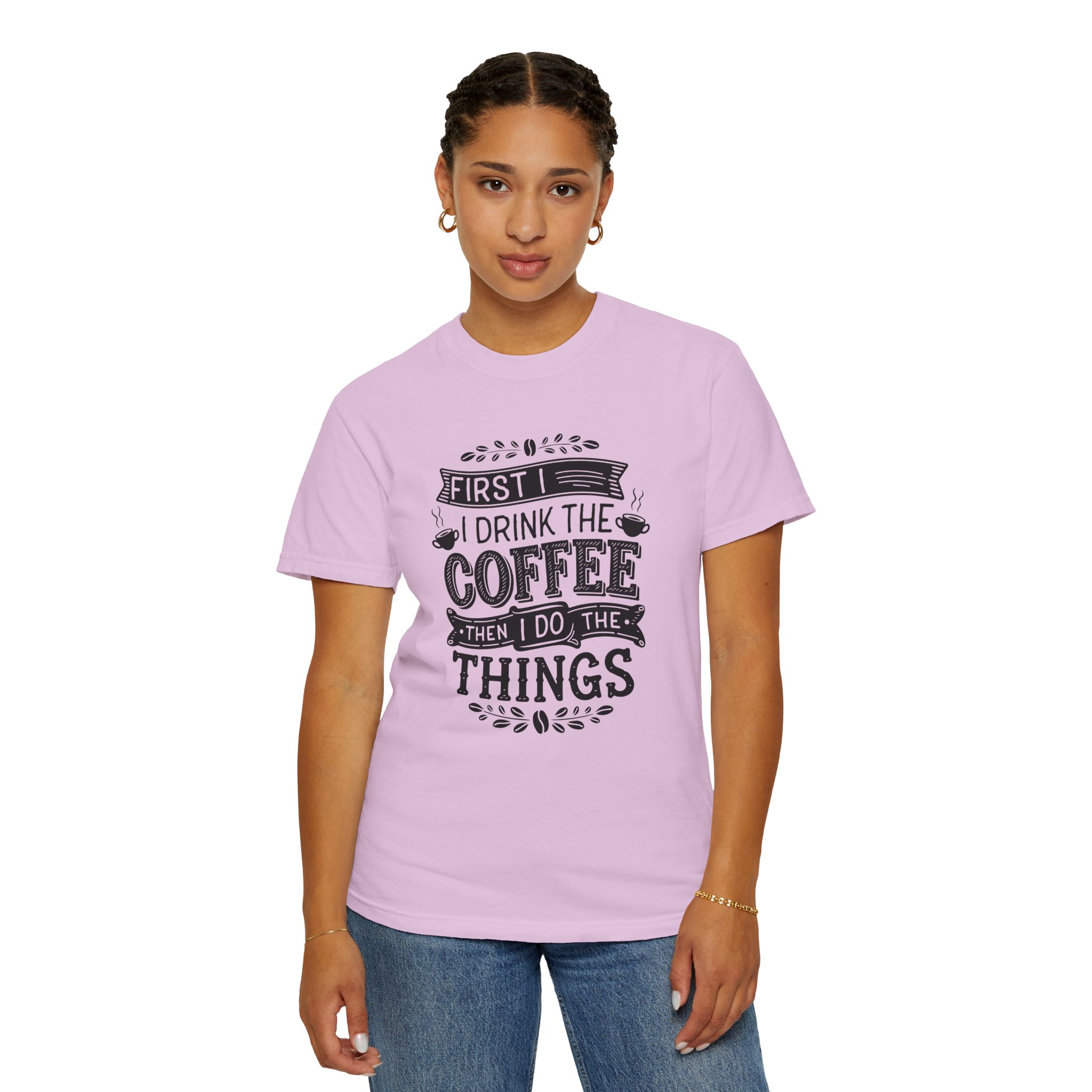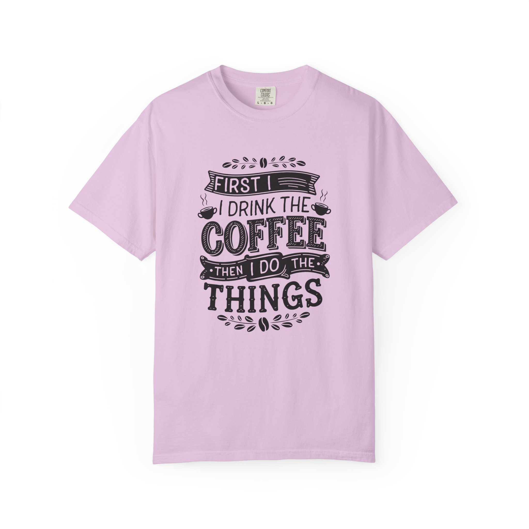First I Drink the Coffee Then I Do the Things T-Shirt – Funny Coffee Lover Graphic Tee for Productivity & Daily Motivation.
