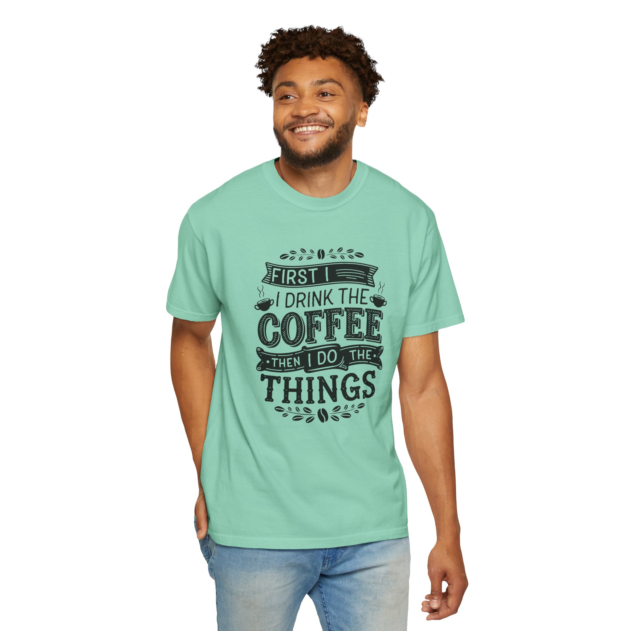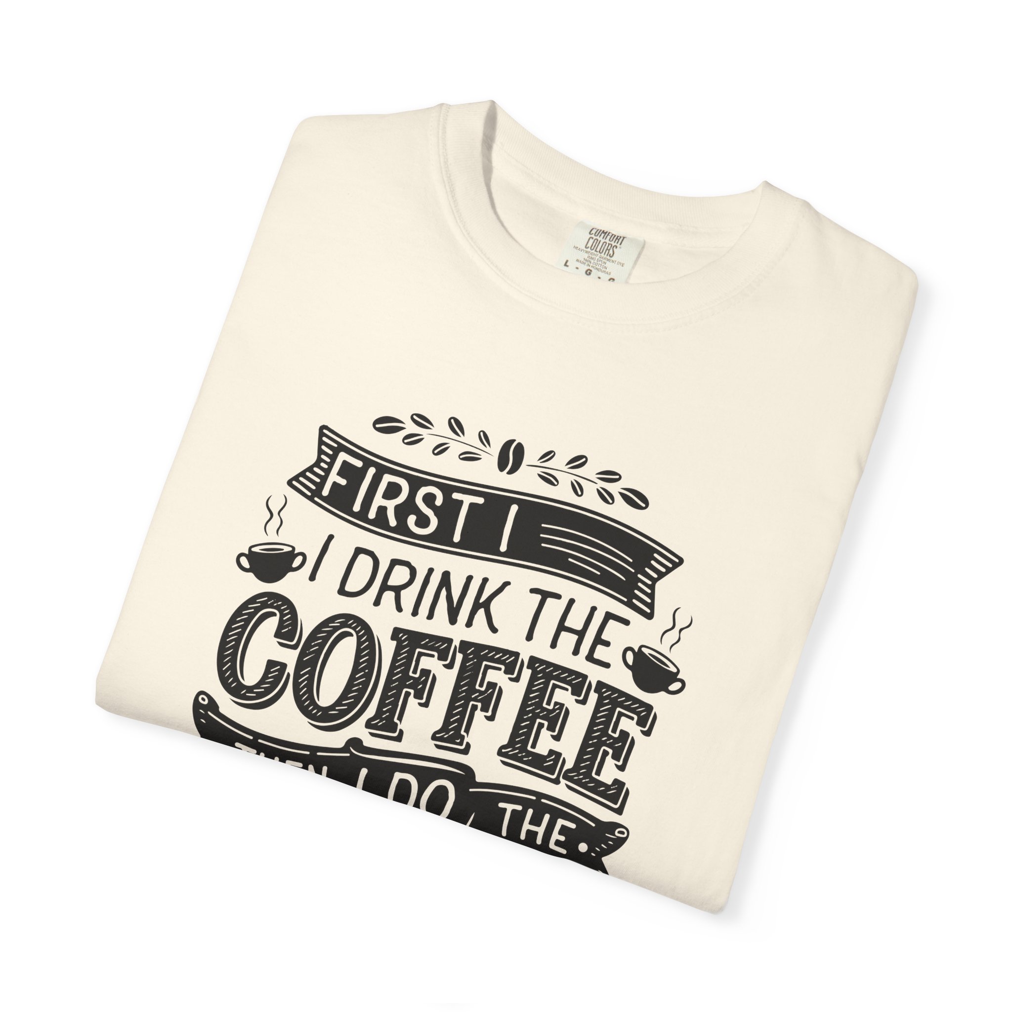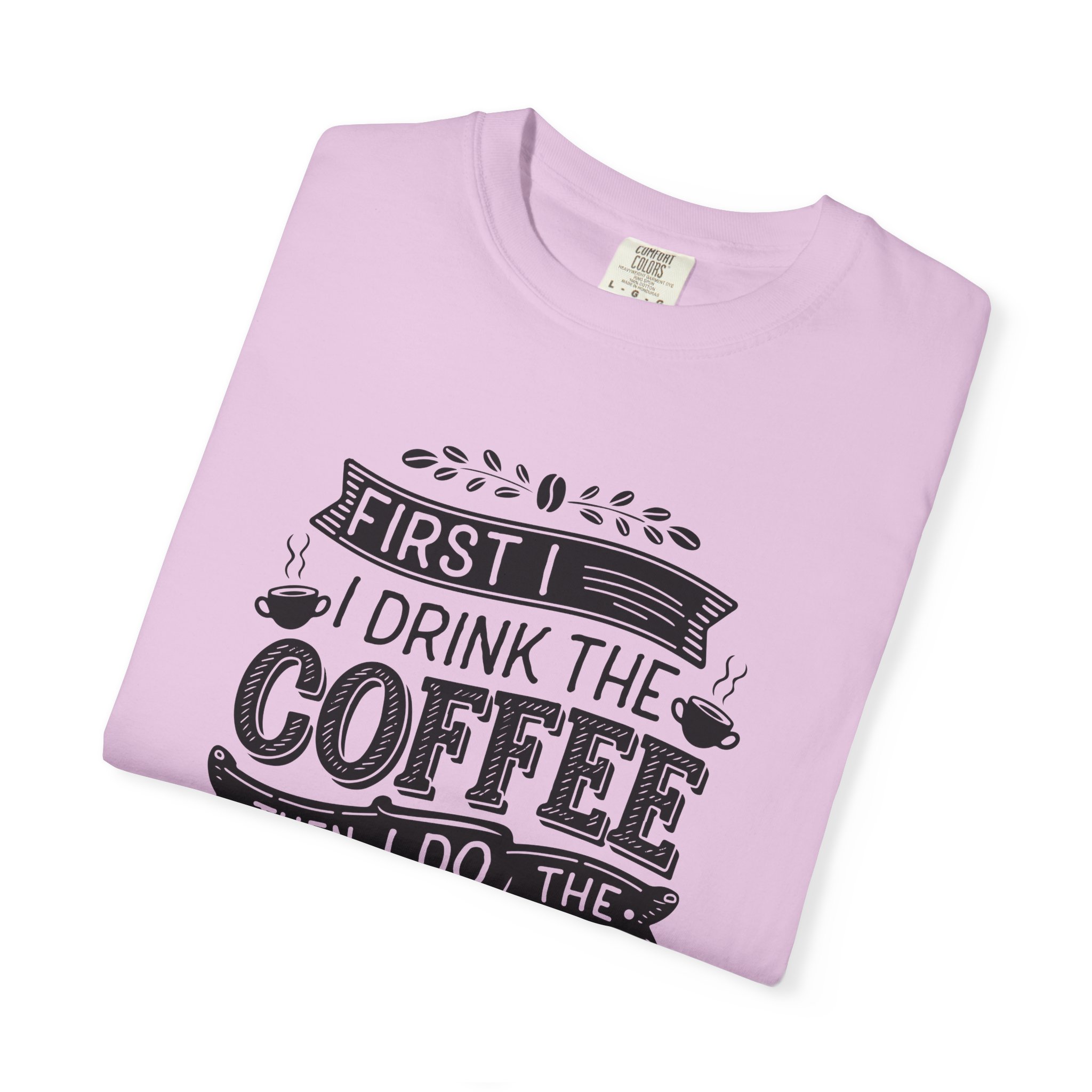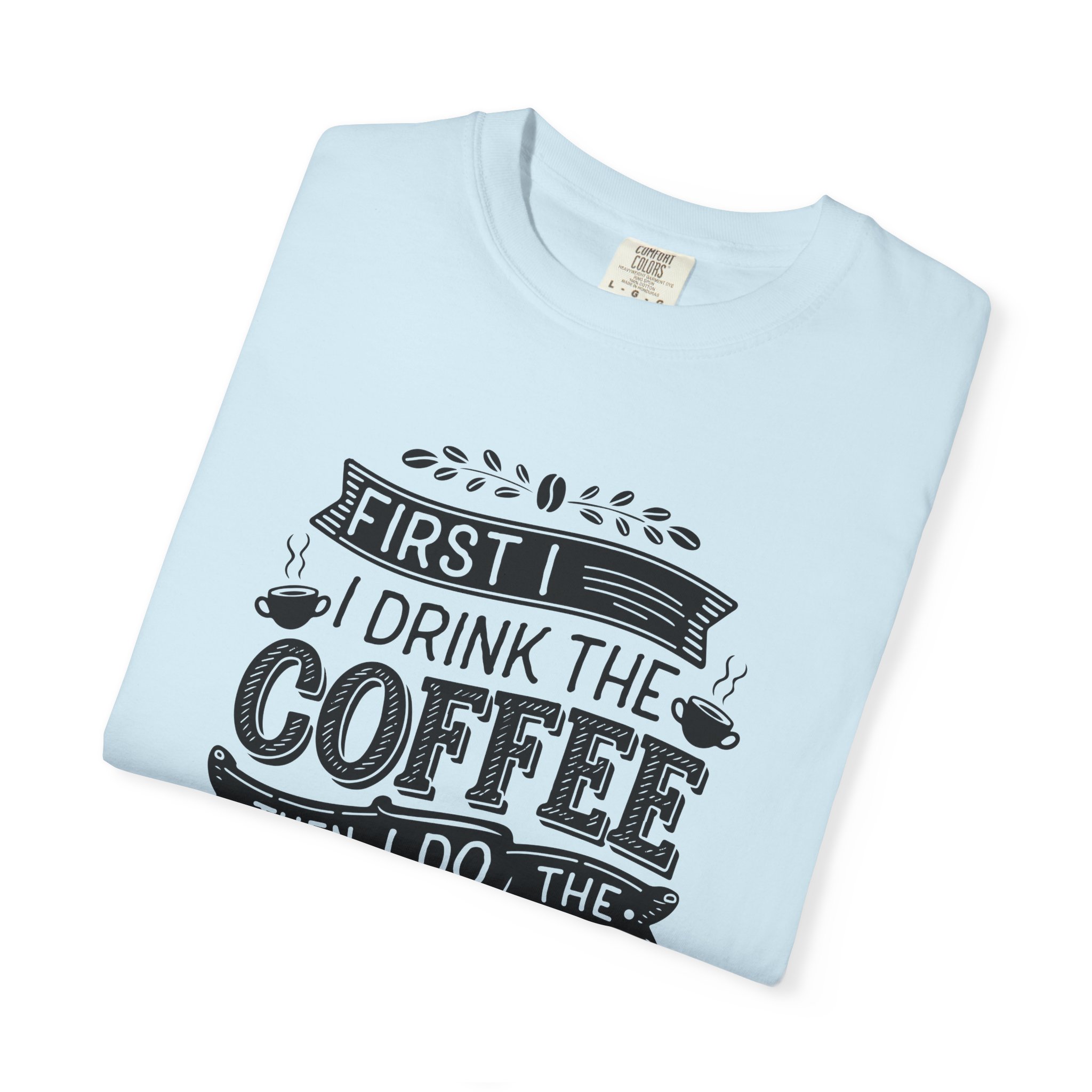 First I Drink the Coffee Then I Do the Things T-Shirt – Funny Coffee Lover Graphic Tee for Productivity & Daily Motivation.