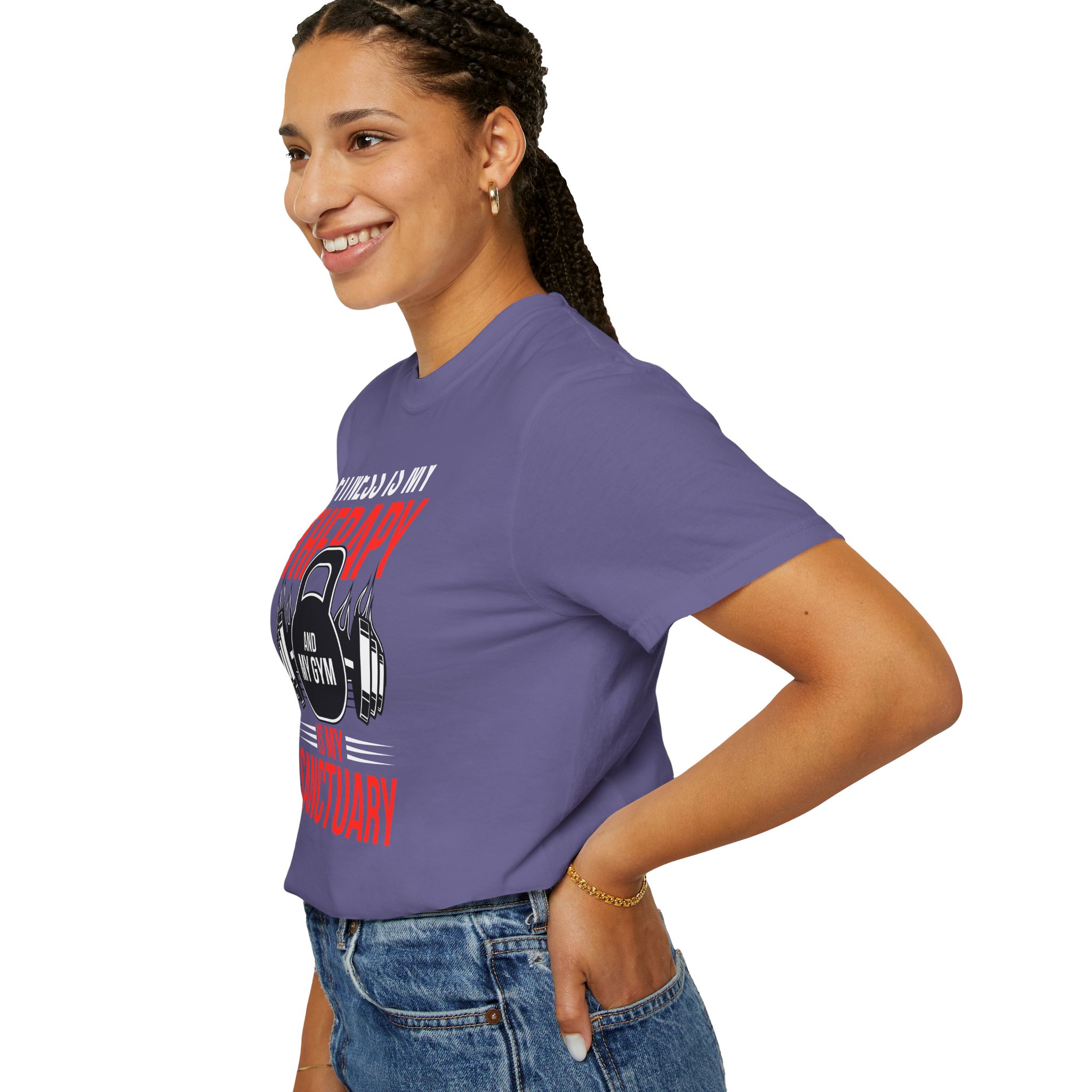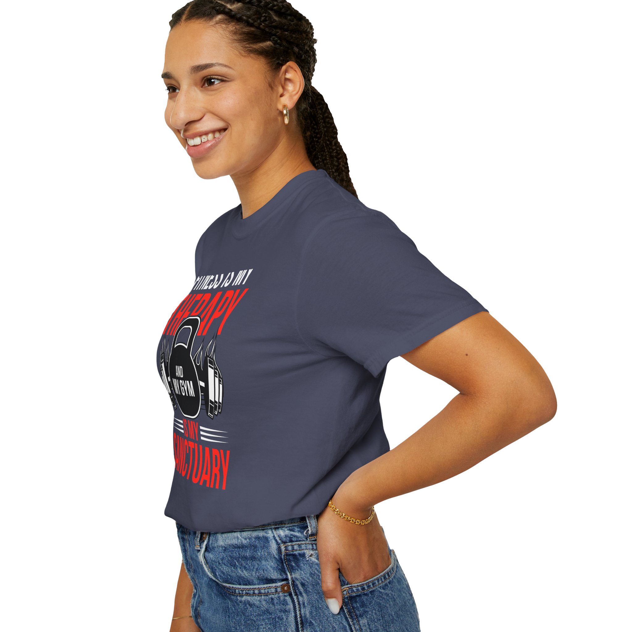 This heavyweight garment-dyed tee brings gym mindset into everyday life. The front graphic — kettlebell, dumbbells and bold type that reads “Fitness is my therapy and my gym is my sanctuary” — speaks to the quiet intensity of training and the comfort found beneath the bar. The relaxed cut and soft, lived-in color make it a shirt you reach for after a long session, on rest days, or while running errands between sets. It’s roomy enough for layered warm-ups and durable enough to handle repeat washes without losing that softened, broken-in feel. Wear it to the gym, to a lifting session with friends, or when you need a wearable reminder that the workout is where you reset.