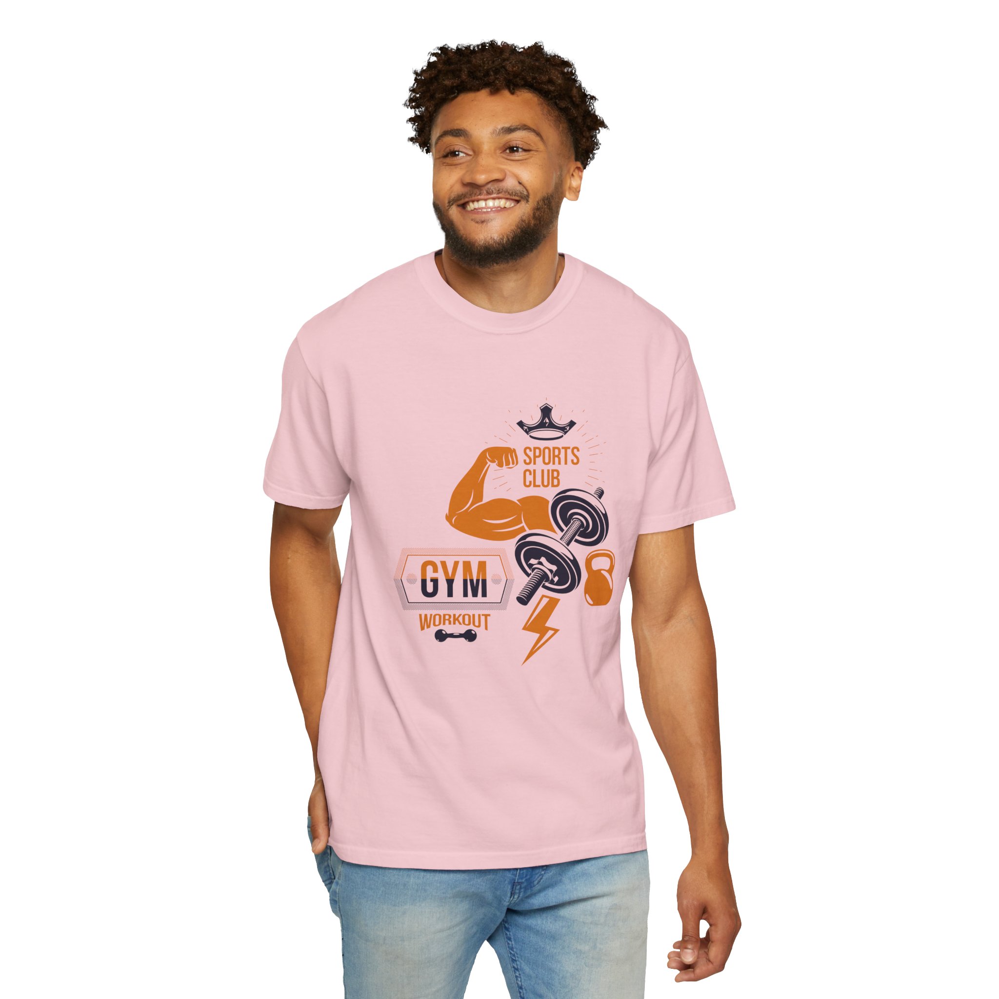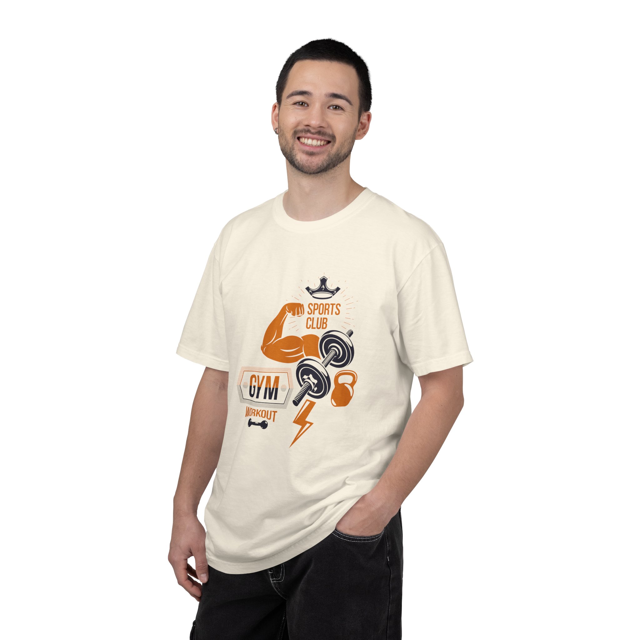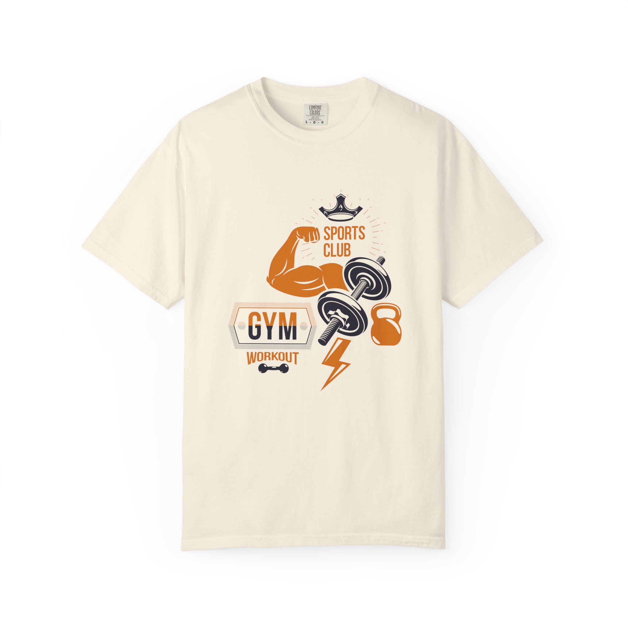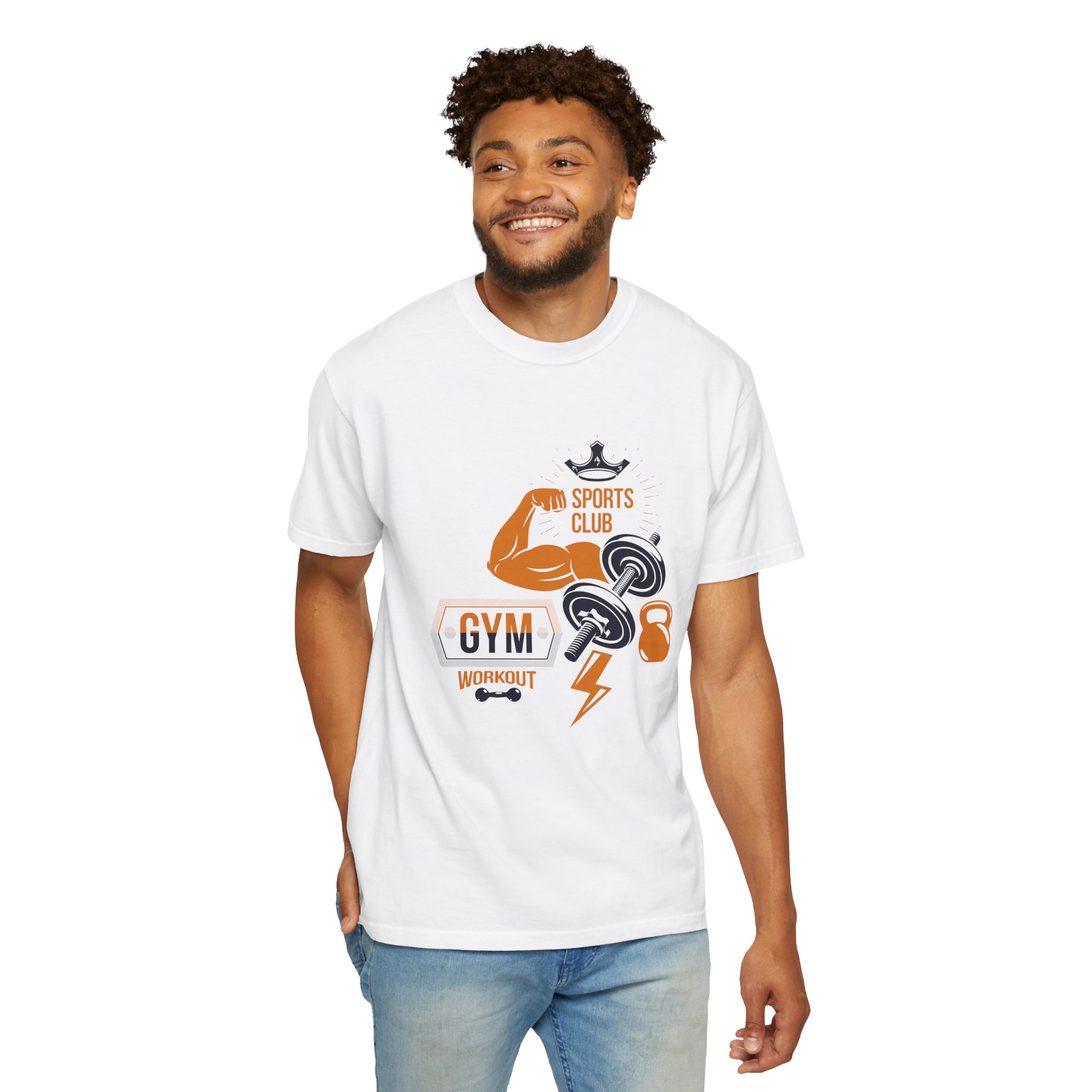 This heavyweight, garment-dyed tee brings gym-day energy into everyday wear. The design layers classic strength motifs — flexed biceps, dumbbells, kettlebell and a lightning bolt — in a bold, graphic layout that reads sporty and confident. The soft, worn-in hand from post-construction dyeing, combined with a relaxed cut and durable double-needle stitching, makes this shirt feel lived-in from the first wear while standing up to regular training sessions. Available in a wide range of colors and sizes, it sits comfortably as a go-to for warmups, casual gym sessions, or running errands with athletic style.