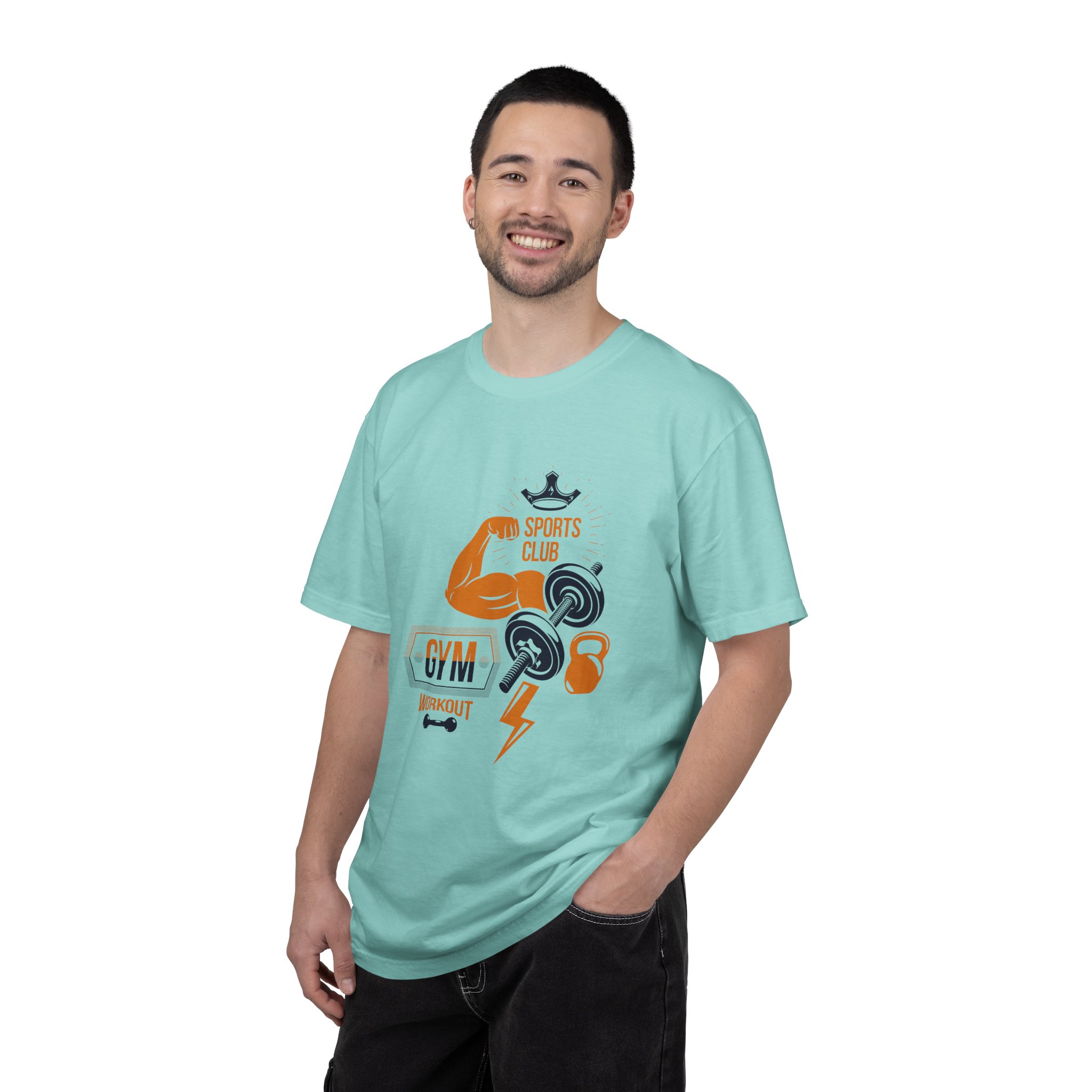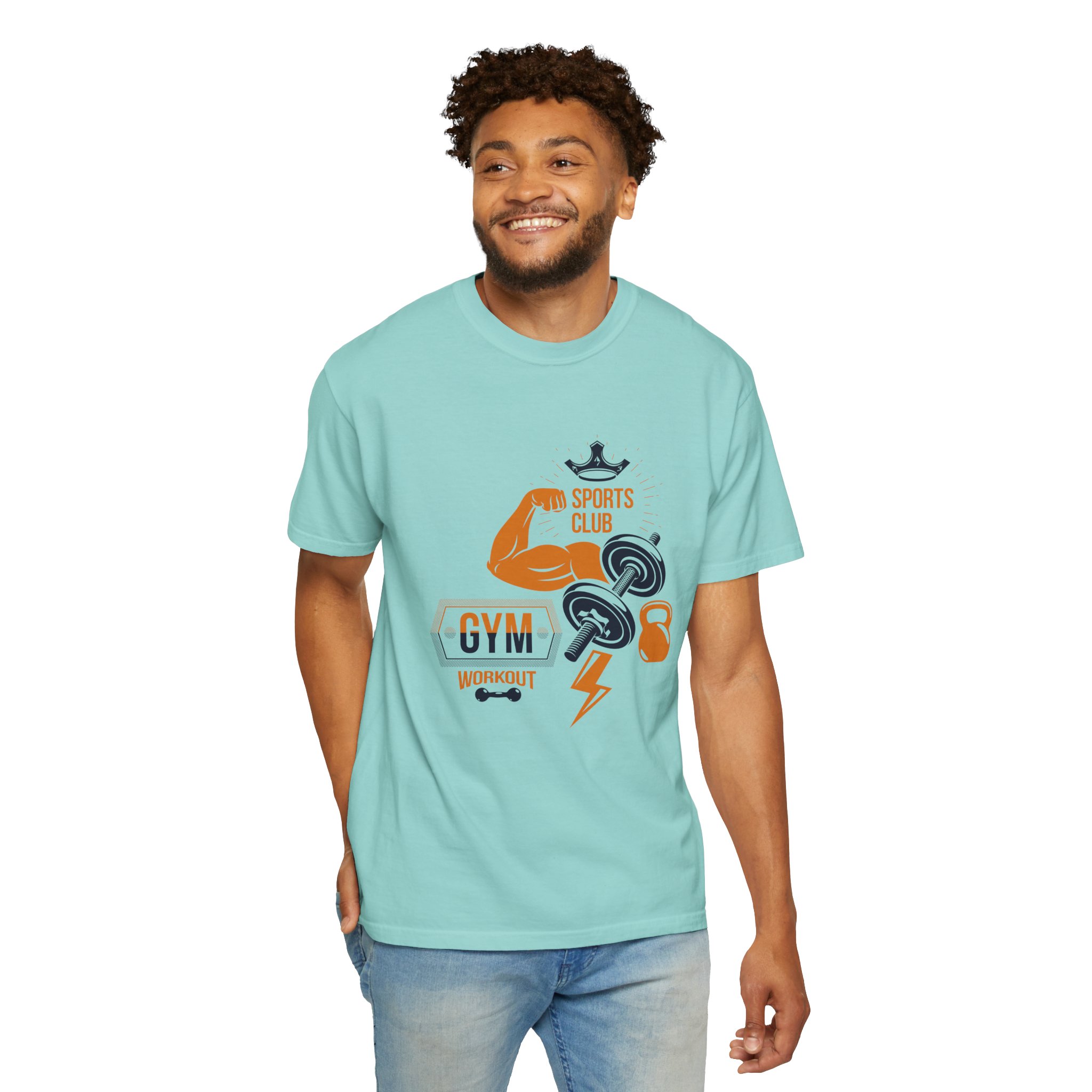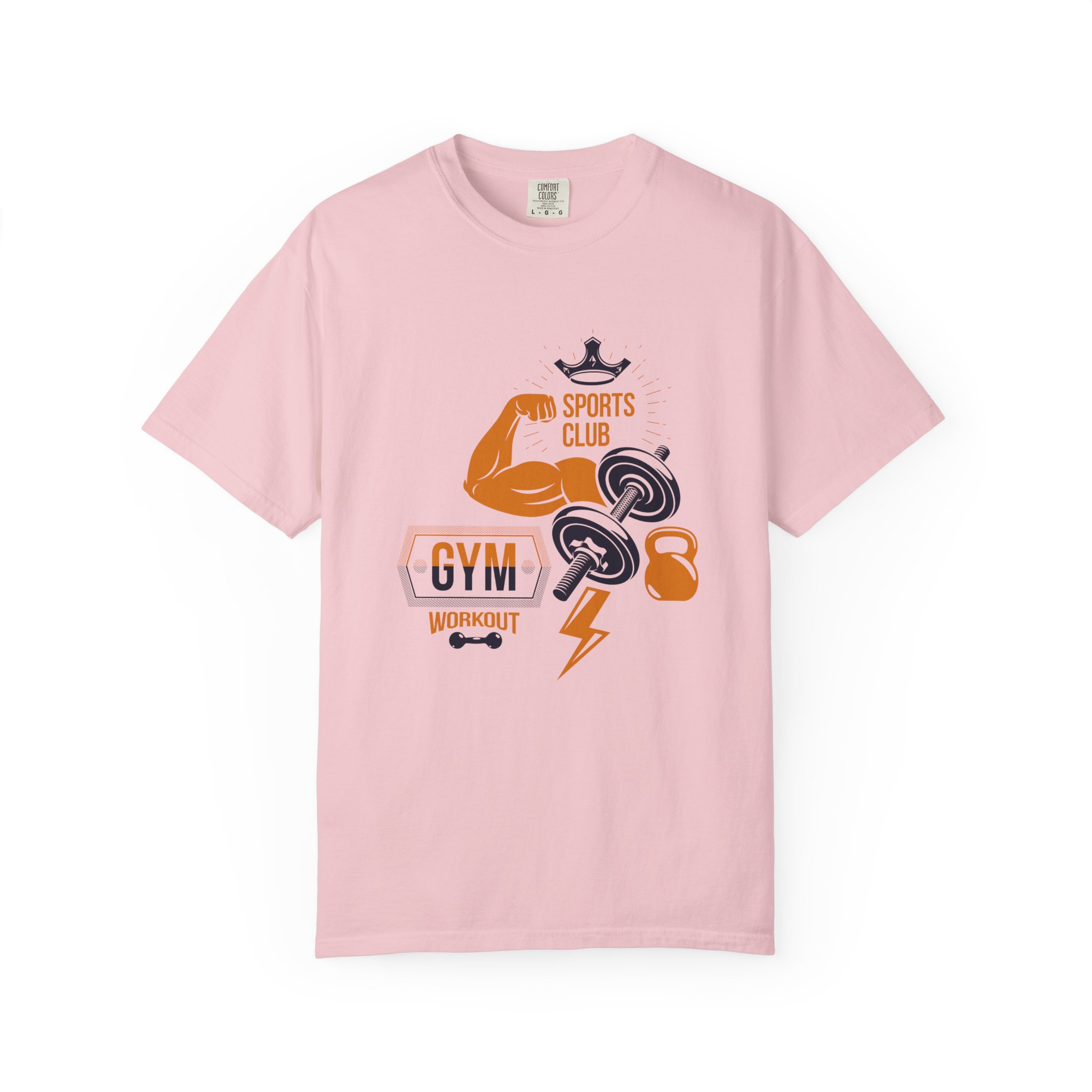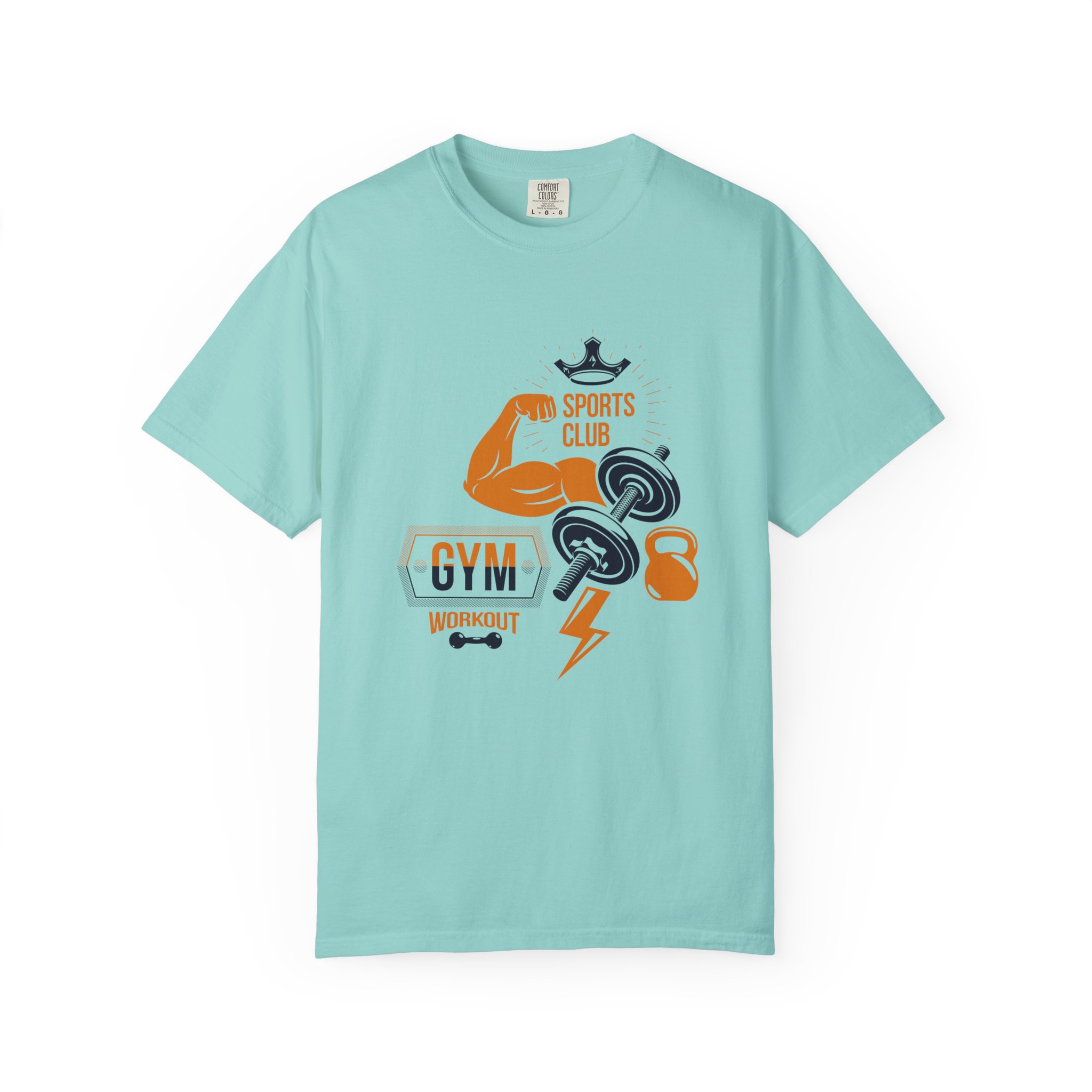 This heavyweight, garment-dyed tee brings gym-day energy into everyday wear. The design layers classic strength motifs — flexed biceps, dumbbells, kettlebell and a lightning bolt — in a bold, graphic layout that reads sporty and confident. The soft, worn-in hand from post-construction dyeing, combined with a relaxed cut and durable double-needle stitching, makes this shirt feel lived-in from the first wear while standing up to regular training sessions. Available in a wide range of colors and sizes, it sits comfortably as a go-to for warmups, casual gym sessions, or running errands with athletic style.