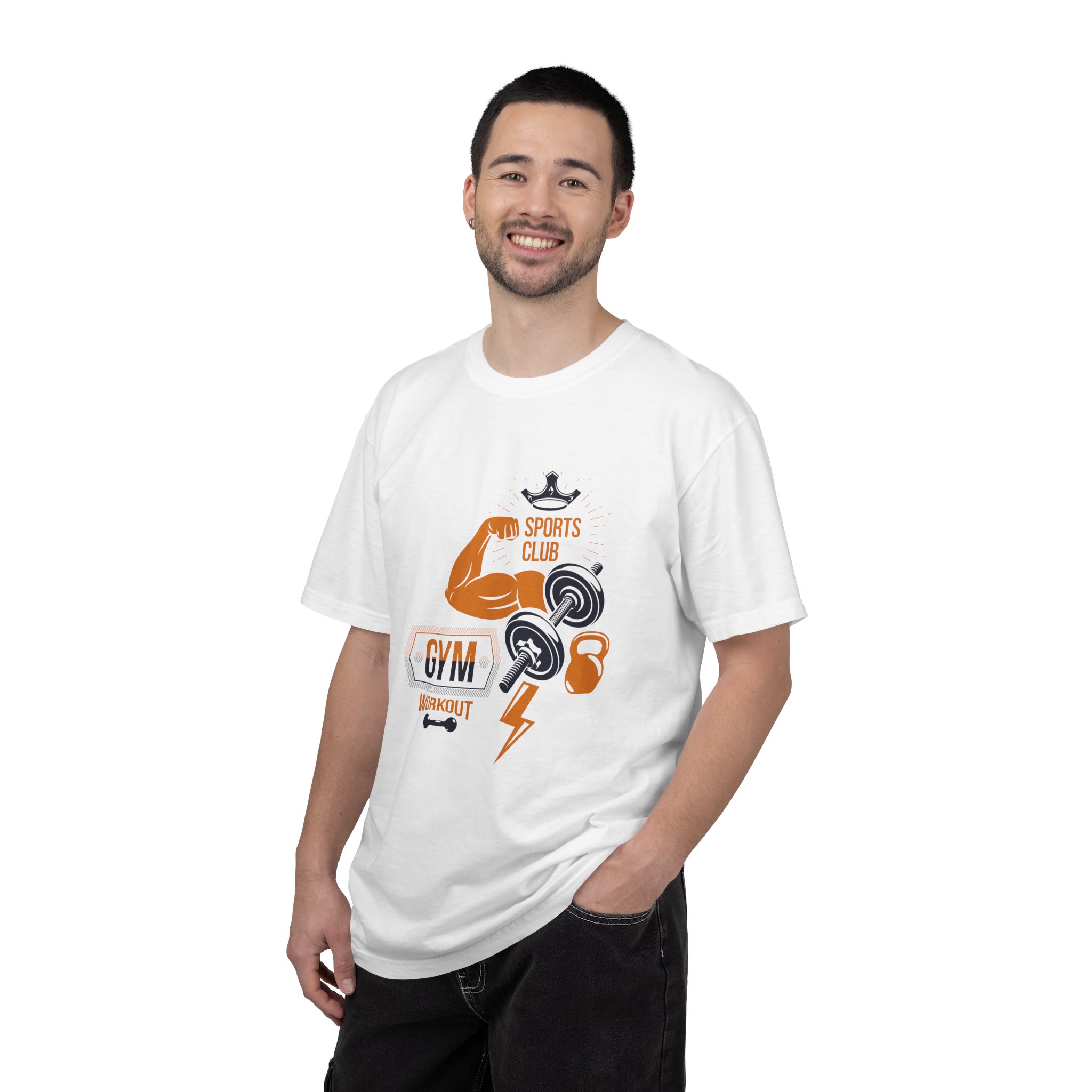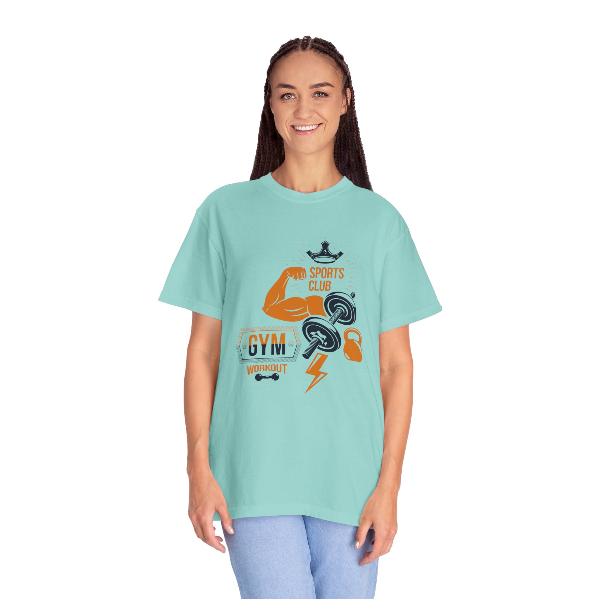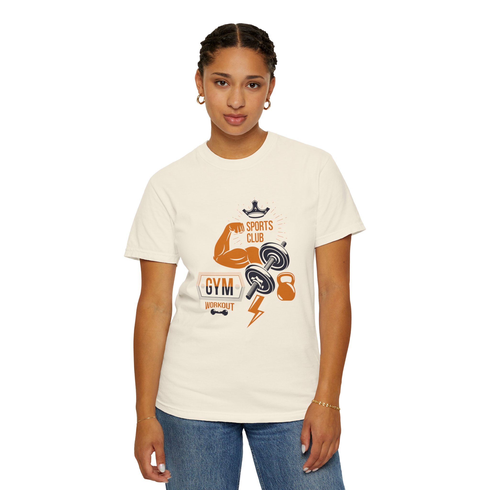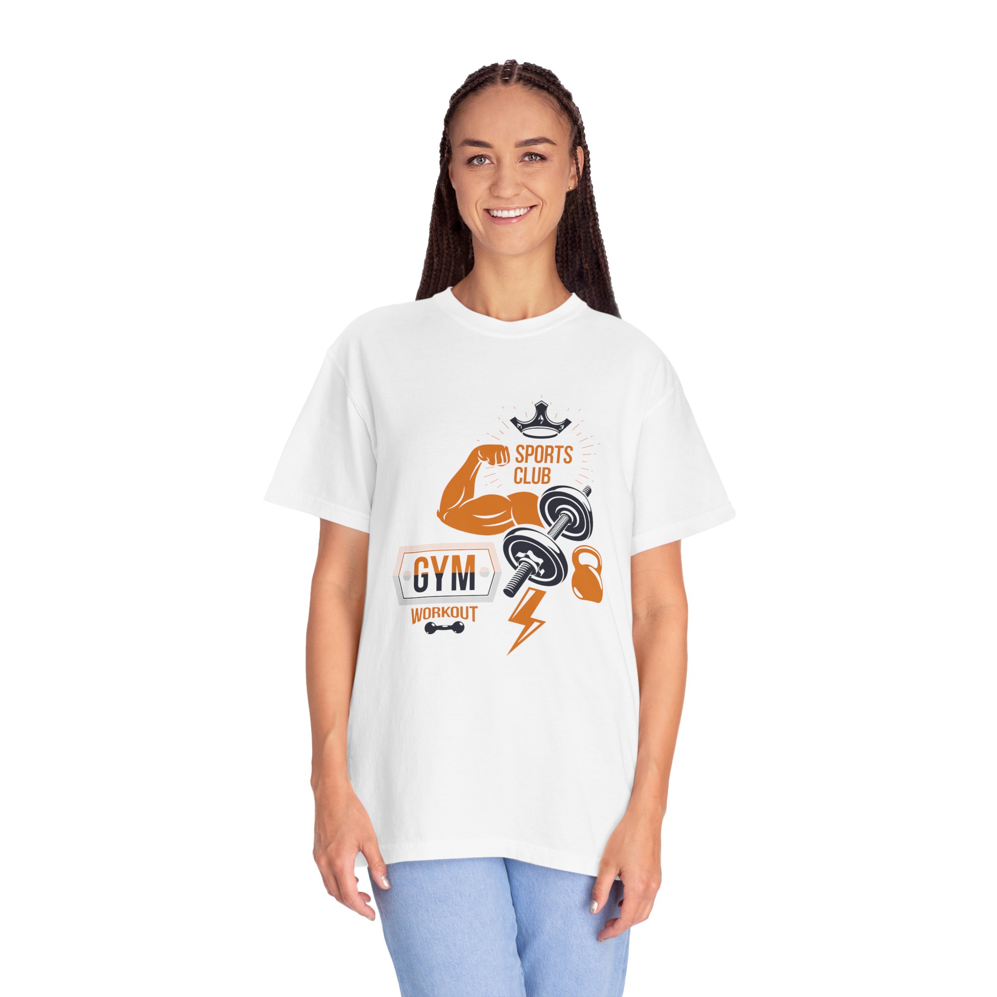 This heavyweight, garment-dyed tee brings gym-day energy into everyday wear. The design layers classic strength motifs — flexed biceps, dumbbells, kettlebell and a lightning bolt — in a bold, graphic layout that reads sporty and confident. The soft, worn-in hand from post-construction dyeing, combined with a relaxed cut and durable double-needle stitching, makes this shirt feel lived-in from the first wear while standing up to regular training sessions. Available in a wide range of colors and sizes, it sits comfortably as a go-to for warmups, casual gym sessions, or running errands with athletic style.
