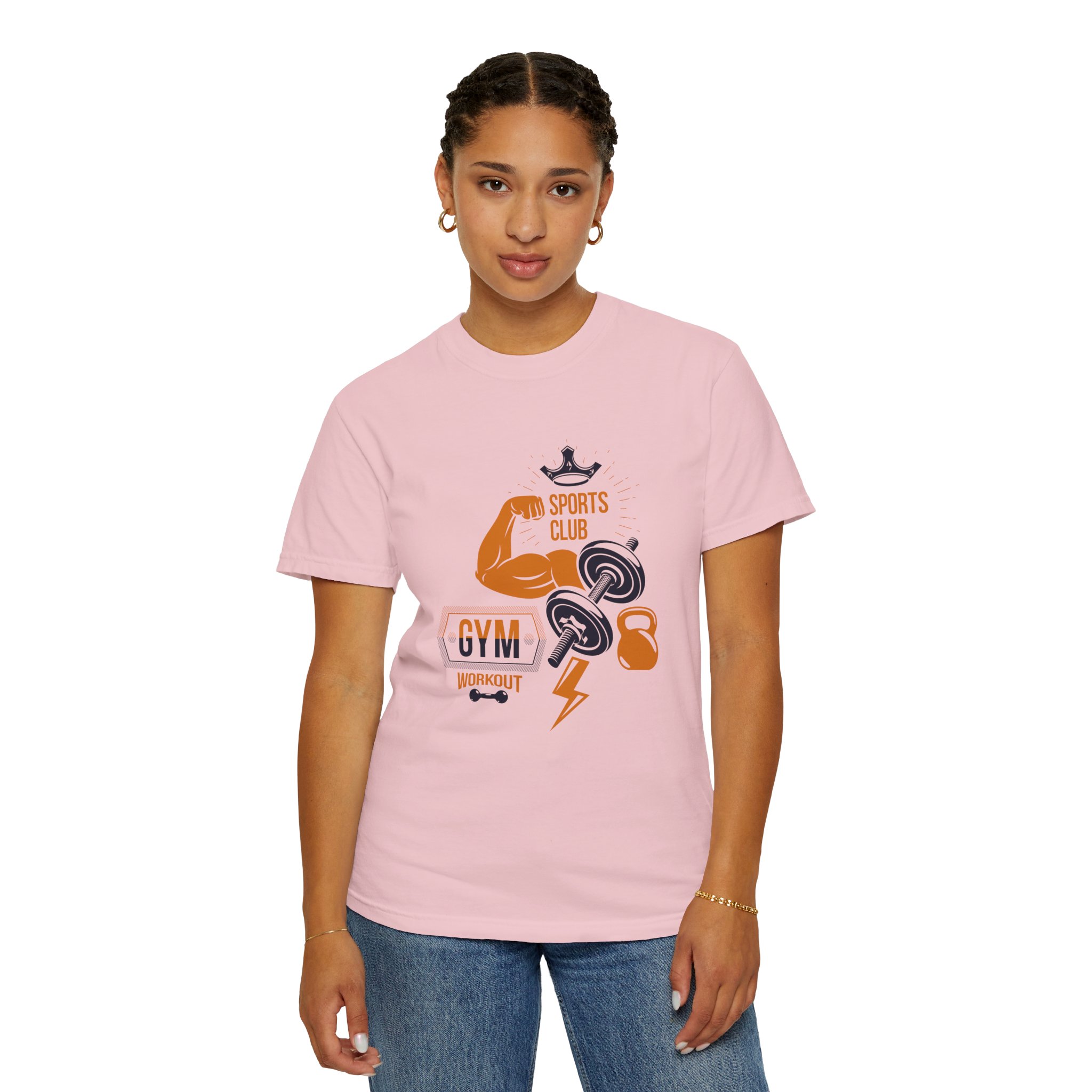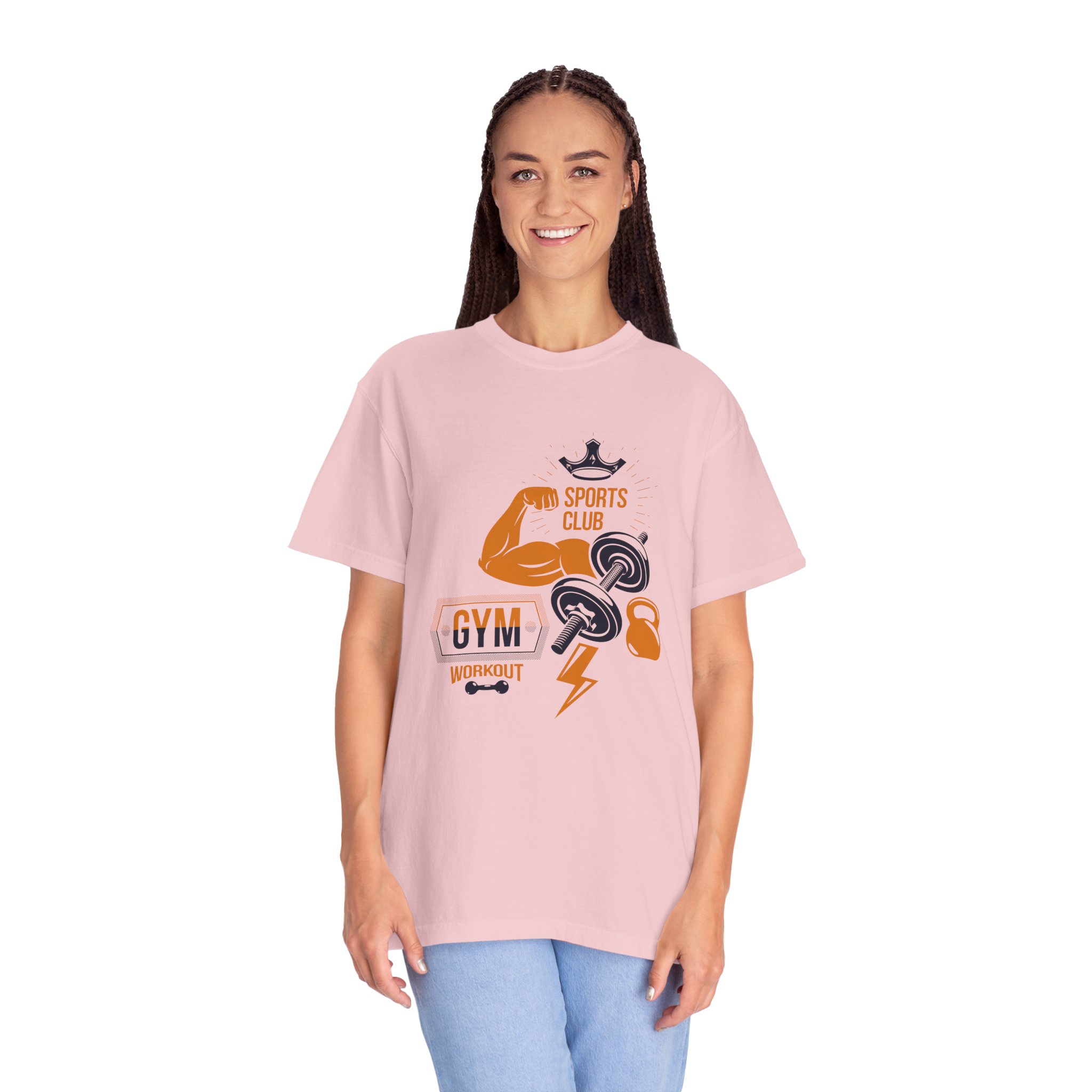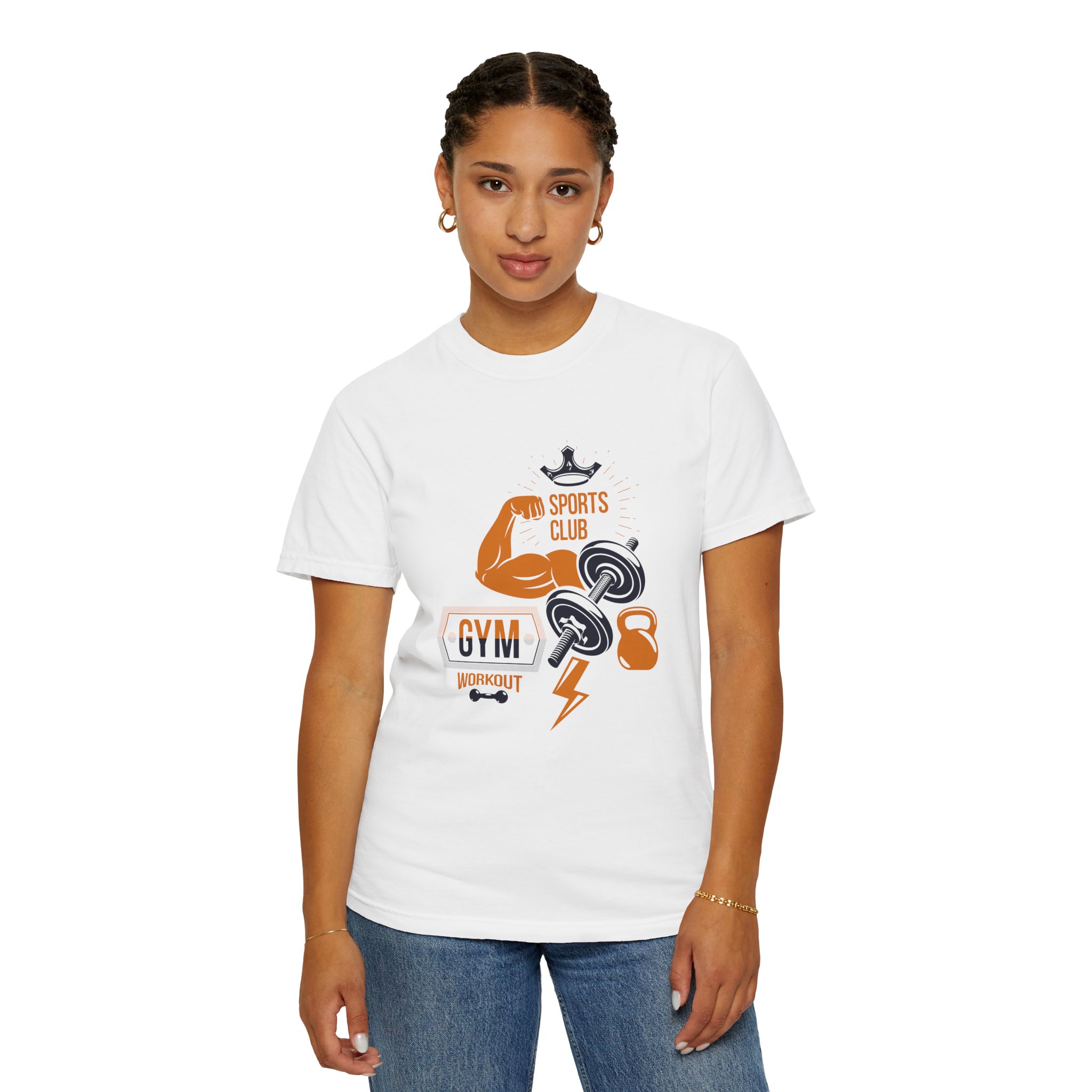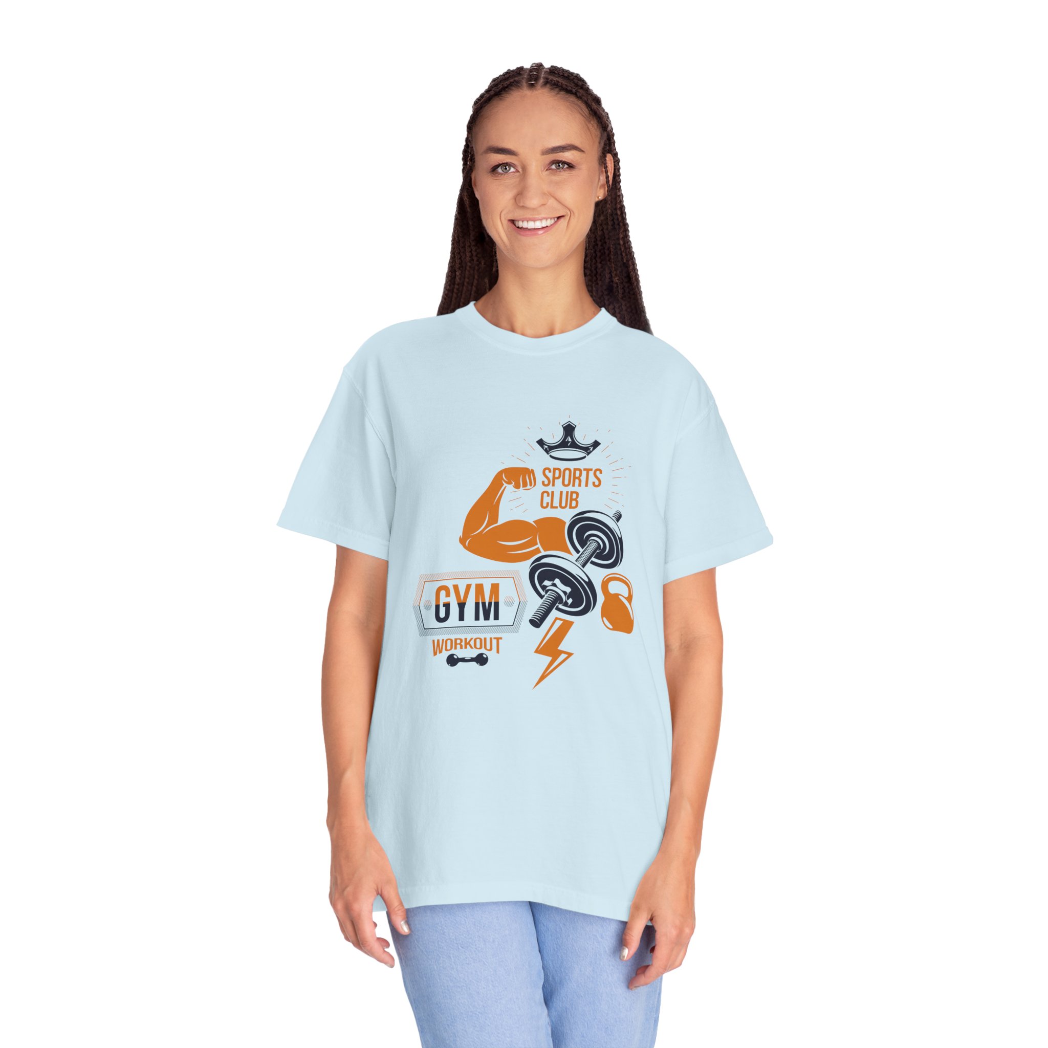 This heavyweight, garment-dyed tee brings gym-day energy into everyday wear. The design layers classic strength motifs — flexed biceps, dumbbells, kettlebell and a lightning bolt — in a bold, graphic layout that reads sporty and confident. The soft, worn-in hand from post-construction dyeing, combined with a relaxed cut and durable double-needle stitching, makes this shirt feel lived-in from the first wear while standing up to regular training sessions. Available in a wide range of colors and sizes, it sits comfortably as a go-to for warmups, casual gym sessions, or running errands with athletic style.