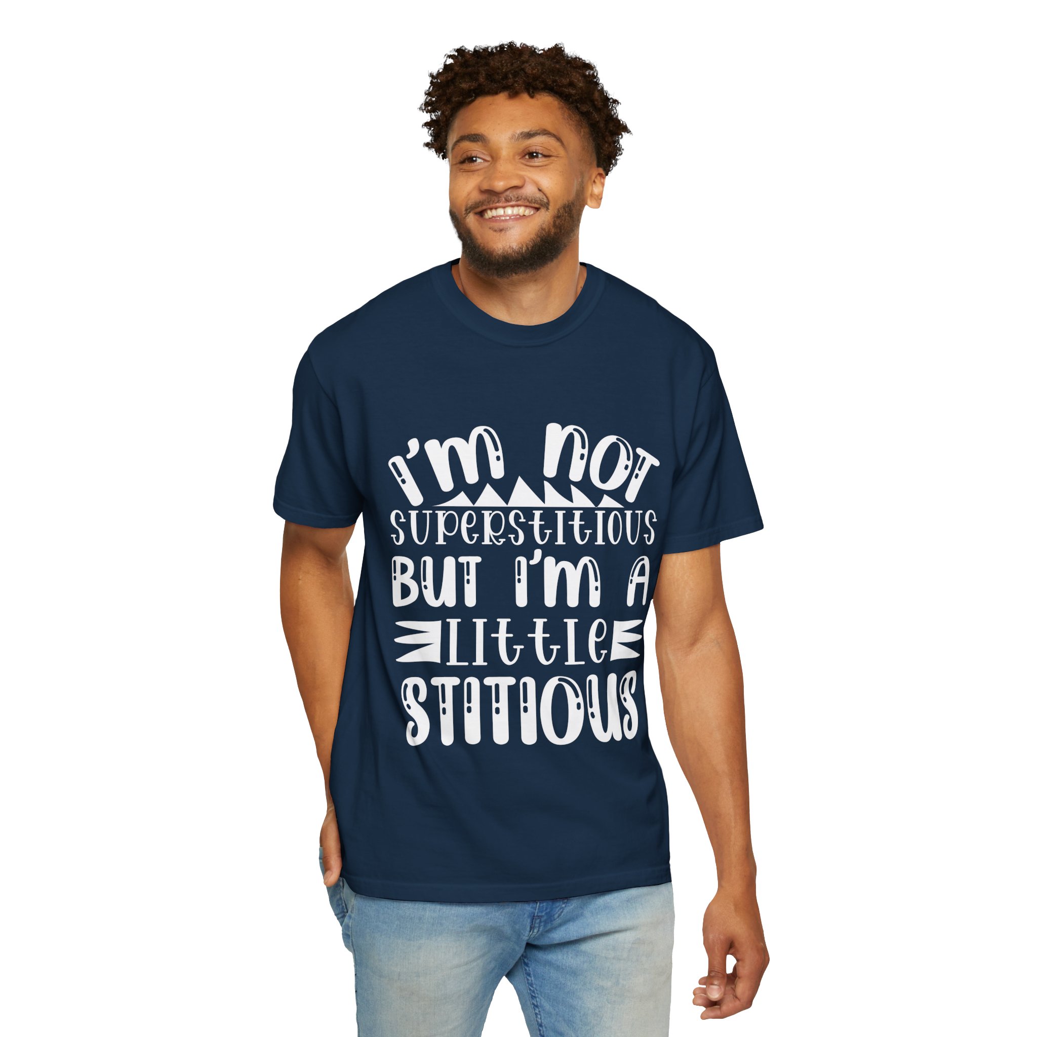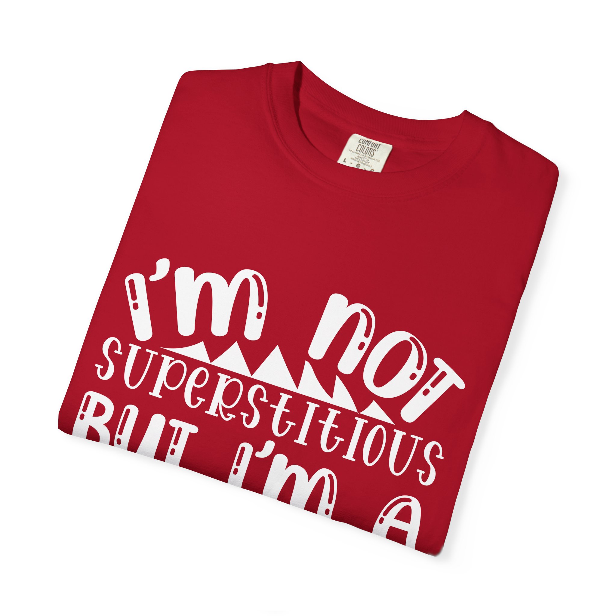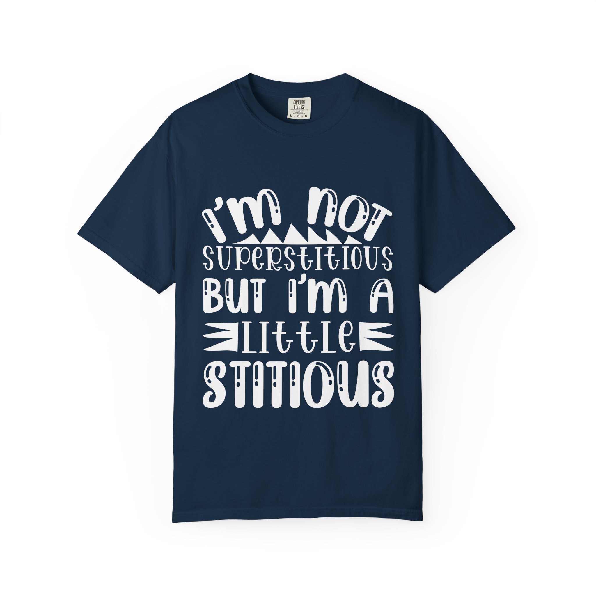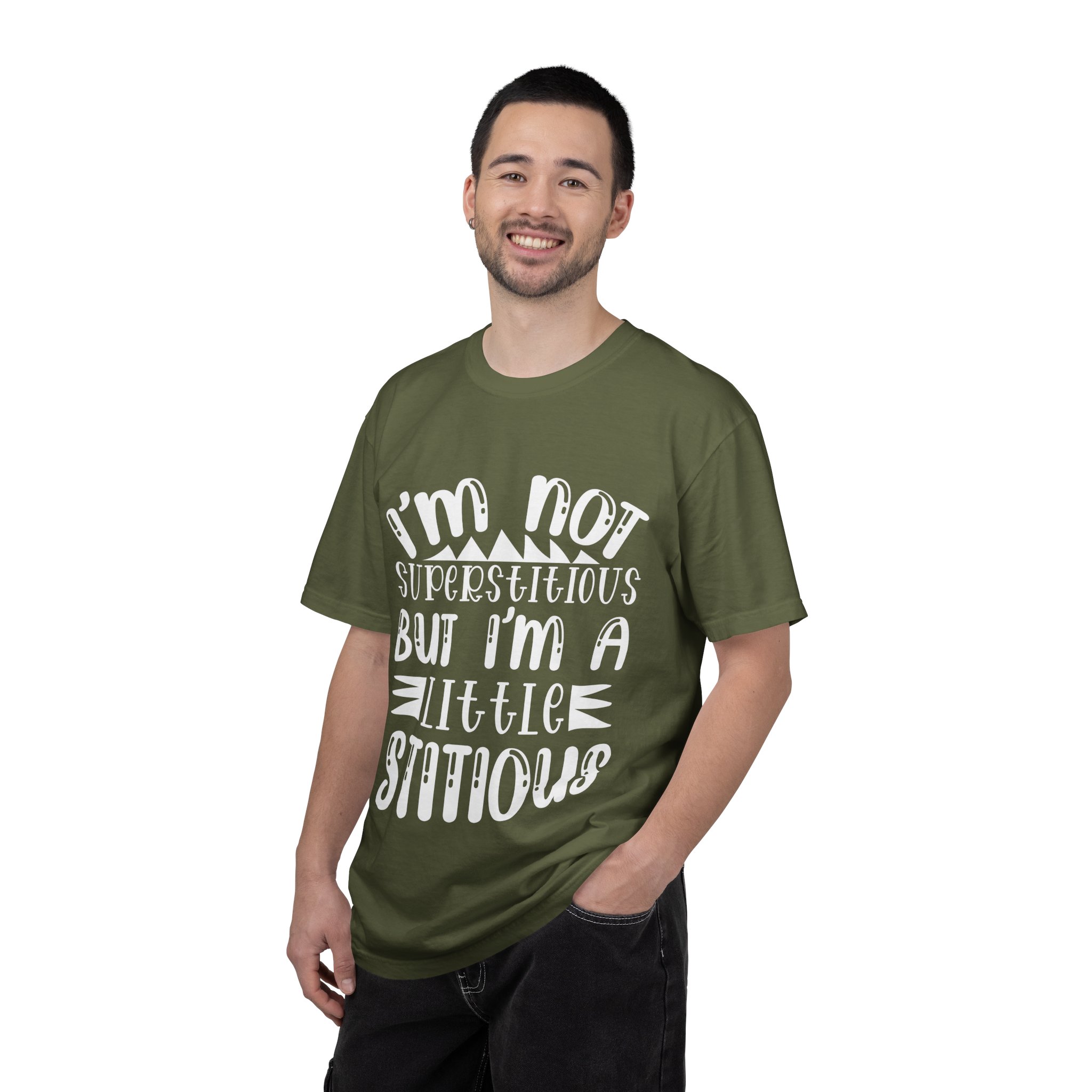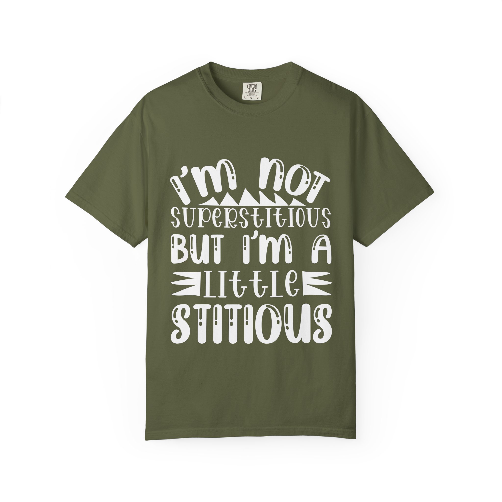 Soft, sturdy, and quietly witty — this garment-dyed tee wears like an old favorite from the first day. The relaxed, heavyweight knit gives presence without stiffness, while the muted dye and playful hand-lettered print (“I’m not superstitious but I’m a little stitious”) read like a private joke shared at coffee or on a weekend errand. It settles into everyday life: paired with worn denim for a laid-back afternoon, layered under a flannel for brisk mornings, or worn solo when you want a comfortable shirt that says something without shouting. The shirt feels lived-in, holds its color through washes, and keeps its shape thanks to double-needle stitching and pre-shrunk ring-spun cotton. Sized broadly and available in many colors, it’s for people who favor personality over polish and comfort over fuss.