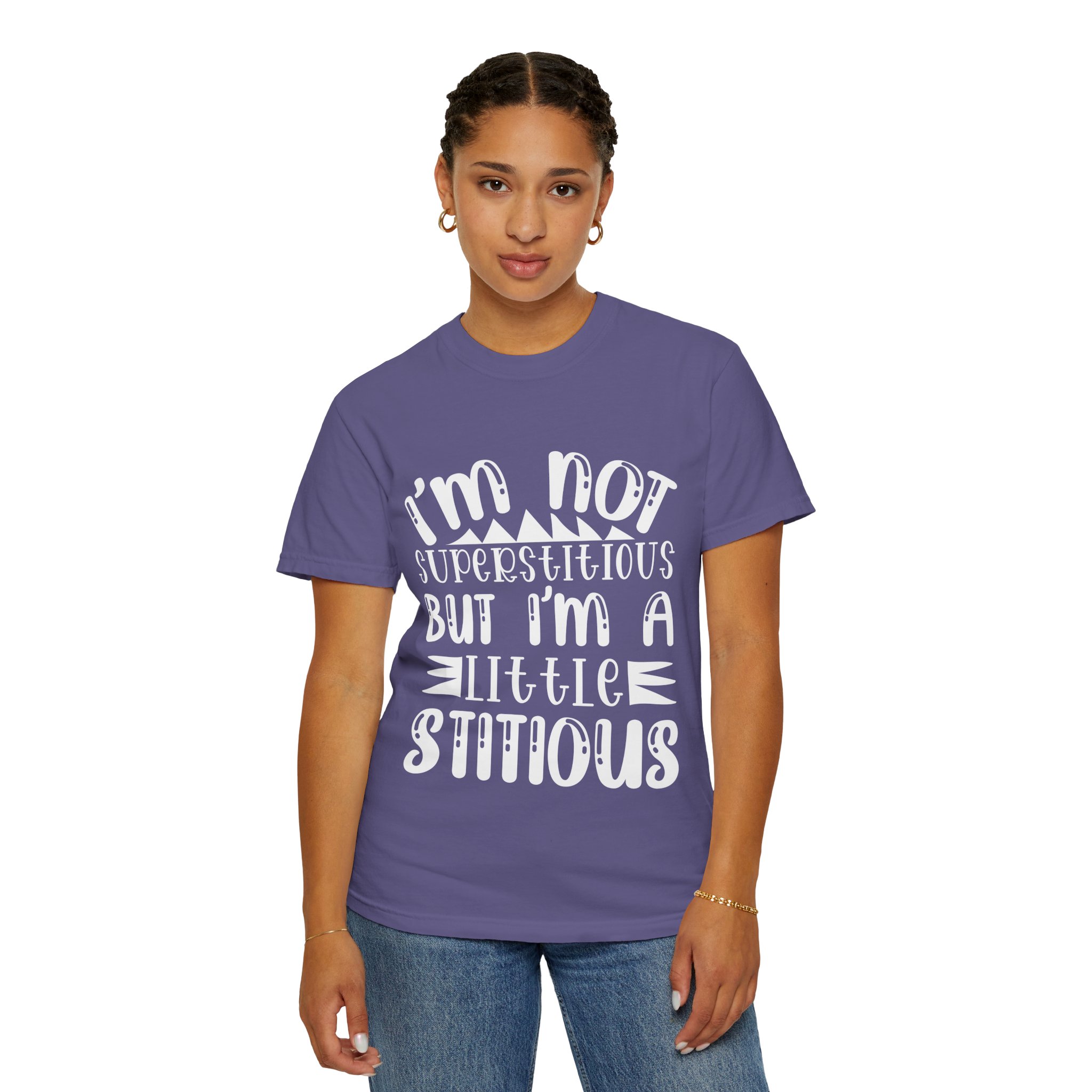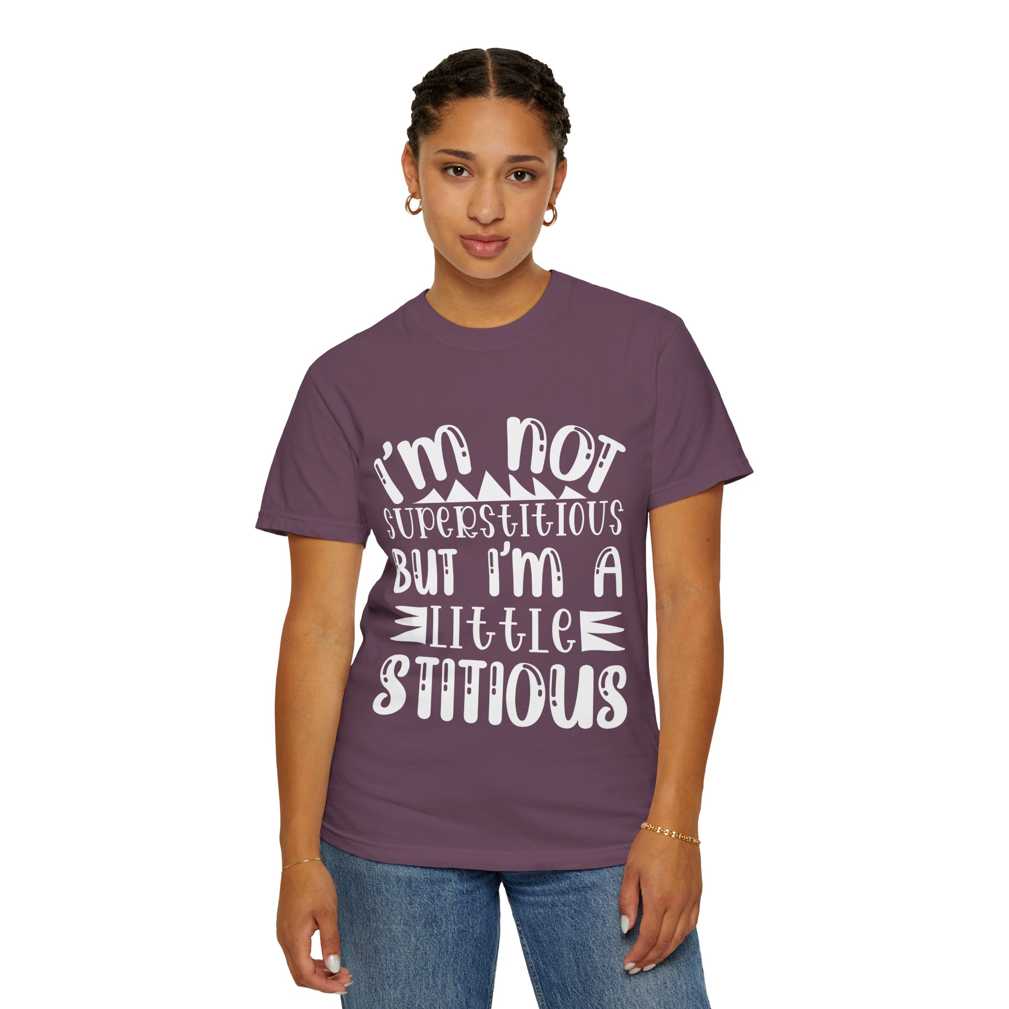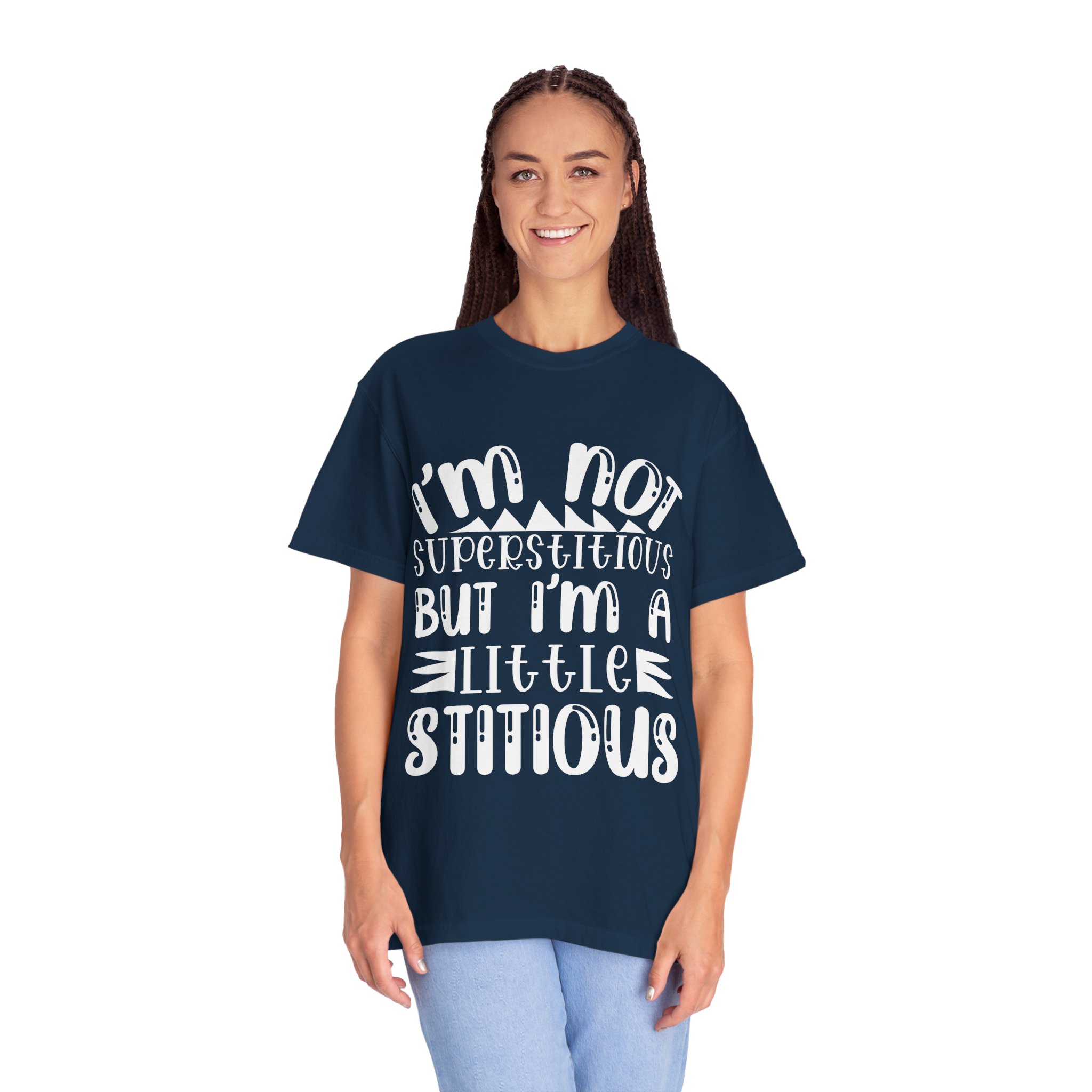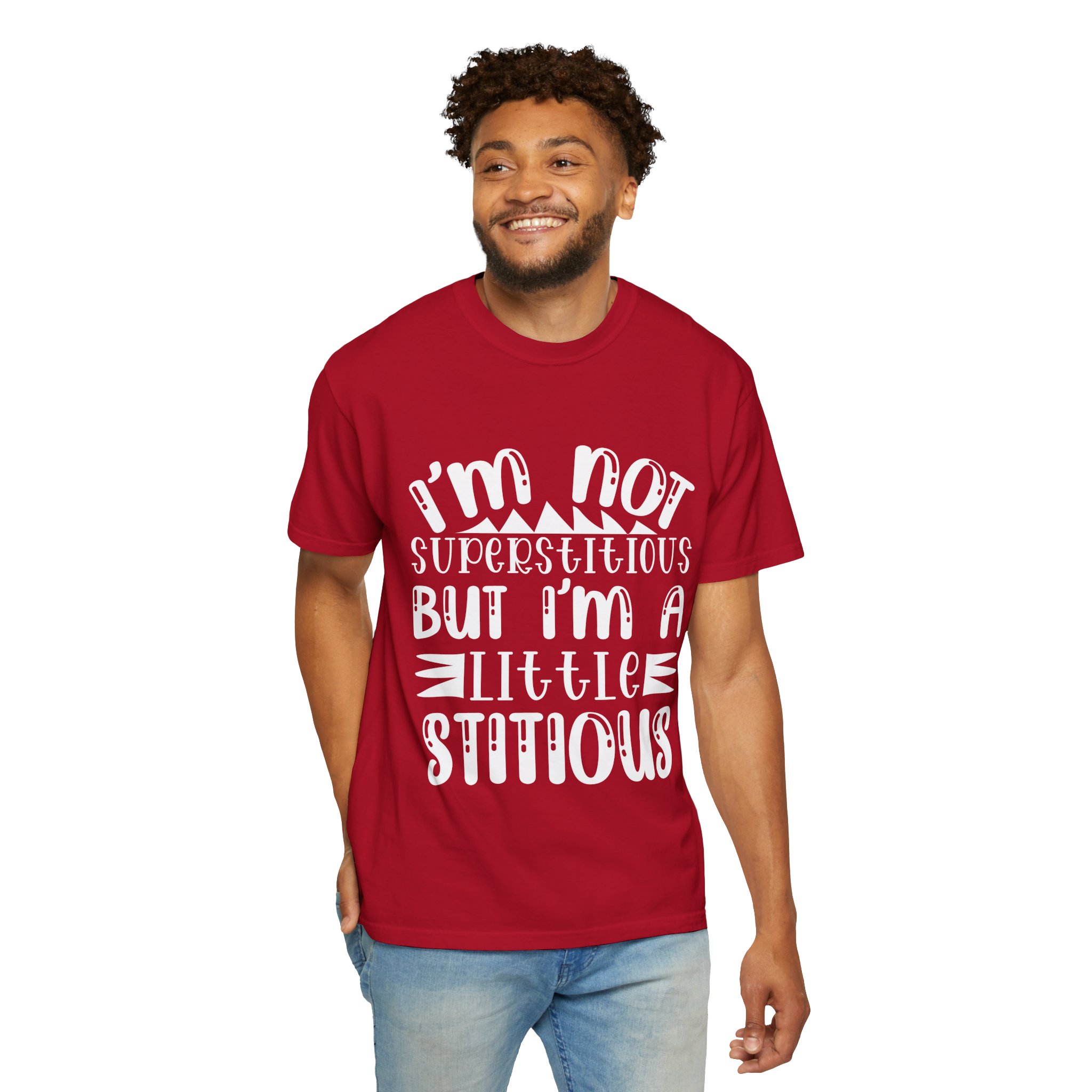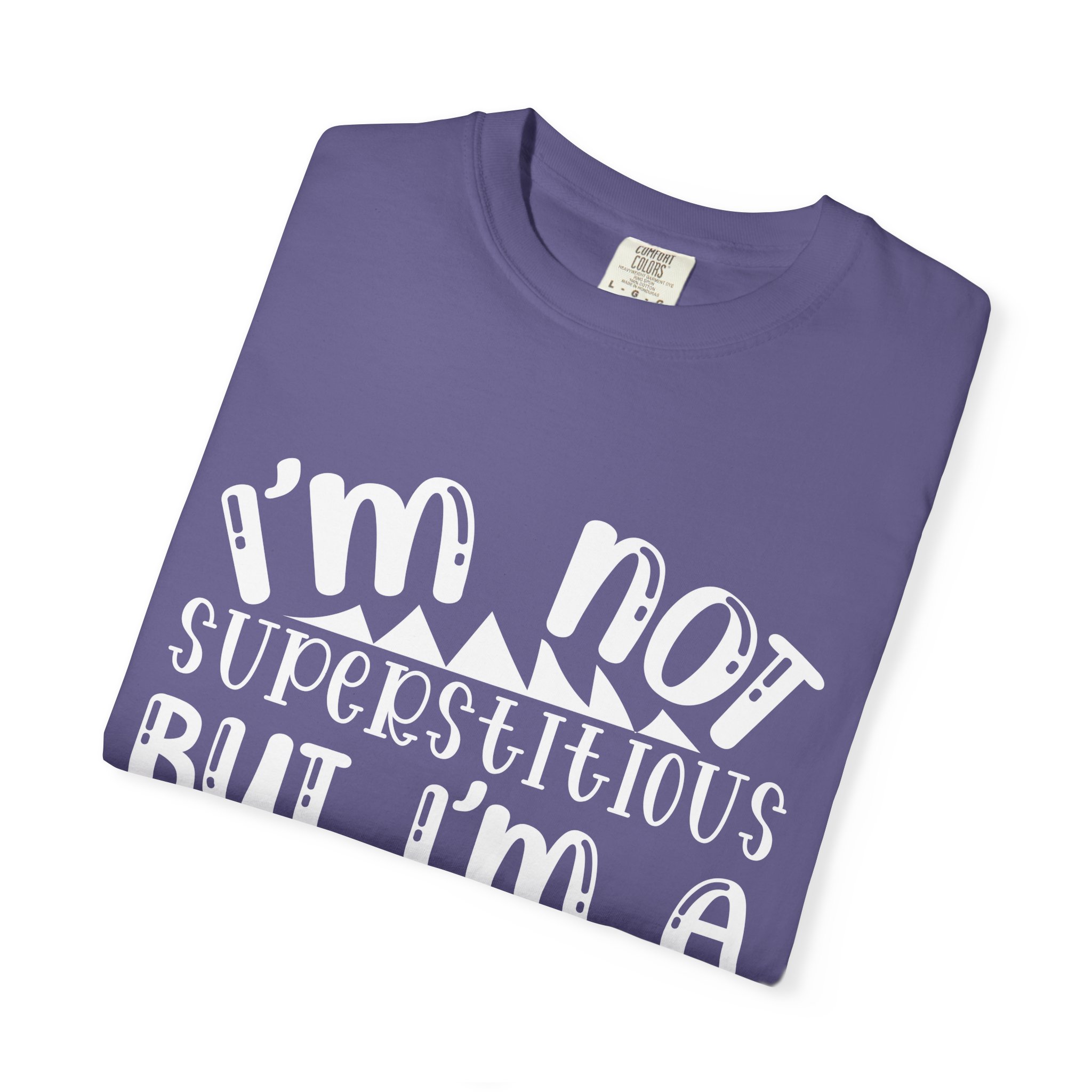 Soft, sturdy, and quietly witty — this garment-dyed tee wears like an old favorite from the first day. The relaxed, heavyweight knit gives presence without stiffness, while the muted dye and playful hand-lettered print (“I’m not superstitious but I’m a little stitious”) read like a private joke shared at coffee or on a weekend errand. It settles into everyday life: paired with worn denim for a laid-back afternoon, layered under a flannel for brisk mornings, or worn solo when you want a comfortable shirt that says something without shouting. The shirt feels lived-in, holds its color through washes, and keeps its shape thanks to double-needle stitching and pre-shrunk ring-spun cotton. Sized broadly and available in many colors, it’s for people who favor personality over polish and comfort over fuss.