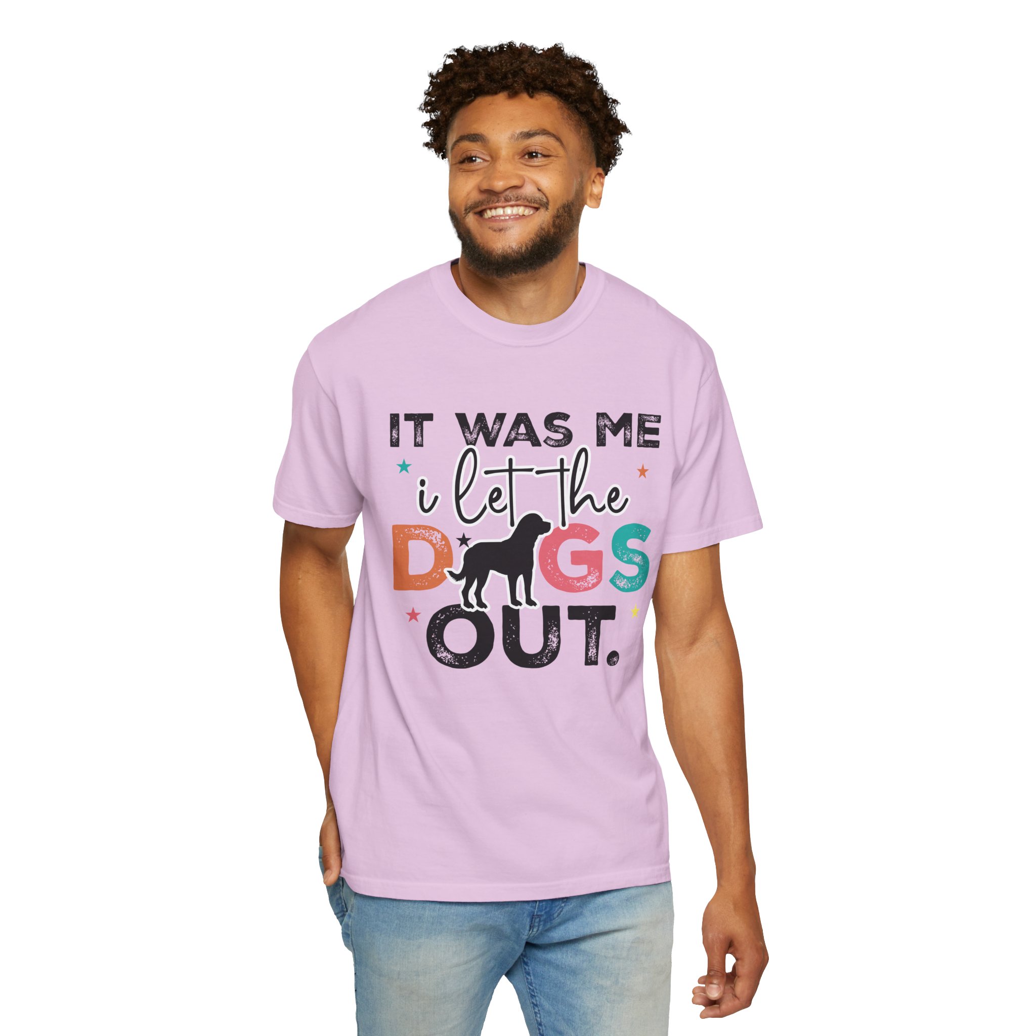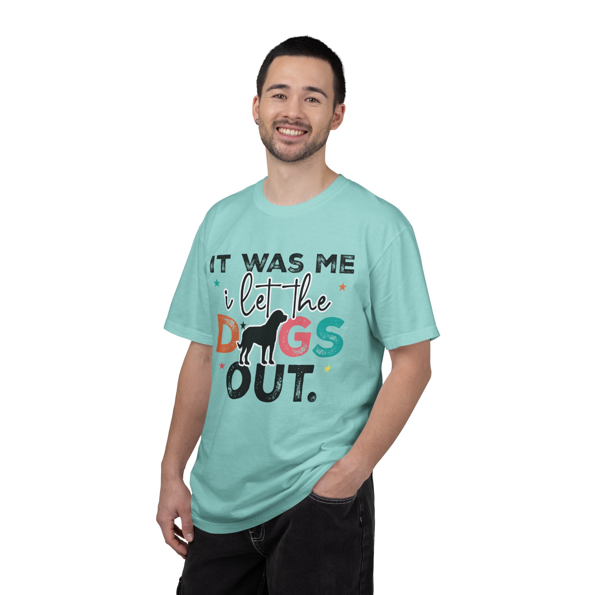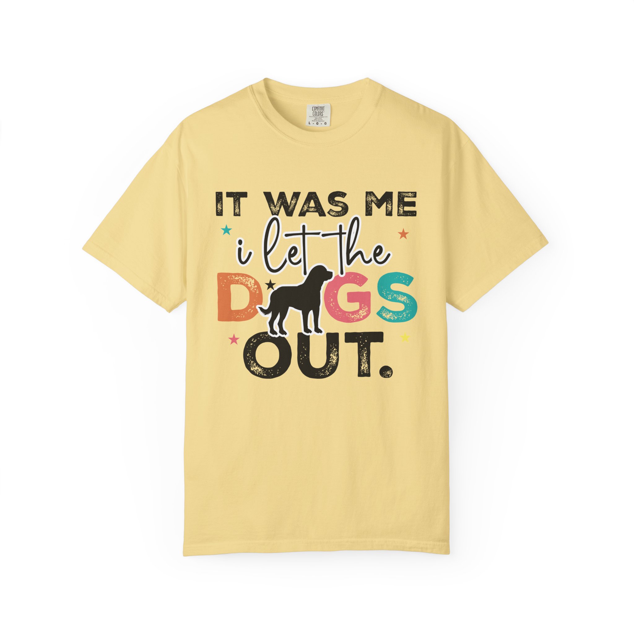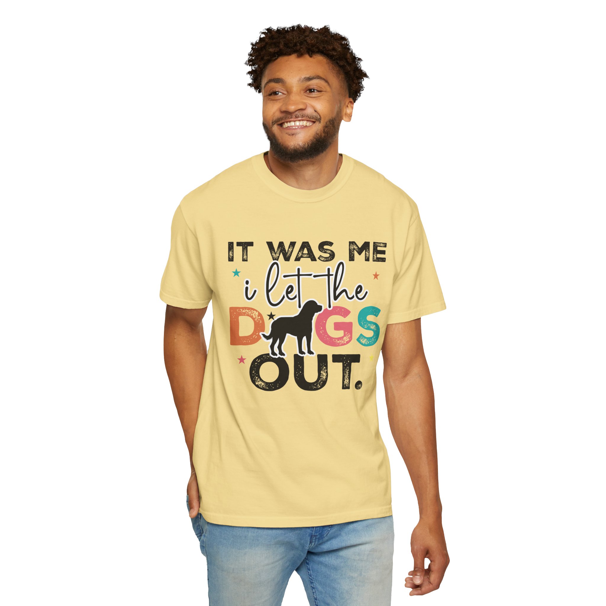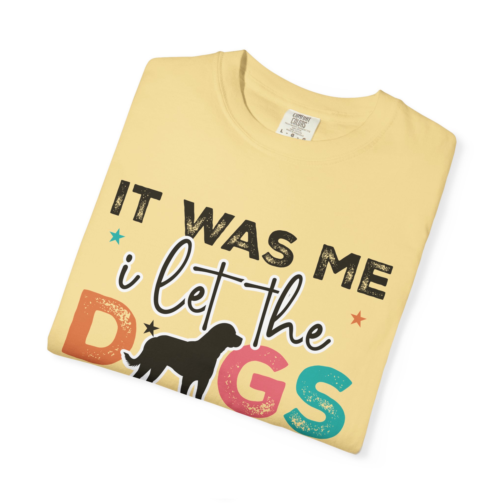 This garment-dyed tee brings casual comfort and playful personality to everyday wear. The relaxed, heavyweight cotton feels soft and worn-in thanks to the post-construction dyeing, while bold, colorful lettering and a silhouette of a dog create a lighthearted statement: “It was me, I let the dogs out.” It sits easily through morning walks, backyard hangouts, and dog-park runs — a familiar layer that looks lived-in from the first wear and holds up thanks to double-needle stitching and pre-shrunk ring-spun cotton. Offered in a wide range of colors and sizes, it blends durable construction with a friendly, pet-loving vibe that slips into routines and memories alike.