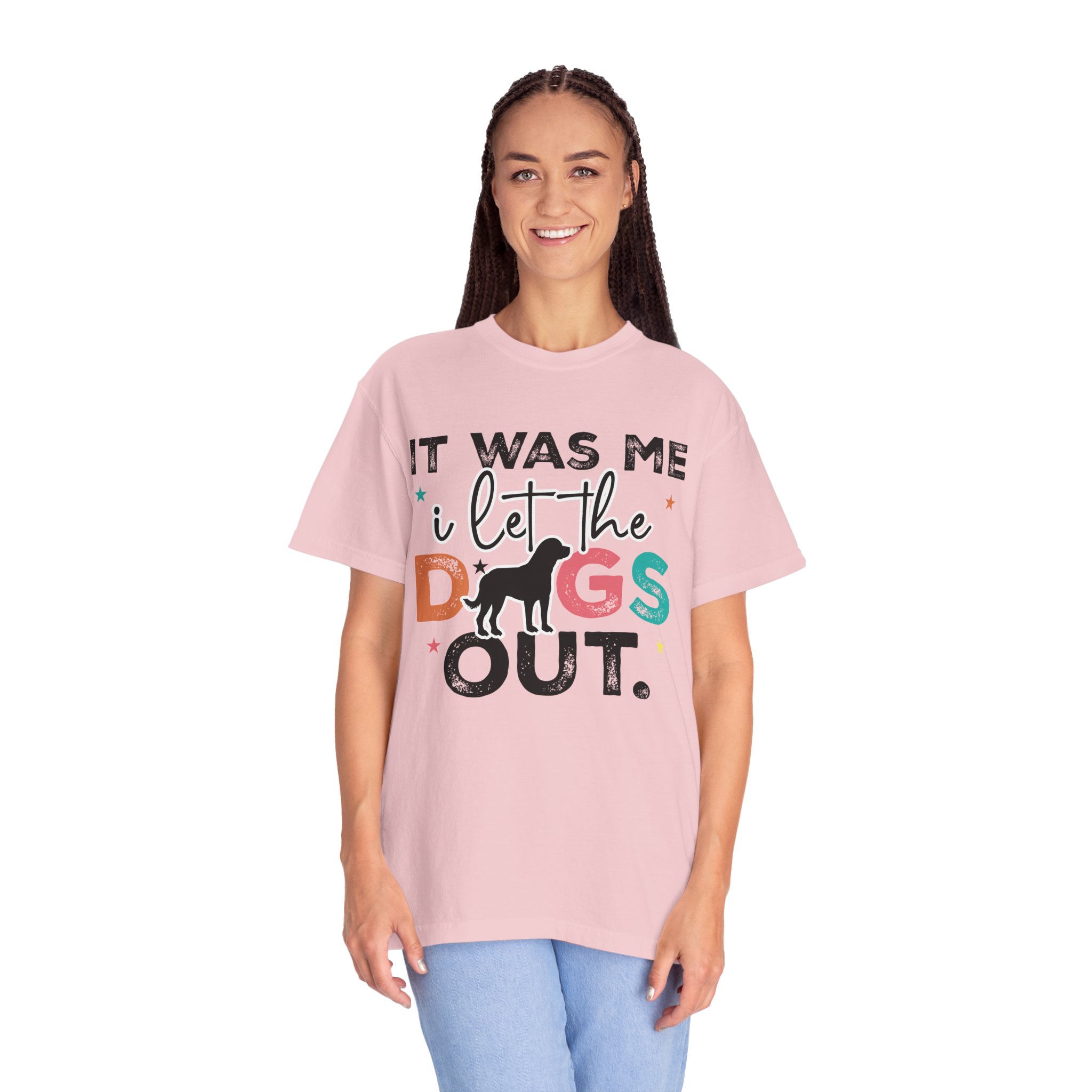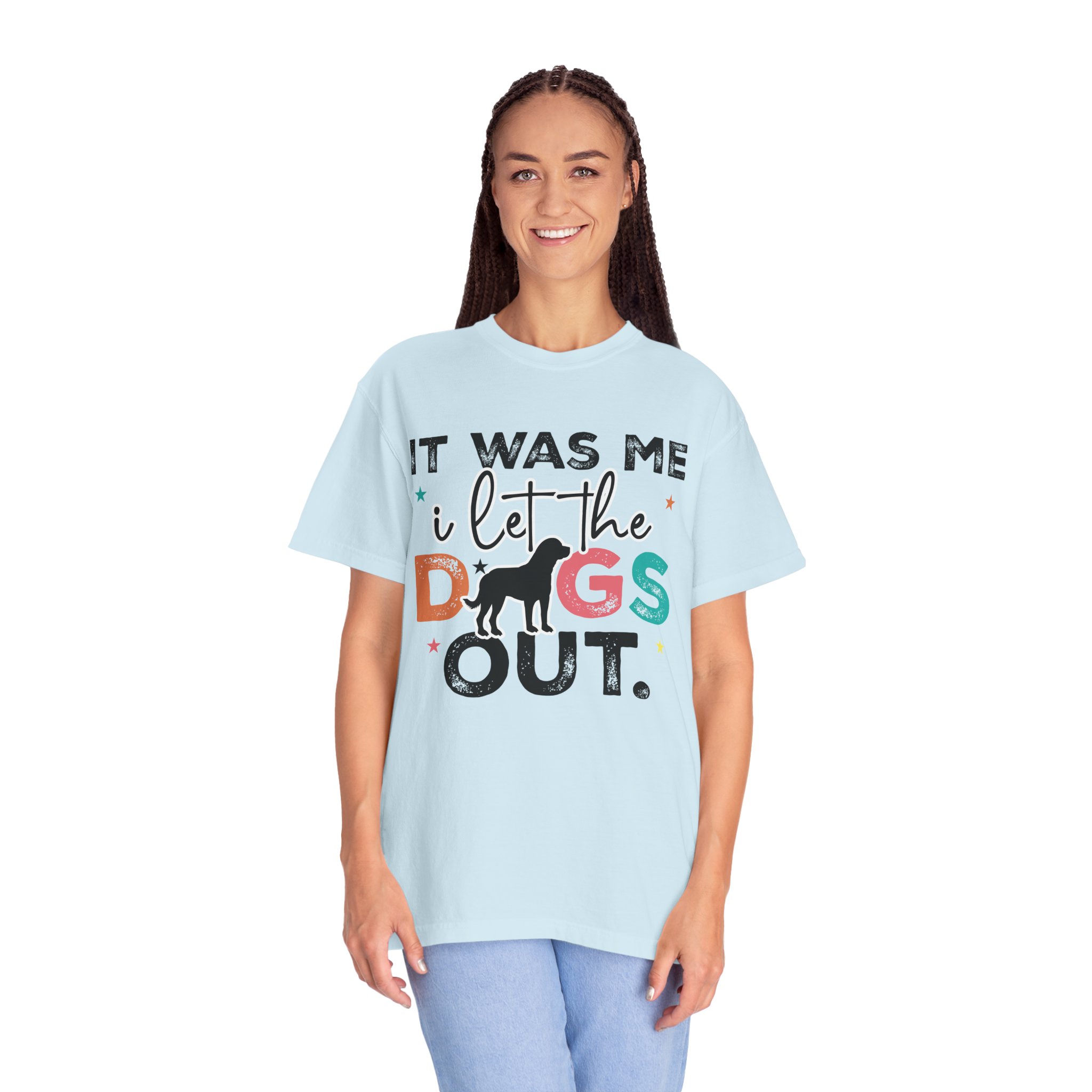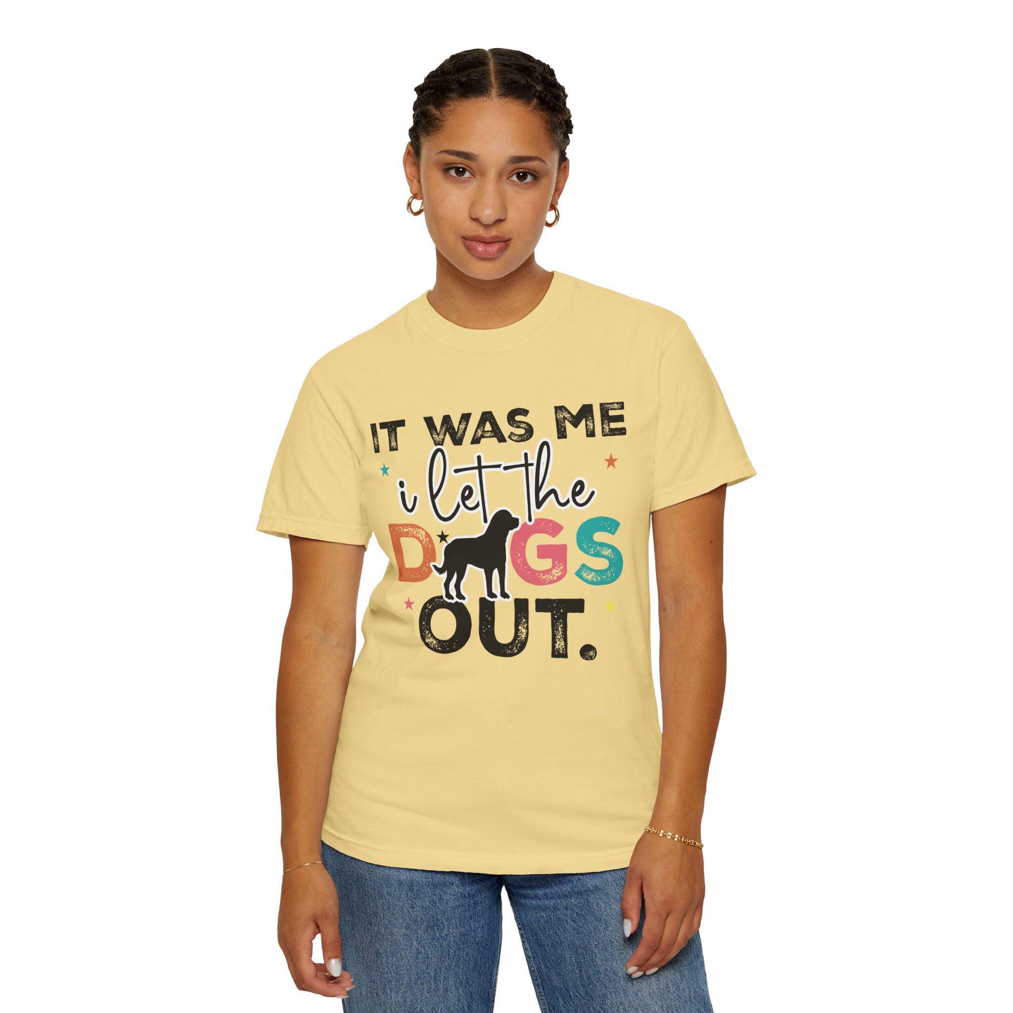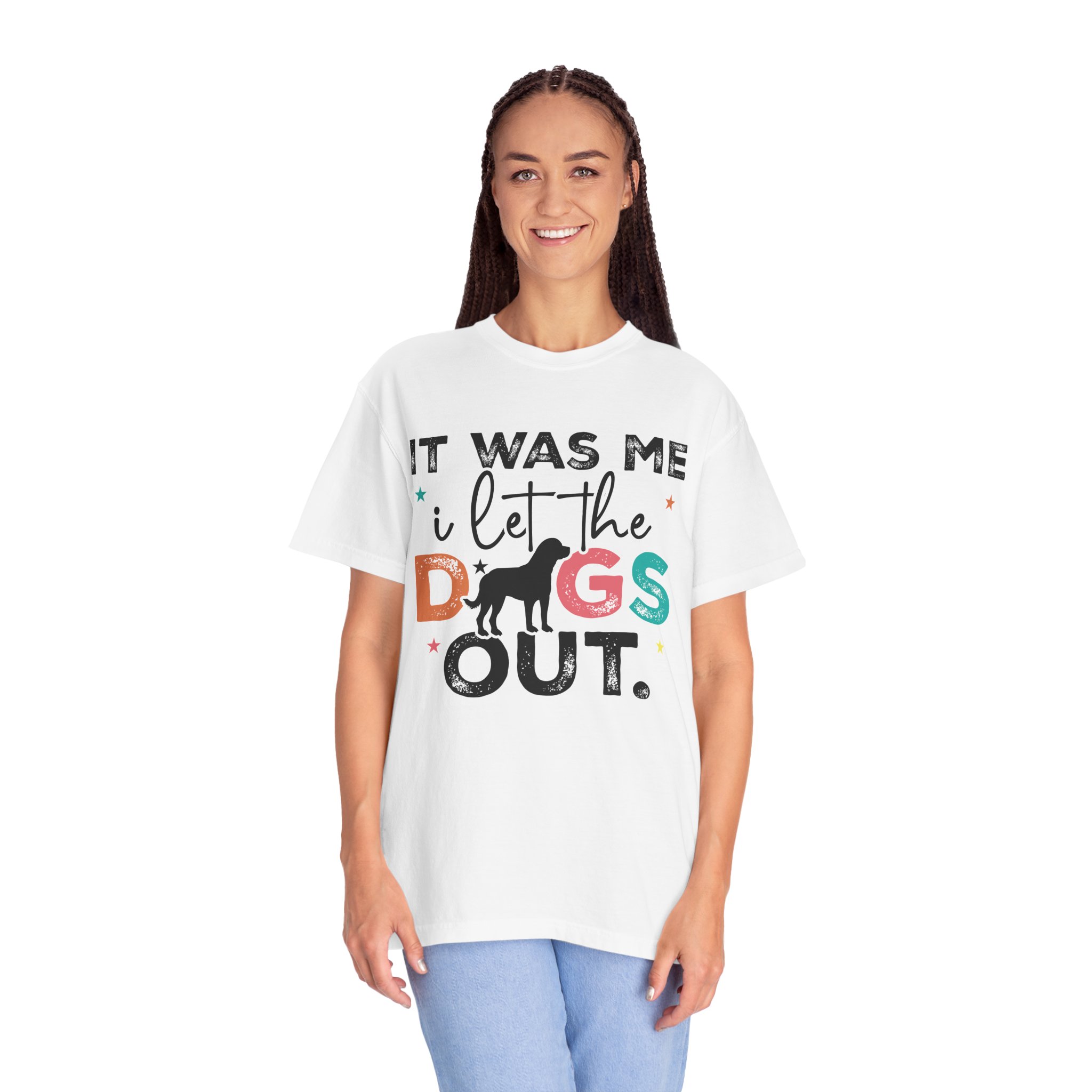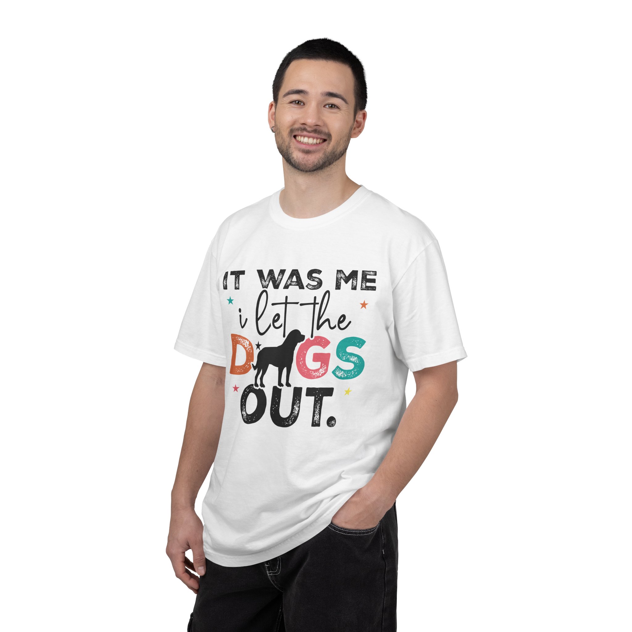 This garment-dyed tee brings casual comfort and playful personality to everyday wear. The relaxed, heavyweight cotton feels soft and worn-in thanks to the post-construction dyeing, while bold, colorful lettering and a silhouette of a dog create a lighthearted statement: “It was me, I let the dogs out.” It sits easily through morning walks, backyard hangouts, and dog-park runs — a familiar layer that looks lived-in from the first wear and holds up thanks to double-needle stitching and pre-shrunk ring-spun cotton. Offered in a wide range of colors and sizes, it blends durable construction with a friendly, pet-loving vibe that slips into routines and memories alike.