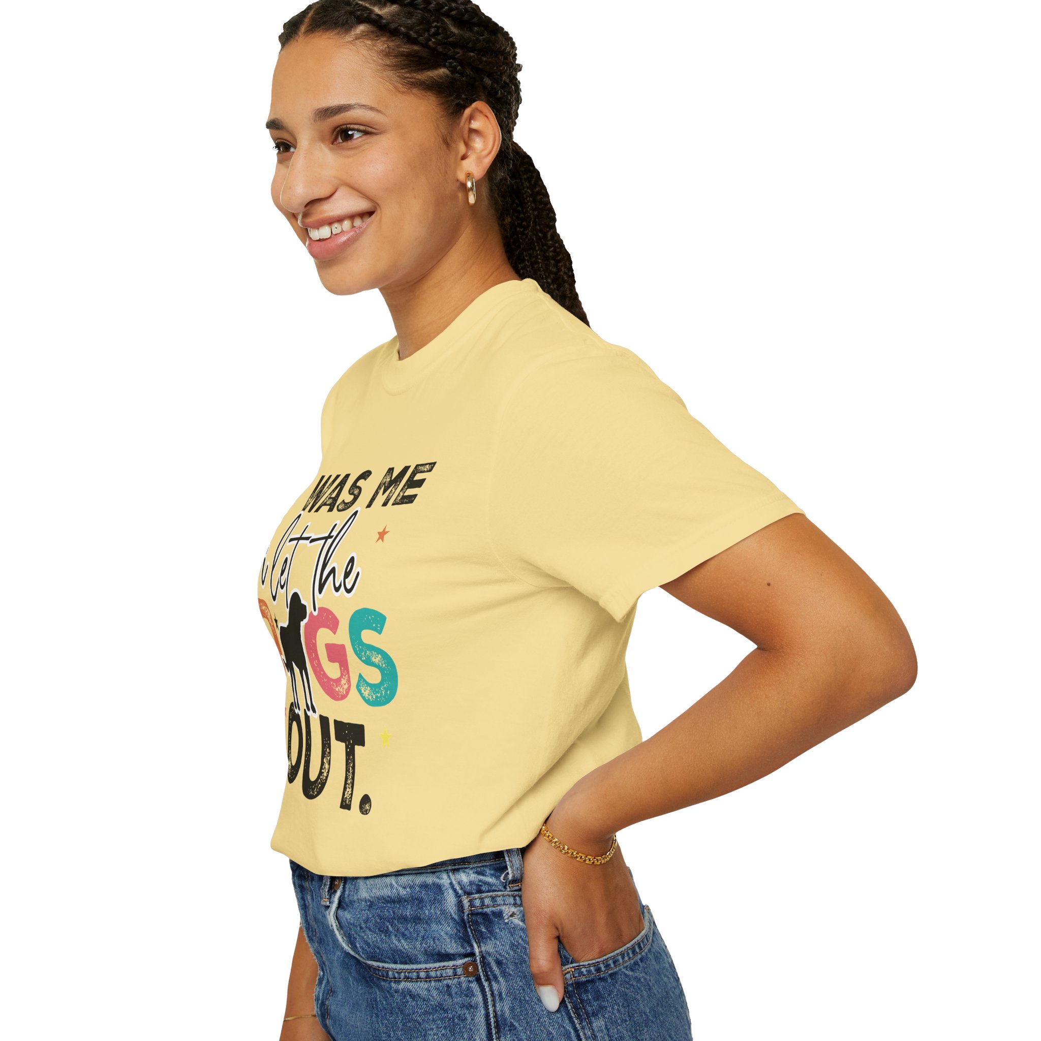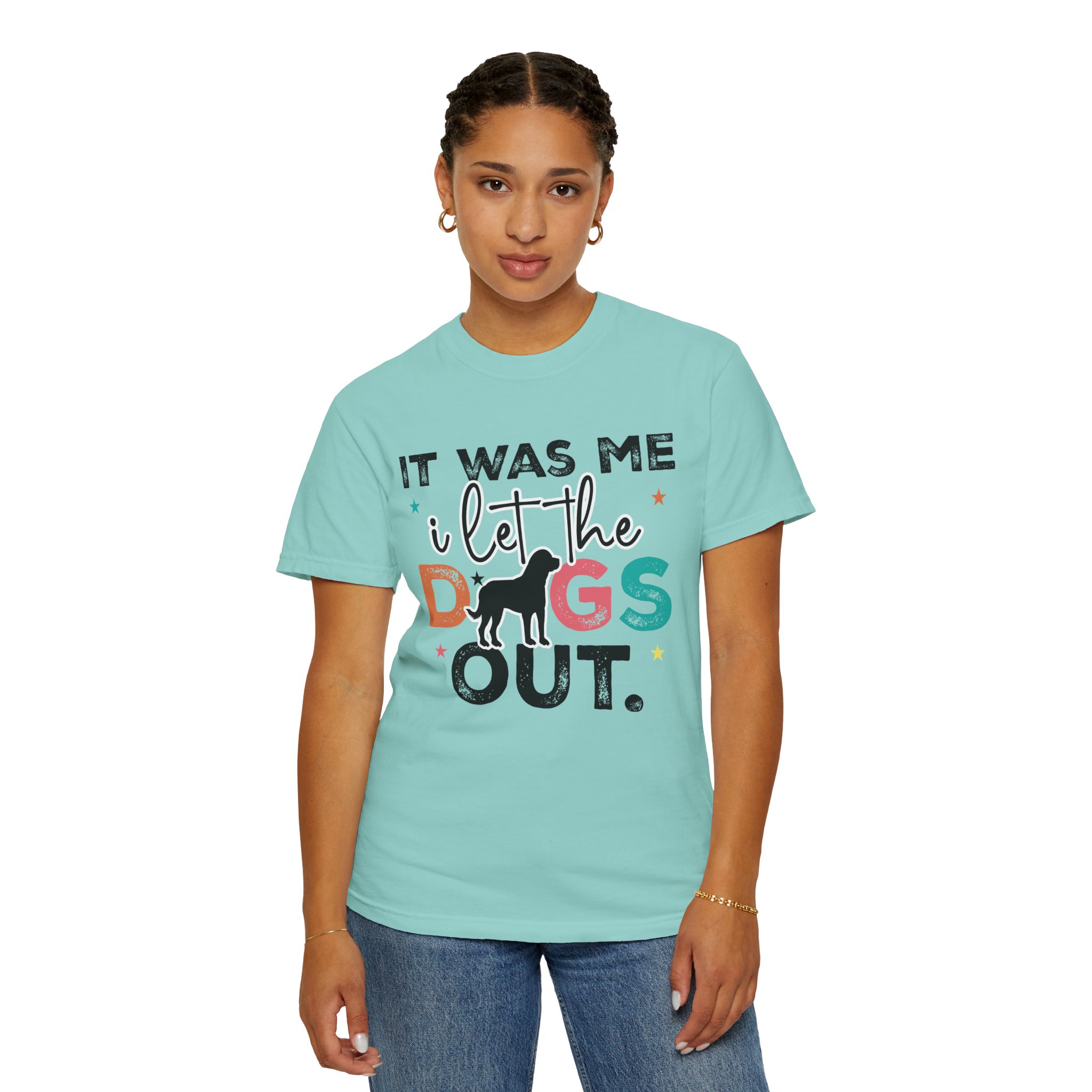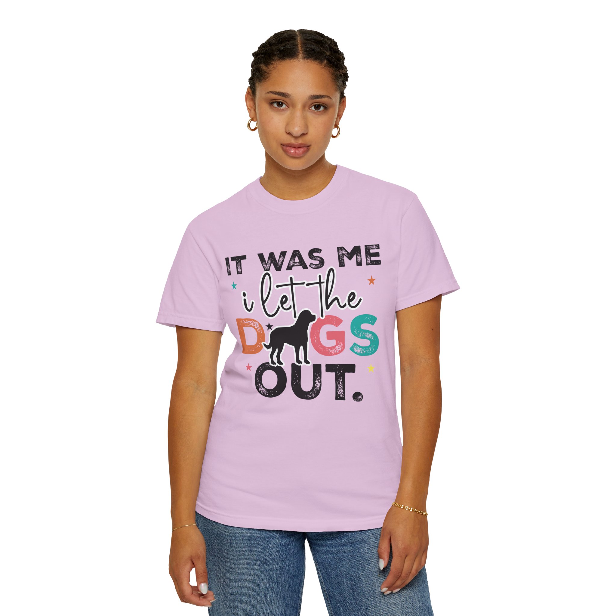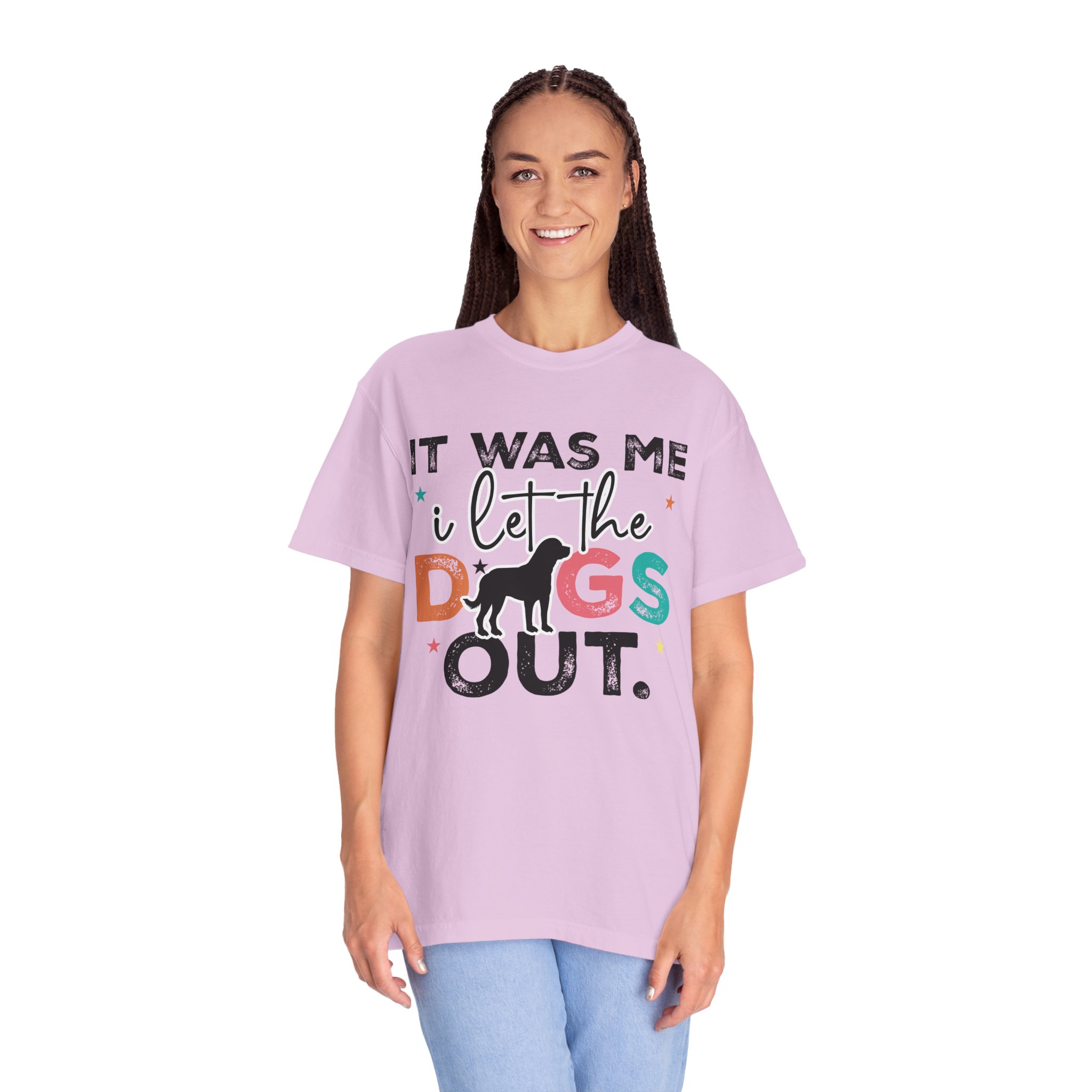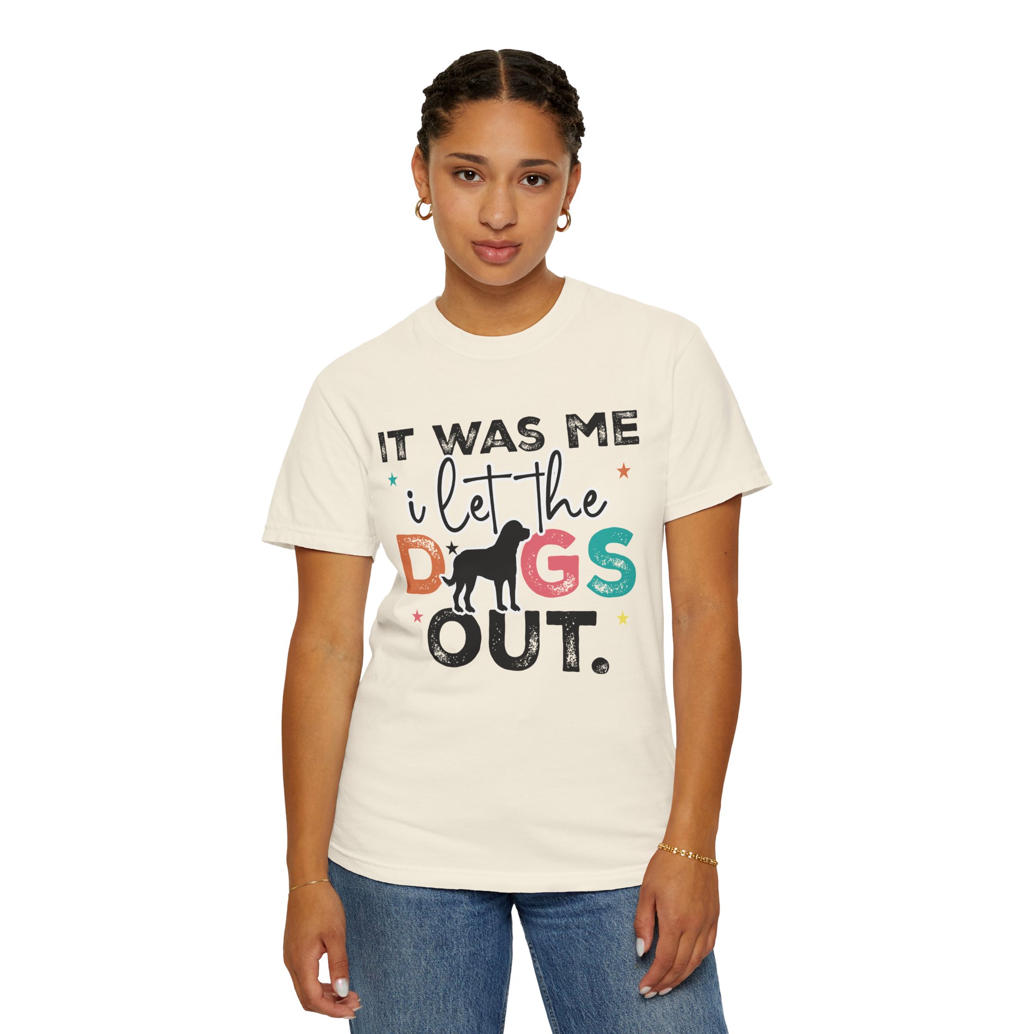 This garment-dyed tee brings casual comfort and playful personality to everyday wear. The relaxed, heavyweight cotton feels soft and worn-in thanks to the post-construction dyeing, while bold, colorful lettering and a silhouette of a dog create a lighthearted statement: “It was me, I let the dogs out.” It sits easily through morning walks, backyard hangouts, and dog-park runs — a familiar layer that looks lived-in from the first wear and holds up thanks to double-needle stitching and pre-shrunk ring-spun cotton. Offered in a wide range of colors and sizes, it blends durable construction with a friendly, pet-loving vibe that slips into routines and memories alike.