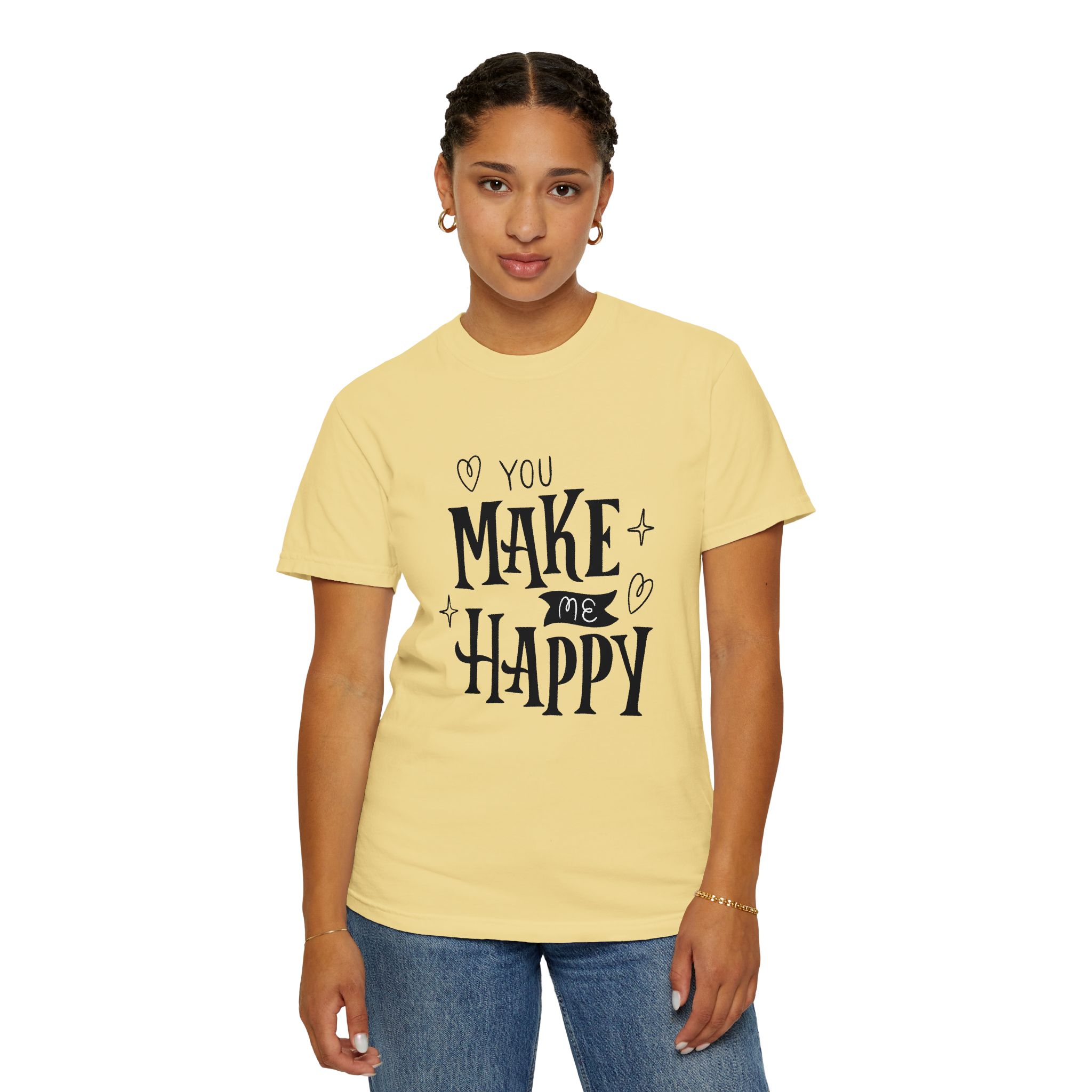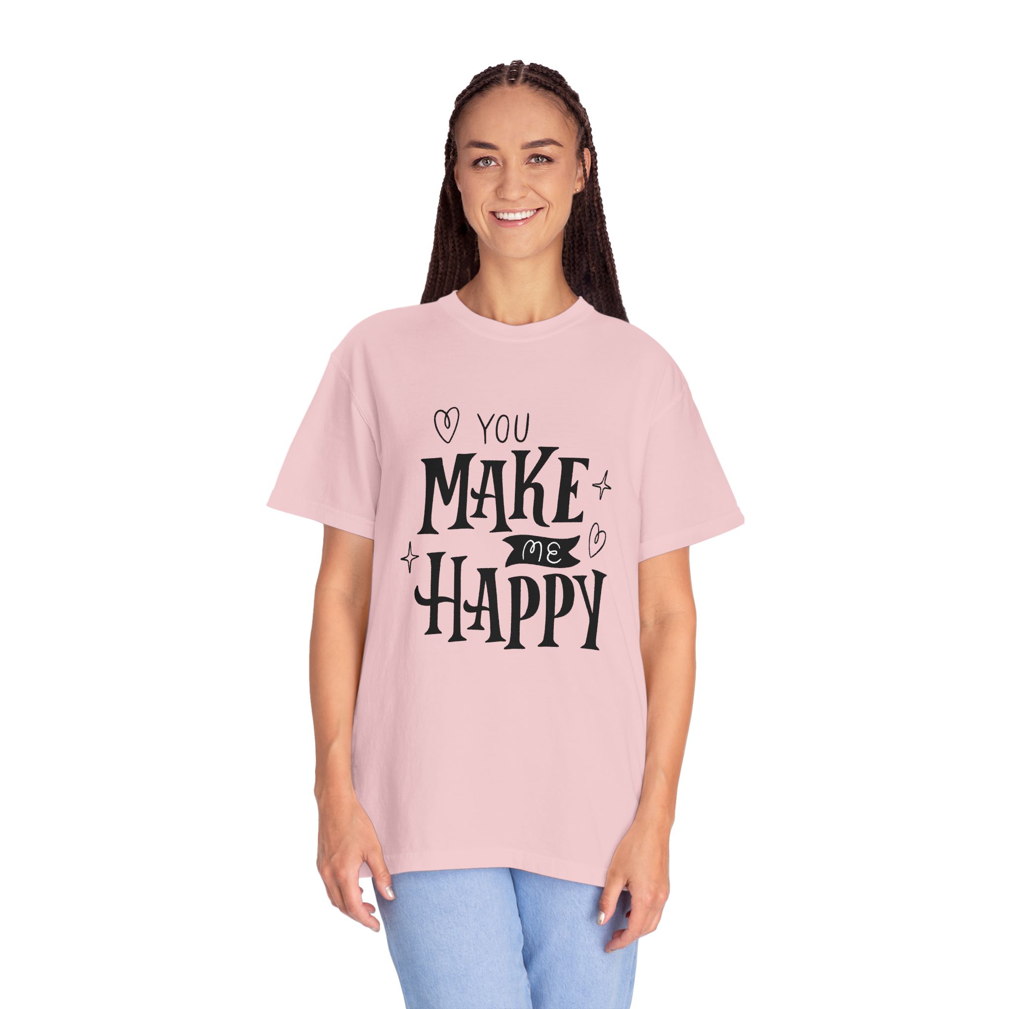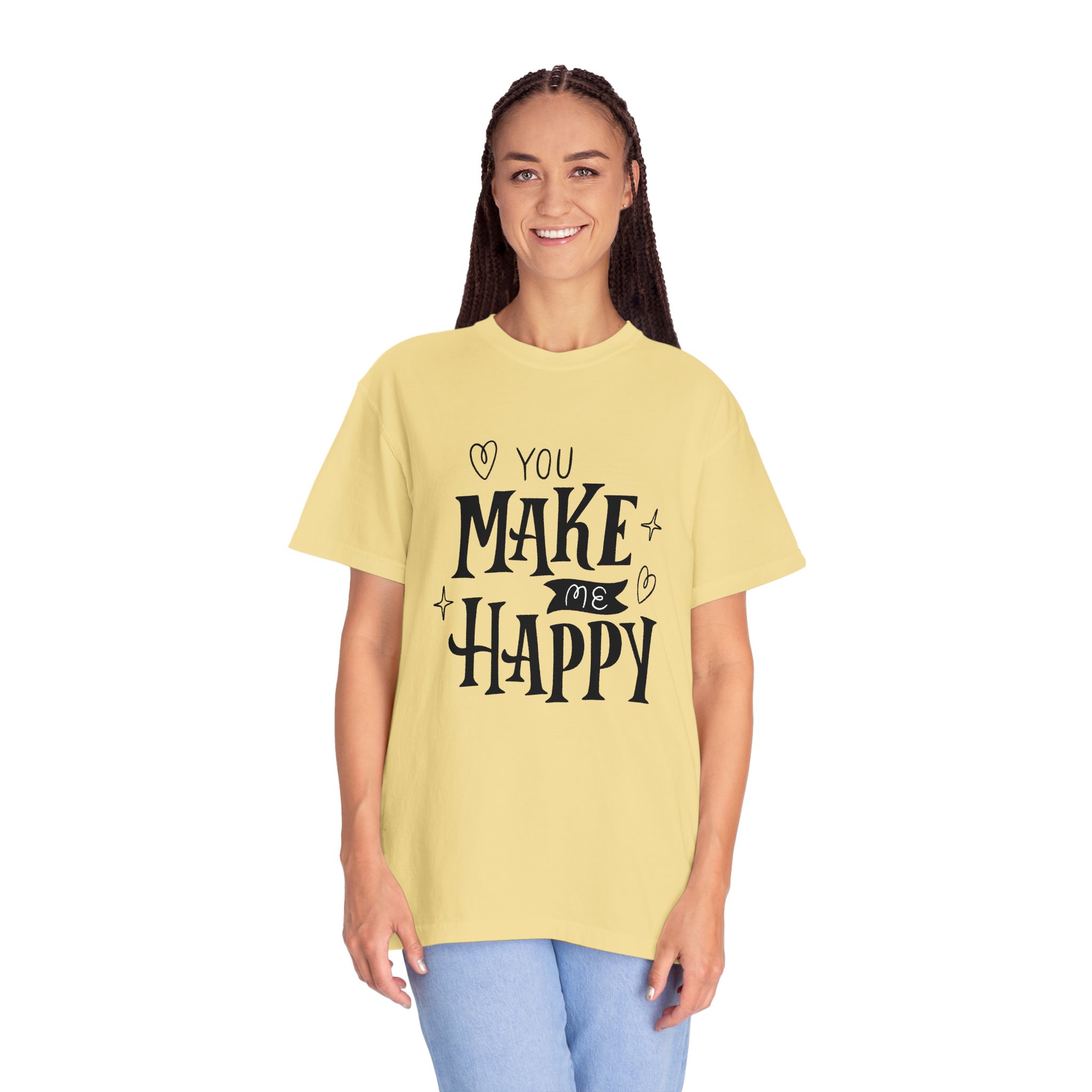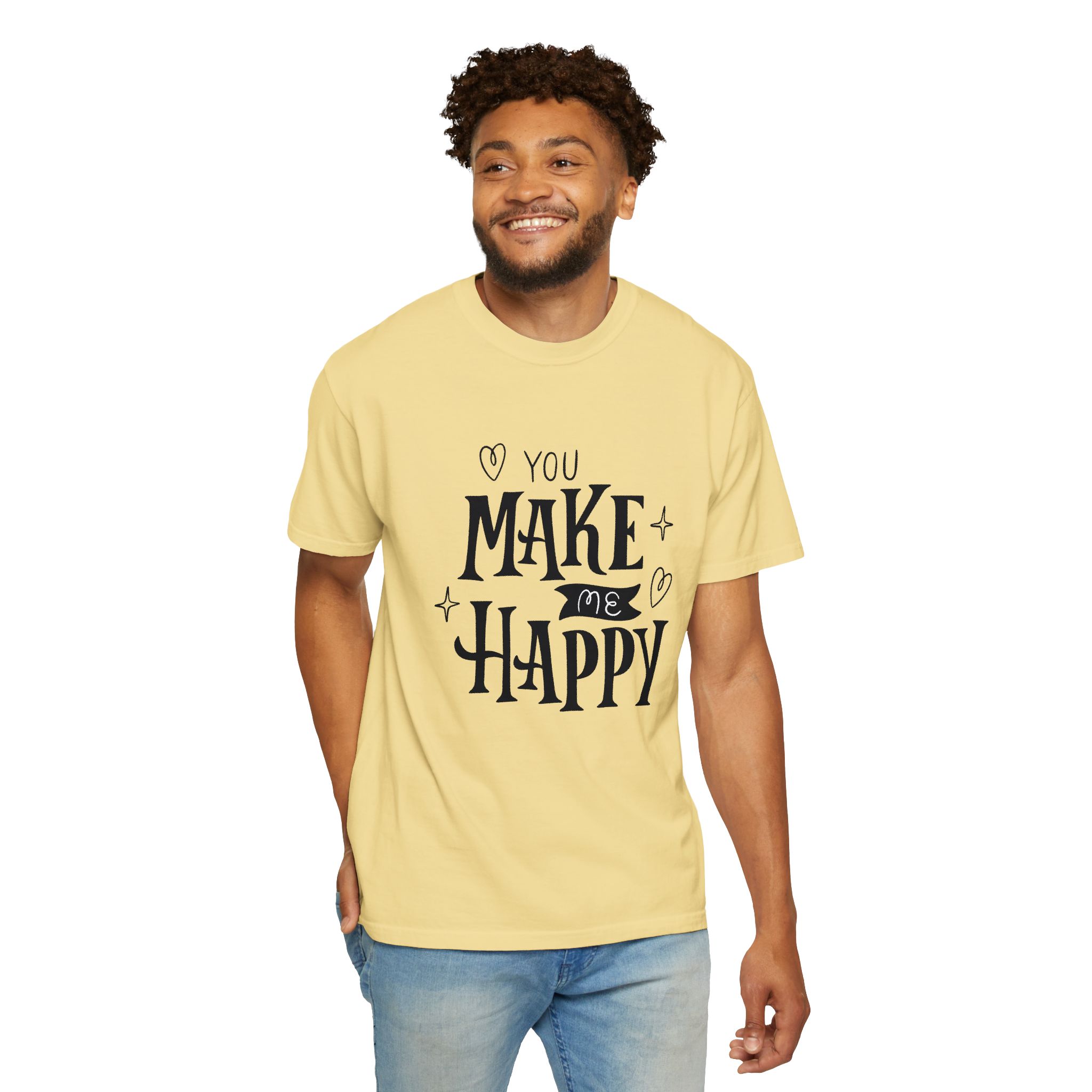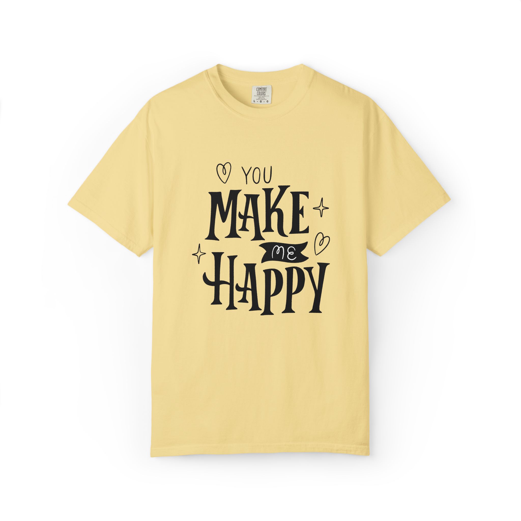 This unisex garment-dyed t-shirt radiates comfort and positivity. With its cheerful message that reads ‘You Make Me Happy’, it brings a light-hearted vibe to casual outings or cozy gatherings. Perfect for those who cherish joy and want to spread it around, this tee is ideal for anyone looking to uplift their wardrobe. It suits various occasions like birthdays, anniversaries, or simply as a thoughtful gift to loved ones. This t-shirt will easily become a staple in your everyday attire, providing both comfort and style while promoting happiness wherever you go!