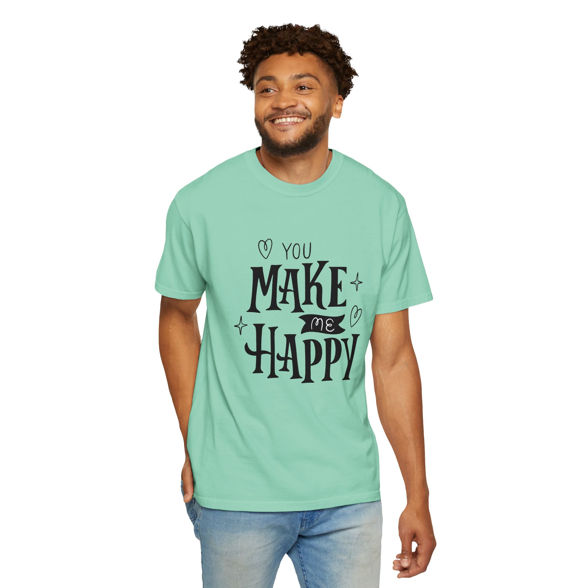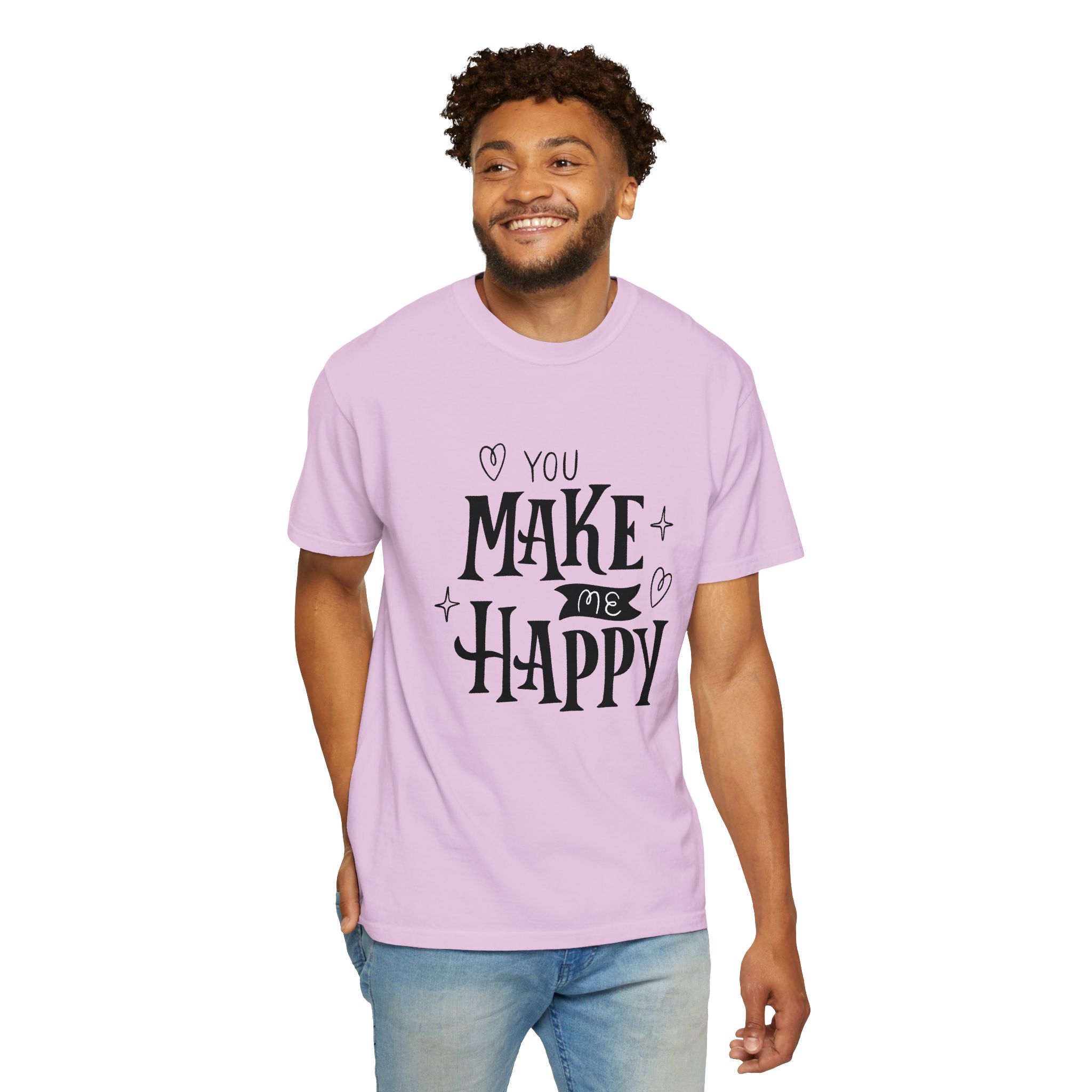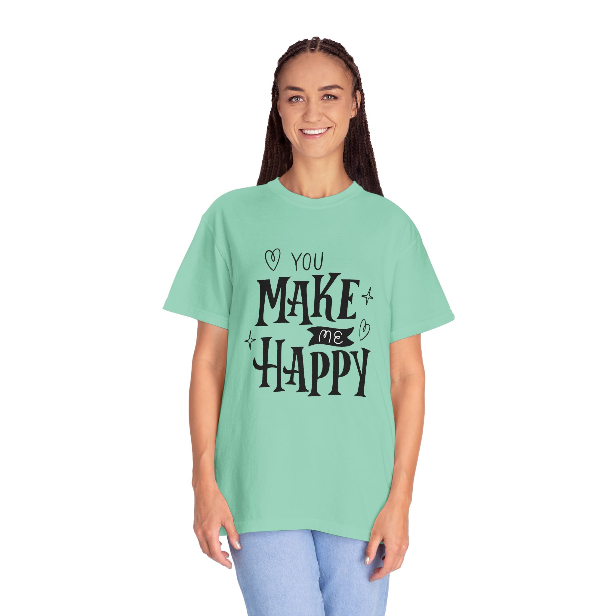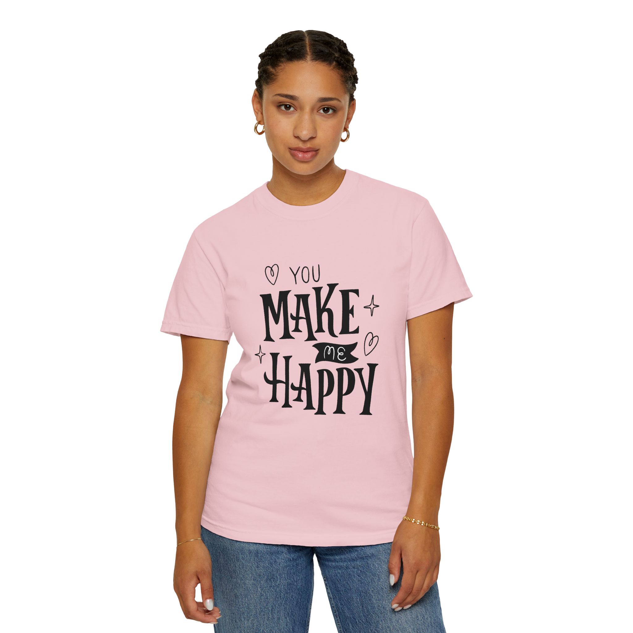 This unisex garment-dyed t-shirt radiates comfort and positivity. With its cheerful message that reads ‘You Make Me Happy’, it brings a light-hearted vibe to casual outings or cozy gatherings. Perfect for those who cherish joy and want to spread it around, this tee is ideal for anyone looking to uplift their wardrobe. It suits various occasions like birthdays, anniversaries, or simply as a thoughtful gift to loved ones. This t-shirt will easily become a staple in your everyday attire, providing both comfort and style while promoting happiness wherever you go!