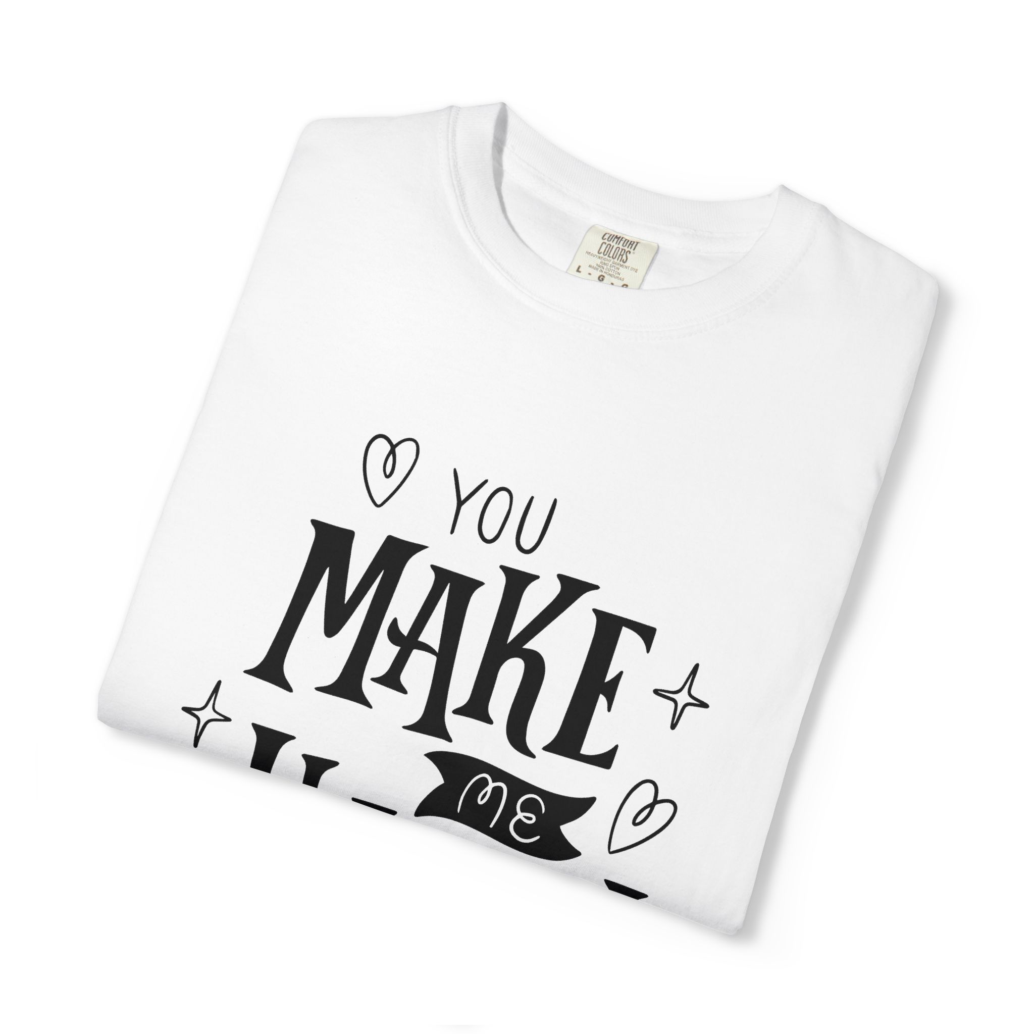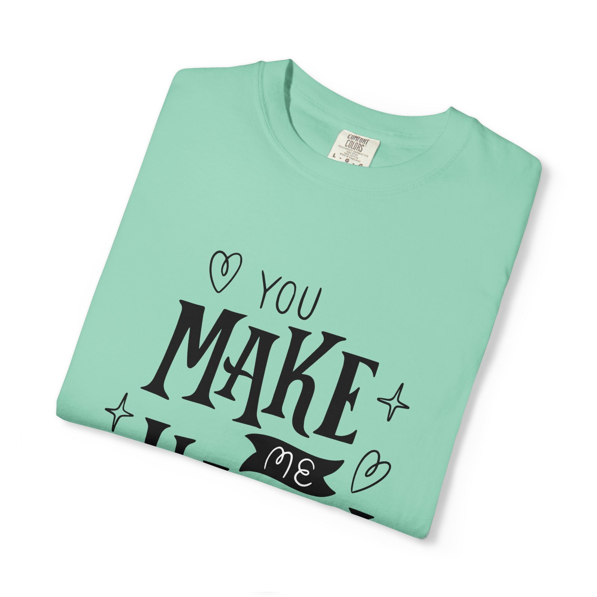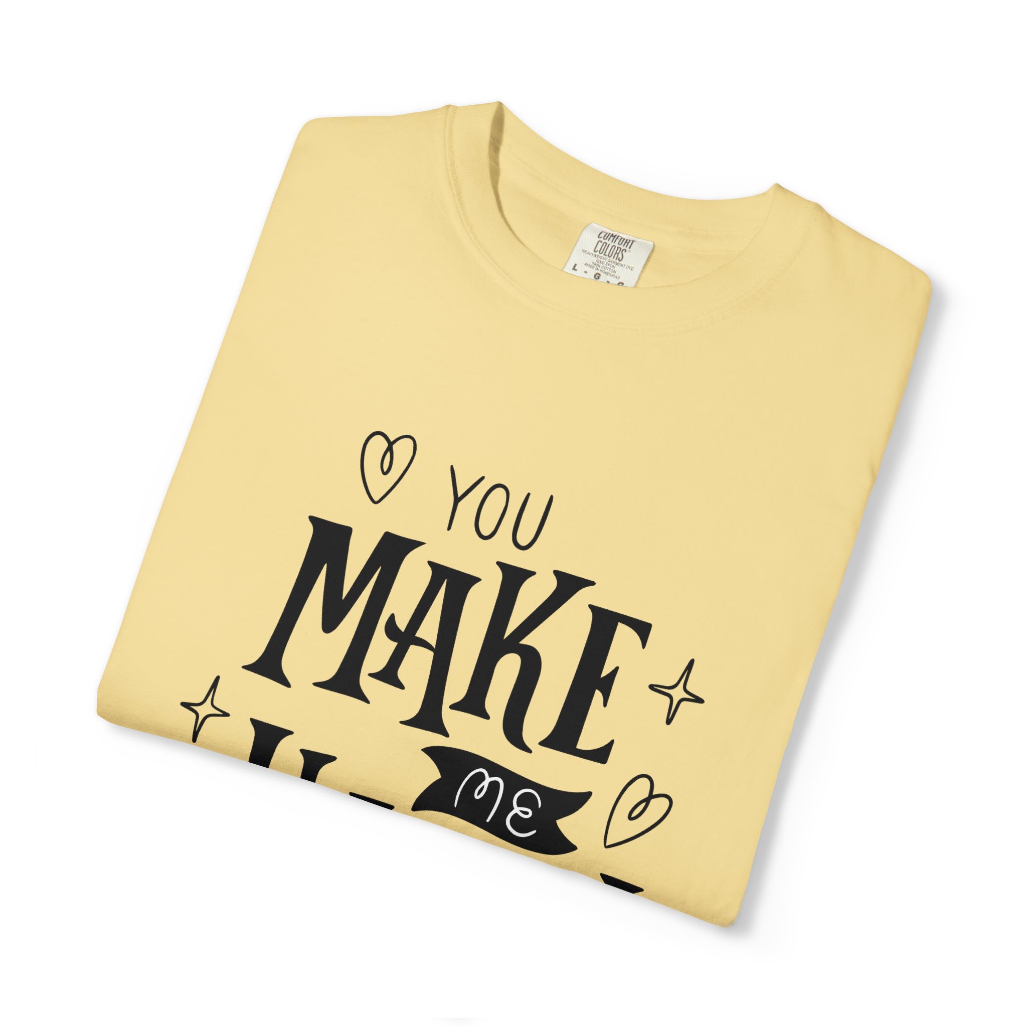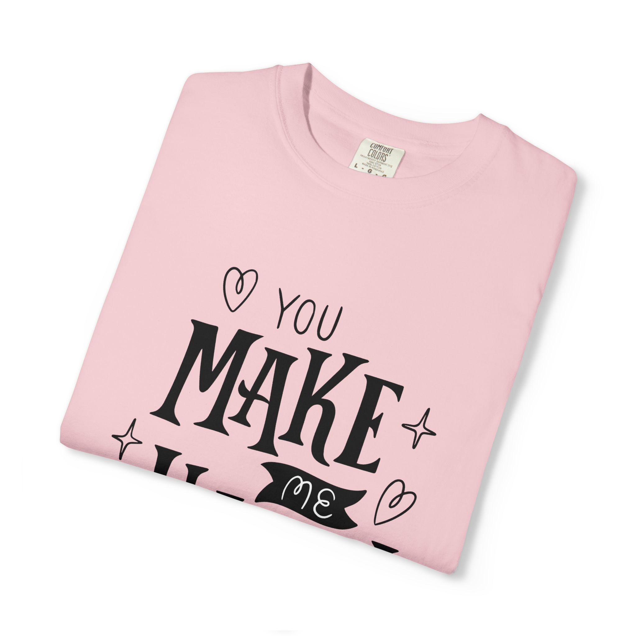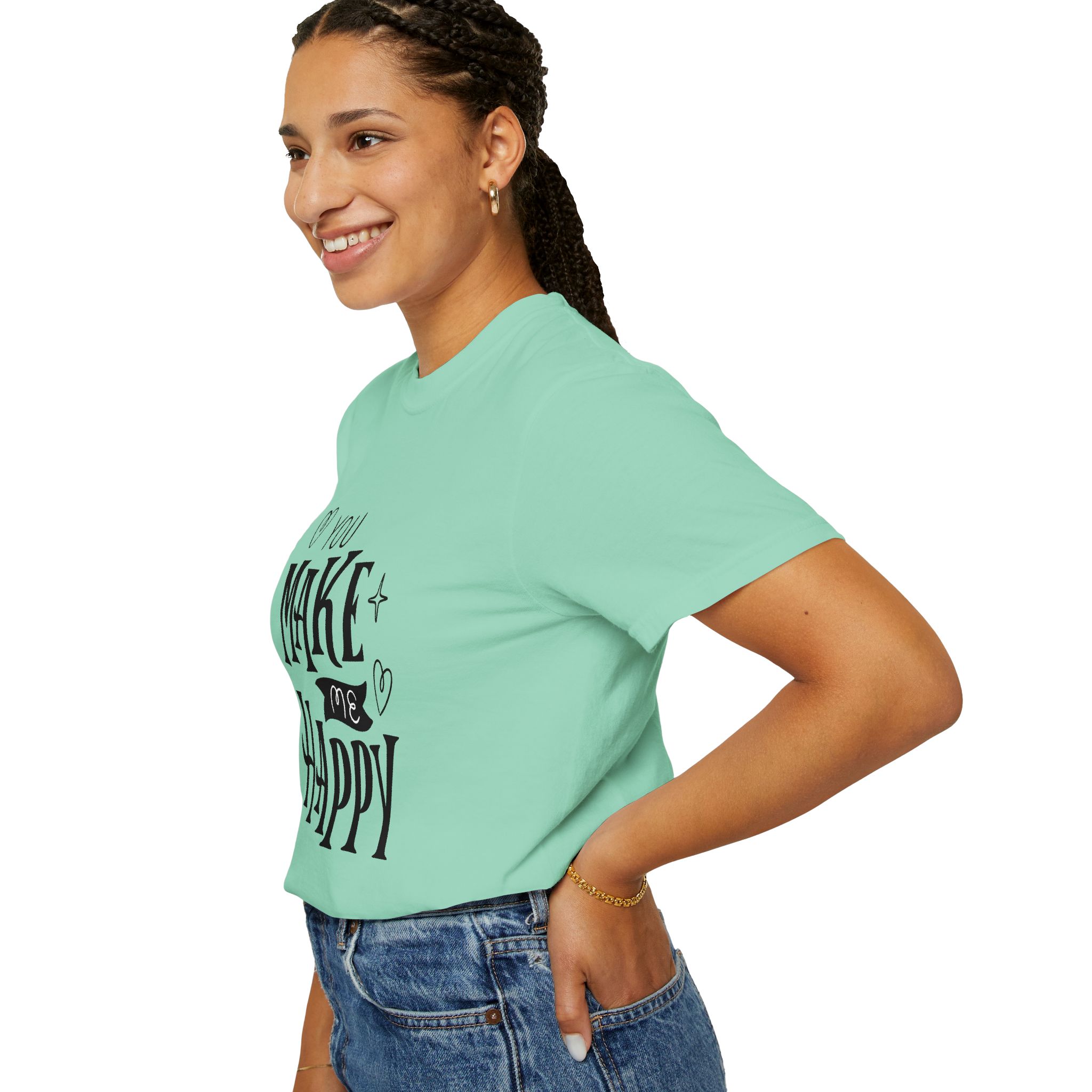 This unisex garment-dyed t-shirt radiates comfort and positivity. With its cheerful message that reads ‘You Make Me Happy’, it brings a light-hearted vibe to casual outings or cozy gatherings. Perfect for those who cherish joy and want to spread it around, this tee is ideal for anyone looking to uplift their wardrobe. It suits various occasions like birthdays, anniversaries, or simply as a thoughtful gift to loved ones. This t-shirt will easily become a staple in your everyday attire, providing both comfort and style while promoting happiness wherever you go!