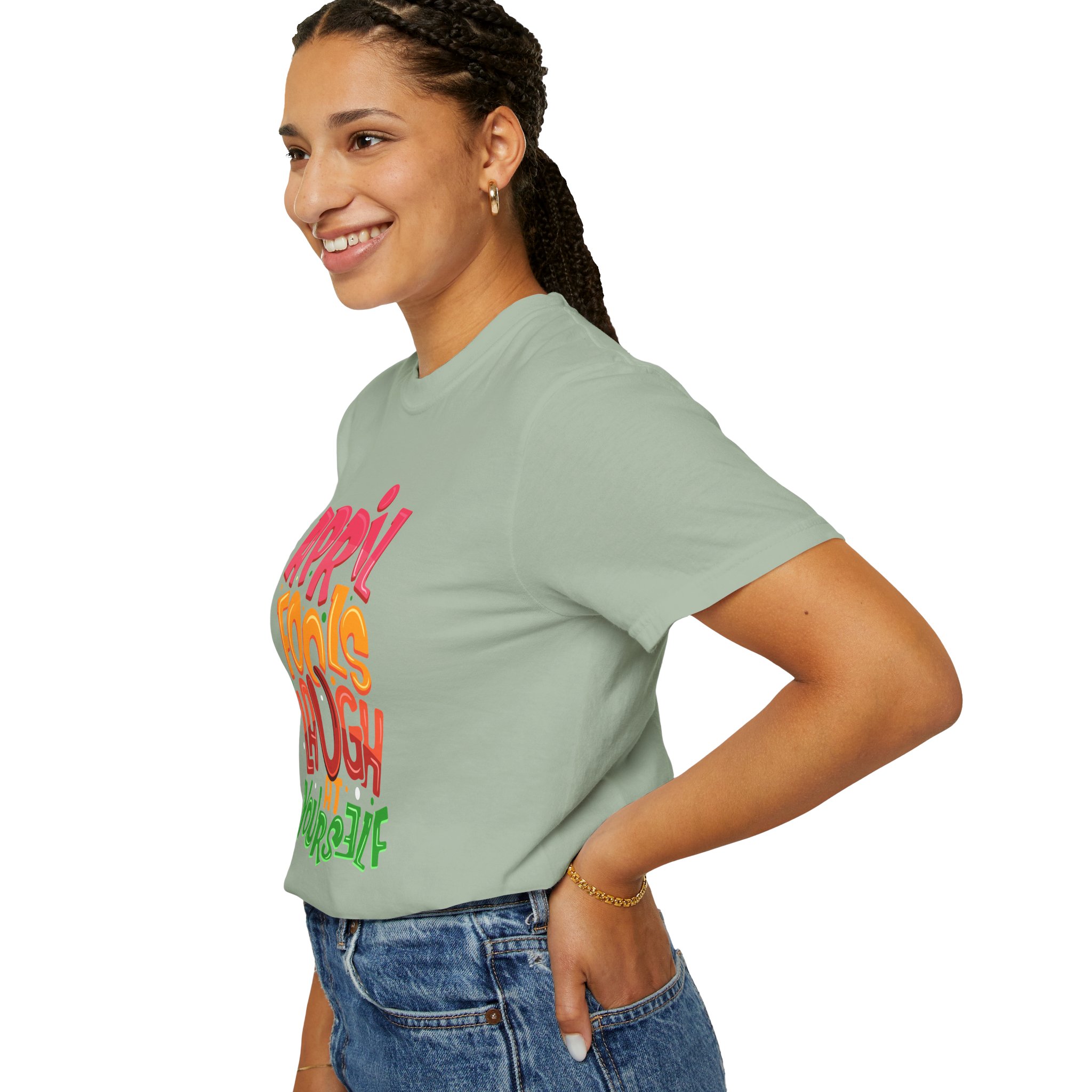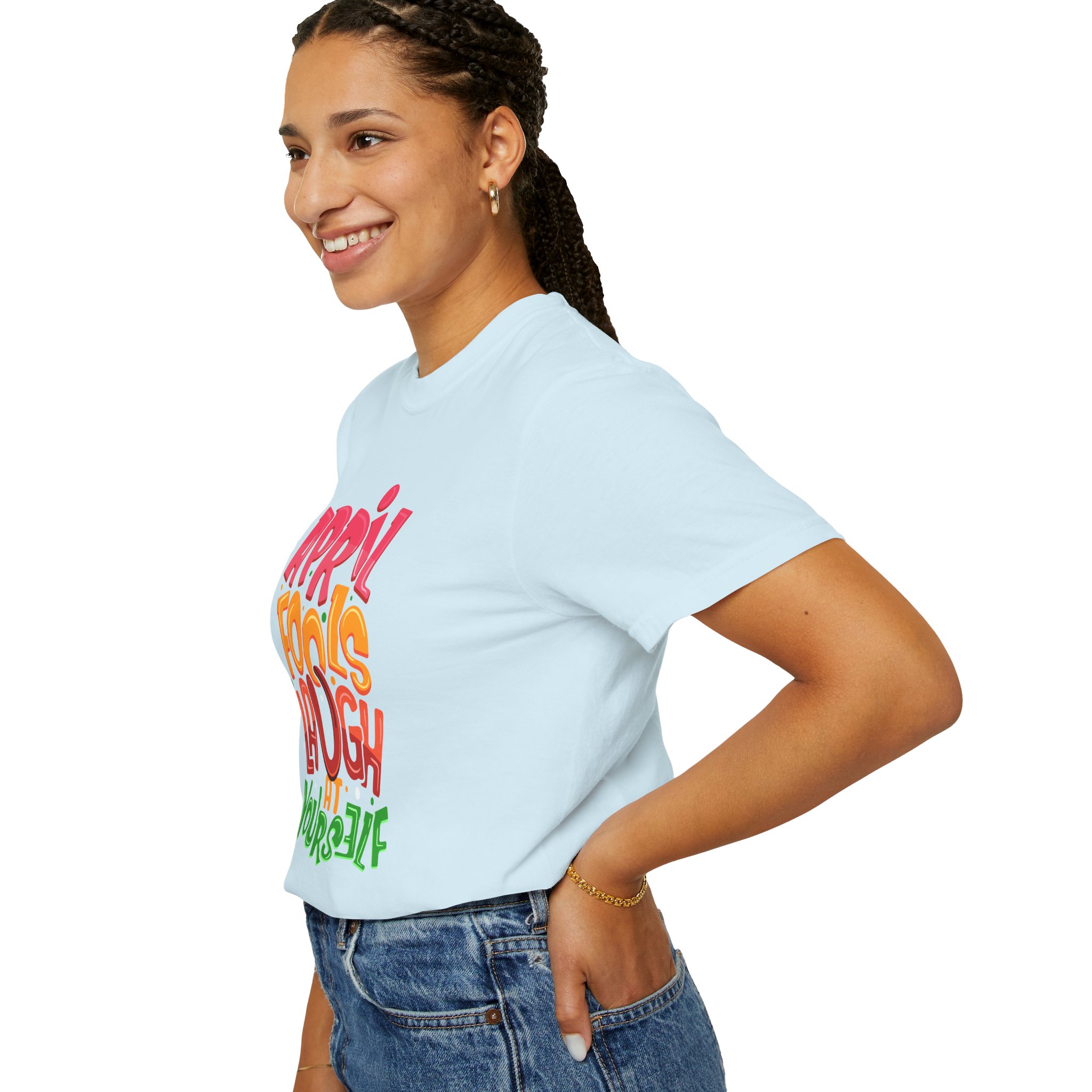 This relaxed, garment-dyed tee brings playful color and laid-back comfort together. The bright, hand-lettered graphic reads “APRIL FOOLS LAUGH AT YOURSELF” in cheerful pink, orange and green—fun, tongue-in-cheek, and a little mischievous. The heavyweight, ring-spun cotton feels substantial yet soft thanks to the post-construction dyeing process that gives the fabric a lived-in texture and slightly muted tones. A roomy, relaxed fit and tubular knit body create an easy silhouette that layers well over long sleeves or stands alone with jeans for an offbeat, casual look. Wear it to lighthearted gatherings, April Fool’s antics, or anytime you want to spark smiles and start conversations without trying too hard.