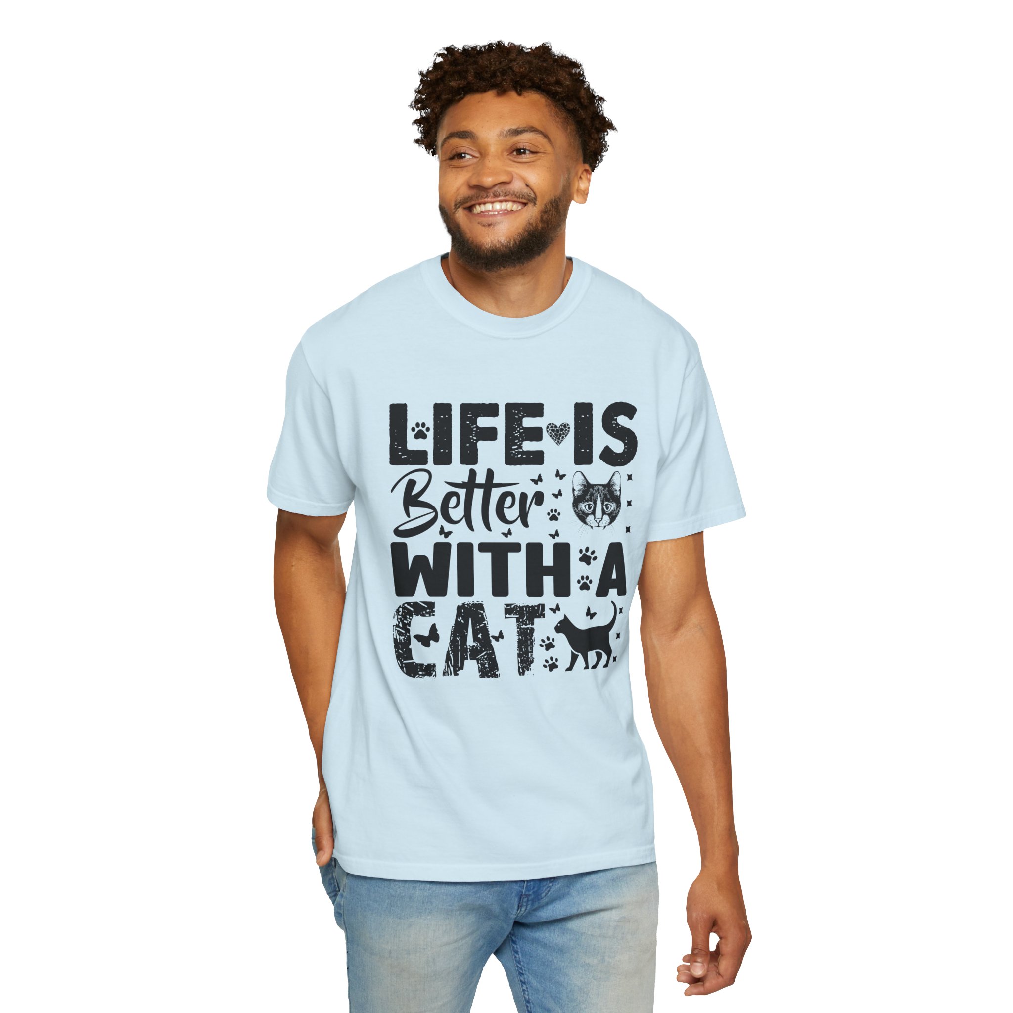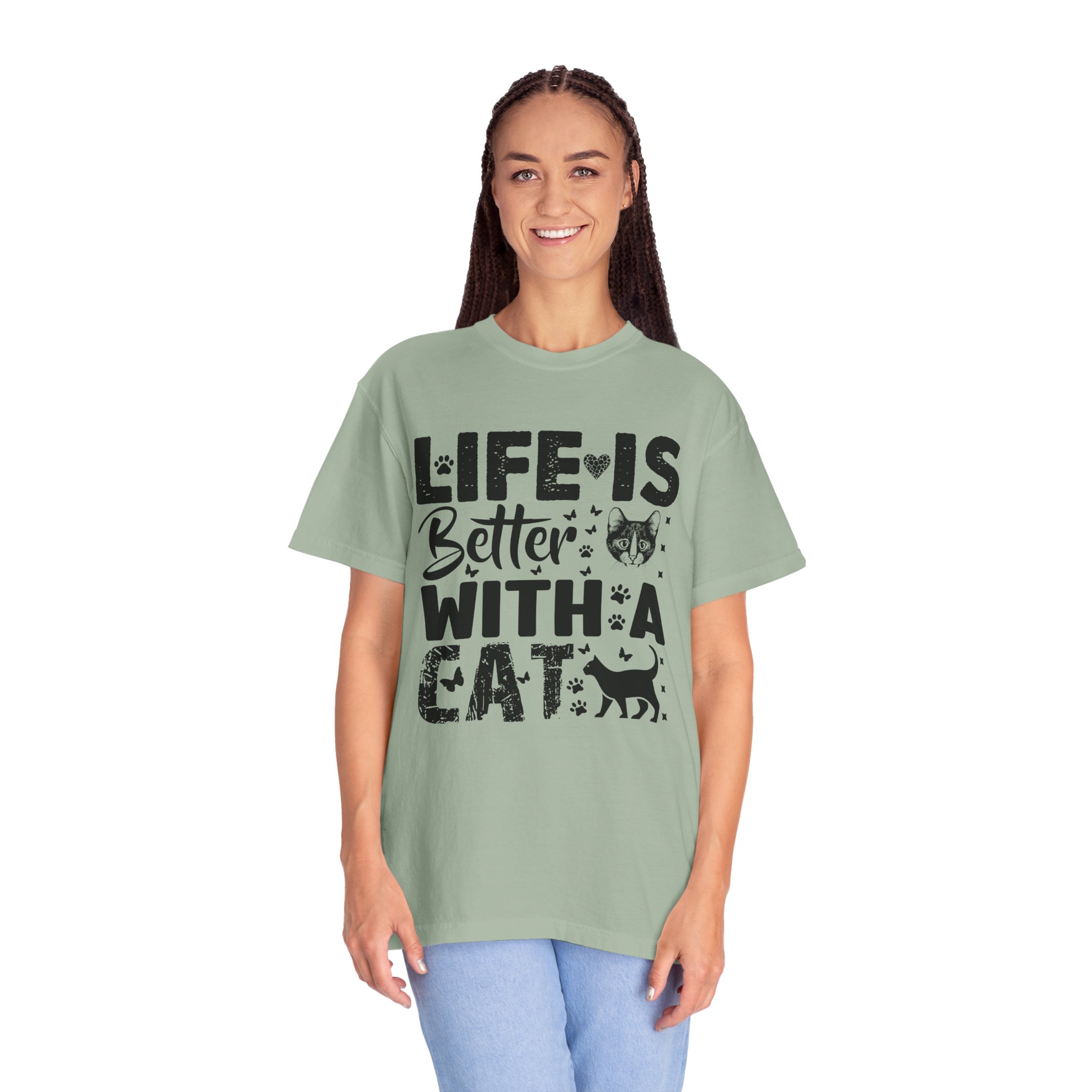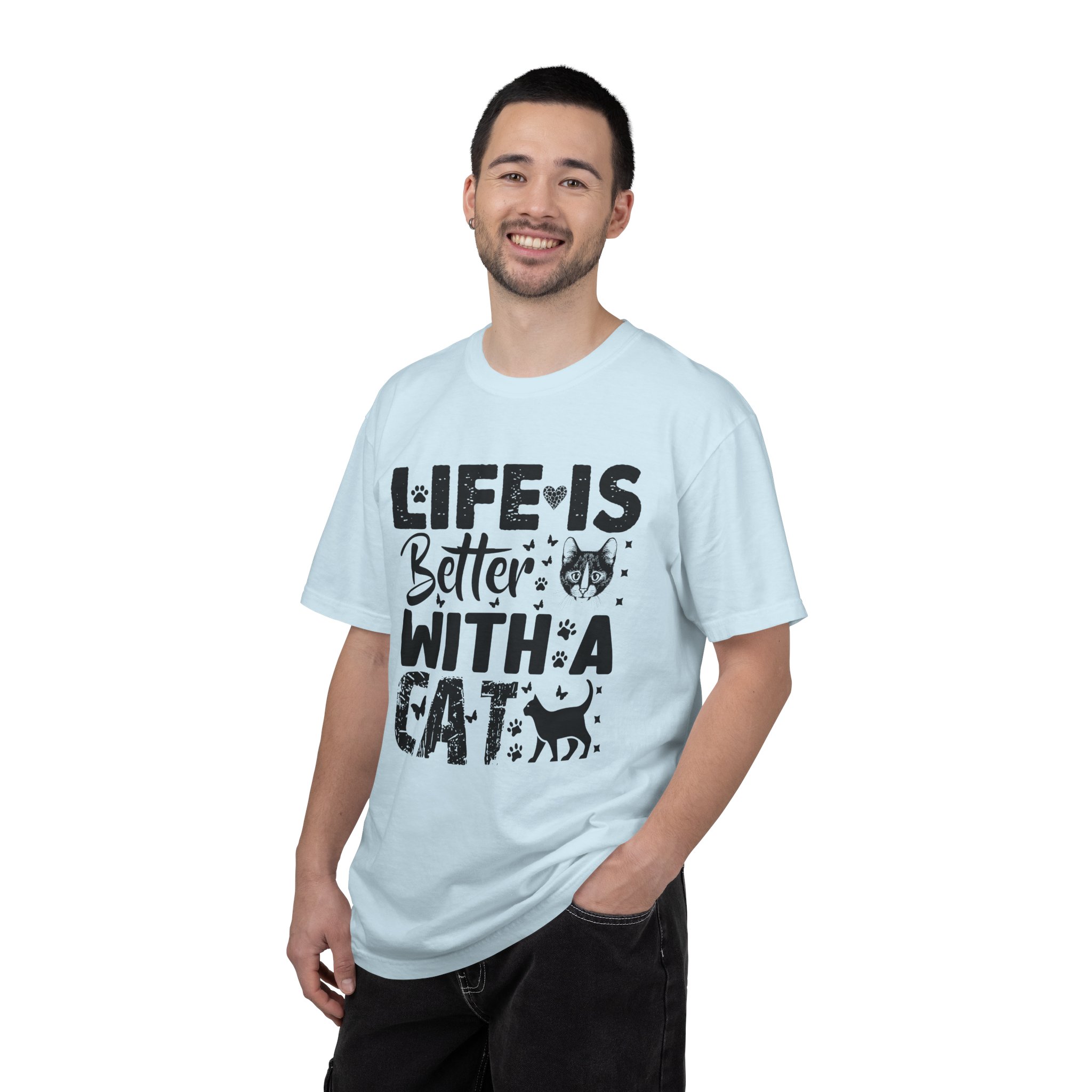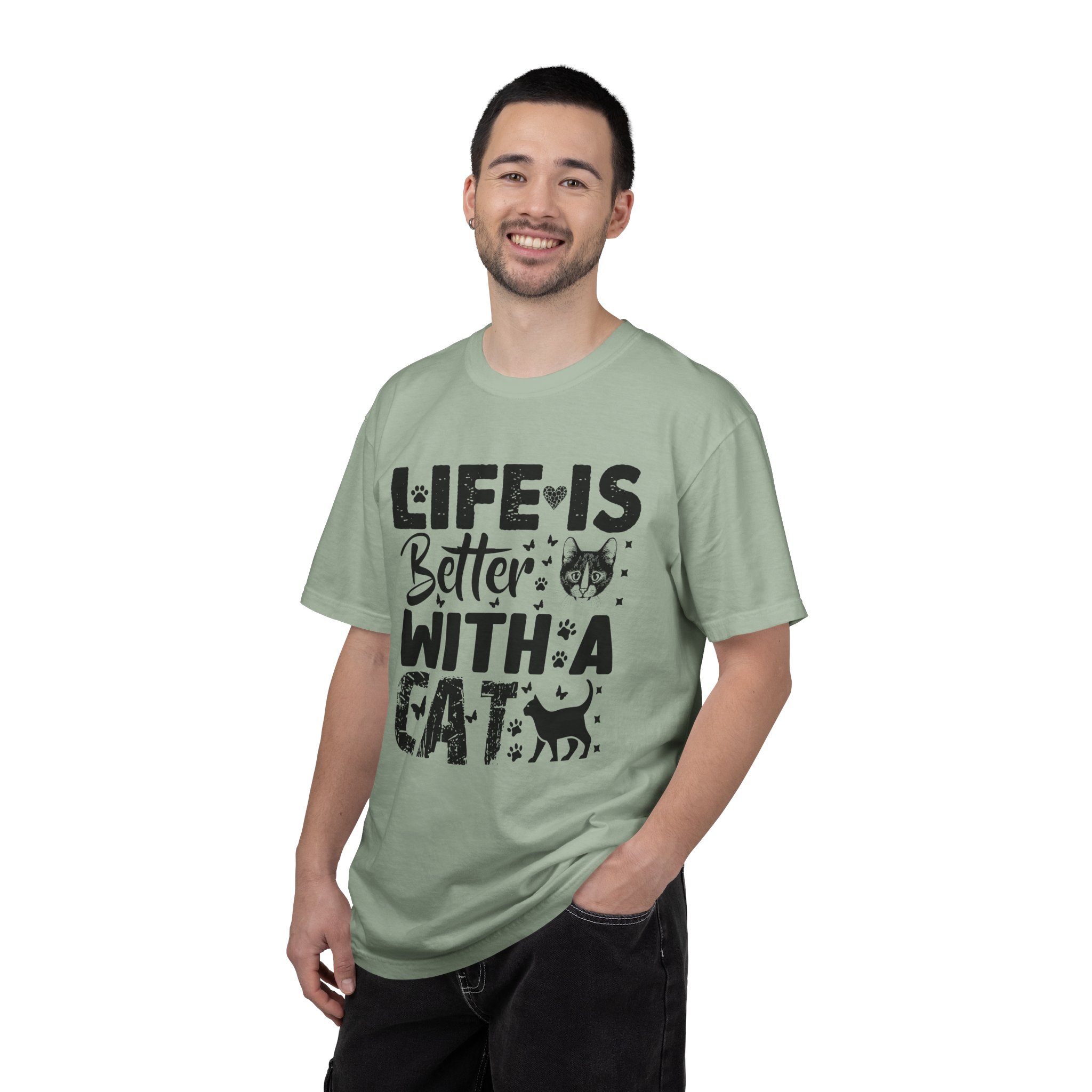 This relaxed-fit garment-dyed tee carries a simple, warm message for cat lovers: “Life is better with a cat.” The soft, heavy-weight cotton drapes comfortably and feels lived-in from the first wear thanks to post-construction dyeing. The distressed graphic and small cat silhouette give it a cozy, slightly vintage look that works tucked into jeans or worn with lounge pants for quiet mornings with a purring companion. Made to last, the double-needle seams and tubular knit keep the silhouette clean and reduce bulk at the sides — a subtle, durable piece that becomes part of everyday routines and slow, cat-centered moments.