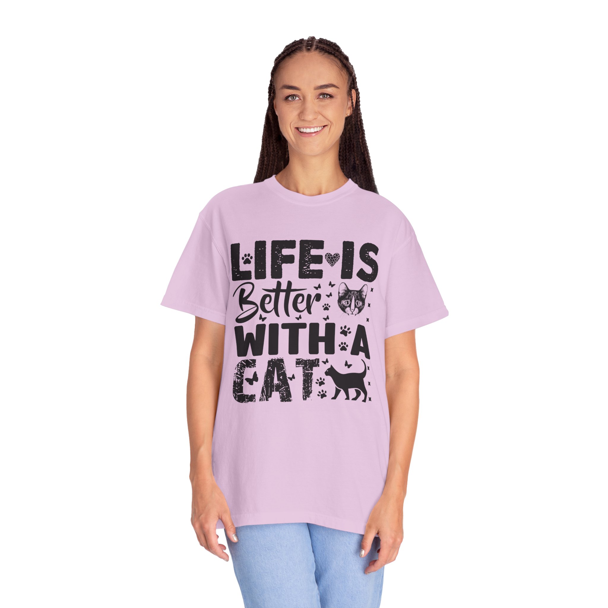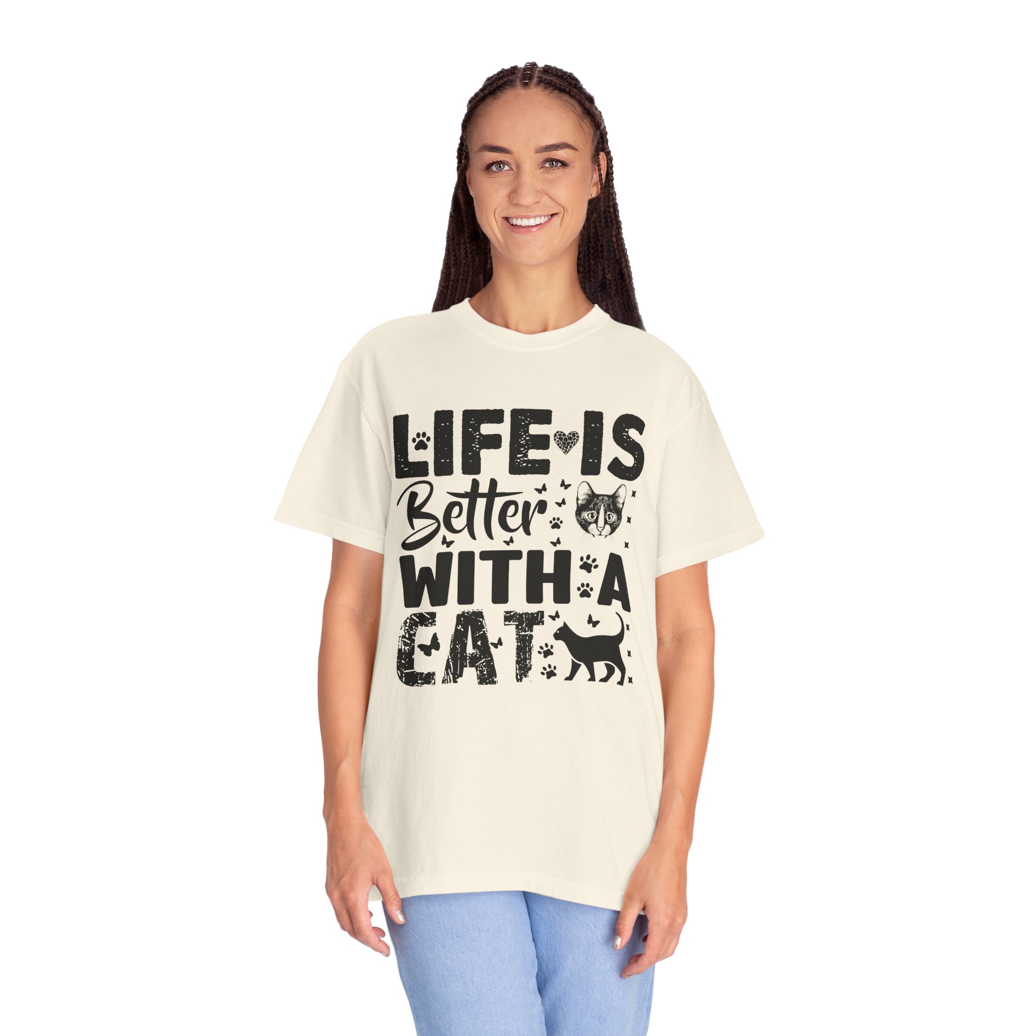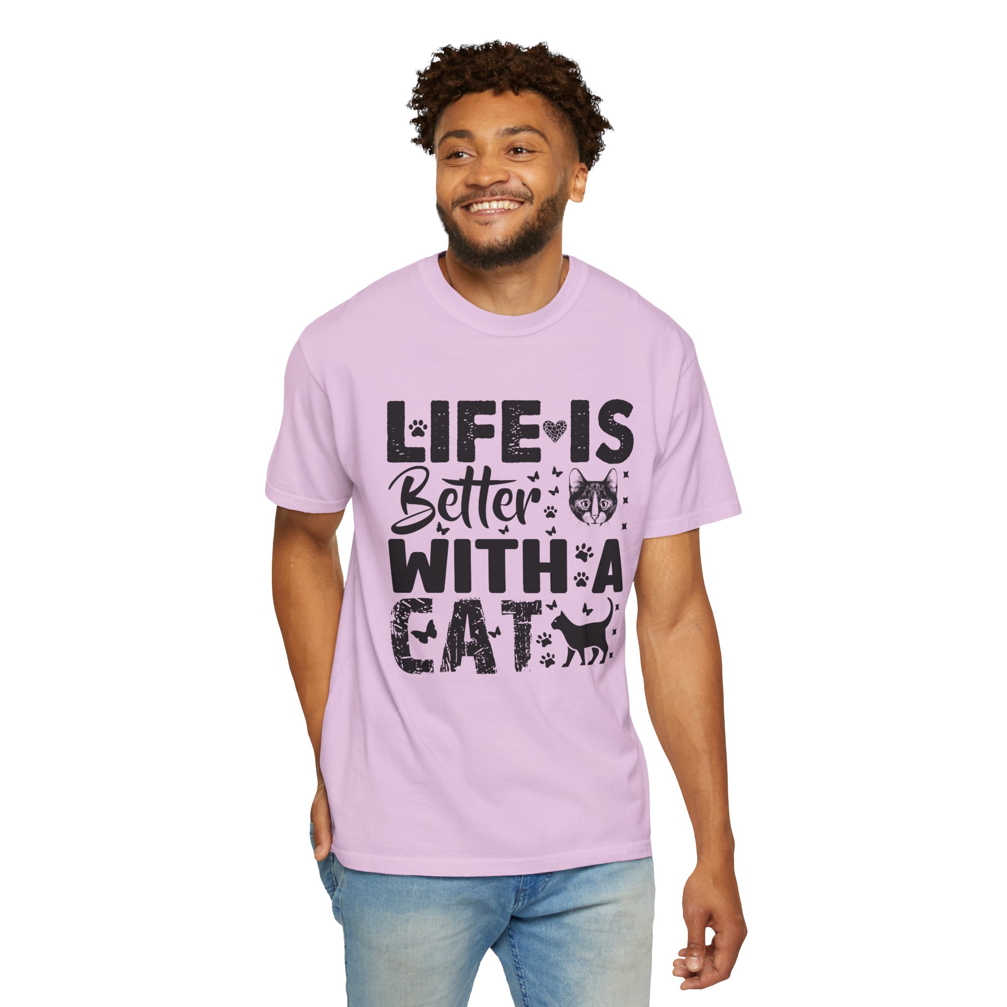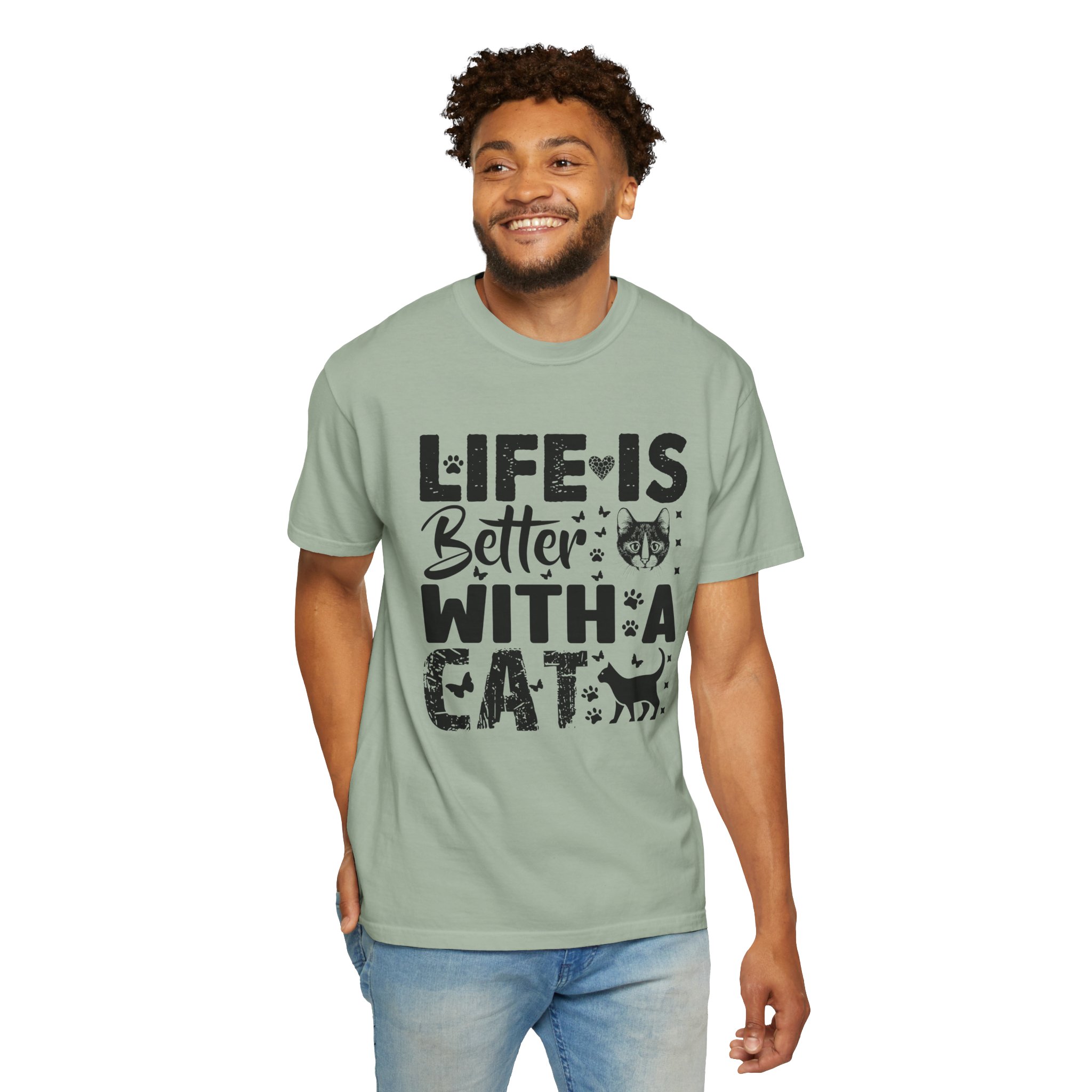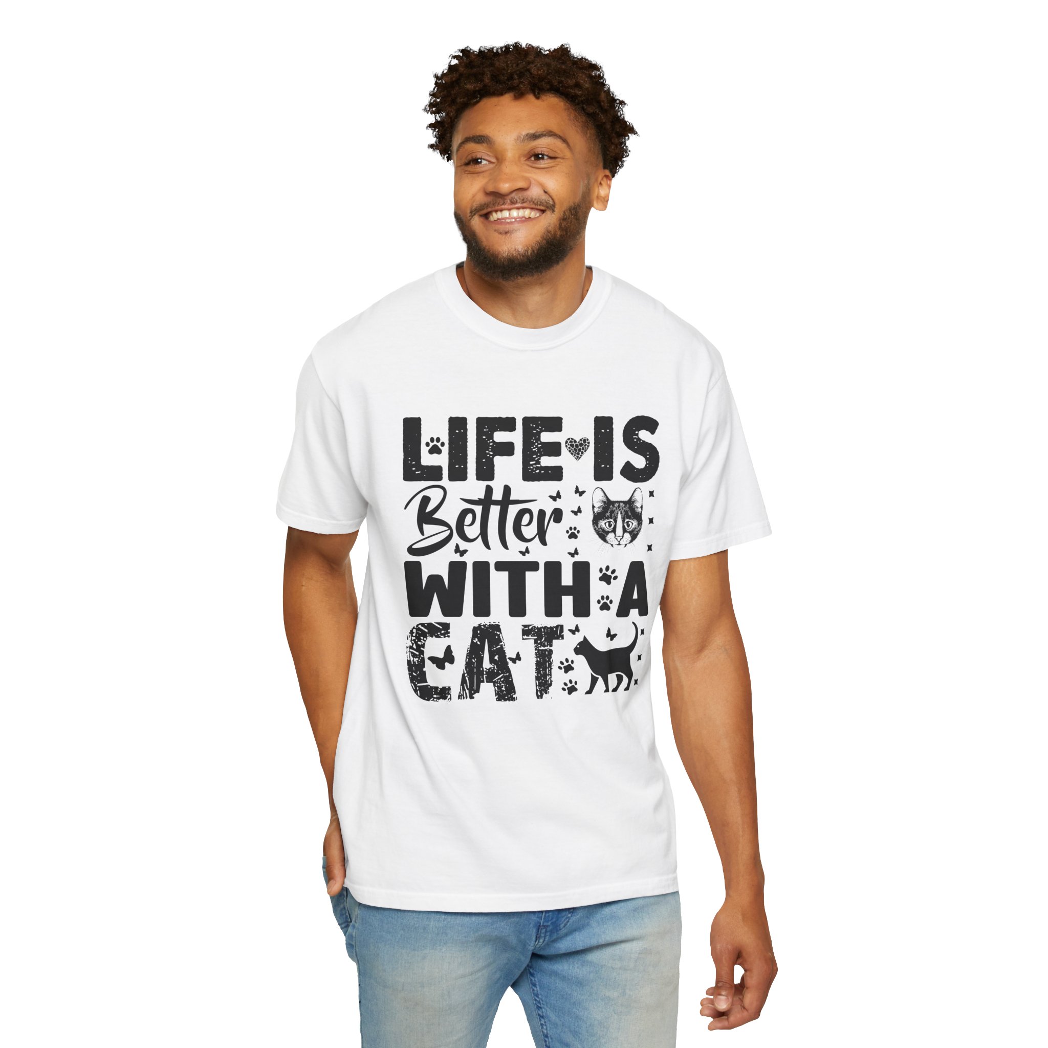 This relaxed-fit garment-dyed tee carries a simple, warm message for cat lovers: “Life is better with a cat.” The soft, heavy-weight cotton drapes comfortably and feels lived-in from the first wear thanks to post-construction dyeing. The distressed graphic and small cat silhouette give it a cozy, slightly vintage look that works tucked into jeans or worn with lounge pants for quiet mornings with a purring companion. Made to last, the double-needle seams and tubular knit keep the silhouette clean and reduce bulk at the sides — a subtle, durable piece that becomes part of everyday routines and slow, cat-centered moments.