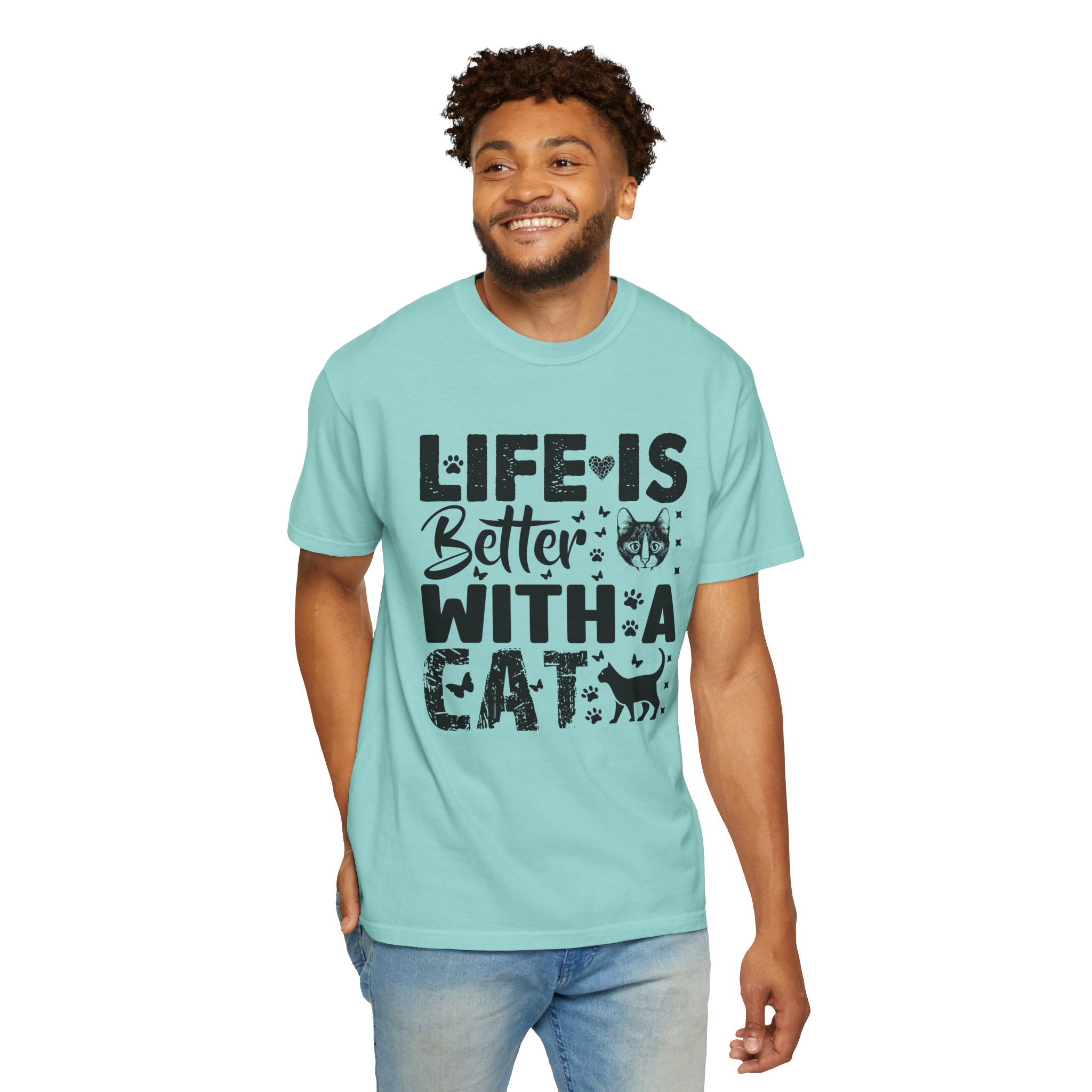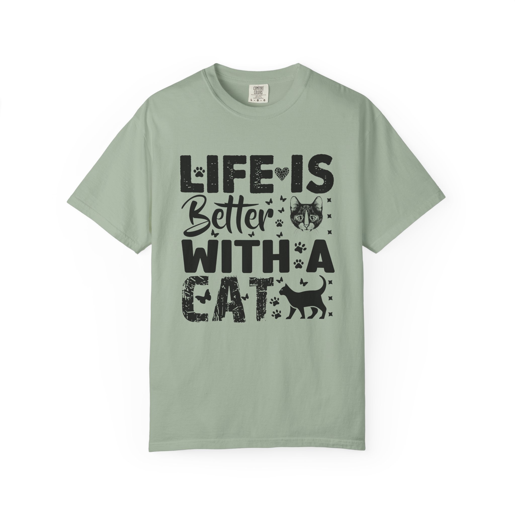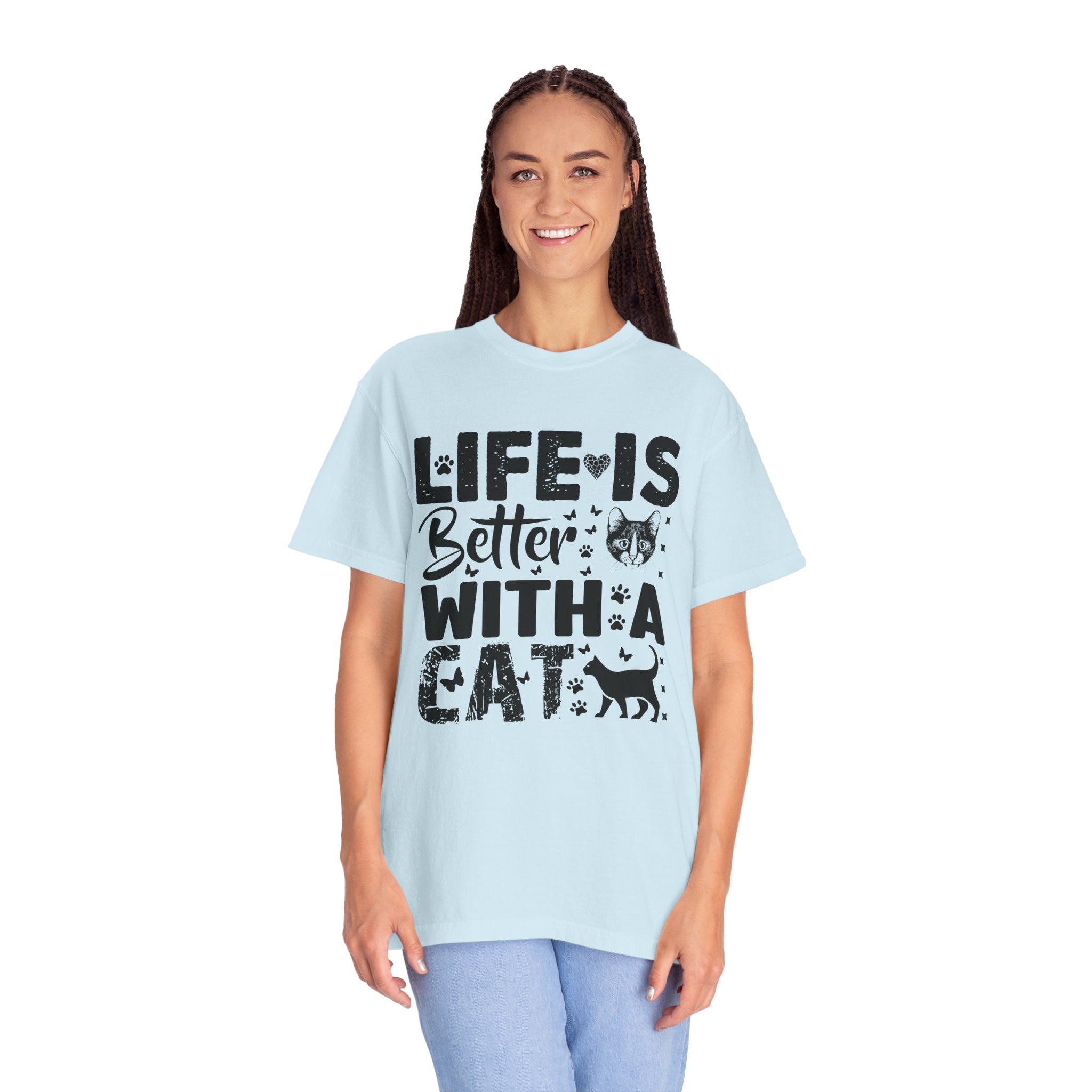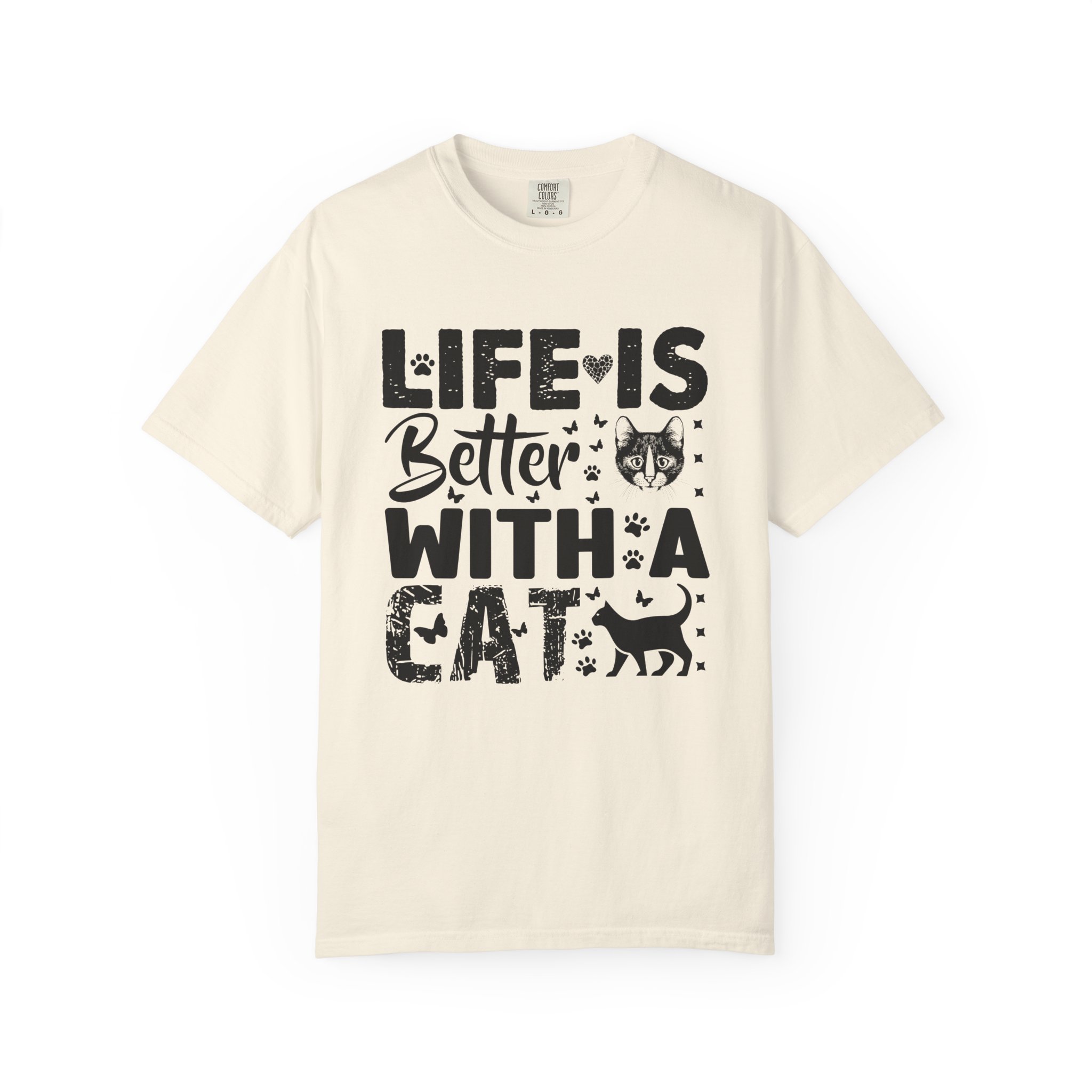 This relaxed-fit garment-dyed tee carries a simple, warm message for cat lovers: “Life is better with a cat.” The soft, heavy-weight cotton drapes comfortably and feels lived-in from the first wear thanks to post-construction dyeing. The distressed graphic and small cat silhouette give it a cozy, slightly vintage look that works tucked into jeans or worn with lounge pants for quiet mornings with a purring companion. Made to last, the double-needle seams and tubular knit keep the silhouette clean and reduce bulk at the sides — a subtle, durable piece that becomes part of everyday routines and slow, cat-centered moments.
