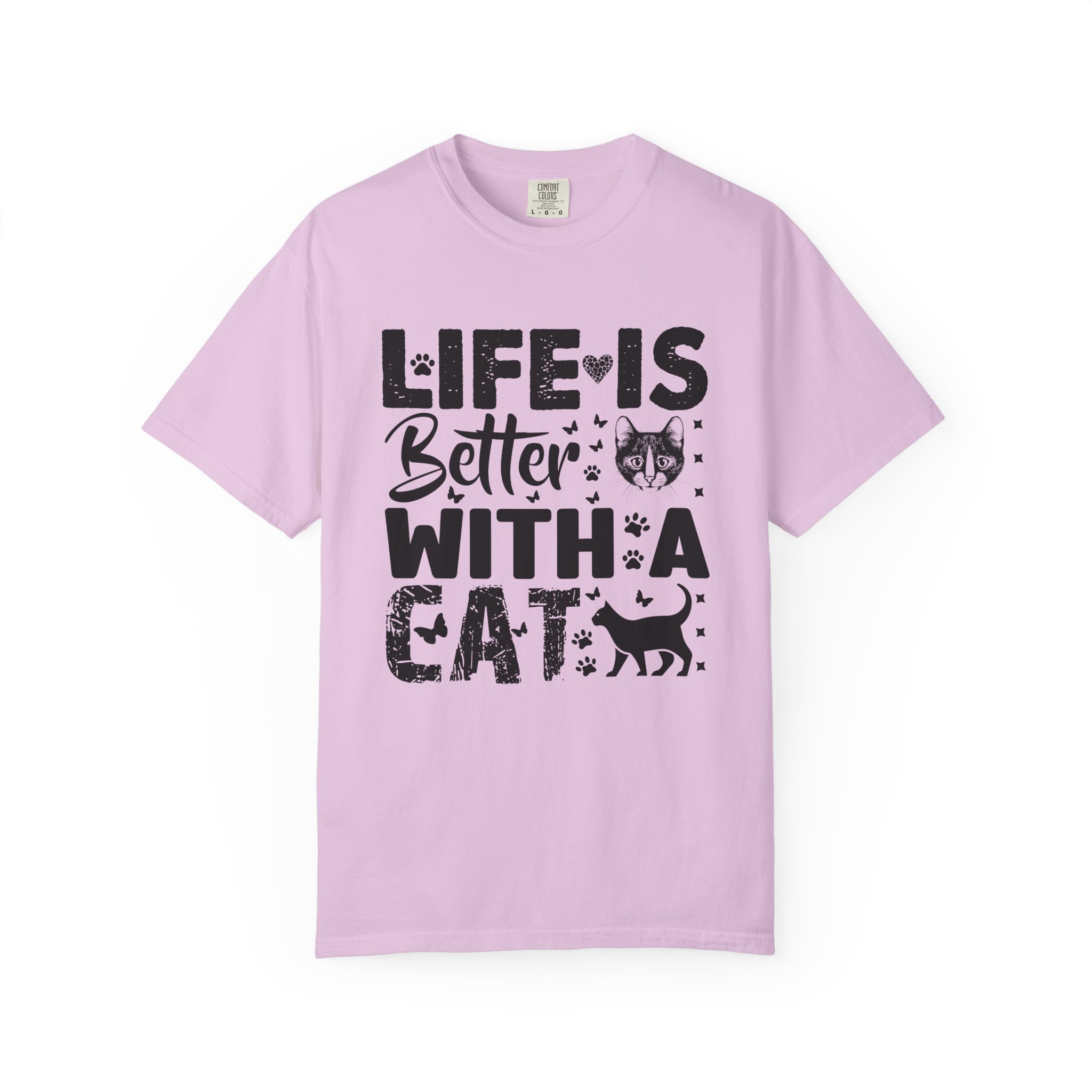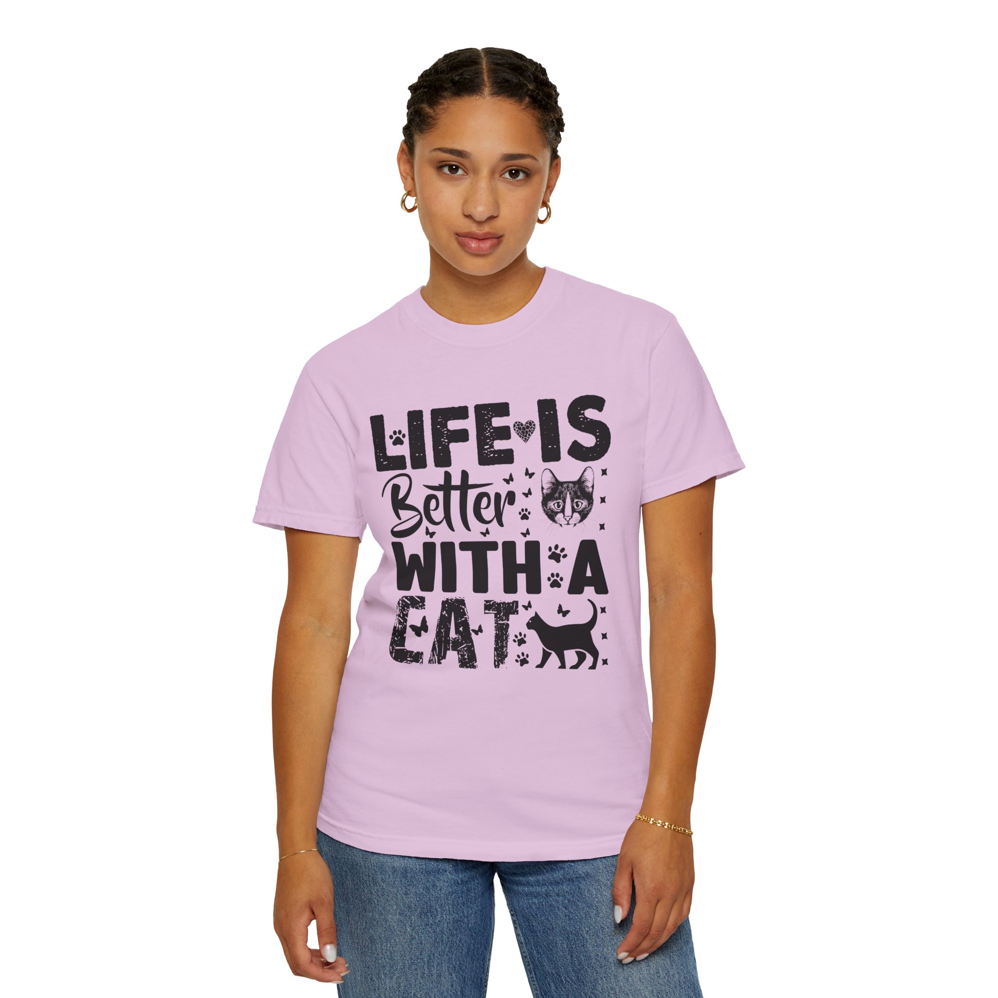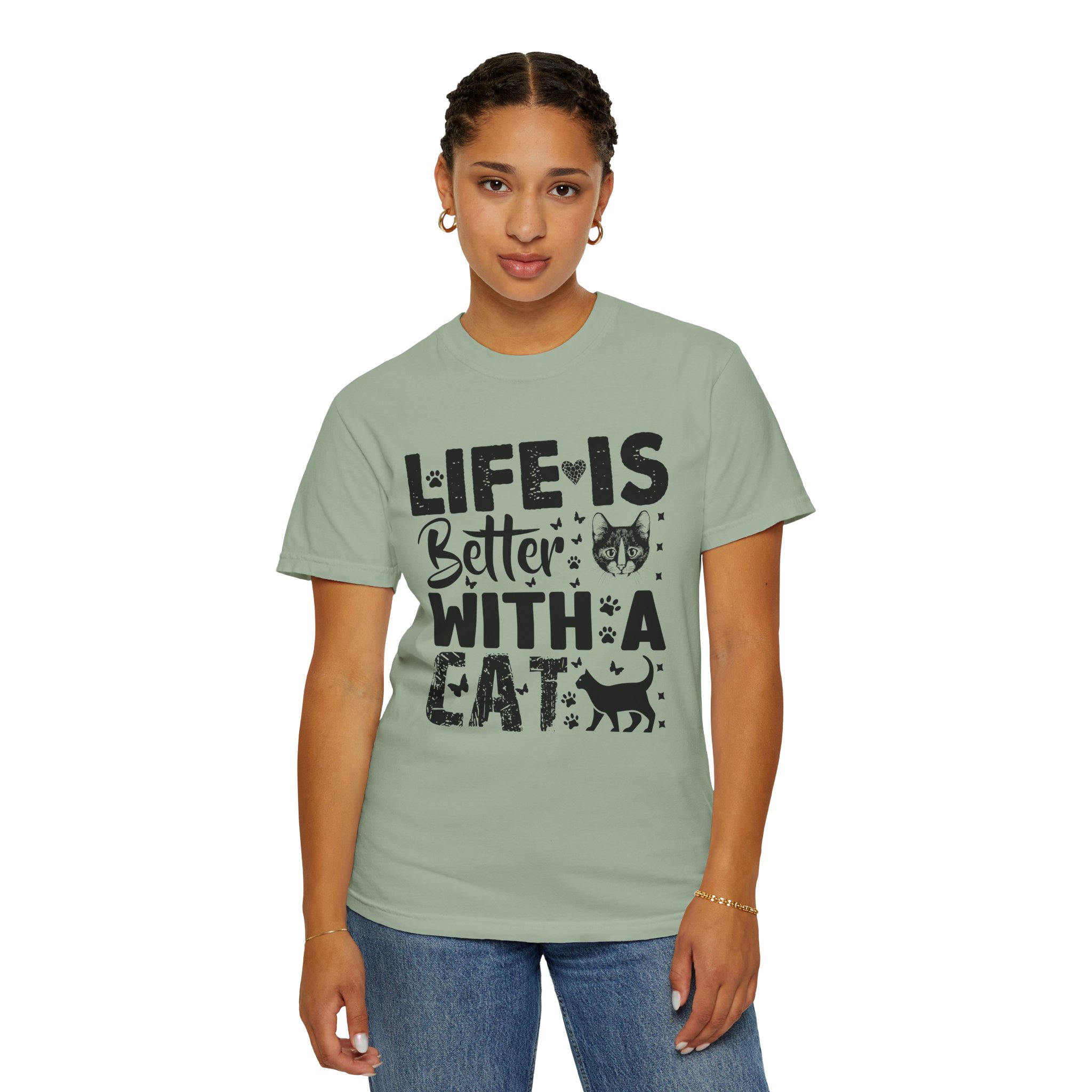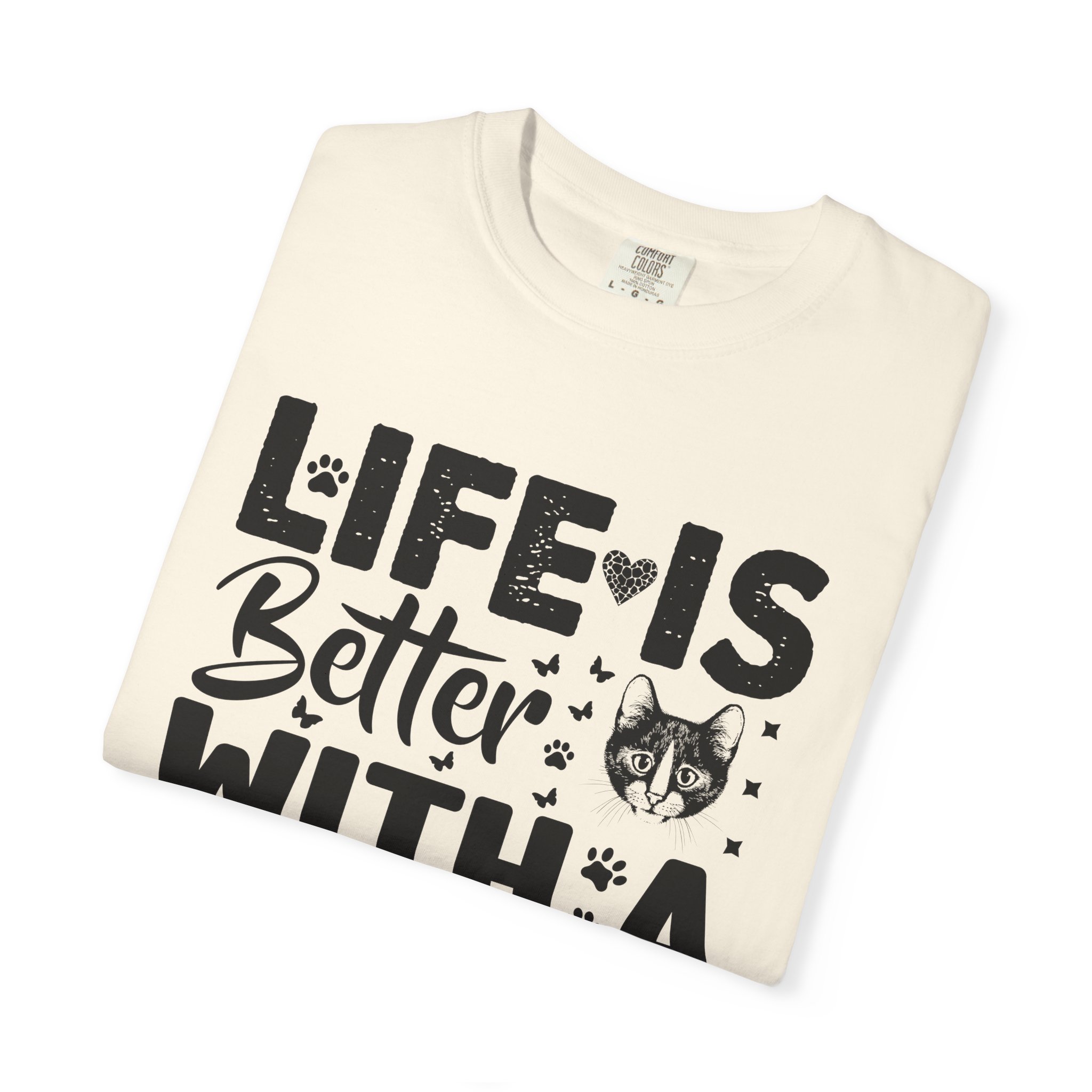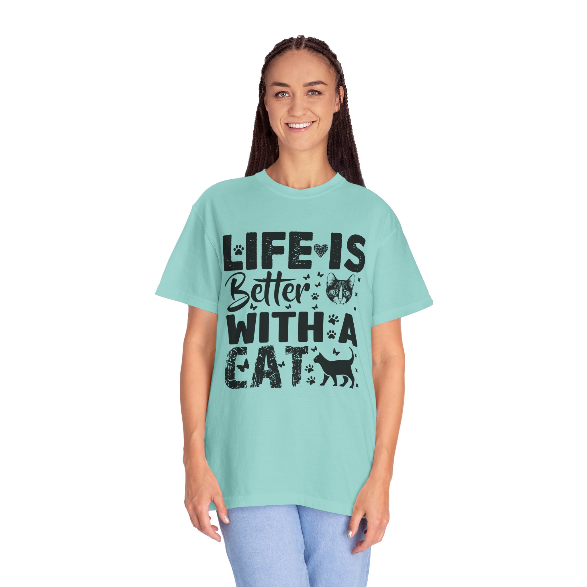 This relaxed-fit garment-dyed tee carries a simple, warm message for cat lovers: “Life is better with a cat.” The soft, heavy-weight cotton drapes comfortably and feels lived-in from the first wear thanks to post-construction dyeing. The distressed graphic and small cat silhouette give it a cozy, slightly vintage look that works tucked into jeans or worn with lounge pants for quiet mornings with a purring companion. Made to last, the double-needle seams and tubular knit keep the silhouette clean and reduce bulk at the sides — a subtle, durable piece that becomes part of everyday routines and slow, cat-centered moments.