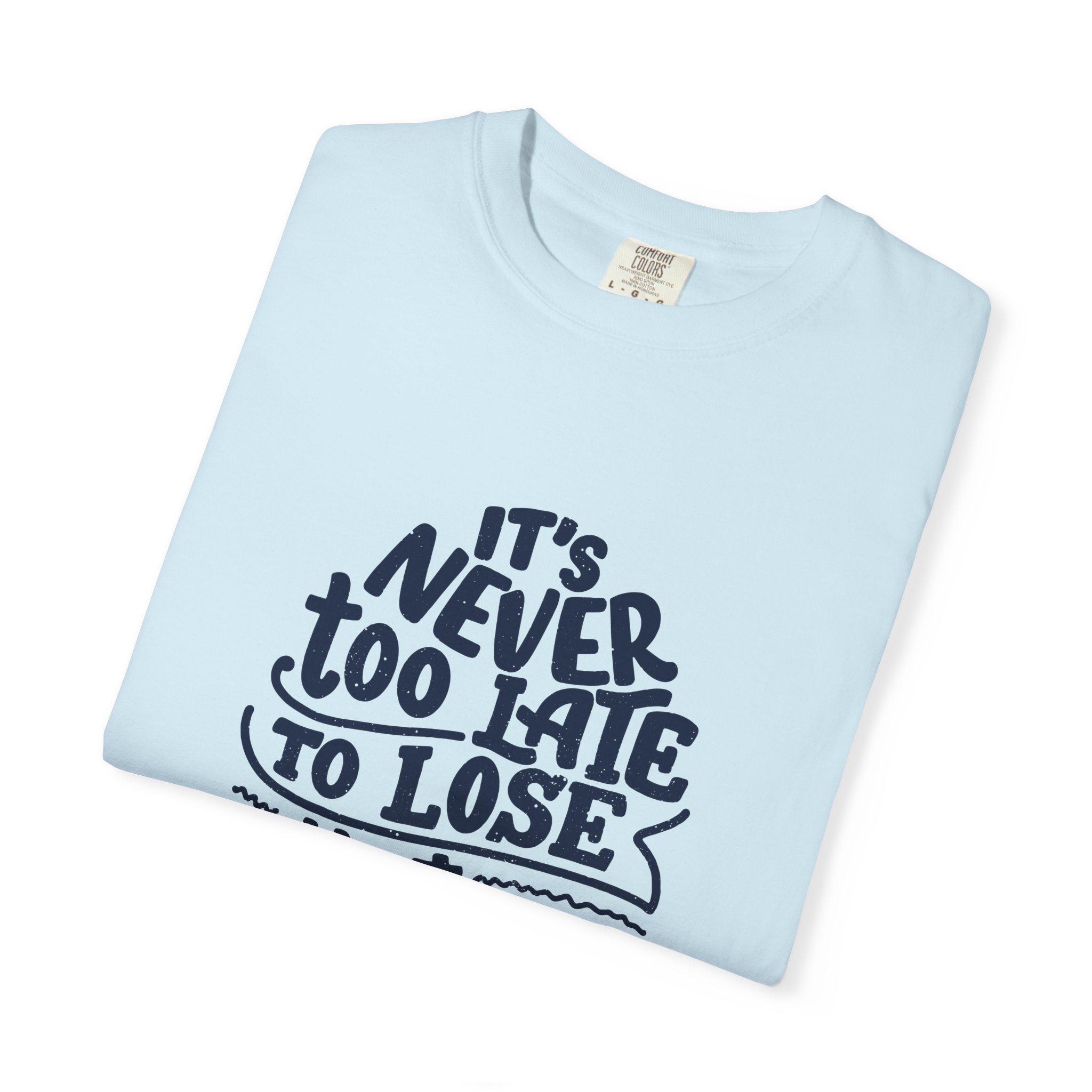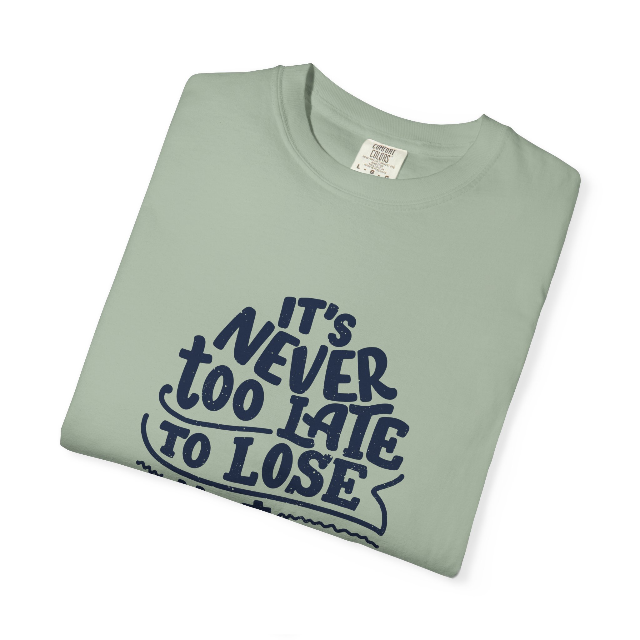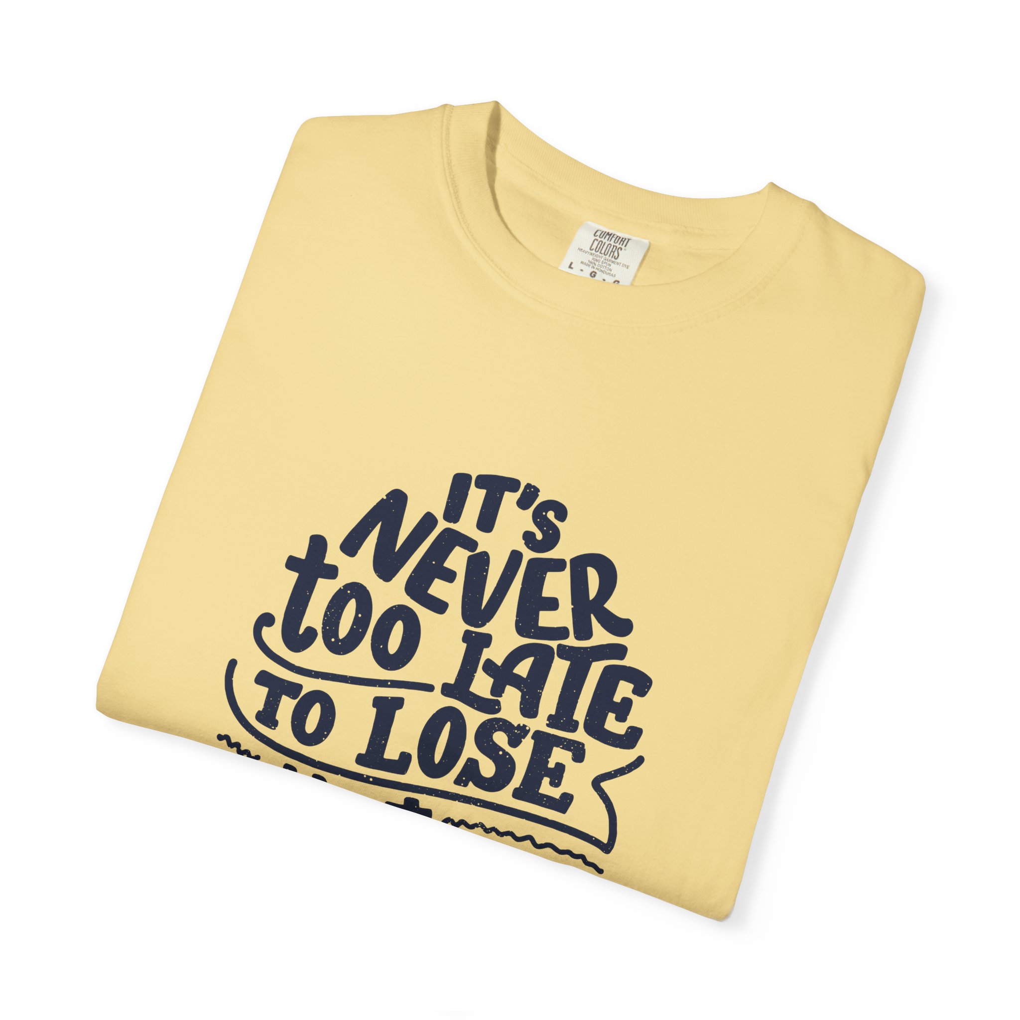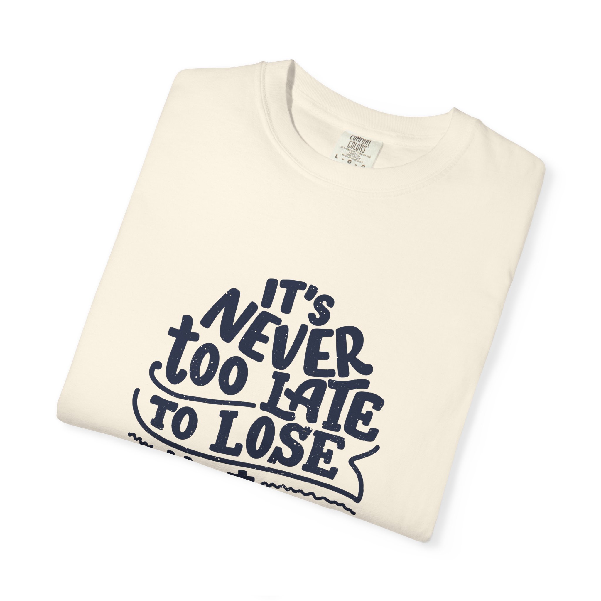 Motivational Unisex T-Shirt – “It’s Never Too Late to Lose That Weight”, Fitness Apparel, Gift for Health Enthusiasts.