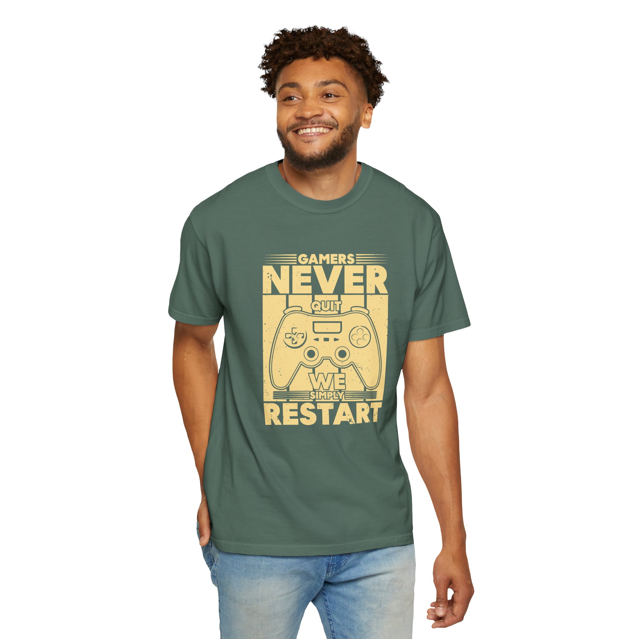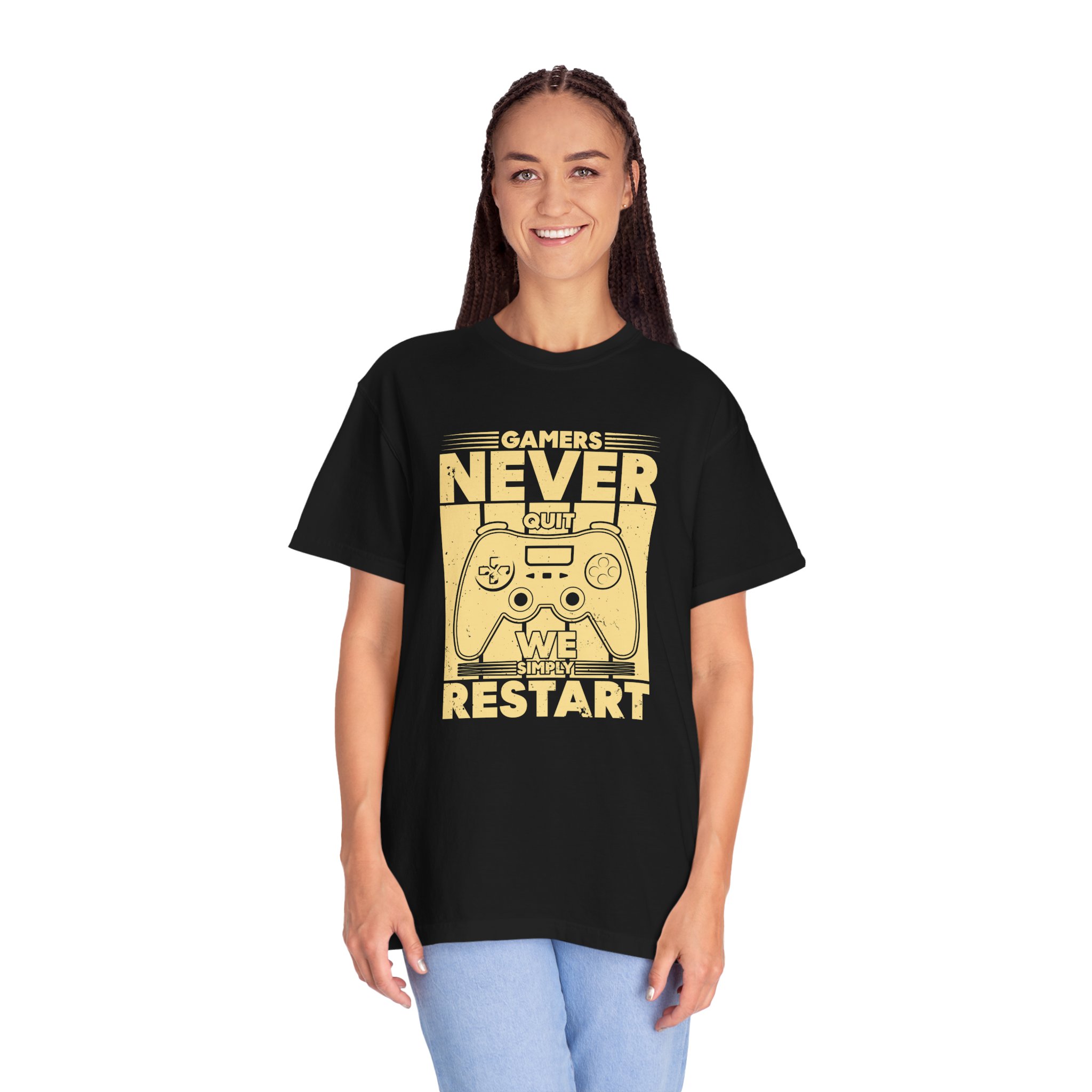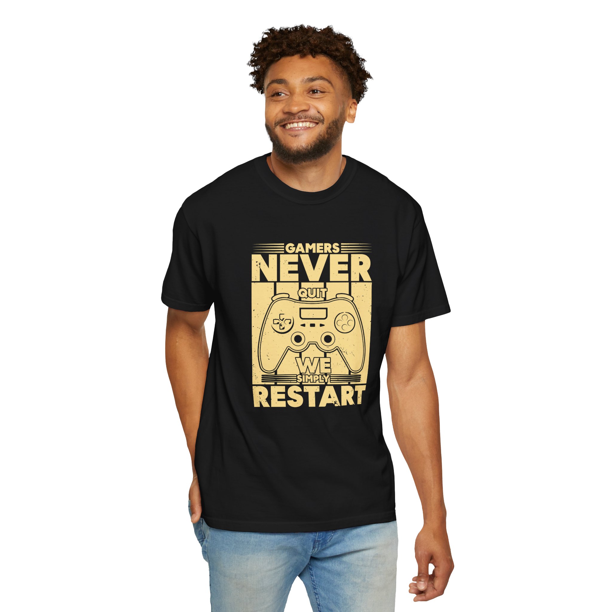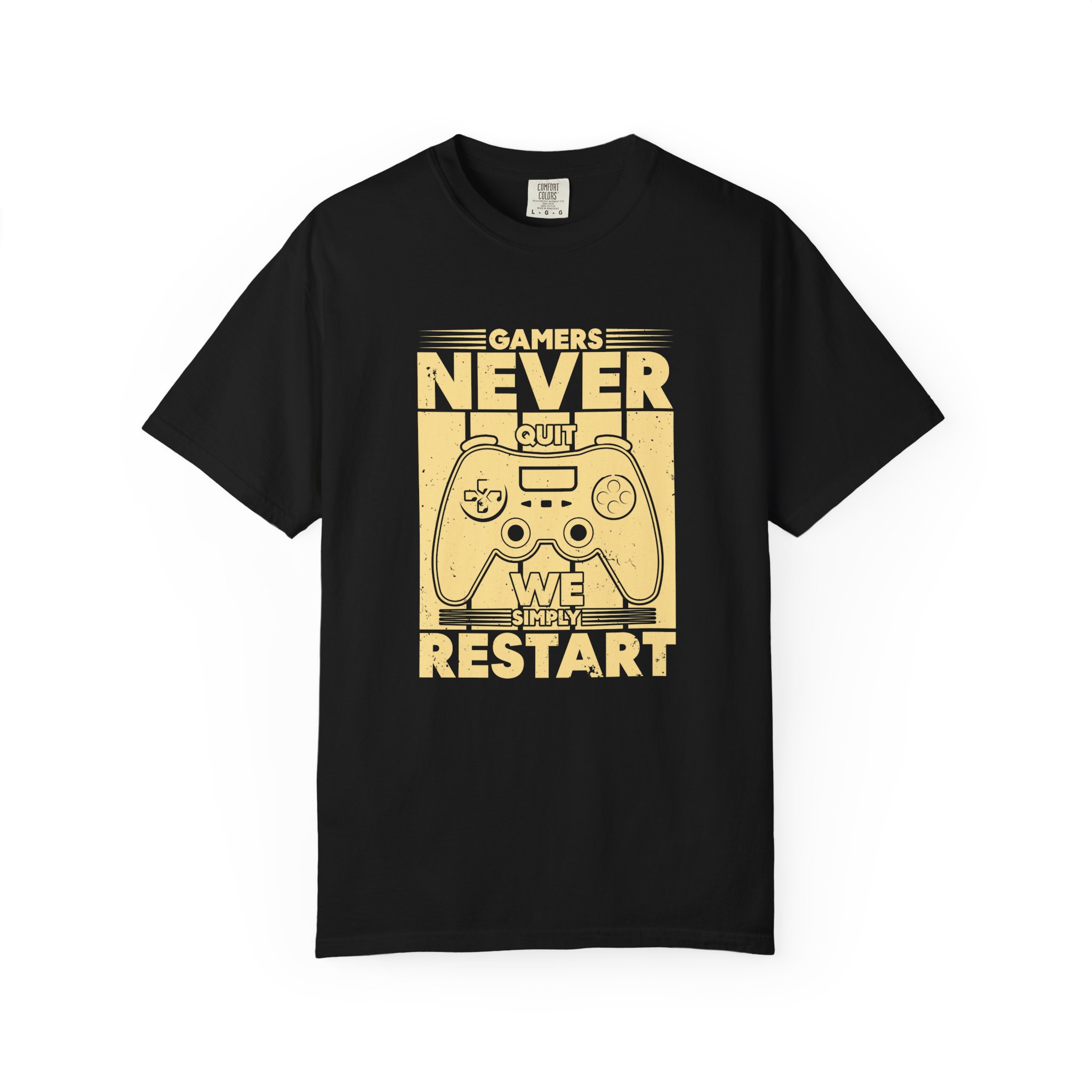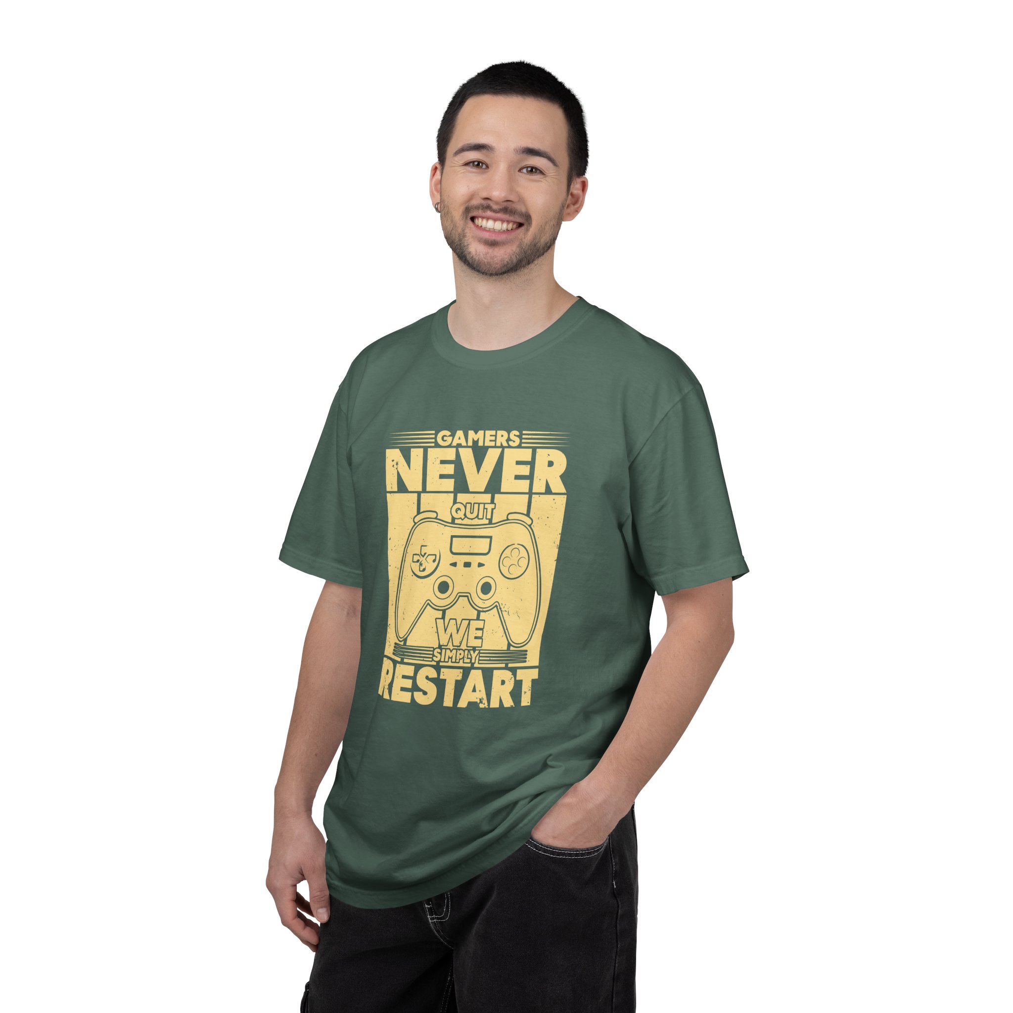 This relaxed, garment-dyed tee brings a warm, worn-in feel straight out of the box. The front print — a retro controller with the words “Gamers Never Quit, We Simply Restart” — speaks in the language of late-night sessions, speedruns, and that one-more-try determination. Soft, heavy-weight cotton holds its shape and color wash after wash, while the tubular knit and double-needle seams give it a sturdy, lived-in look. Slip it on before a marathon stream, a cozy console night with friends, or a low-key convention day. It sits comfortably over hoodies or alone, letting the vintage print be the conversation starter among fellow players.