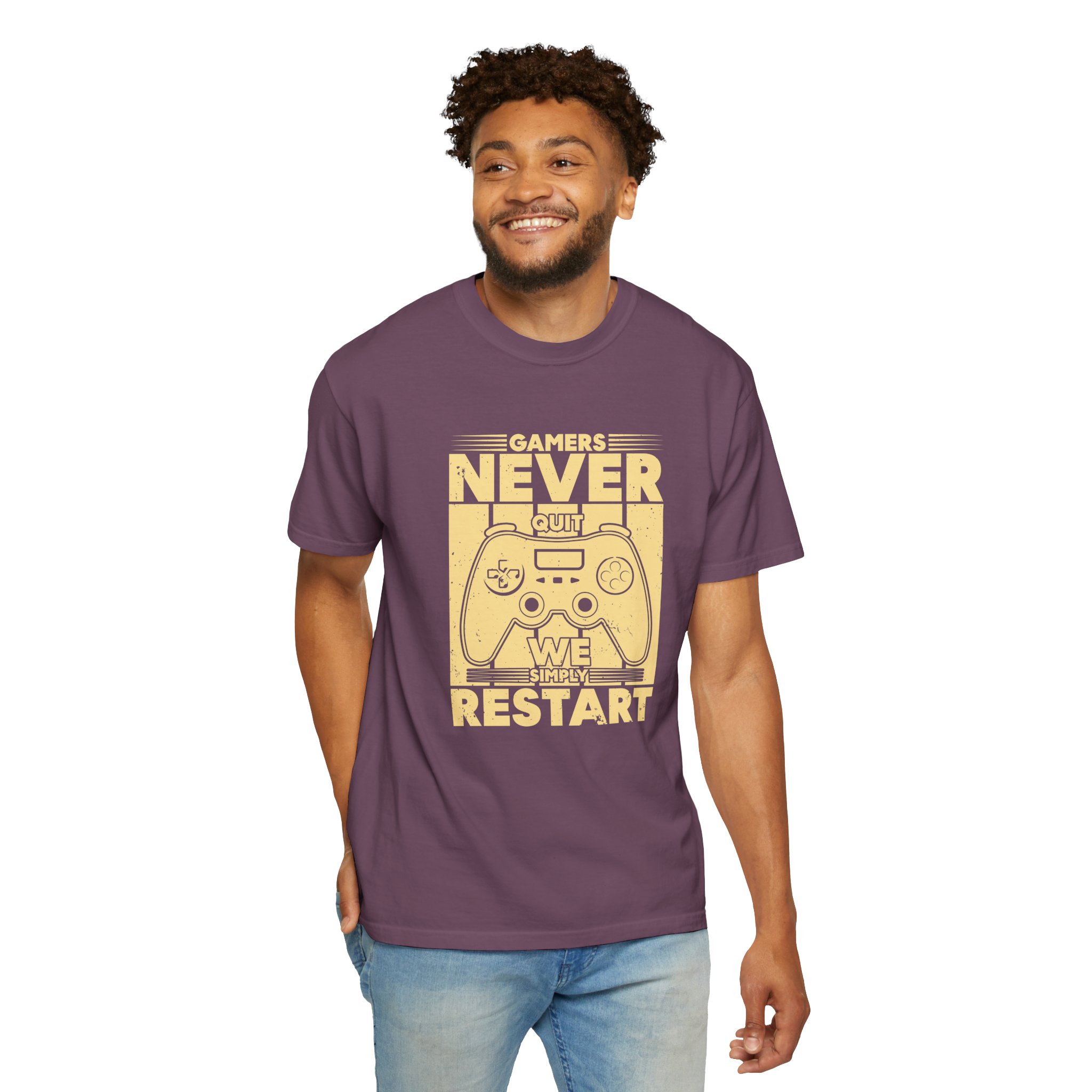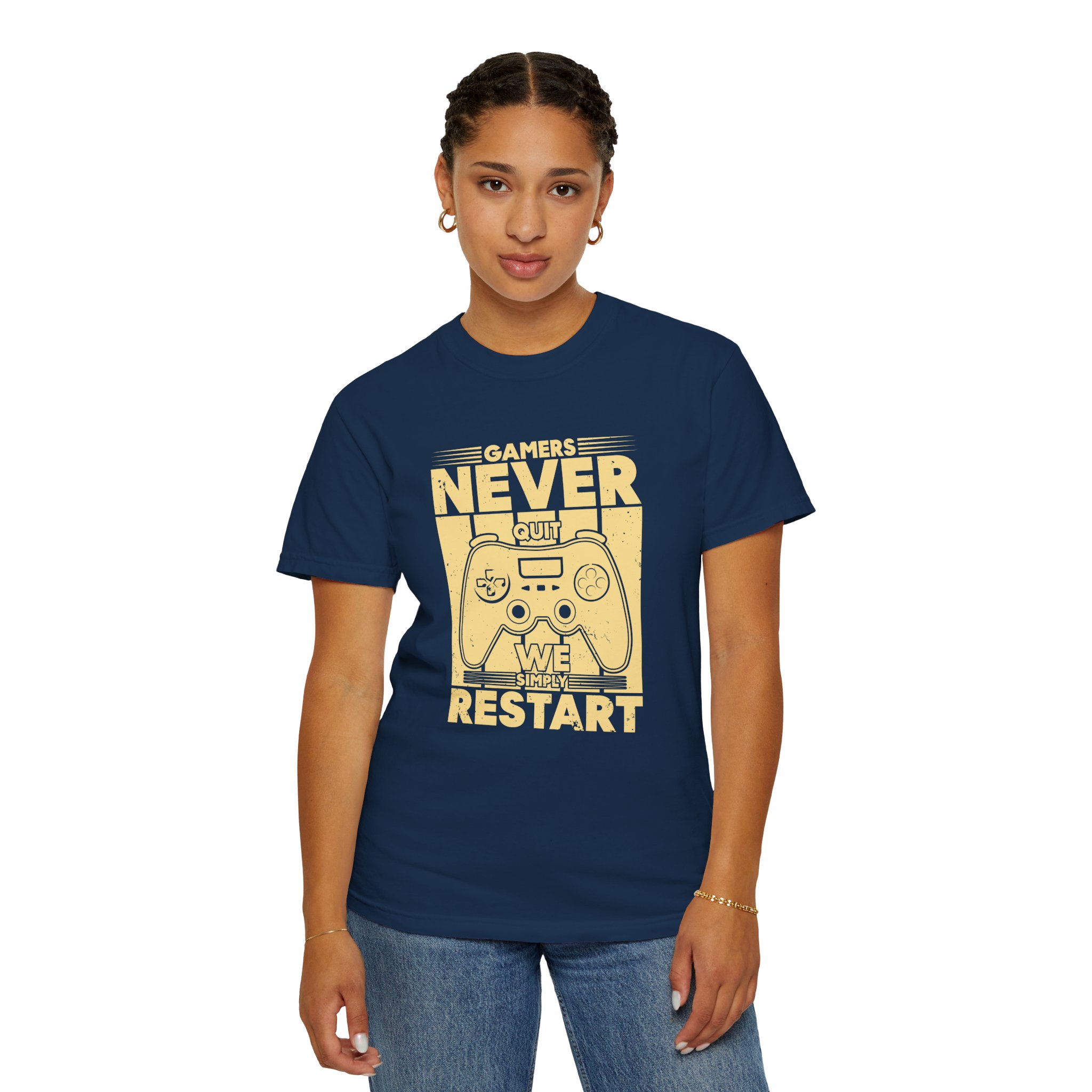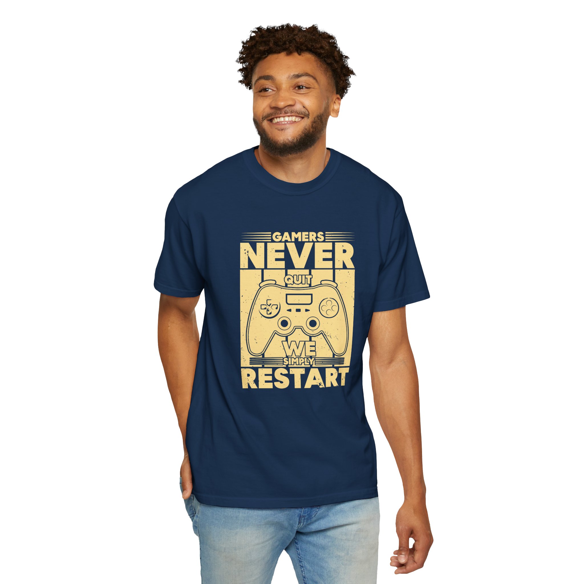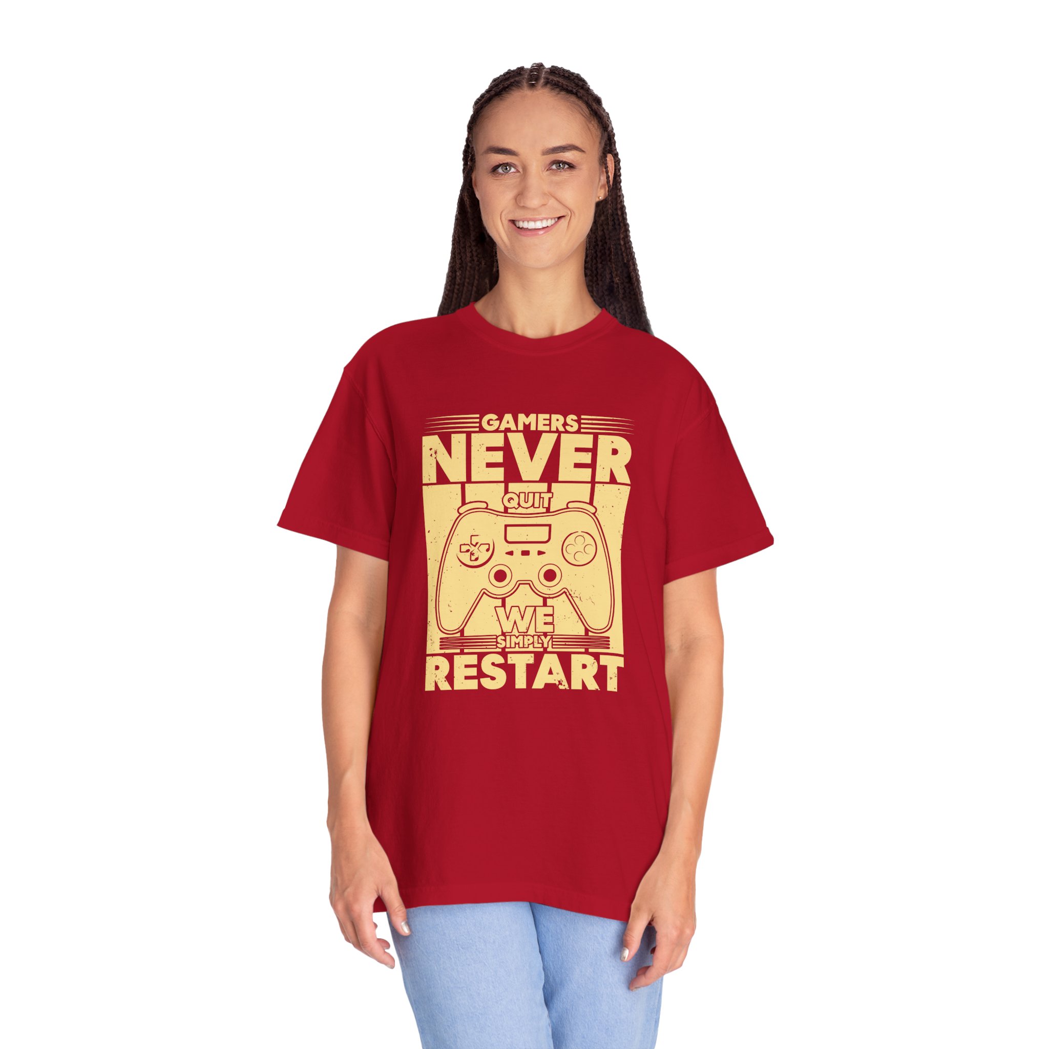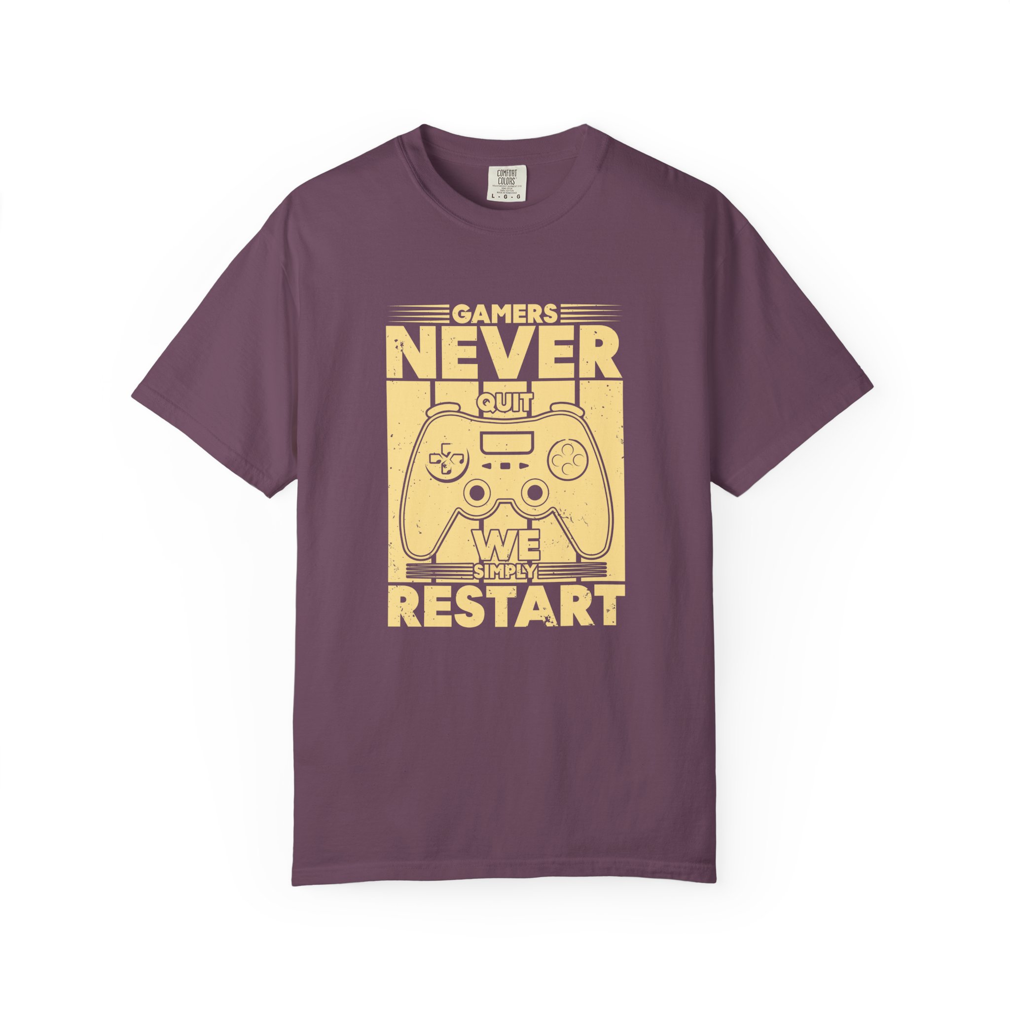 This relaxed, garment-dyed tee brings a warm, worn-in feel straight out of the box. The front print — a retro controller with the words “Gamers Never Quit, We Simply Restart” — speaks in the language of late-night sessions, speedruns, and that one-more-try determination. Soft, heavy-weight cotton holds its shape and color wash after wash, while the tubular knit and double-needle seams give it a sturdy, lived-in look. Slip it on before a marathon stream, a cozy console night with friends, or a low-key convention day. It sits comfortably over hoodies or alone, letting the vintage print be the conversation starter among fellow players.