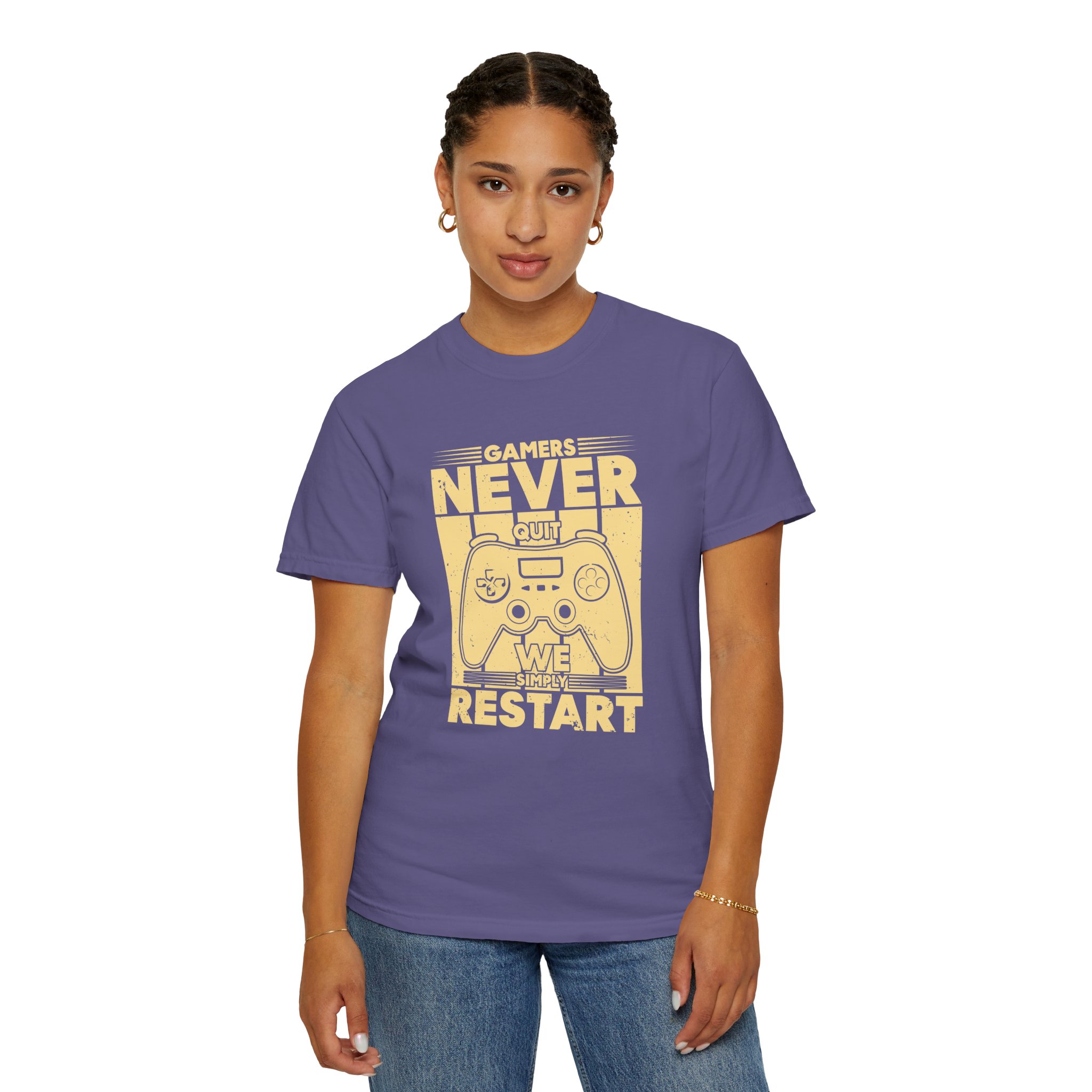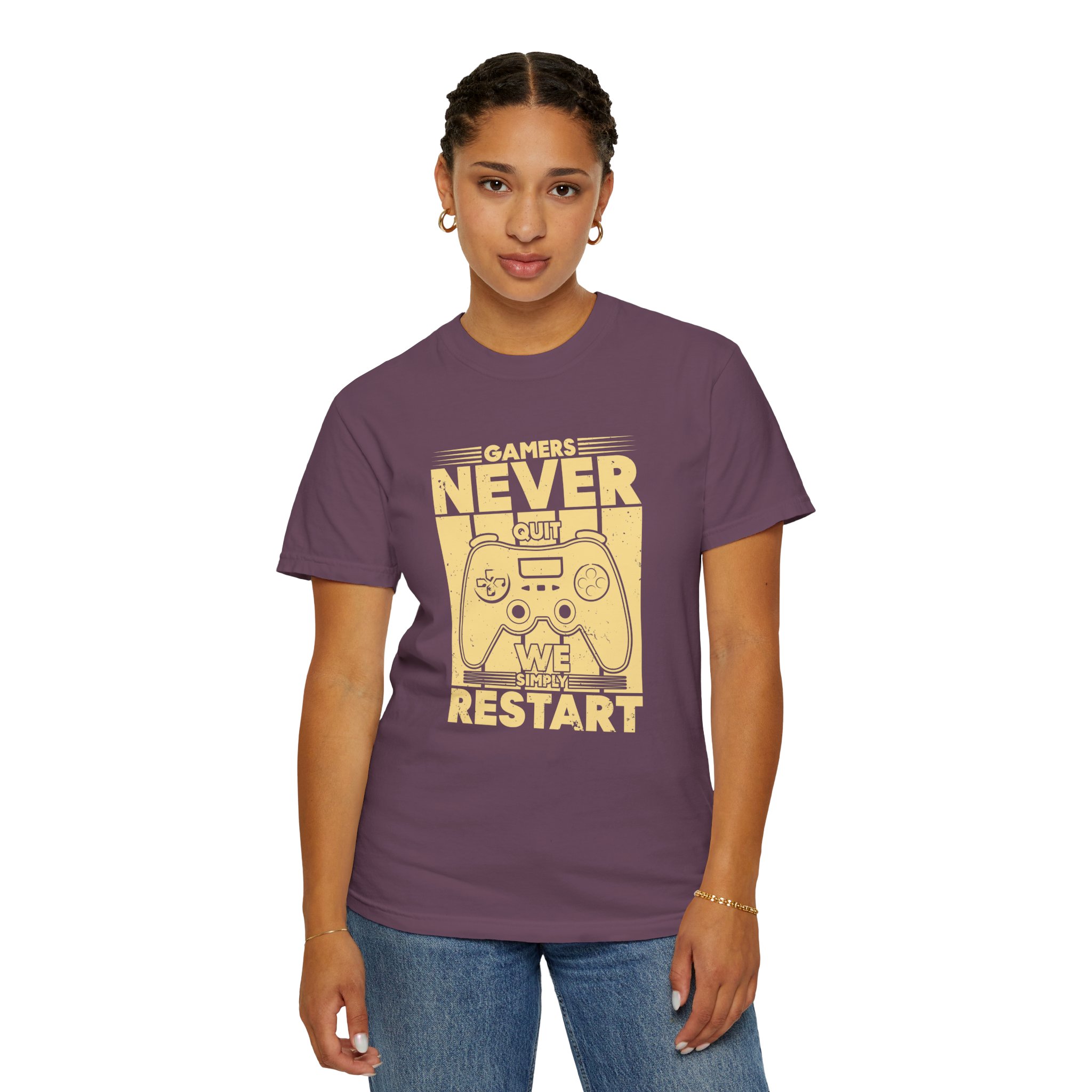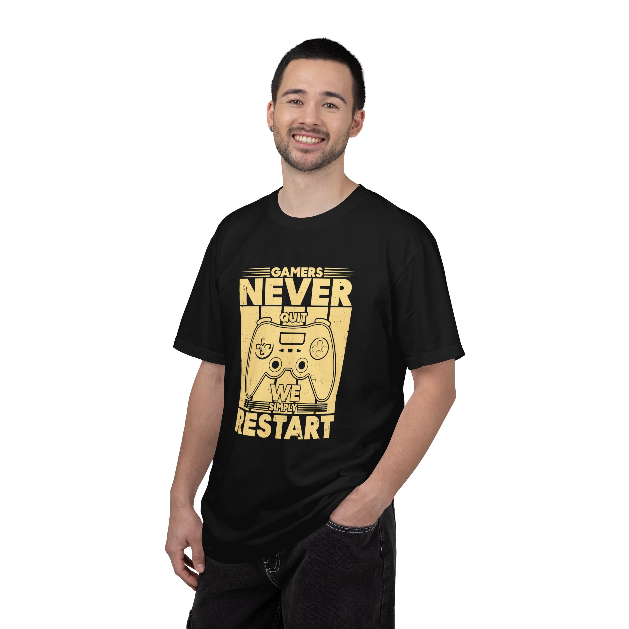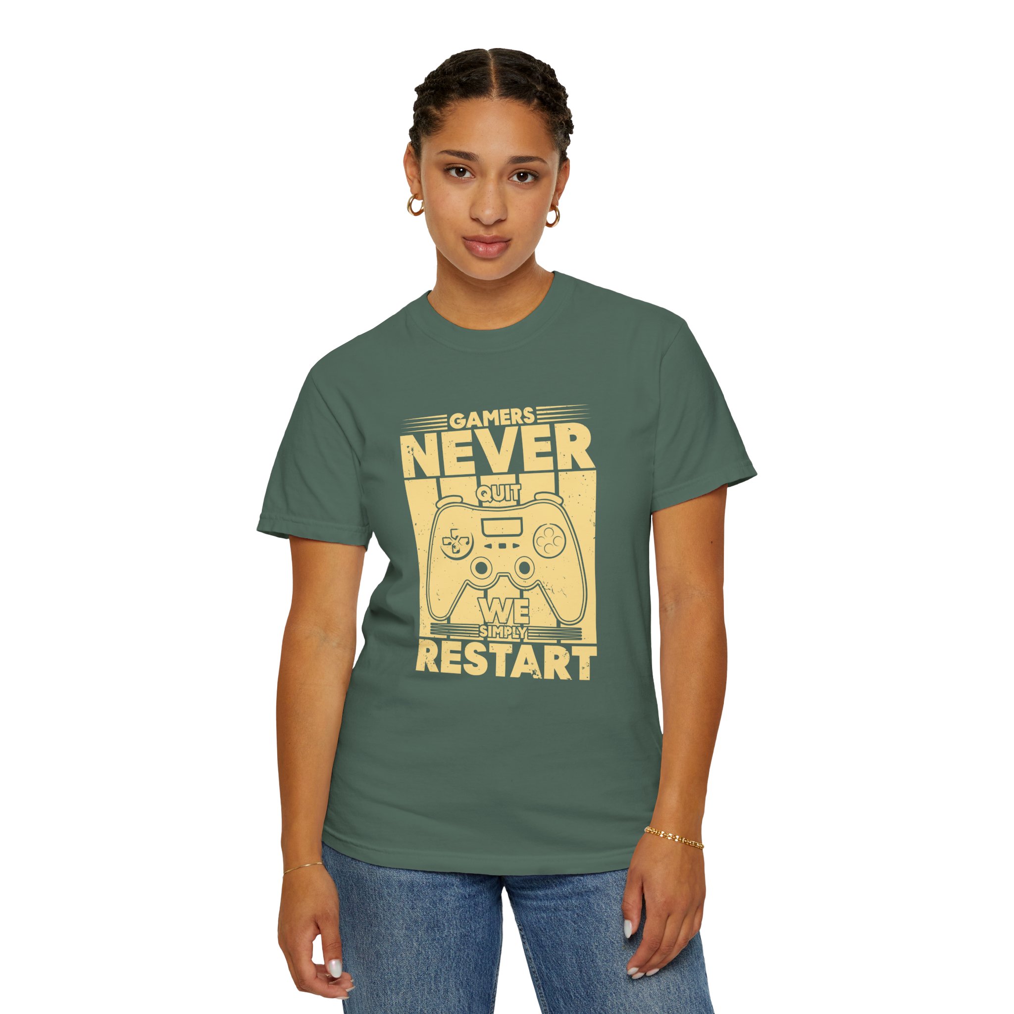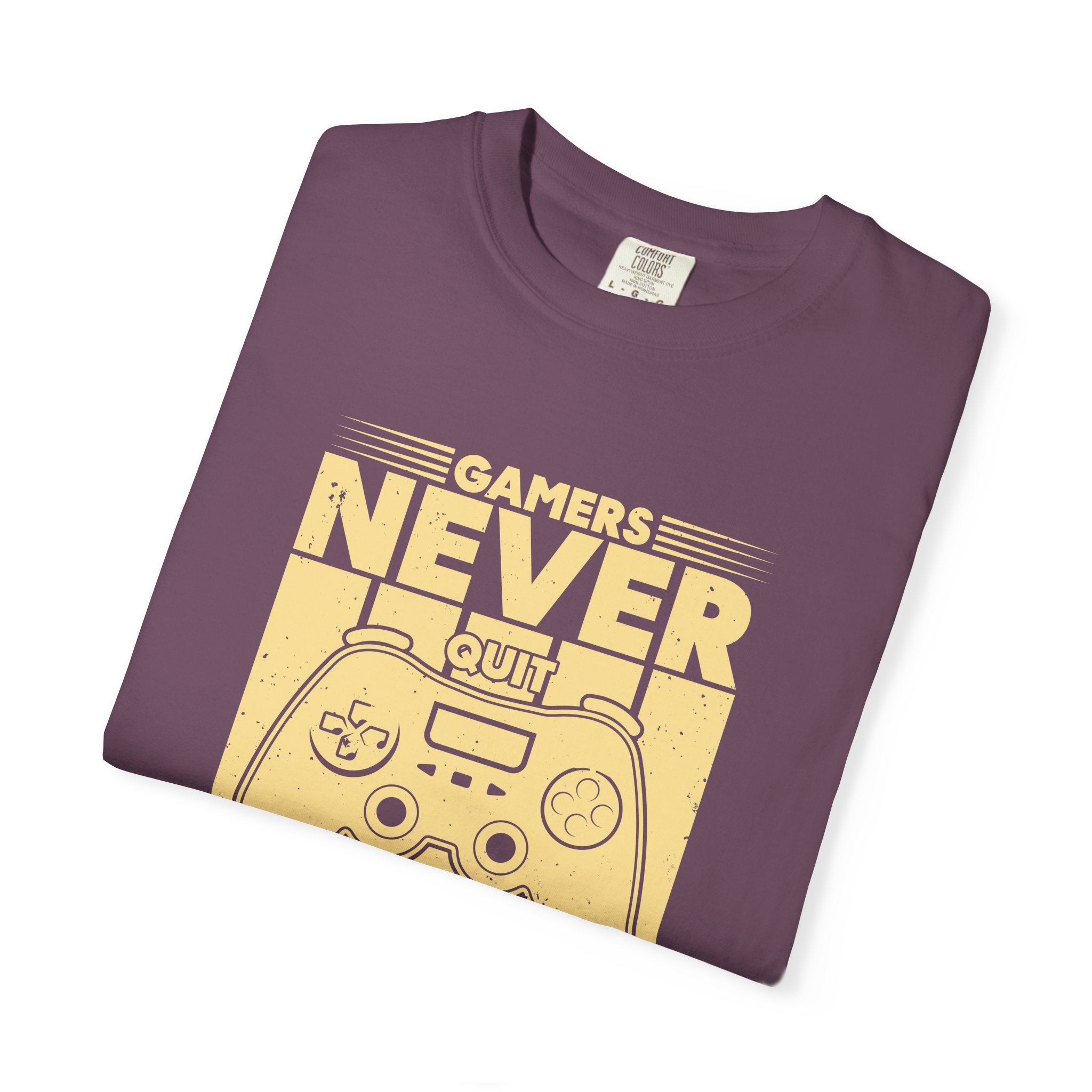 This relaxed, garment-dyed tee brings a warm, worn-in feel straight out of the box. The front print — a retro controller with the words “Gamers Never Quit, We Simply Restart” — speaks in the language of late-night sessions, speedruns, and that one-more-try determination. Soft, heavy-weight cotton holds its shape and color wash after wash, while the tubular knit and double-needle seams give it a sturdy, lived-in look. Slip it on before a marathon stream, a cozy console night with friends, or a low-key convention day. It sits comfortably over hoodies or alone, letting the vintage print be the conversation starter among fellow players.