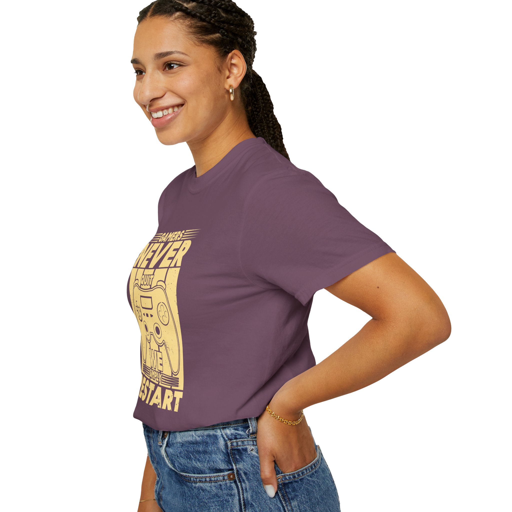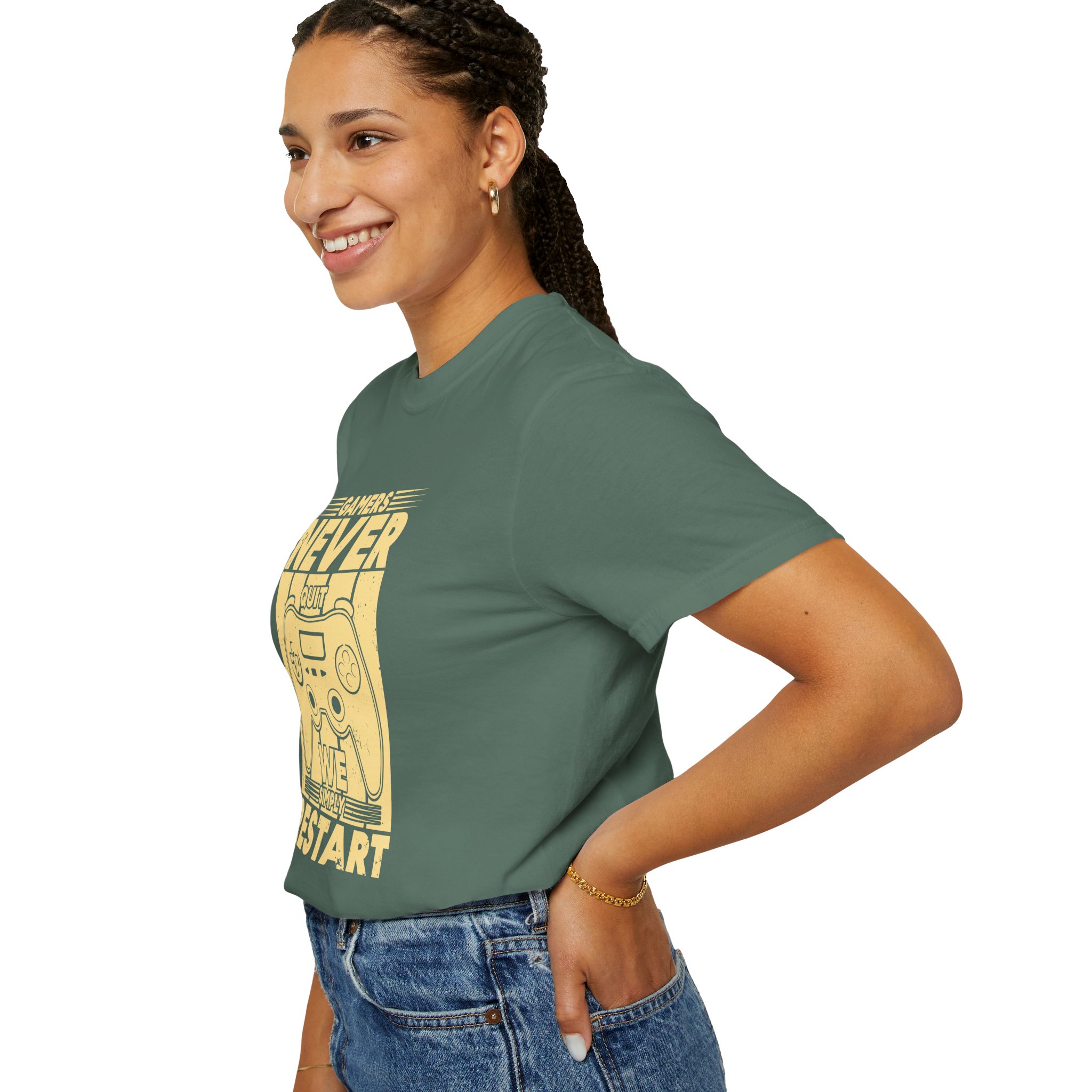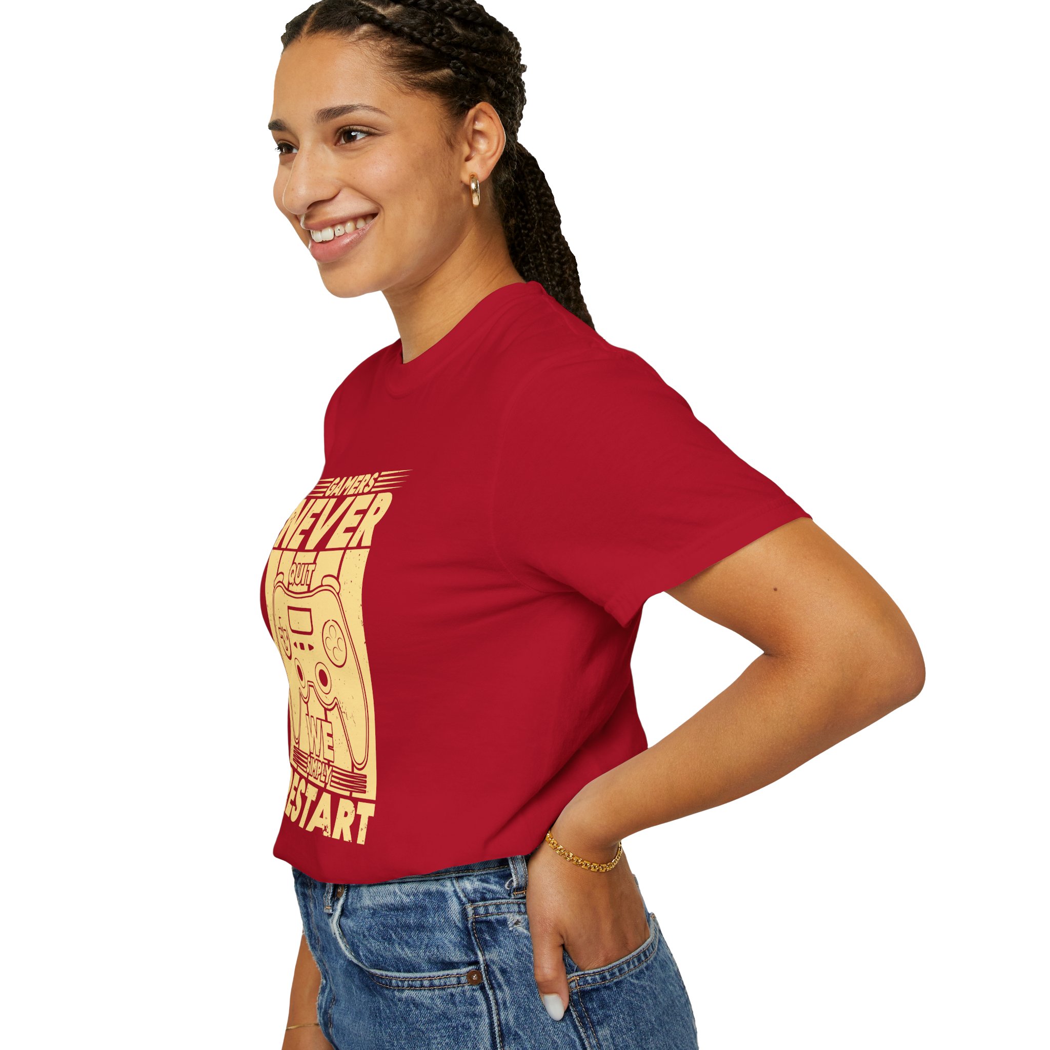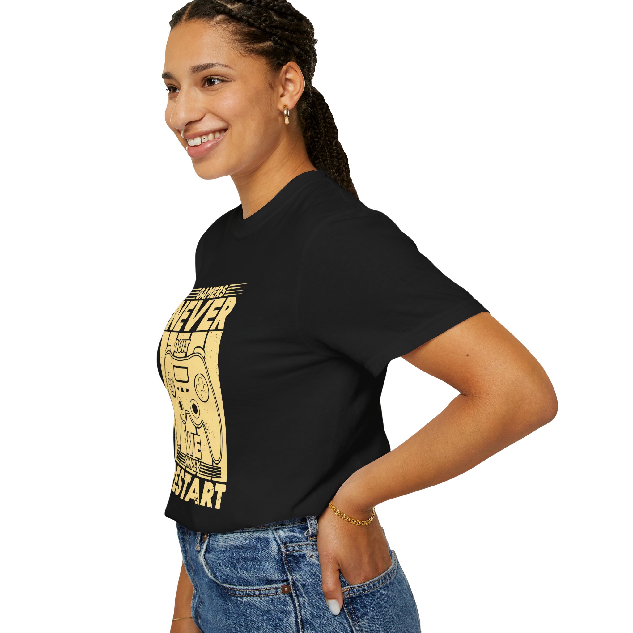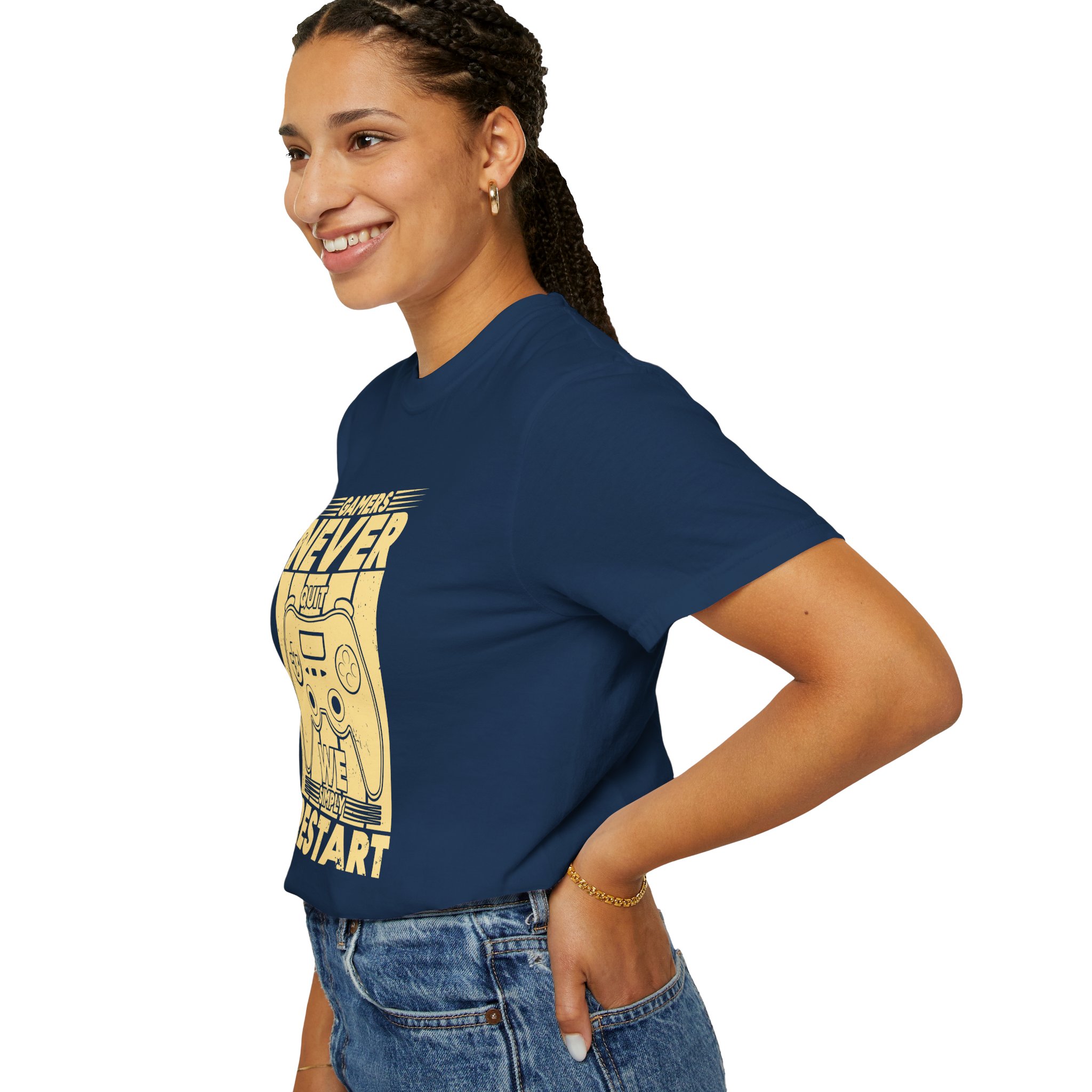 This relaxed, garment-dyed tee brings a warm, worn-in feel straight out of the box. The front print — a retro controller with the words “Gamers Never Quit, We Simply Restart” — speaks in the language of late-night sessions, speedruns, and that one-more-try determination. Soft, heavy-weight cotton holds its shape and color wash after wash, while the tubular knit and double-needle seams give it a sturdy, lived-in look. Slip it on before a marathon stream, a cozy console night with friends, or a low-key convention day. It sits comfortably over hoodies or alone, letting the vintage print be the conversation starter among fellow players.