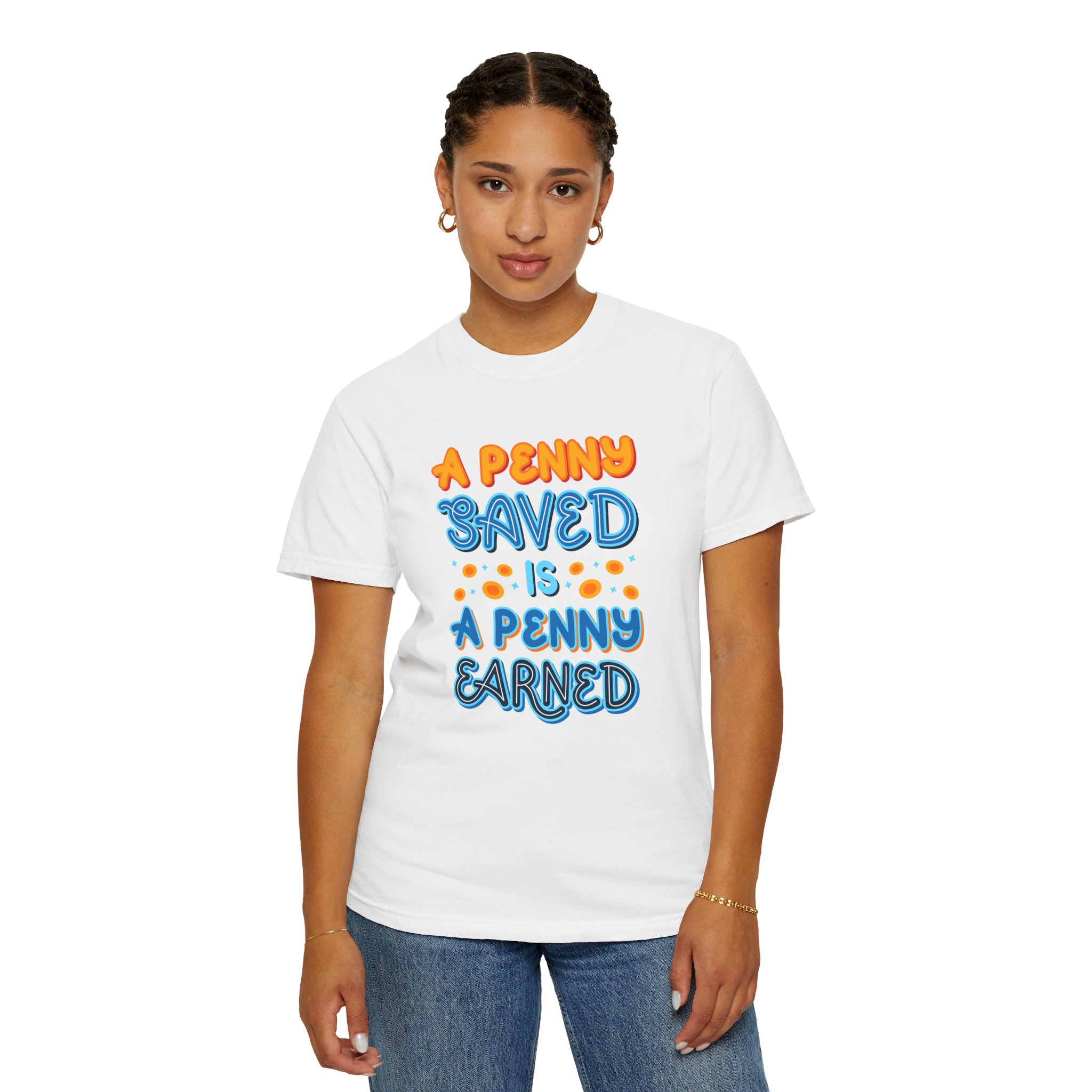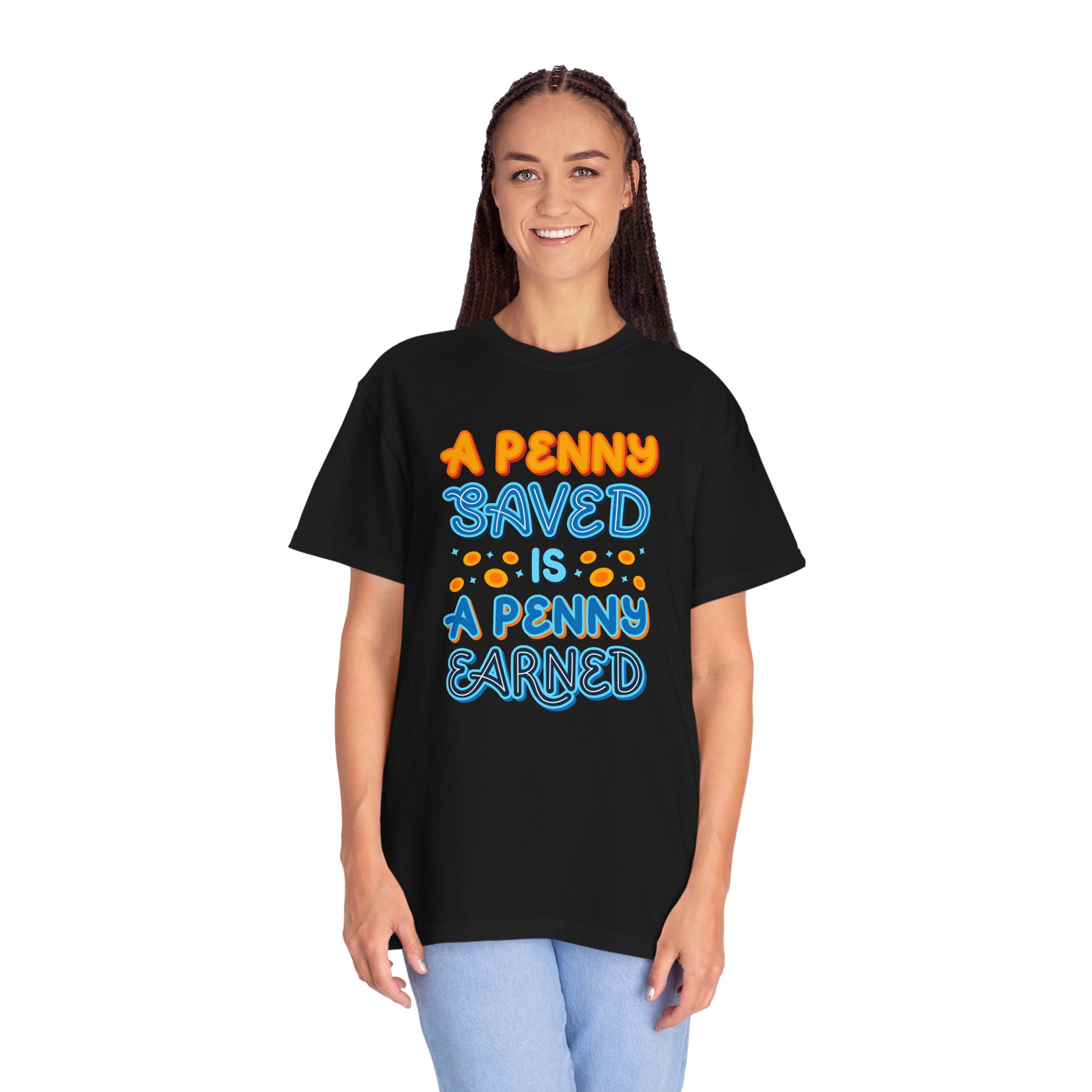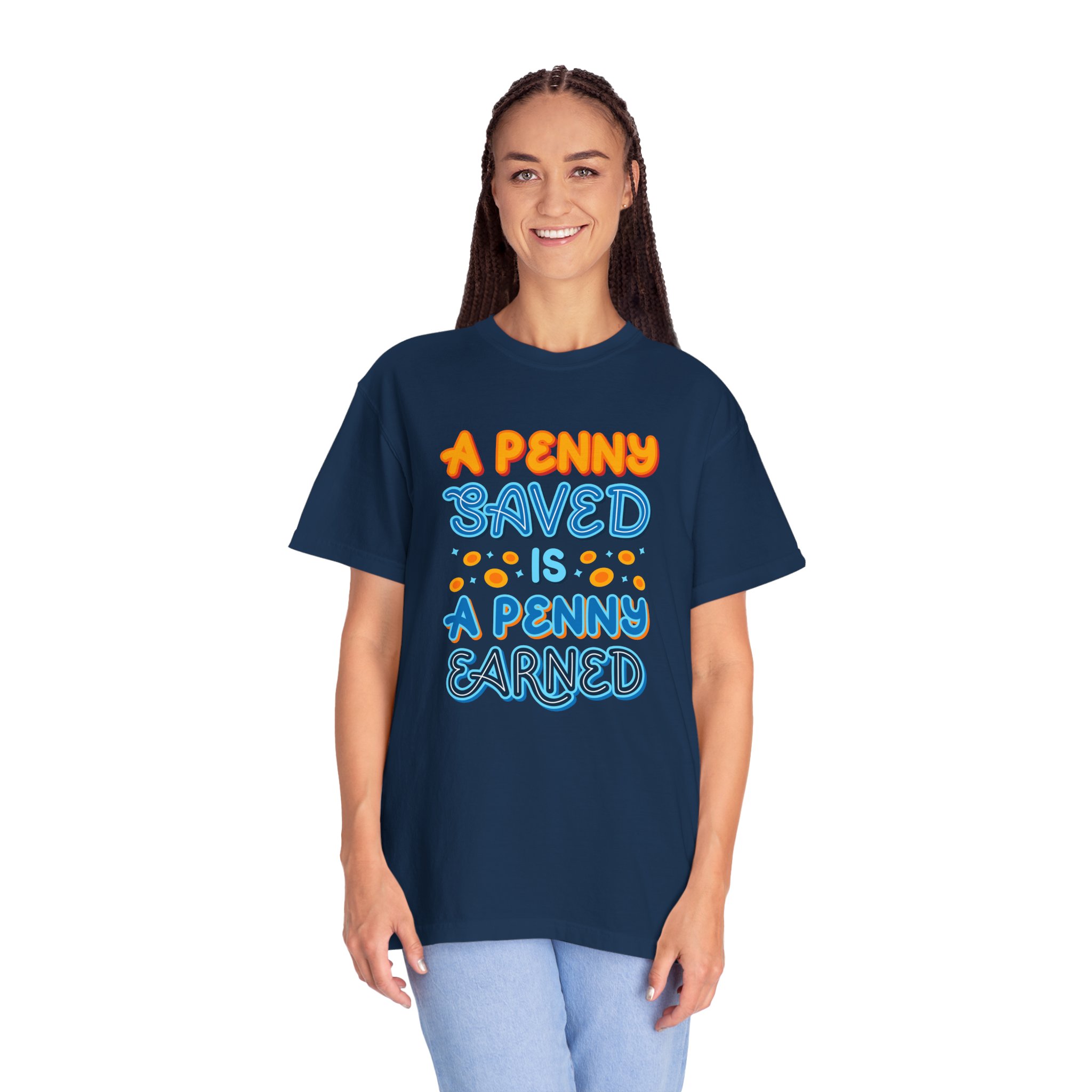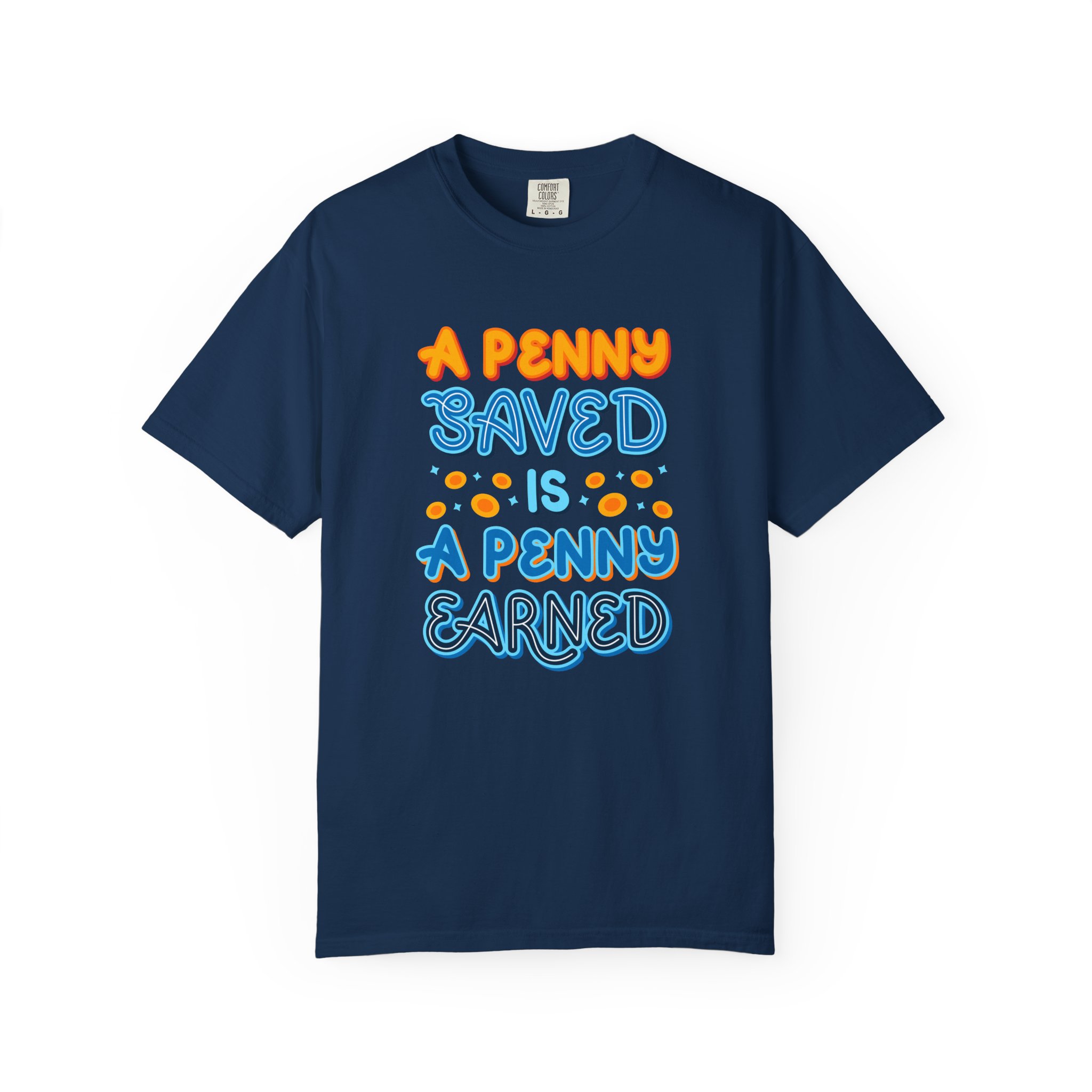 A Penny Saved Is a Penny Earned T-Shirt – Retro Inspirational Savings Quote Graphic Tee for Smart Living & Financial Motivation.