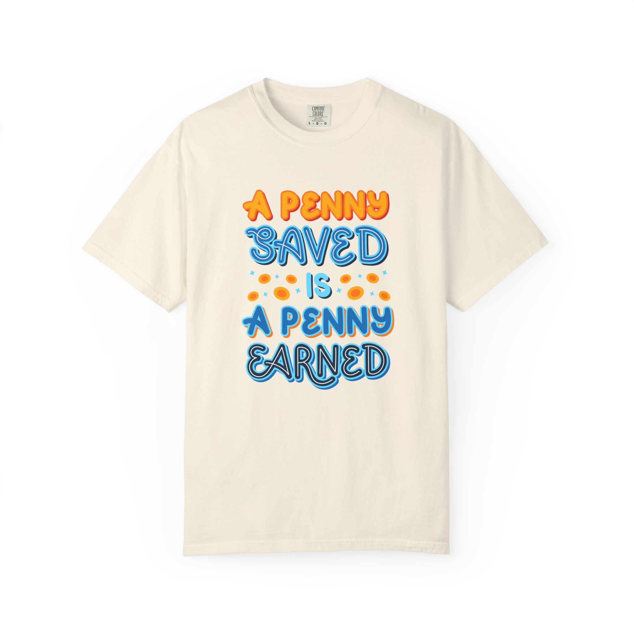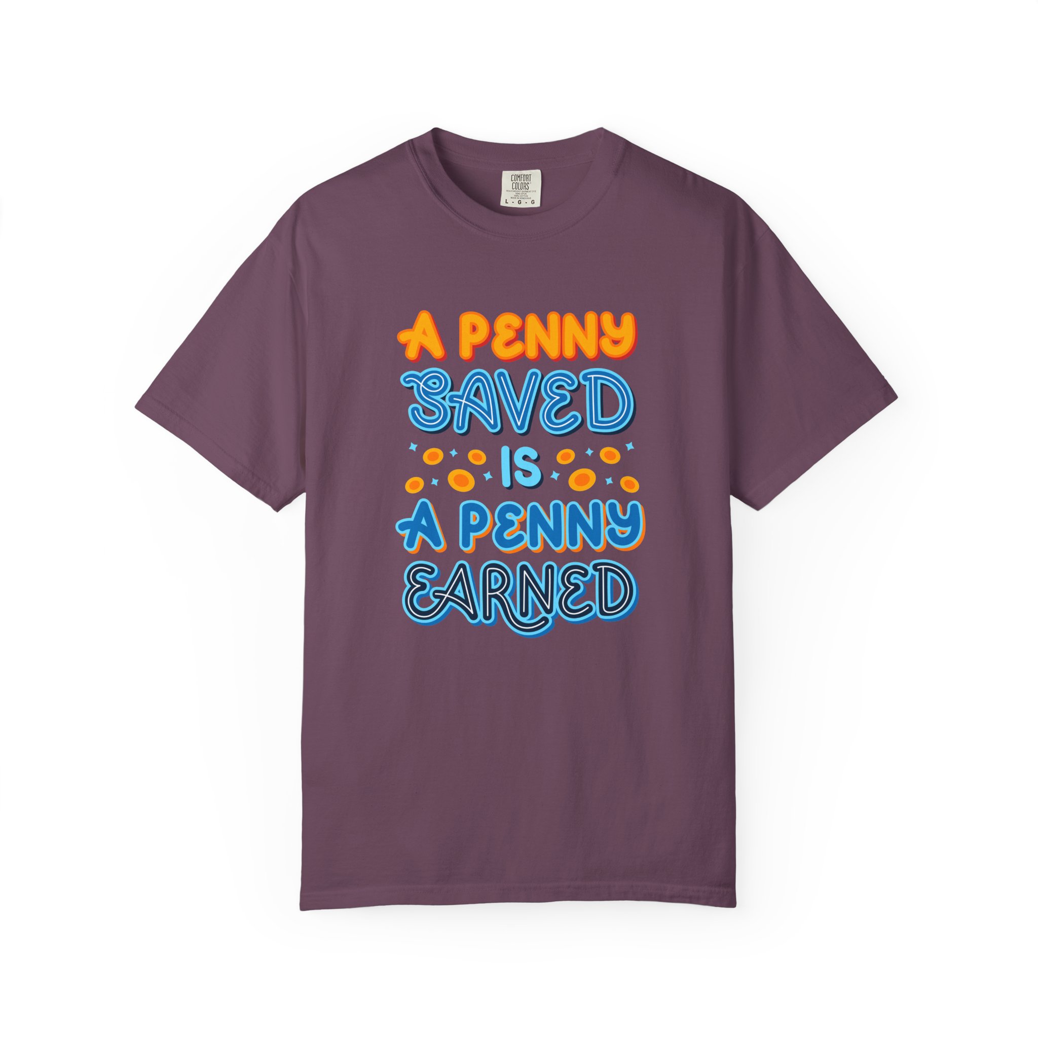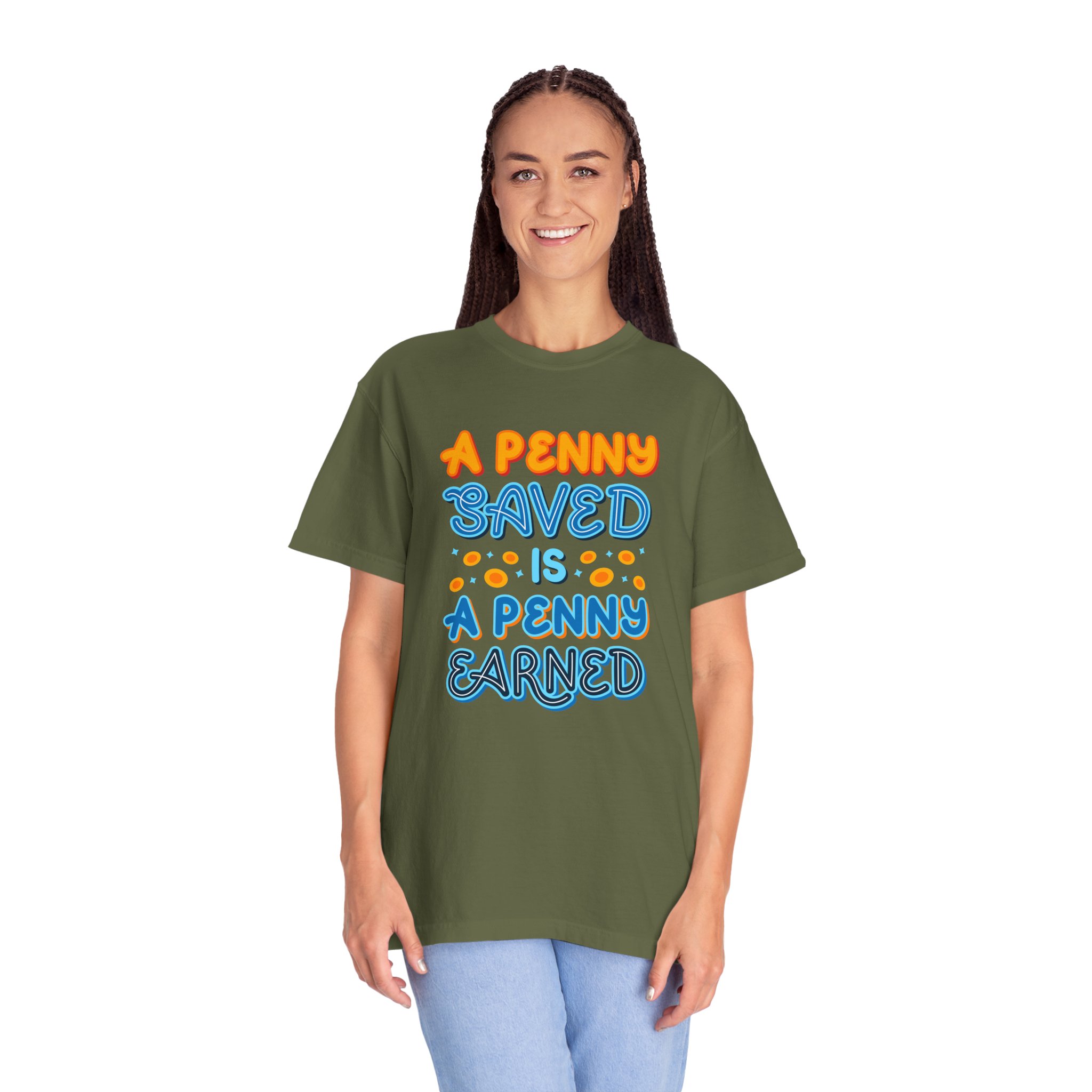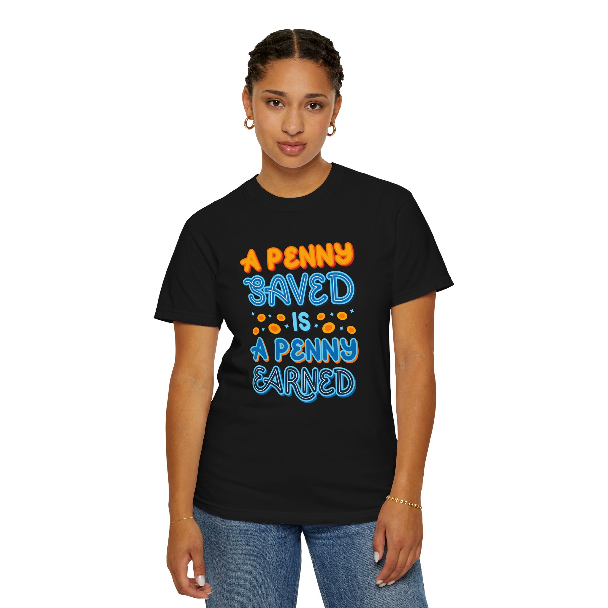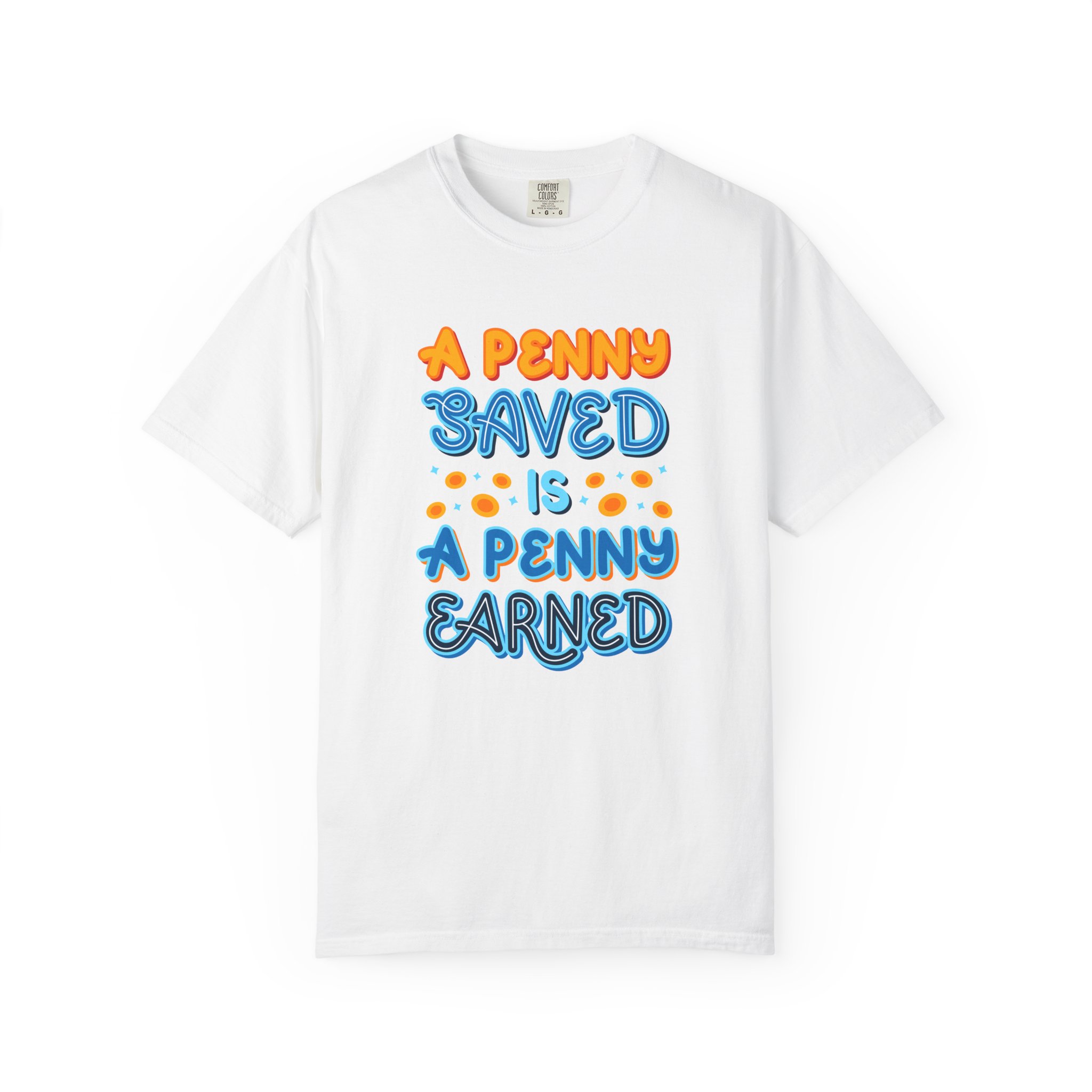 A Penny Saved Is a Penny Earned T-Shirt – Retro Inspirational Savings Quote Graphic Tee for Smart Living & Financial Motivation.