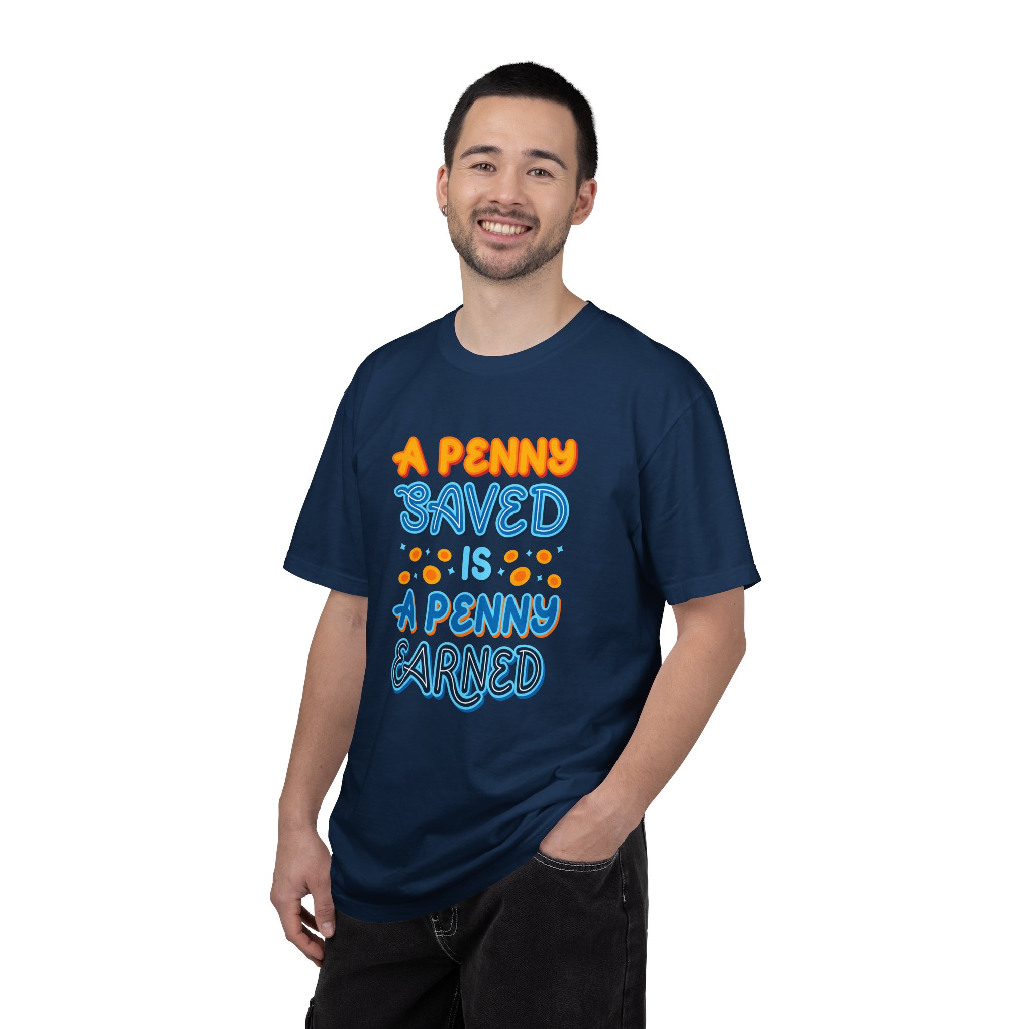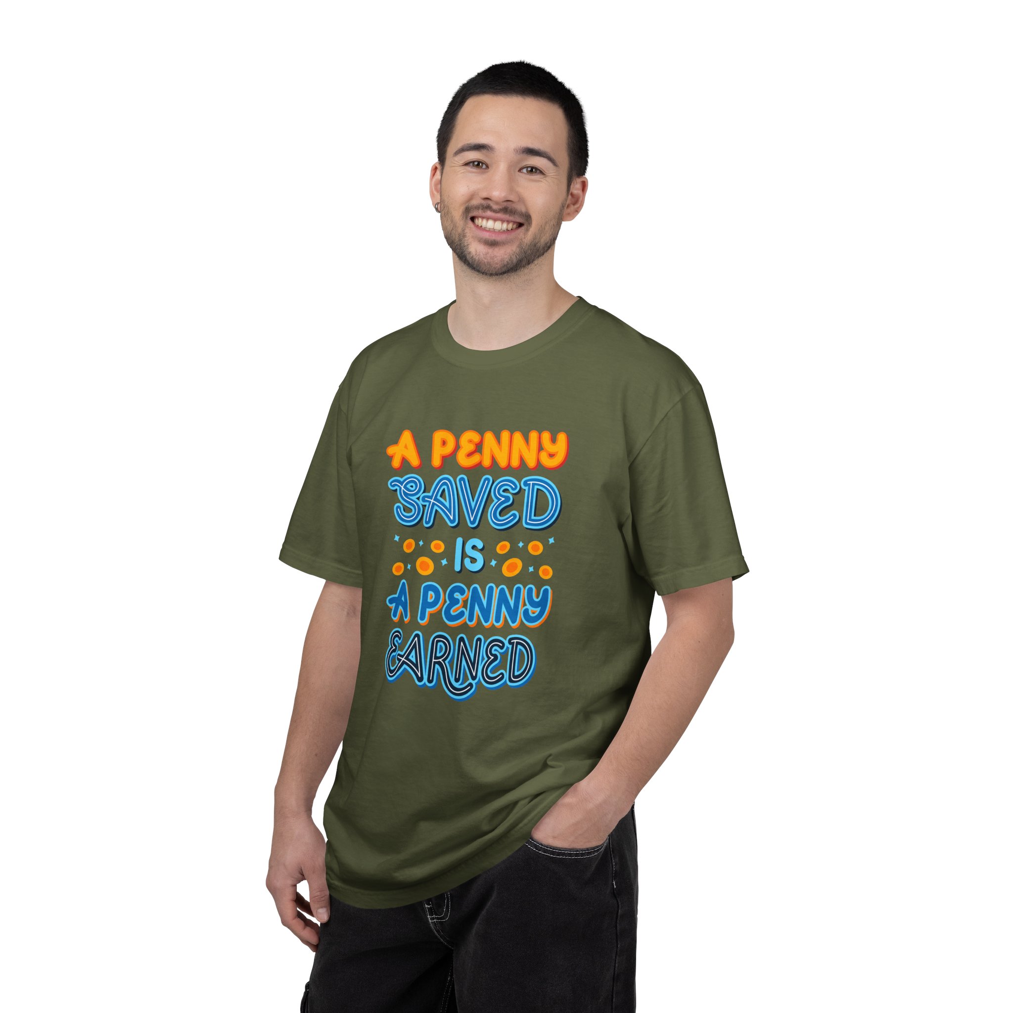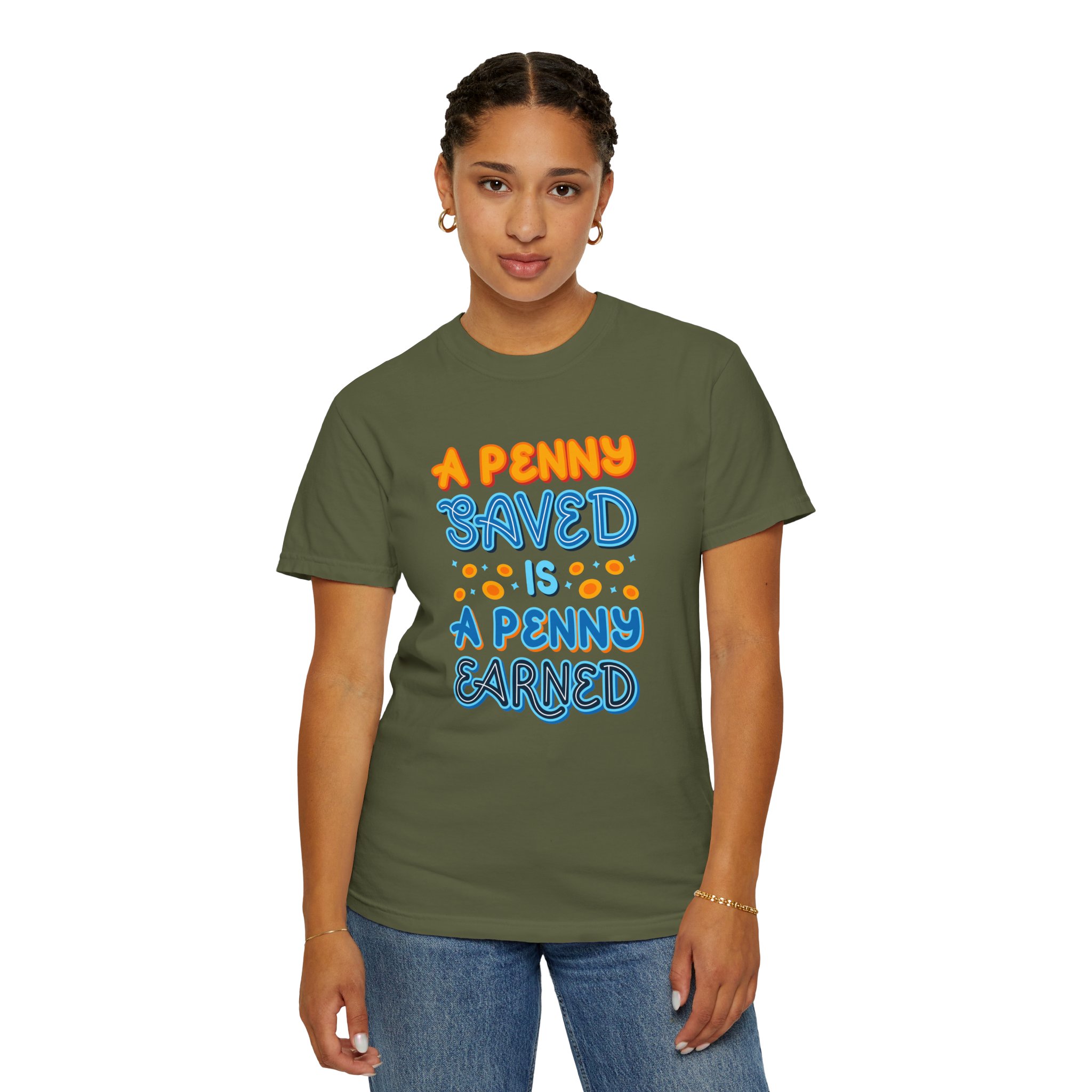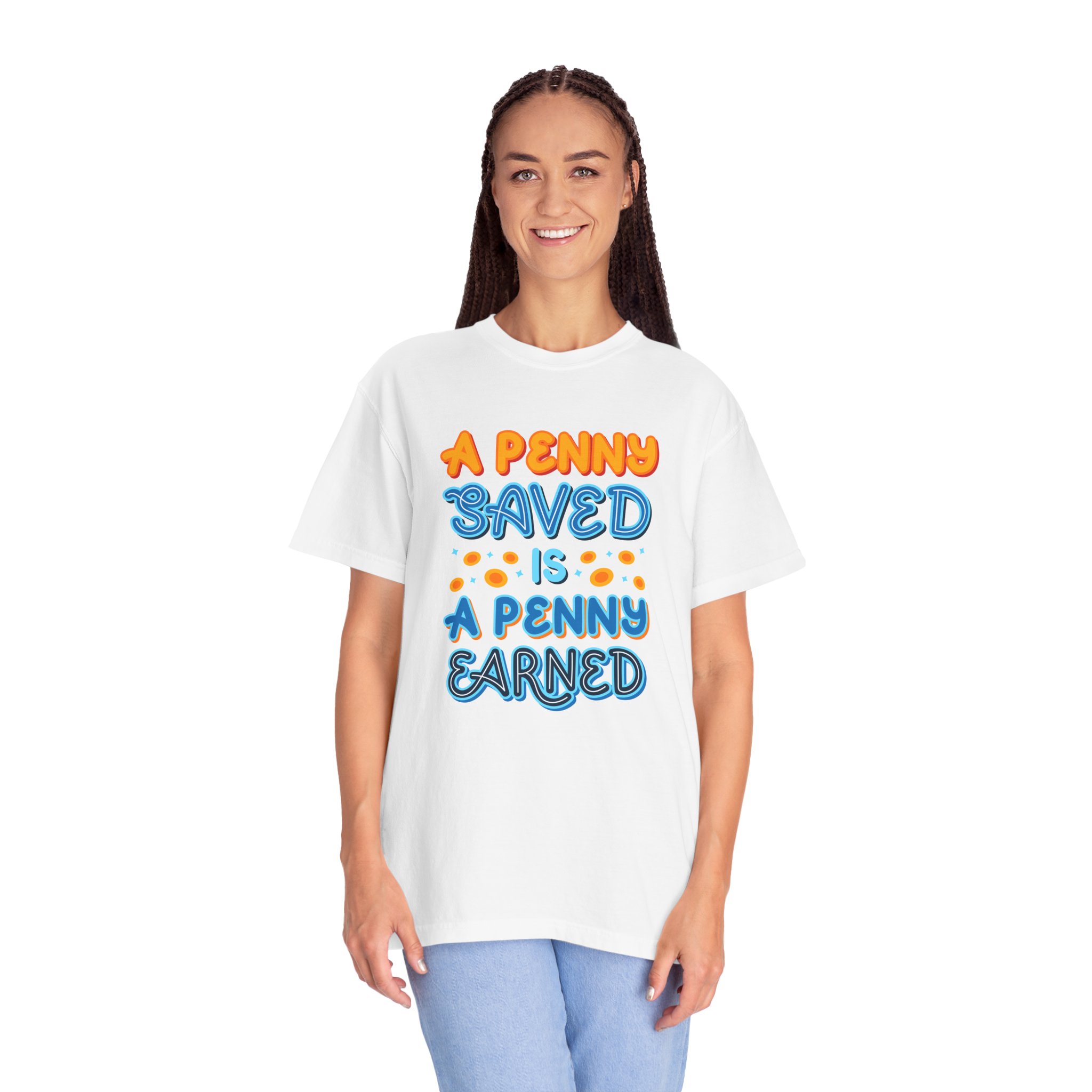 A Penny Saved Is a Penny Earned T-Shirt – Retro Inspirational Savings Quote Graphic Tee for Smart Living & Financial Motivation.
