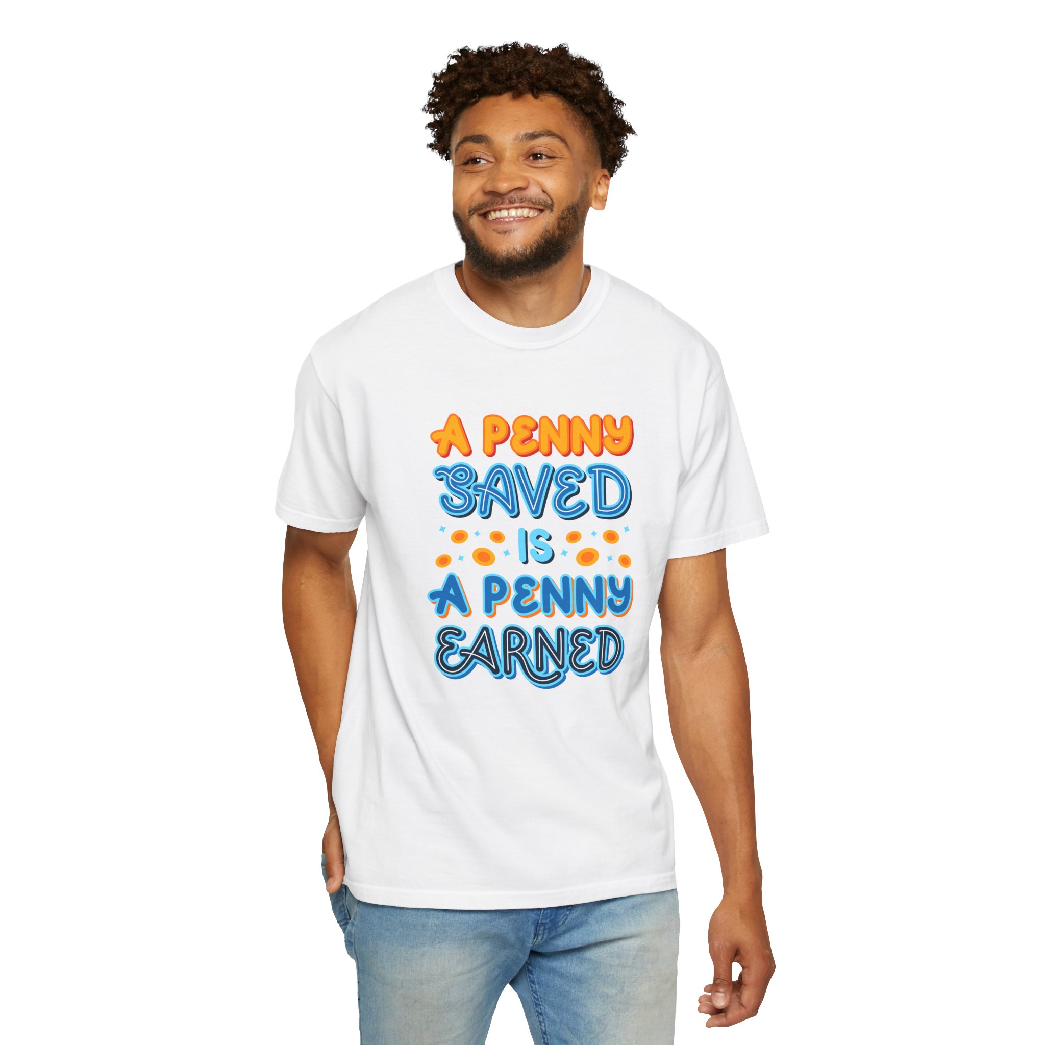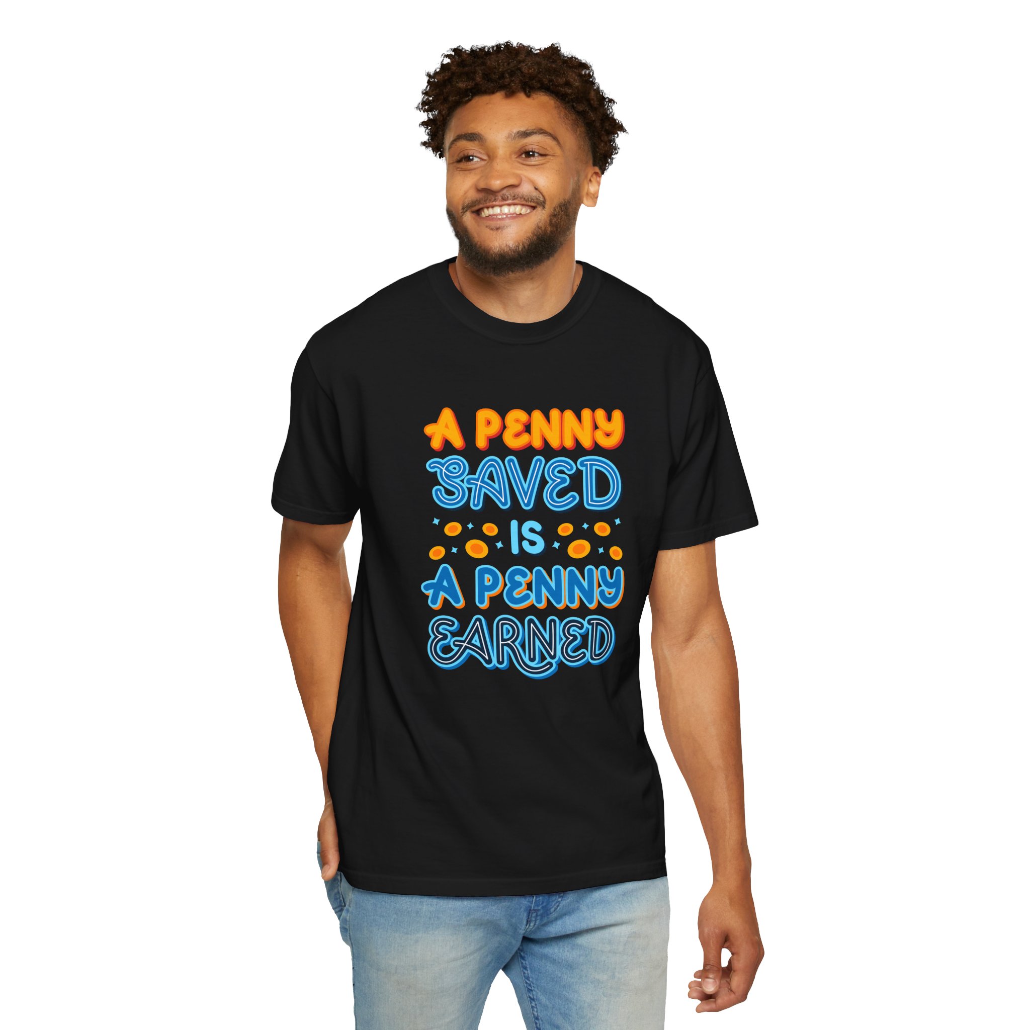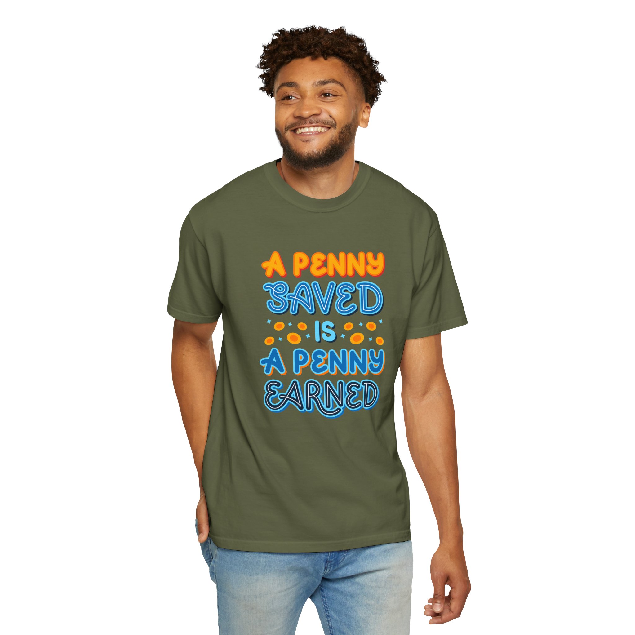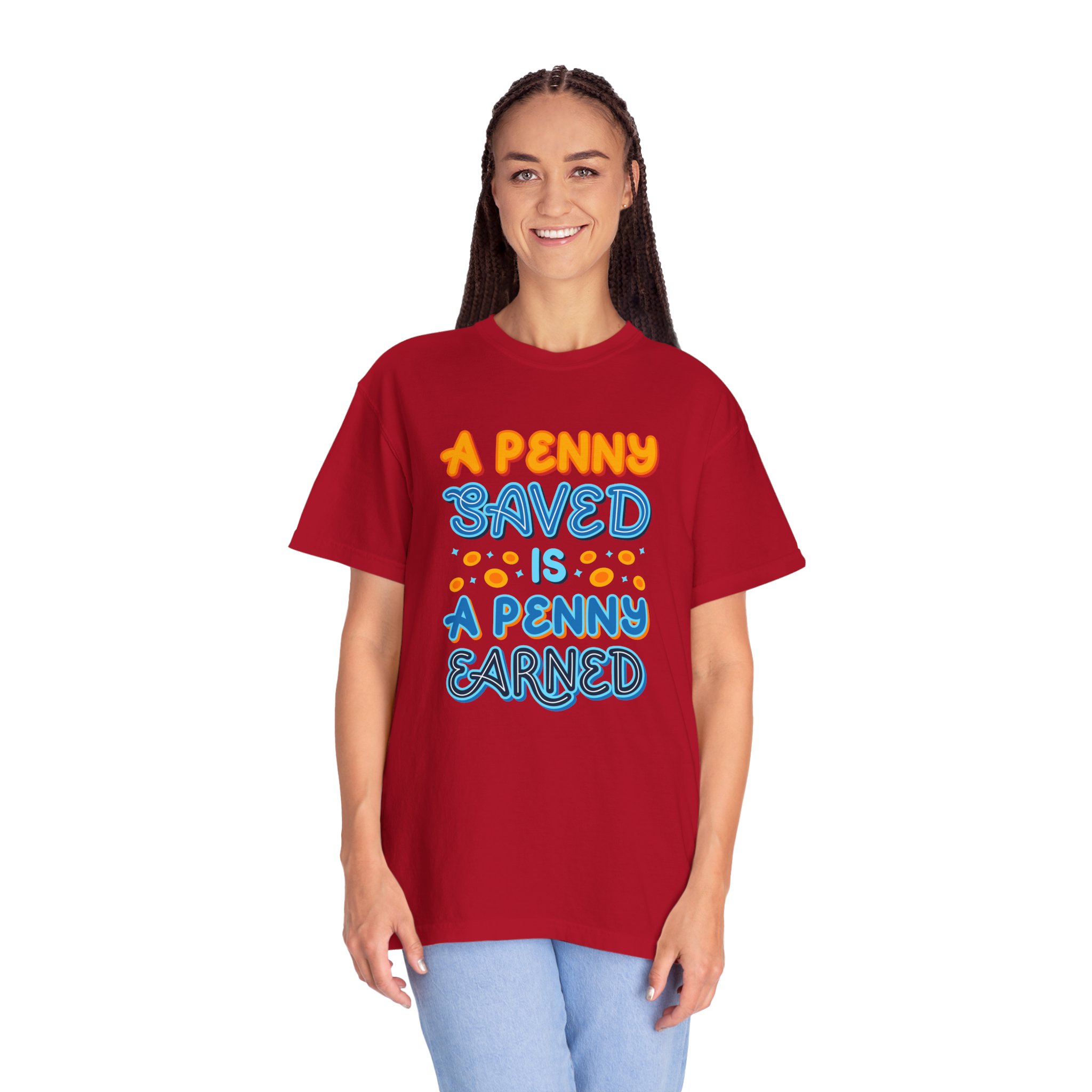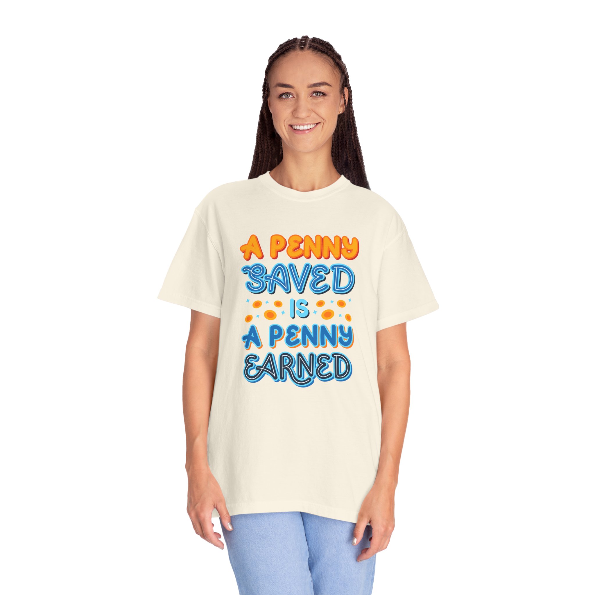 A Penny Saved Is a Penny Earned T-Shirt – Retro Inspirational Savings Quote Graphic Tee for Smart Living & Financial Motivation.