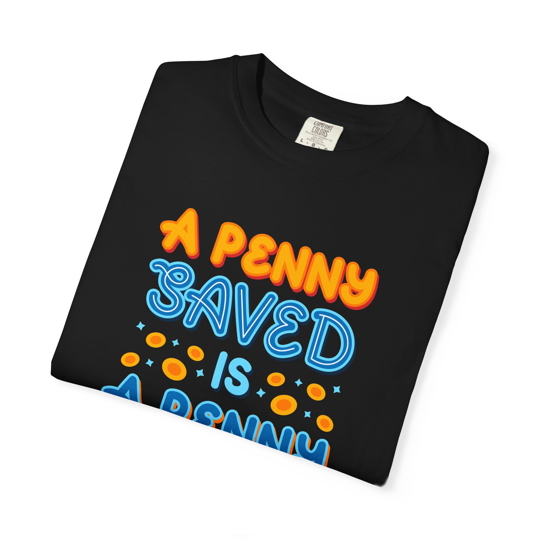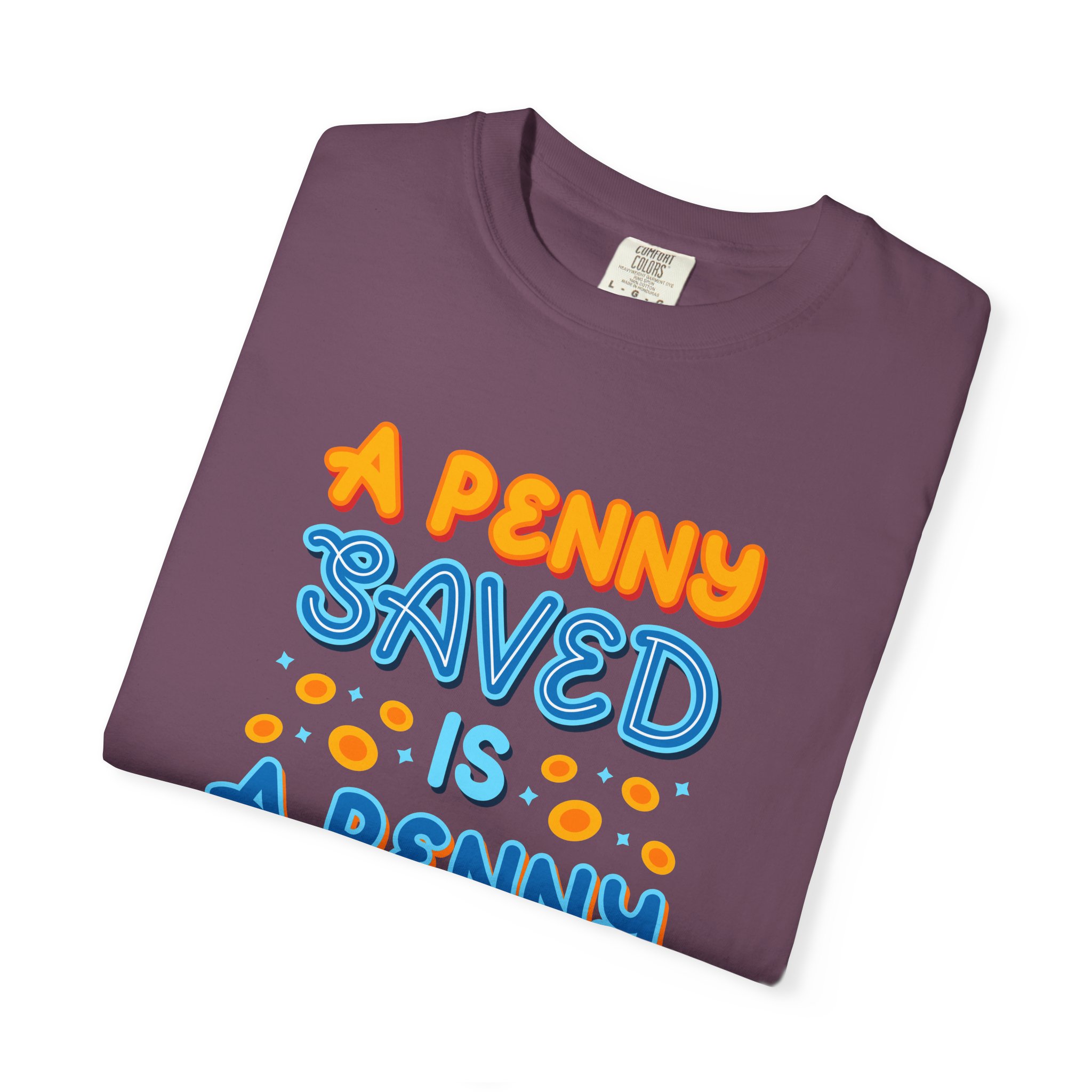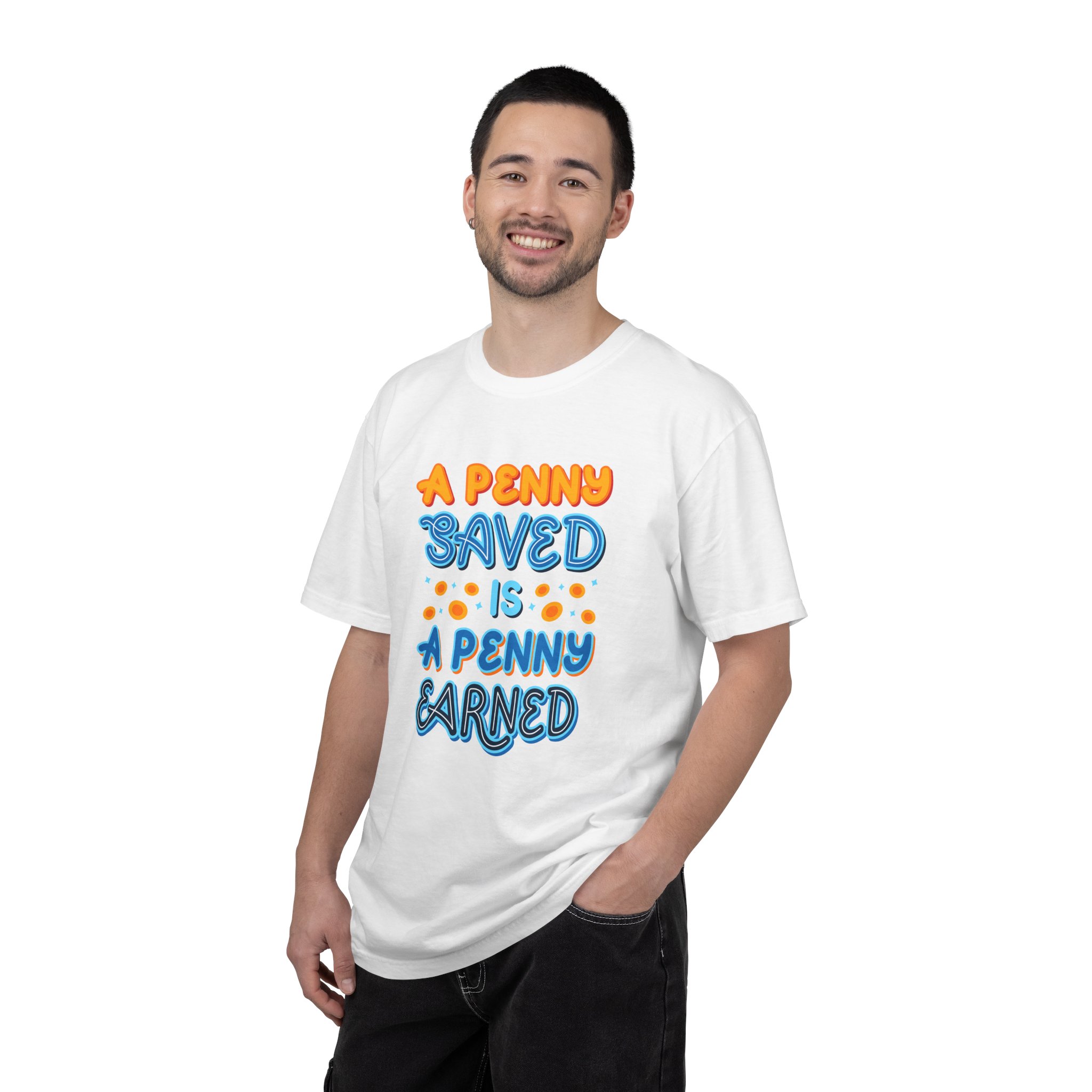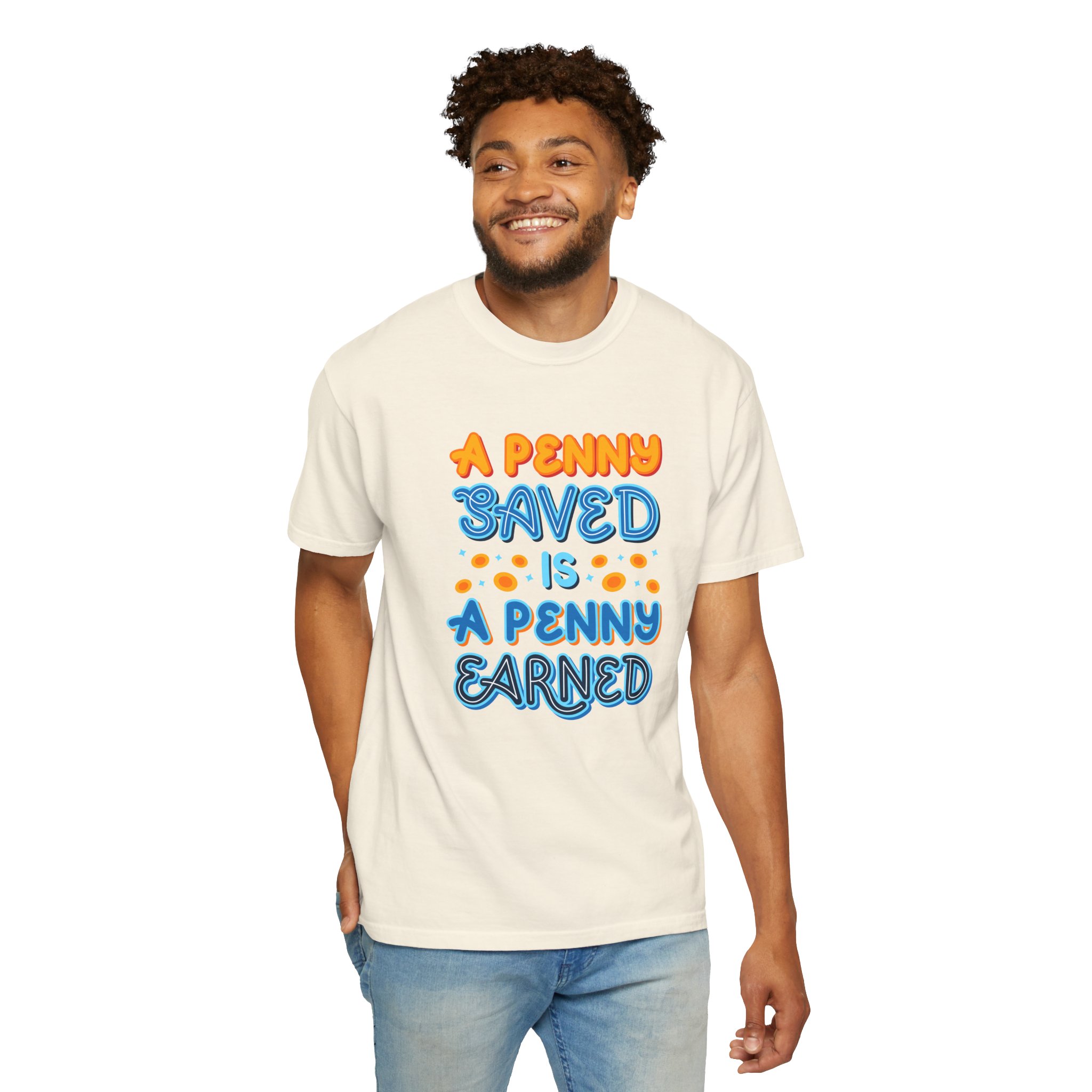 A Penny Saved Is a Penny Earned T-Shirt – Retro Inspirational Savings Quote Graphic Tee for Smart Living & Financial Motivation.