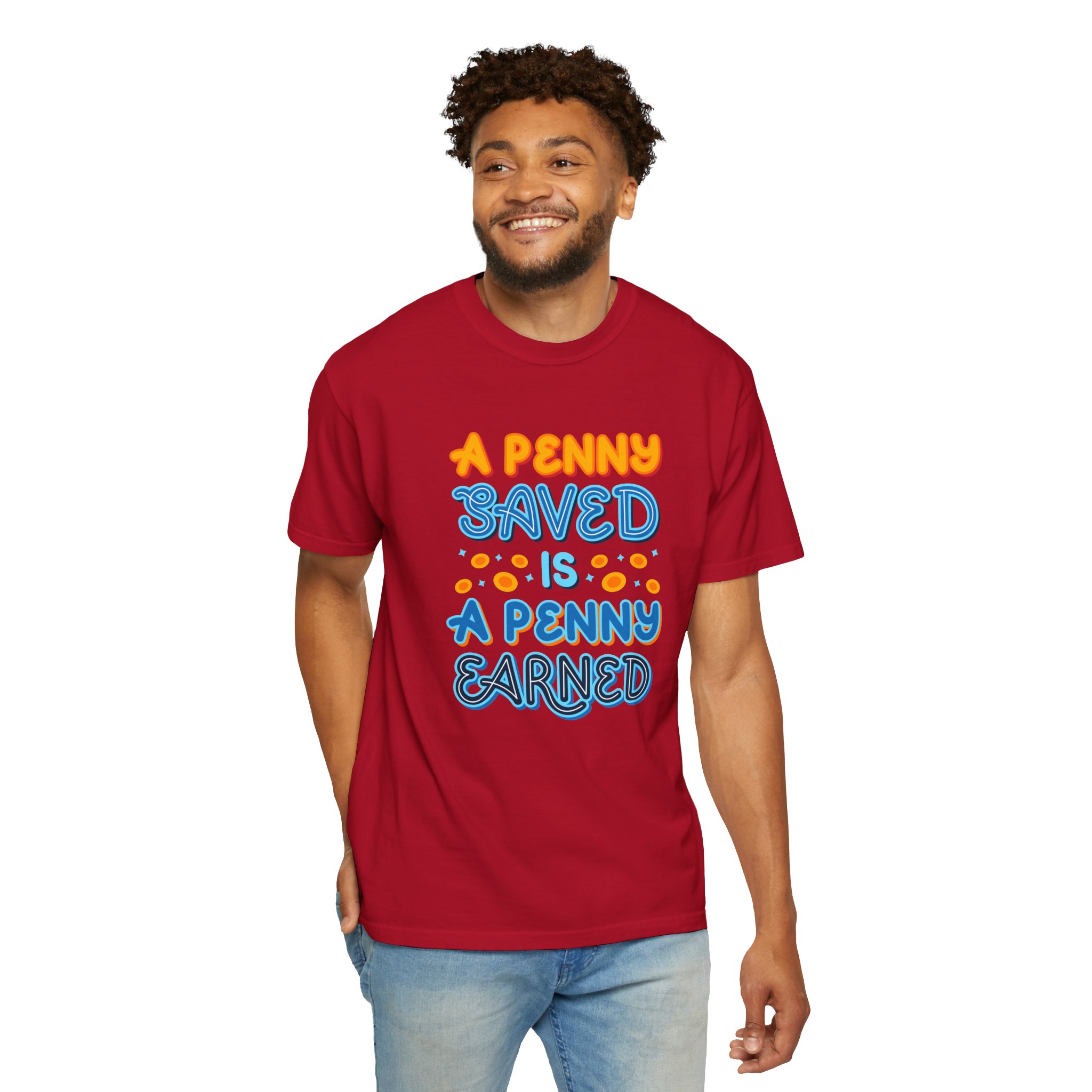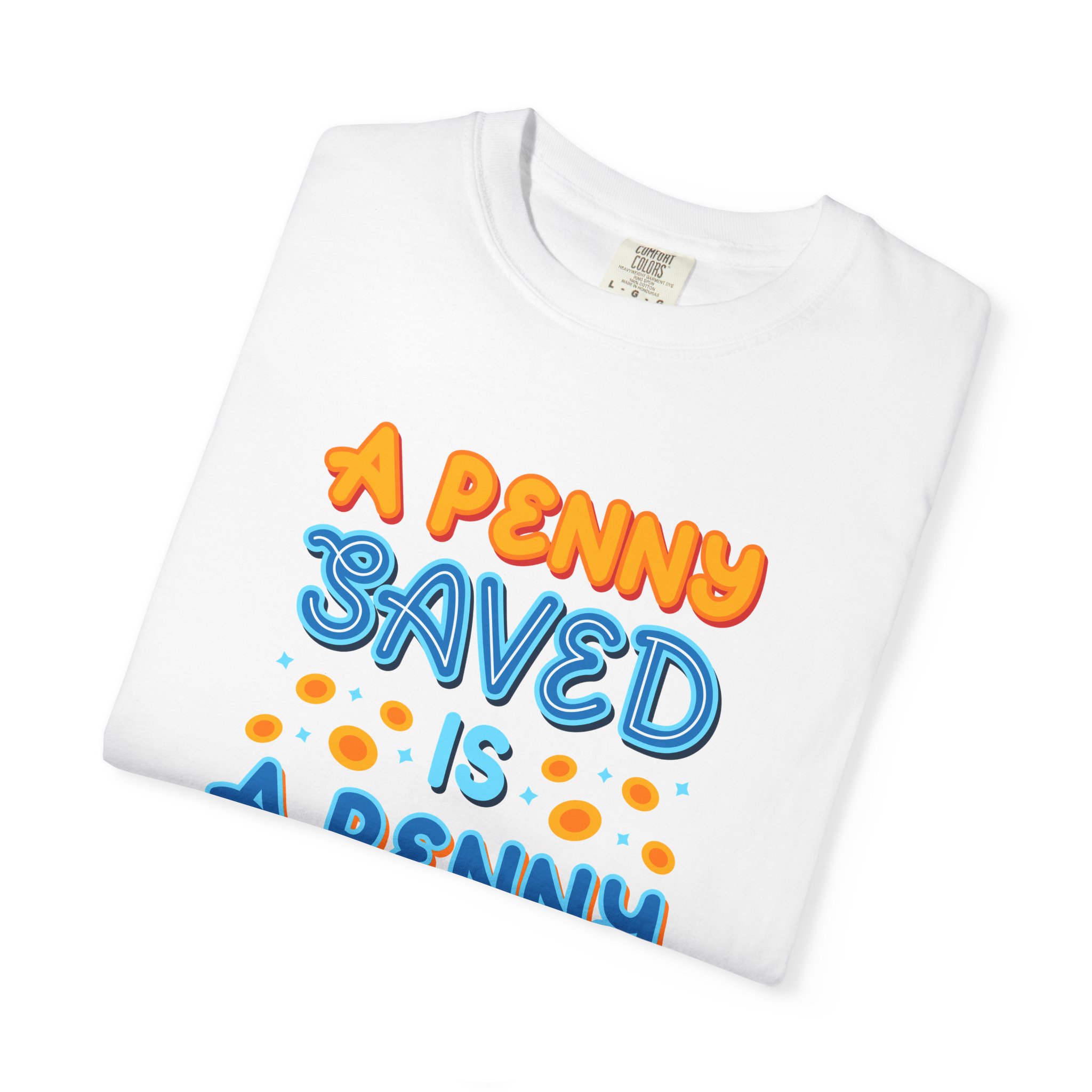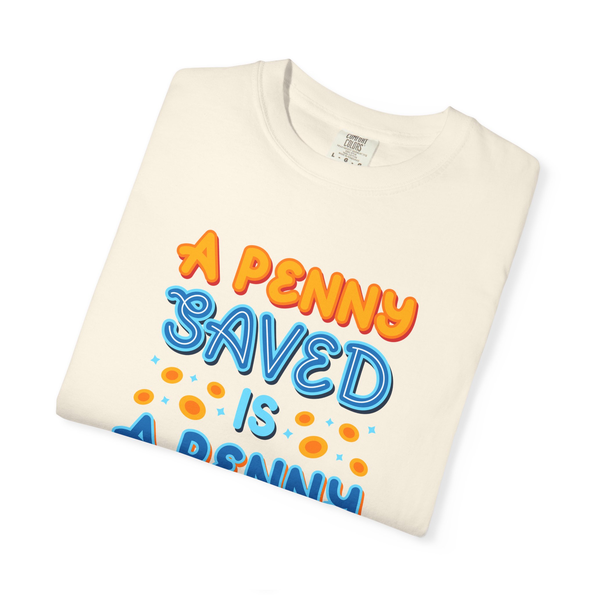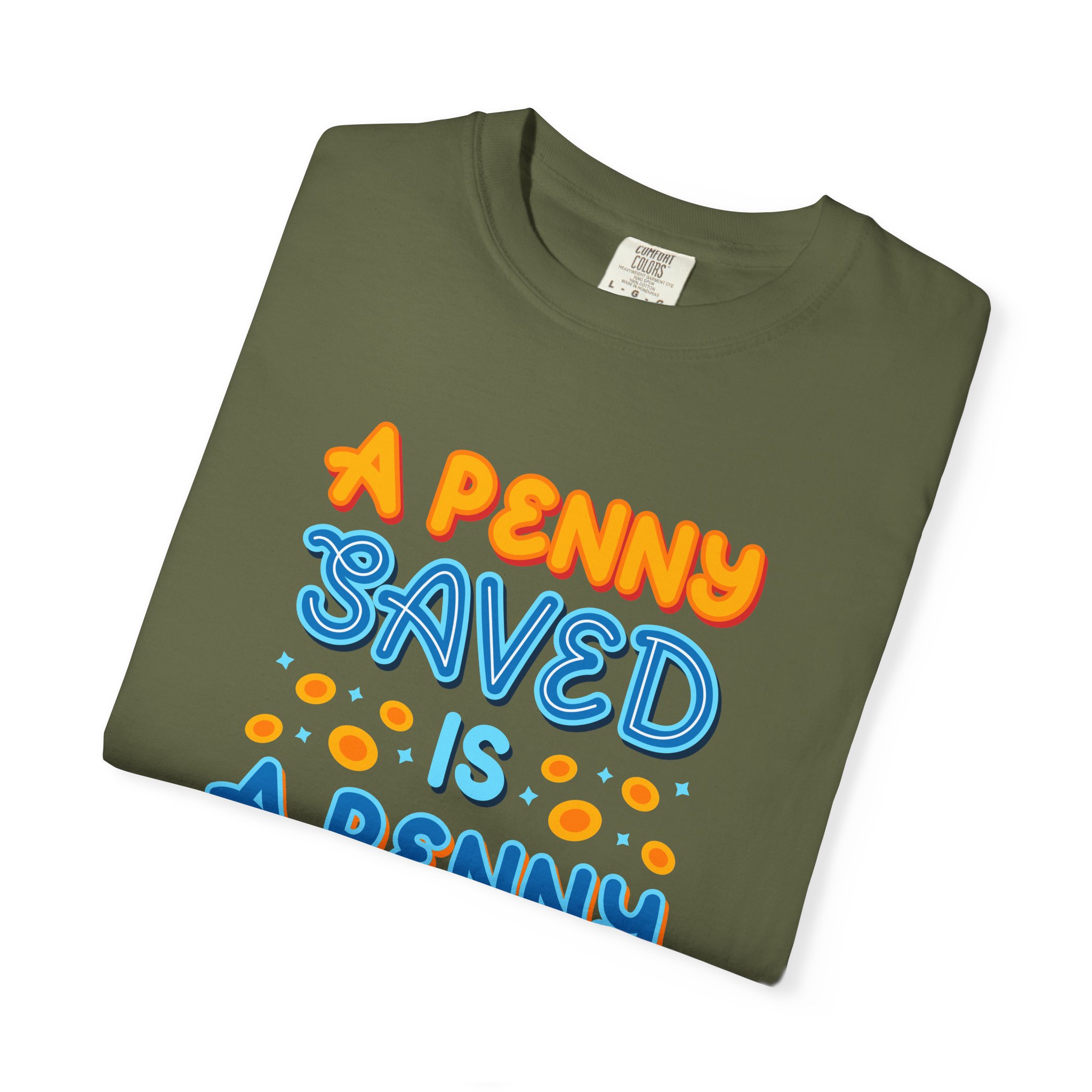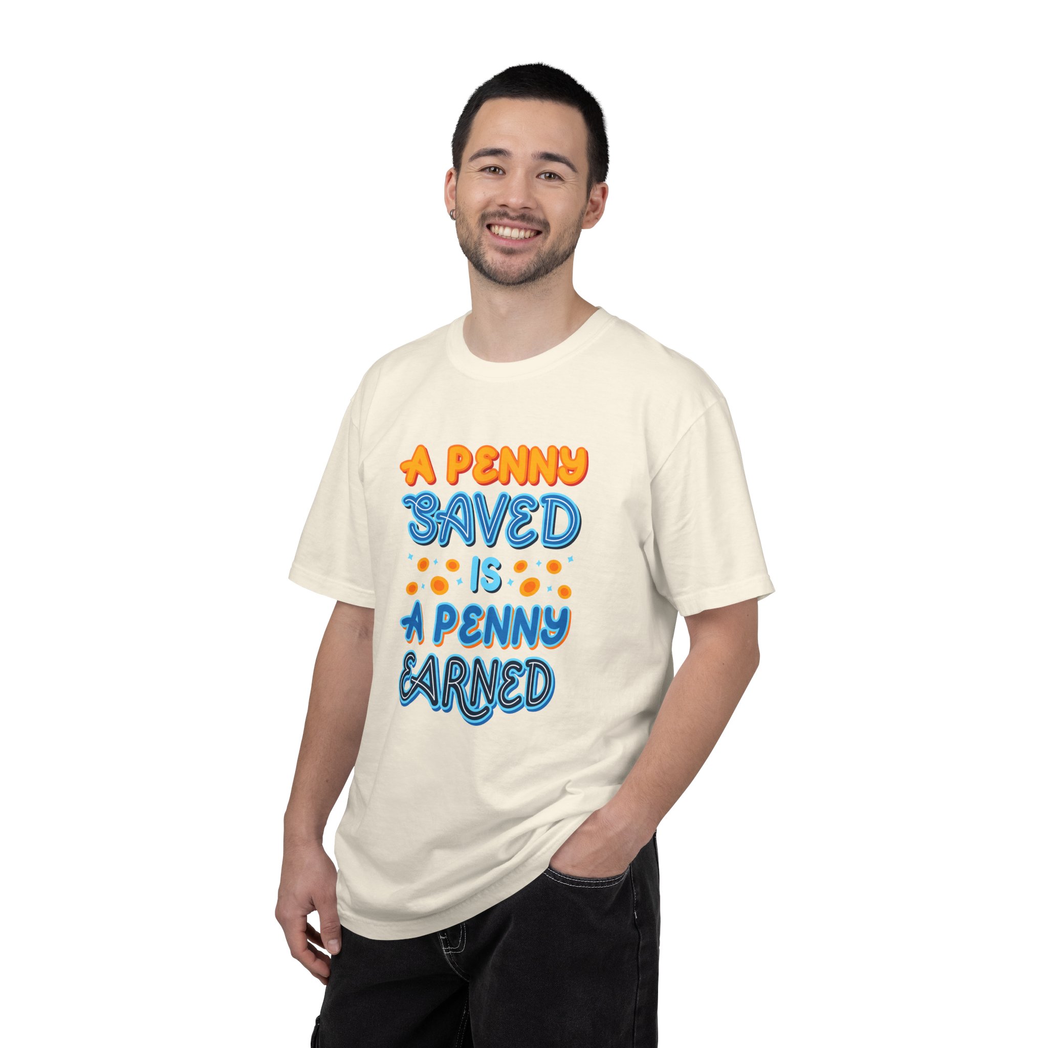 A Penny Saved Is a Penny Earned T-Shirt – Retro Inspirational Savings Quote Graphic Tee for Smart Living & Financial Motivation.