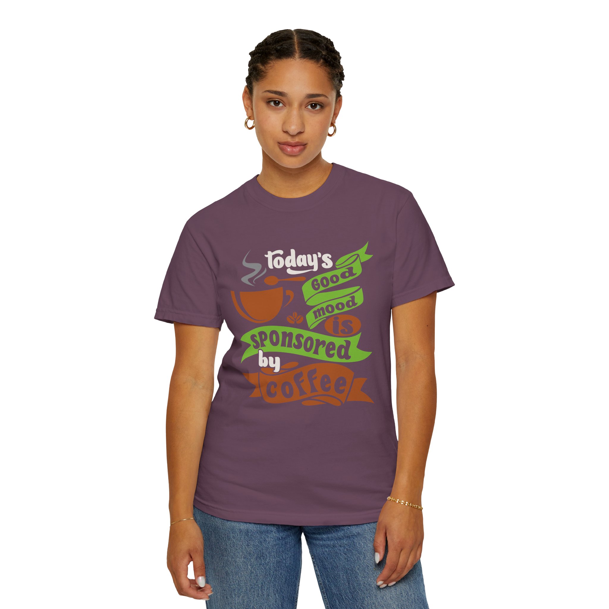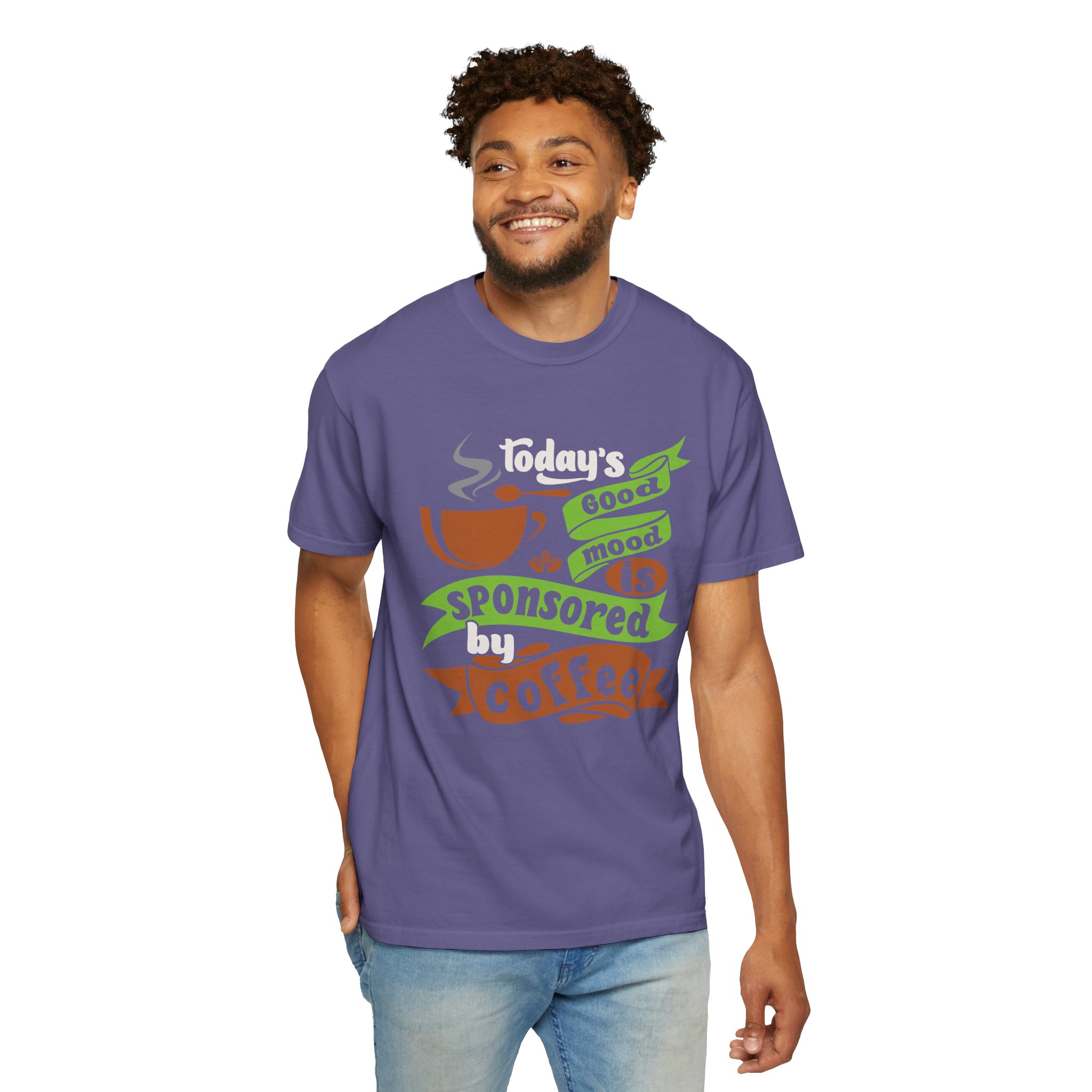 This heavyweight garment-dyed tee brings slow-morning comfort and a little humor to everyday routines. The soft, lived-in color and relaxed fit feel like a favorite right away. A vintage-style coffee graphic reads “Today’s good mood sponsored by coffee,” making it an easy choice for people who start their day with a mug in hand and a smile. Worn for quiet weekends at the local café, early shifts, or casual meetups with friends, this shirt settles into regular rotation and keeps its worn-in softness through many washes. Thoughtful details — from double-needle seams to a sewn-in label and a tubular knit with no side seams — keep the silhouette neat and durable without sacrificing comfort.