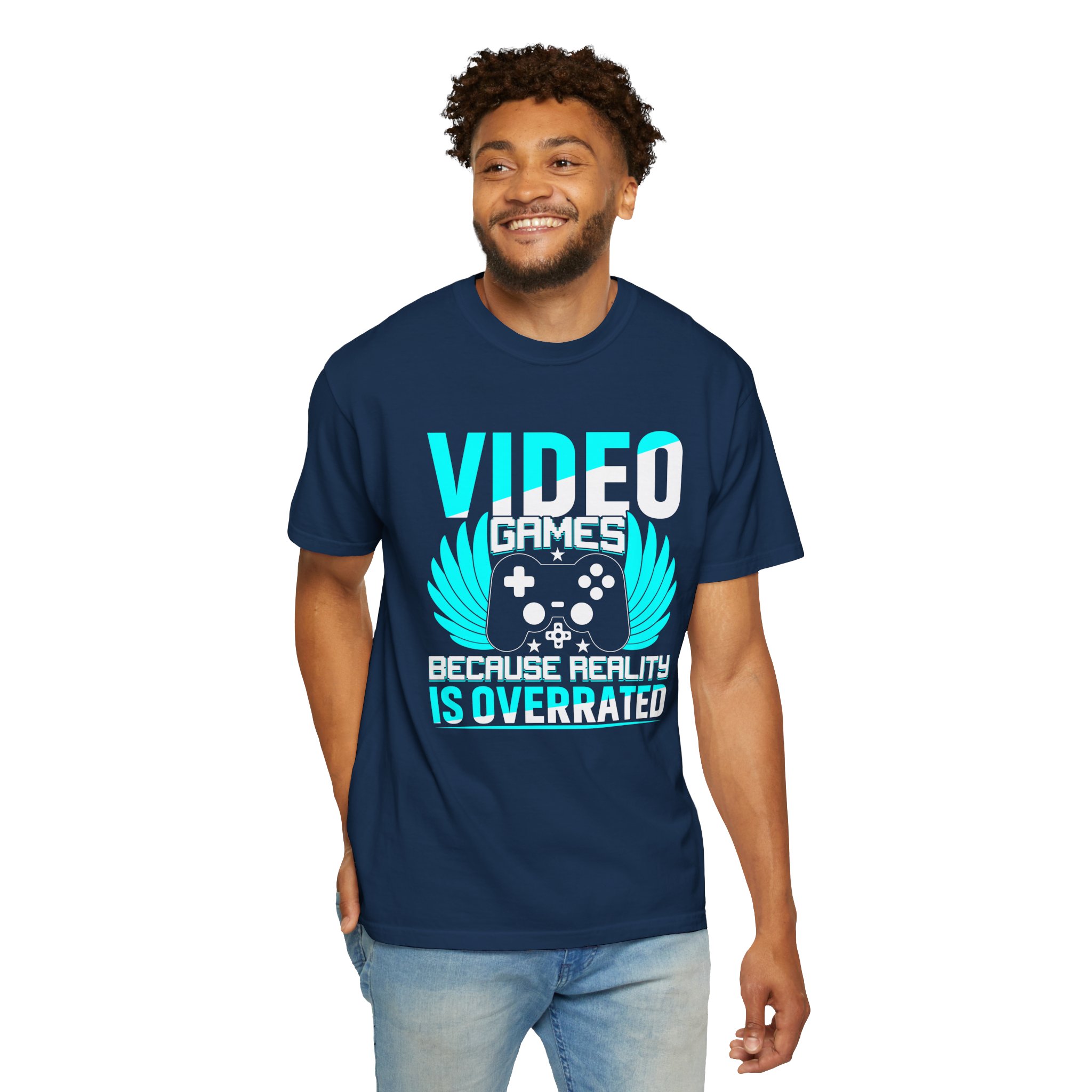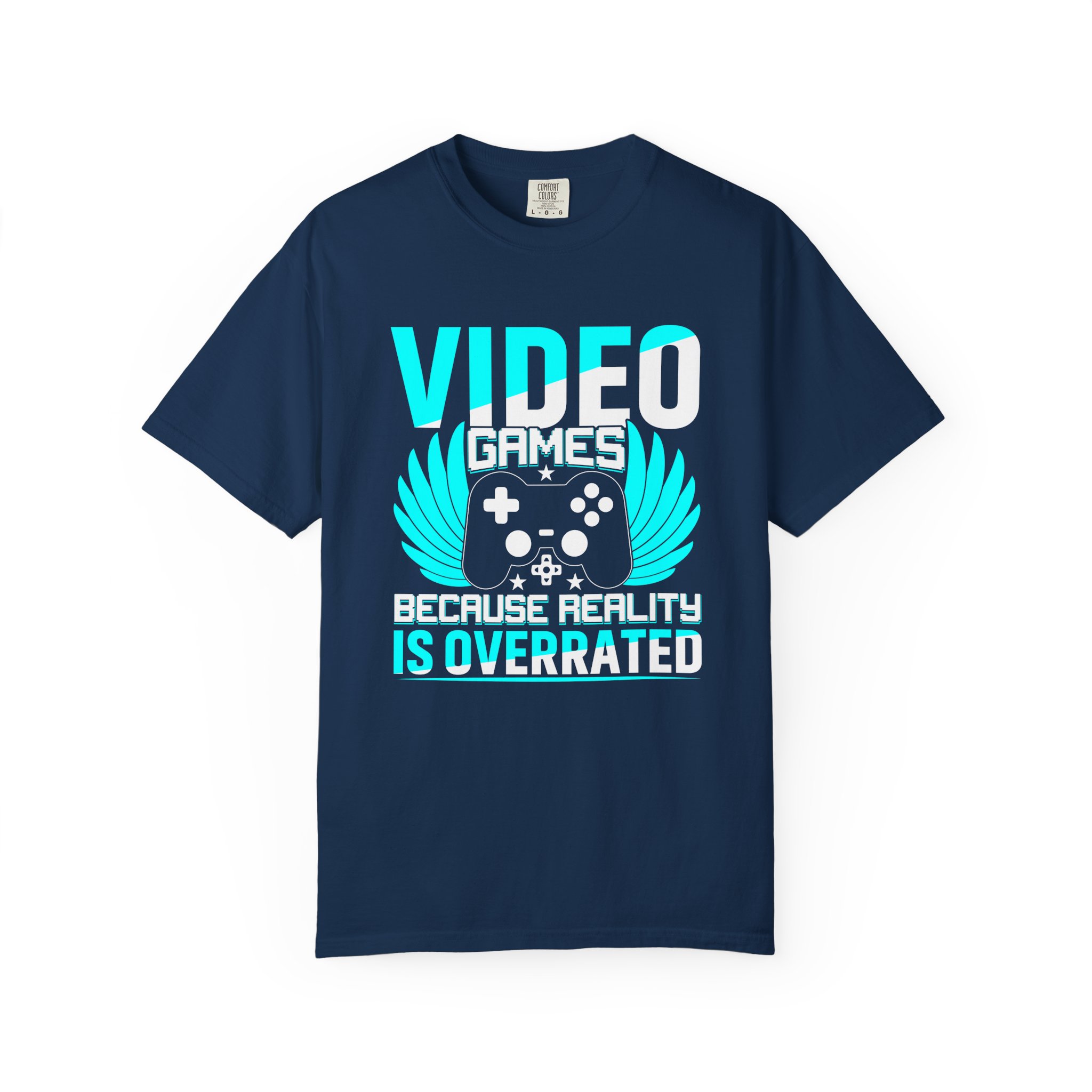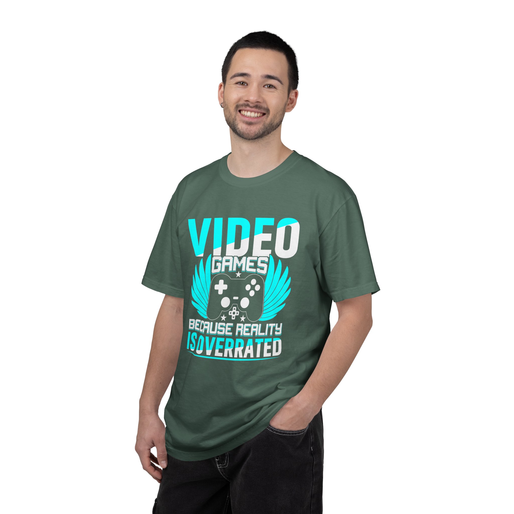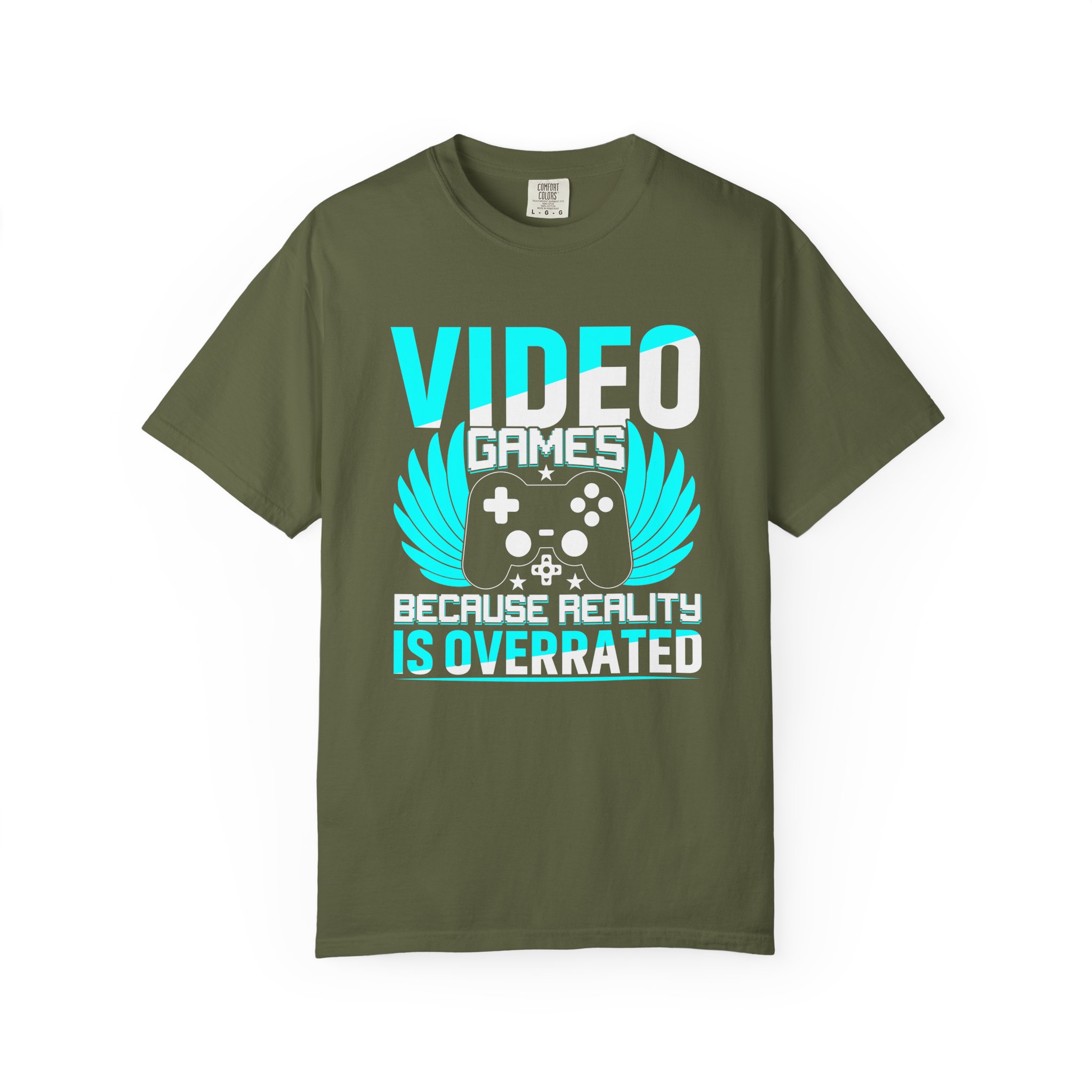 This heavyweight, garment-dyed tee brings gamer pride into everyday life with a soft, lived-in feel. The bold front art — a stylized controller with wings and the line “Video Games — Because Reality Is Overrated” — reads like a badge of belonging. Wear it to LAN nights, streaming sessions, or lazy weekends spent leveling up; the relaxed fit and durable construction keep you comfortable through long play sessions and countless washes. The muted, vintage-y color from garment dyeing pairs with the bright cyan print for a striking contrast that still feels familiar and worn-in. Built to last with double-needle seams and pre-shrunk ring-spun cotton, this shirt ages into your go-to layer for chill meetups, conventions, and cozy at-home marathons.