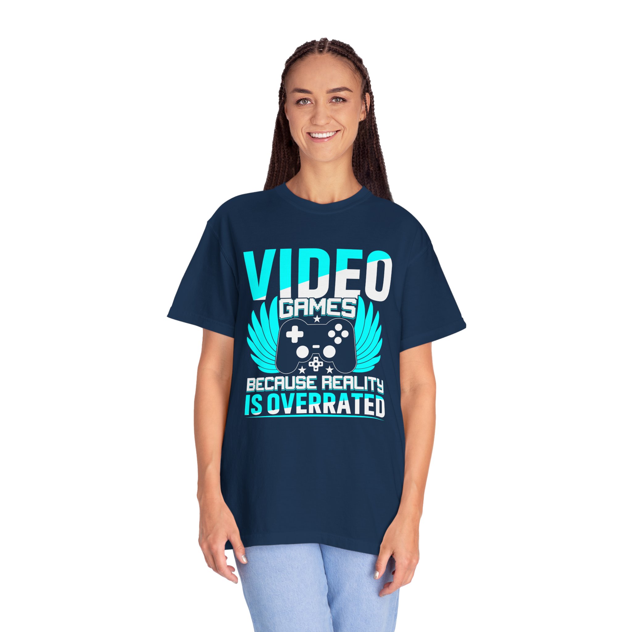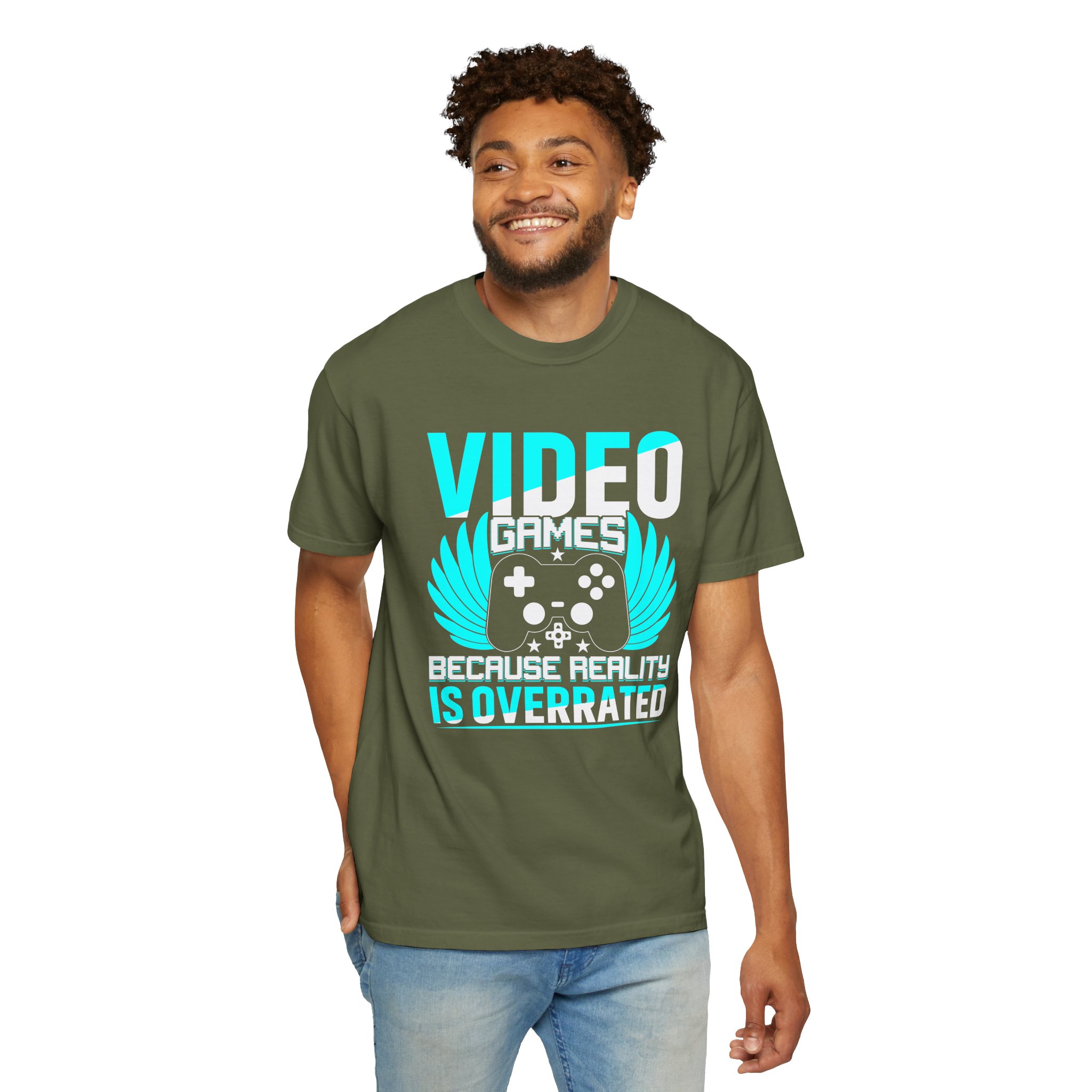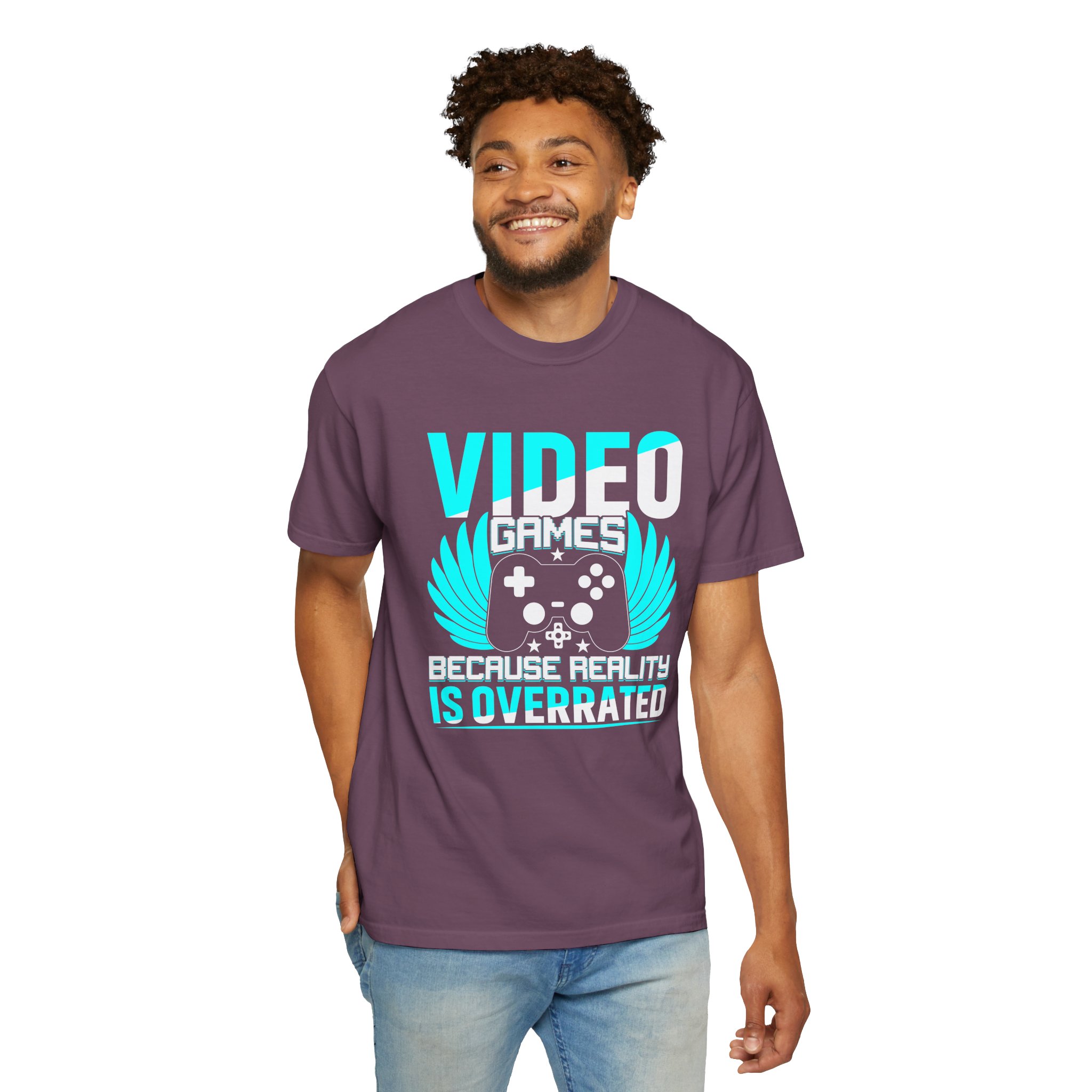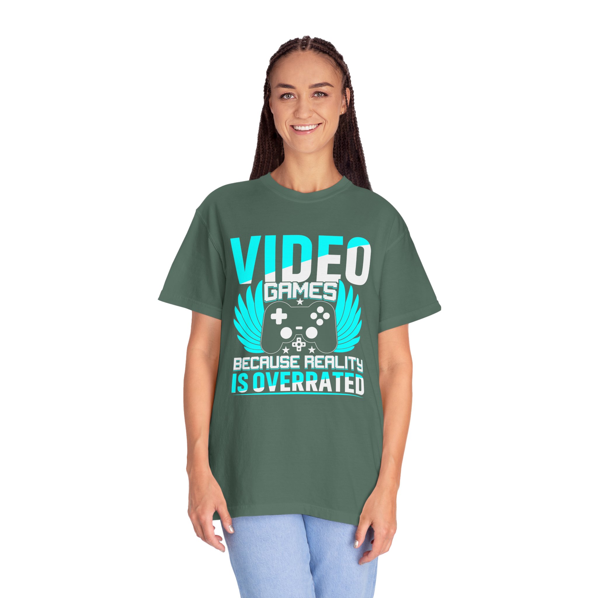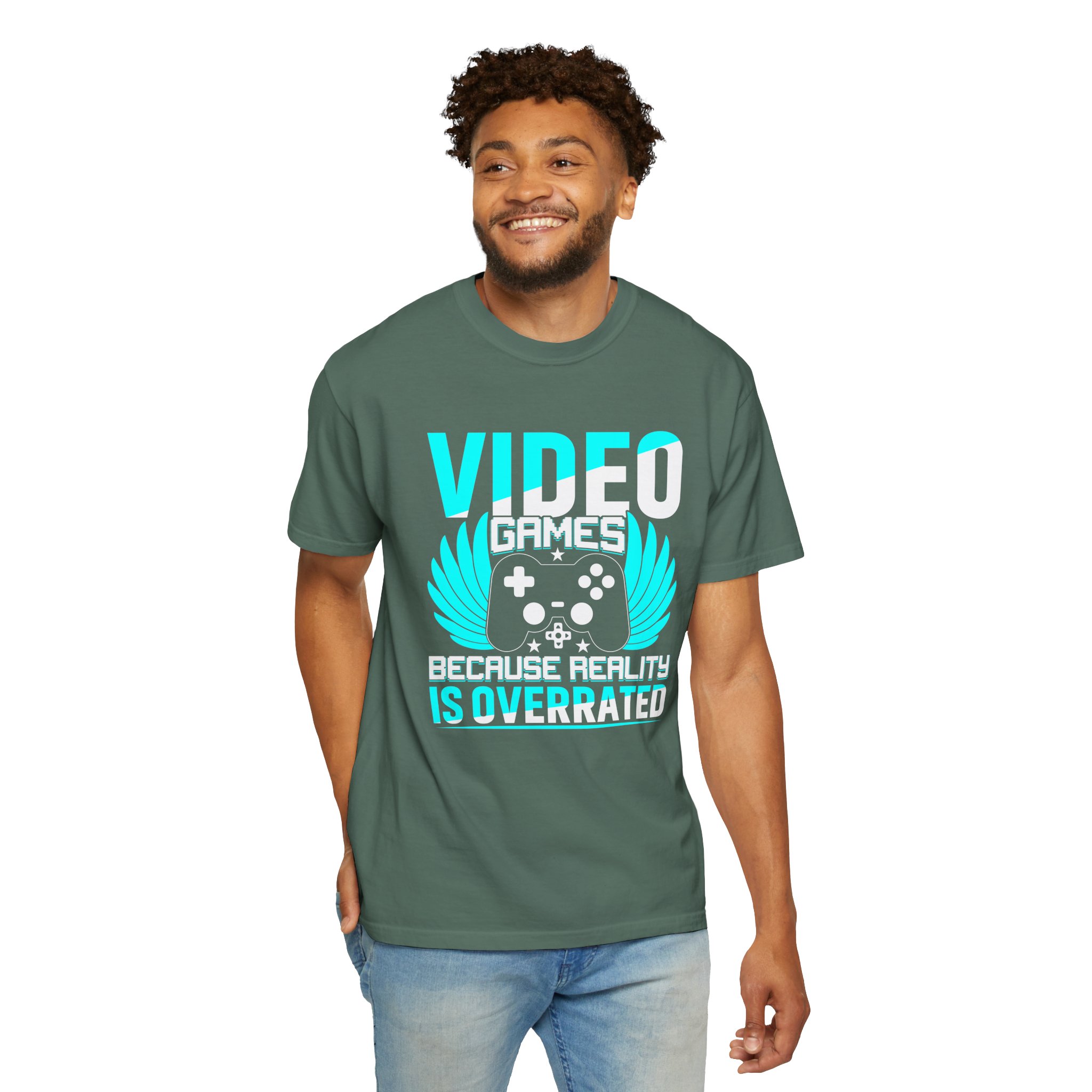 This heavyweight, garment-dyed tee brings gamer pride into everyday life with a soft, lived-in feel. The bold front art — a stylized controller with wings and the line “Video Games — Because Reality Is Overrated” — reads like a badge of belonging. Wear it to LAN nights, streaming sessions, or lazy weekends spent leveling up; the relaxed fit and durable construction keep you comfortable through long play sessions and countless washes. The muted, vintage-y color from garment dyeing pairs with the bright cyan print for a striking contrast that still feels familiar and worn-in. Built to last with double-needle seams and pre-shrunk ring-spun cotton, this shirt ages into your go-to layer for chill meetups, conventions, and cozy at-home marathons.
