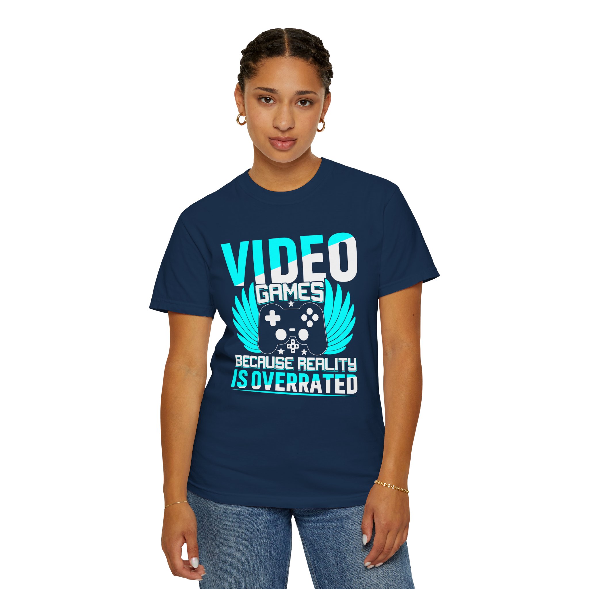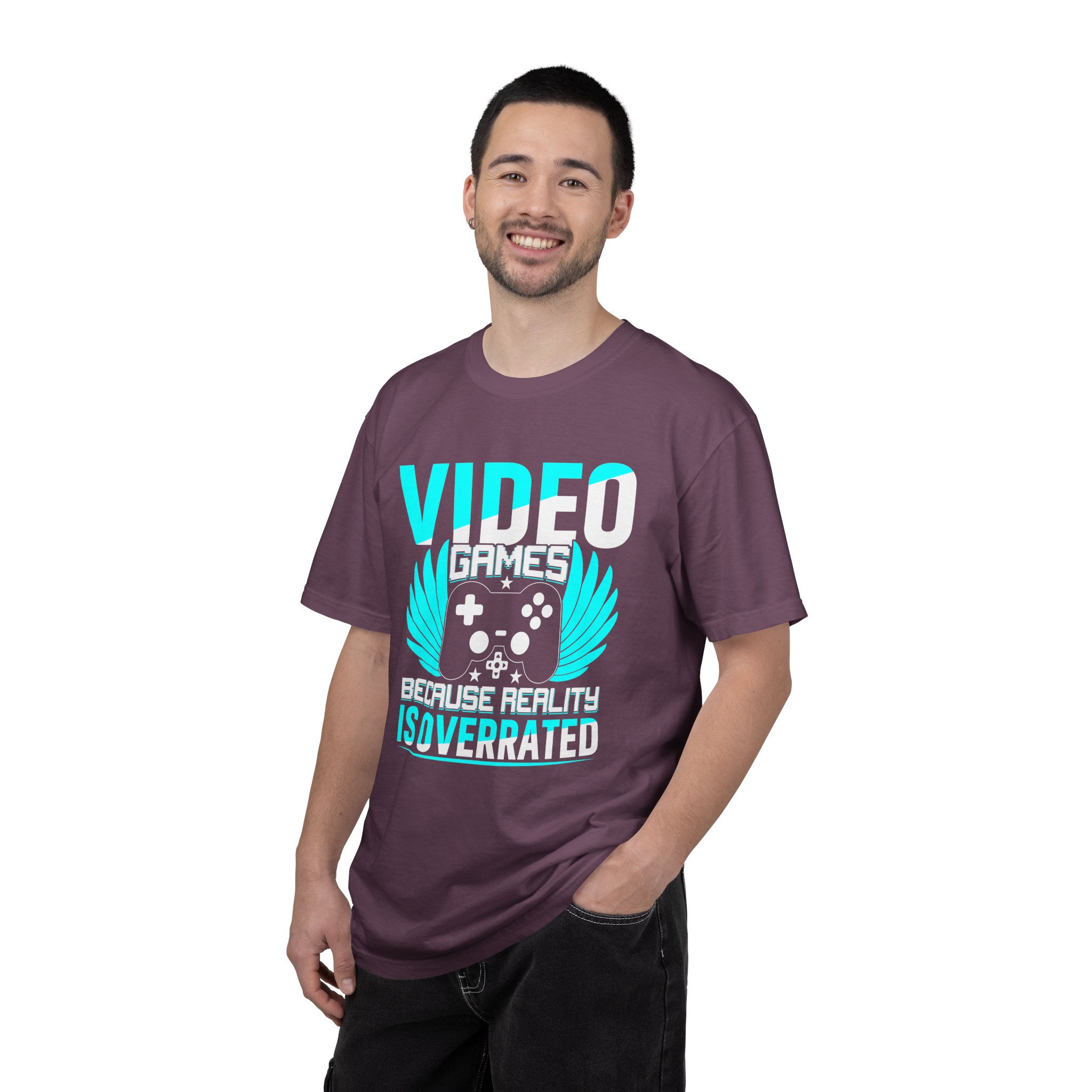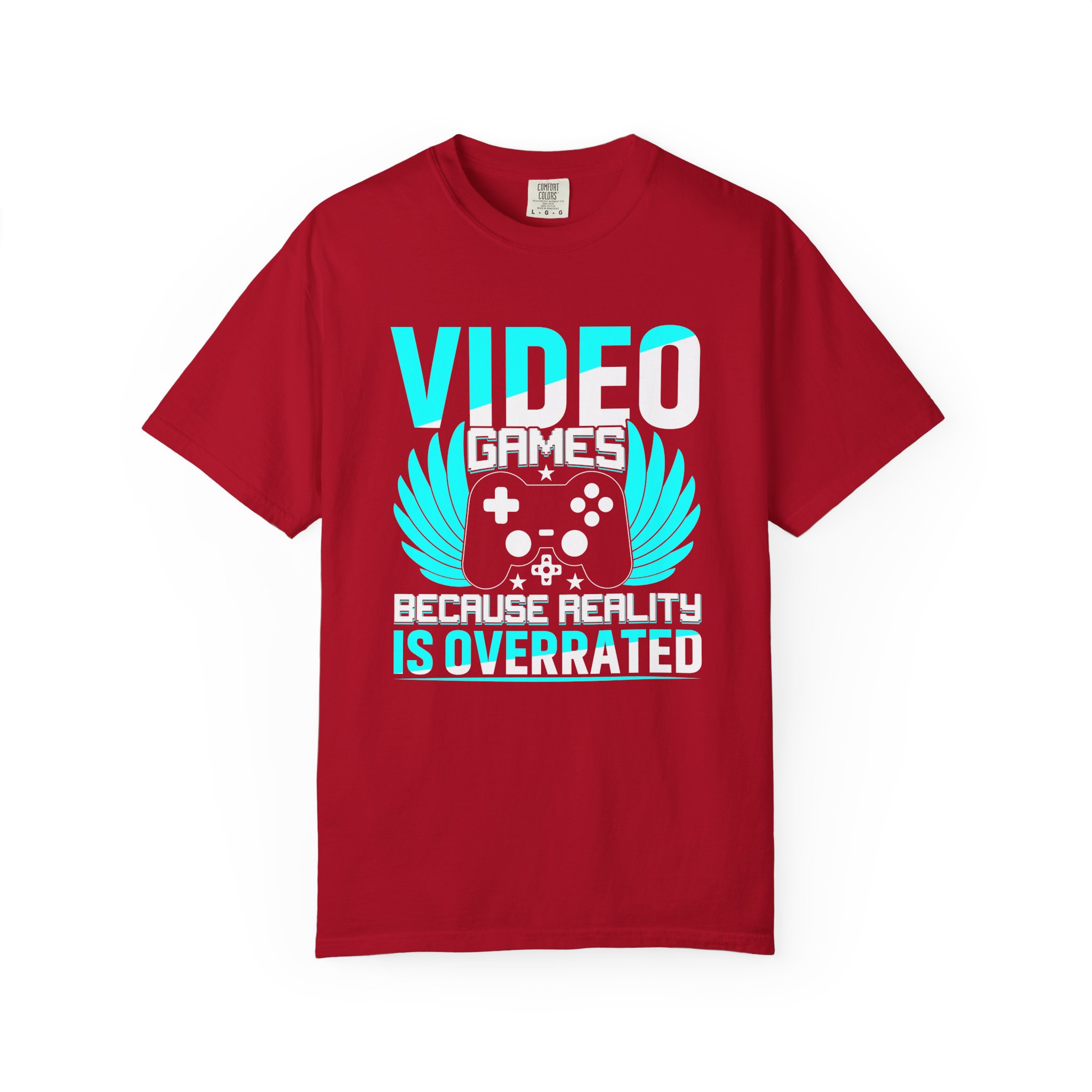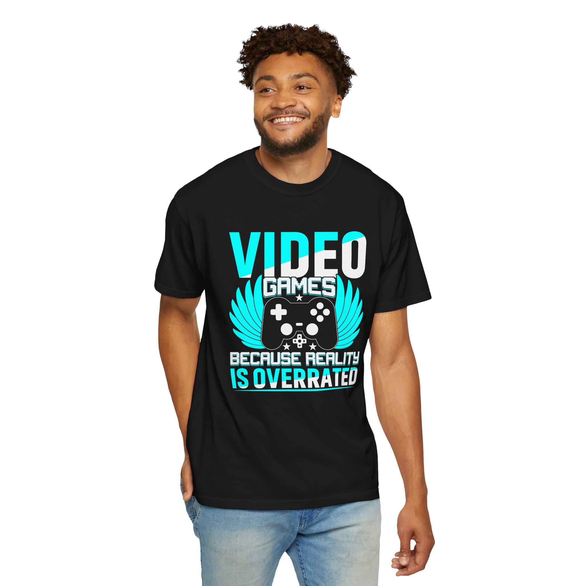 This heavyweight, garment-dyed tee brings gamer pride into everyday life with a soft, lived-in feel. The bold front art — a stylized controller with wings and the line “Video Games — Because Reality Is Overrated” — reads like a badge of belonging. Wear it to LAN nights, streaming sessions, or lazy weekends spent leveling up; the relaxed fit and durable construction keep you comfortable through long play sessions and countless washes. The muted, vintage-y color from garment dyeing pairs with the bright cyan print for a striking contrast that still feels familiar and worn-in. Built to last with double-needle seams and pre-shrunk ring-spun cotton, this shirt ages into your go-to layer for chill meetups, conventions, and cozy at-home marathons.